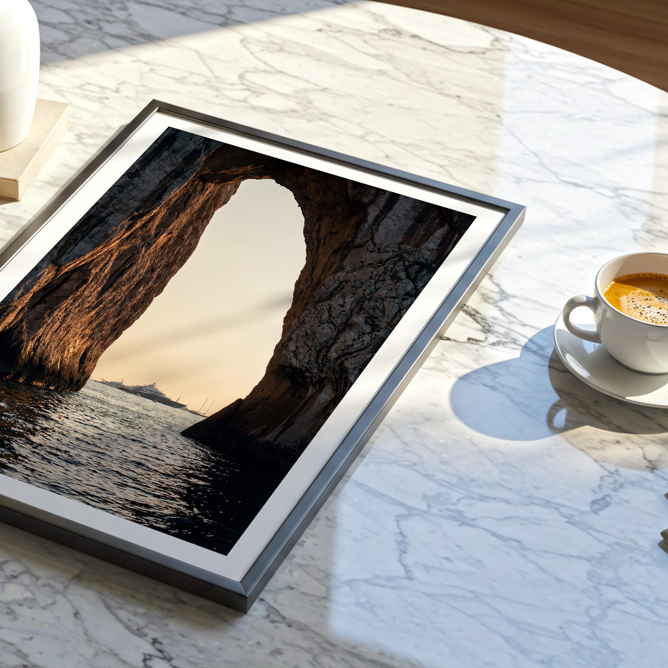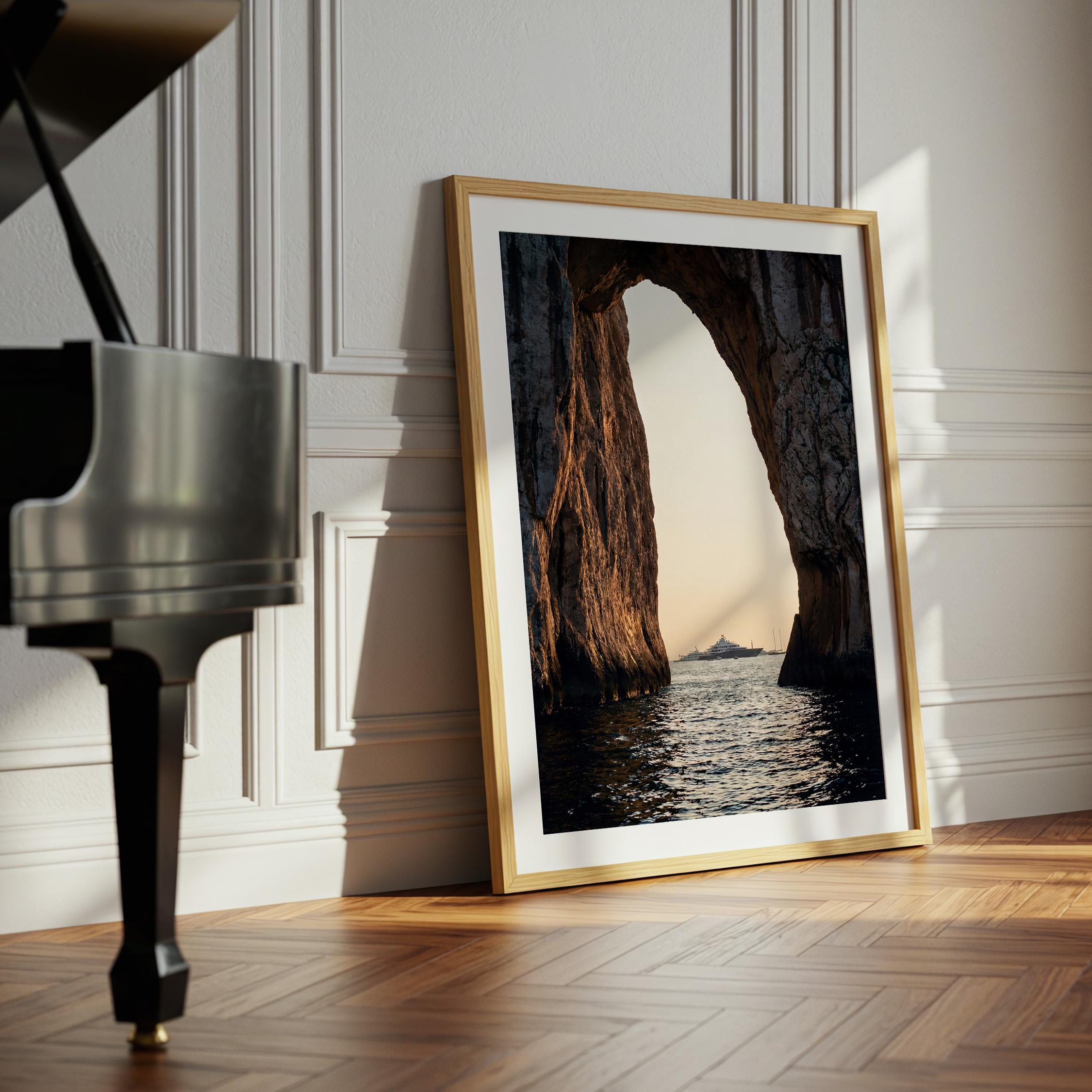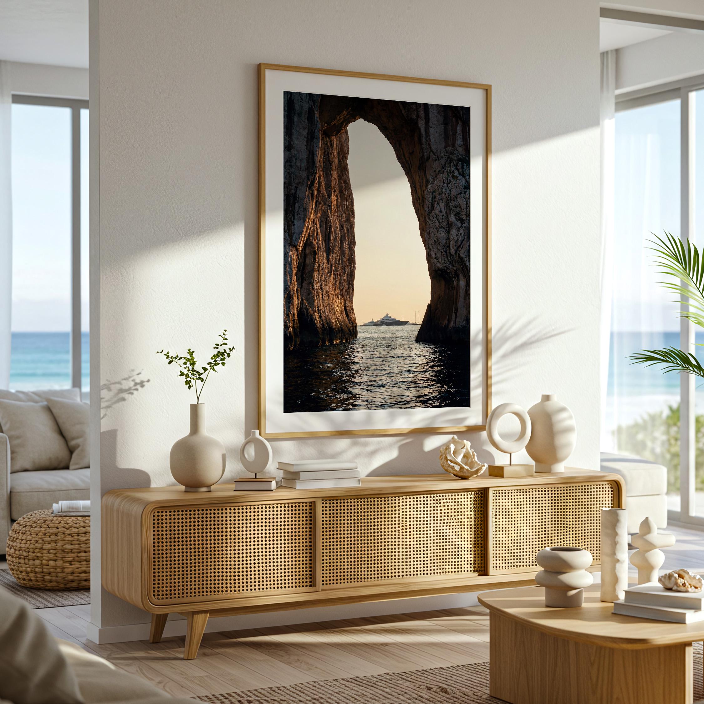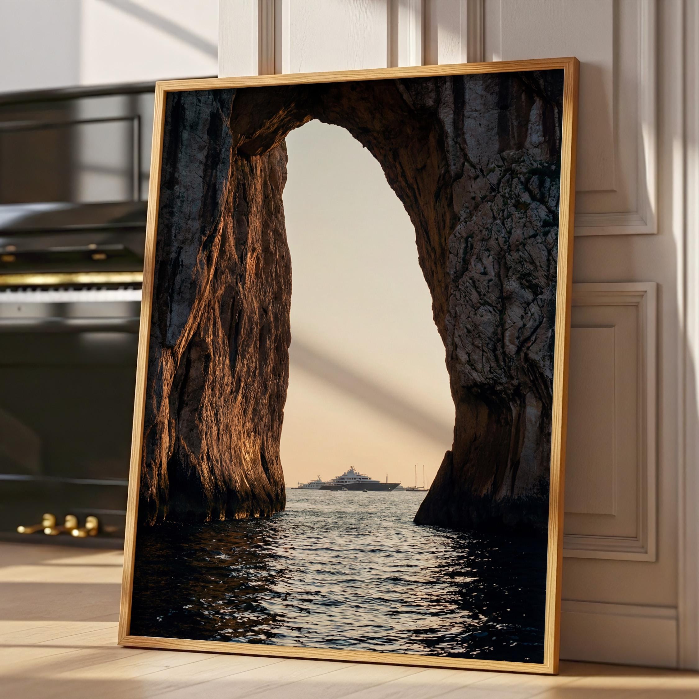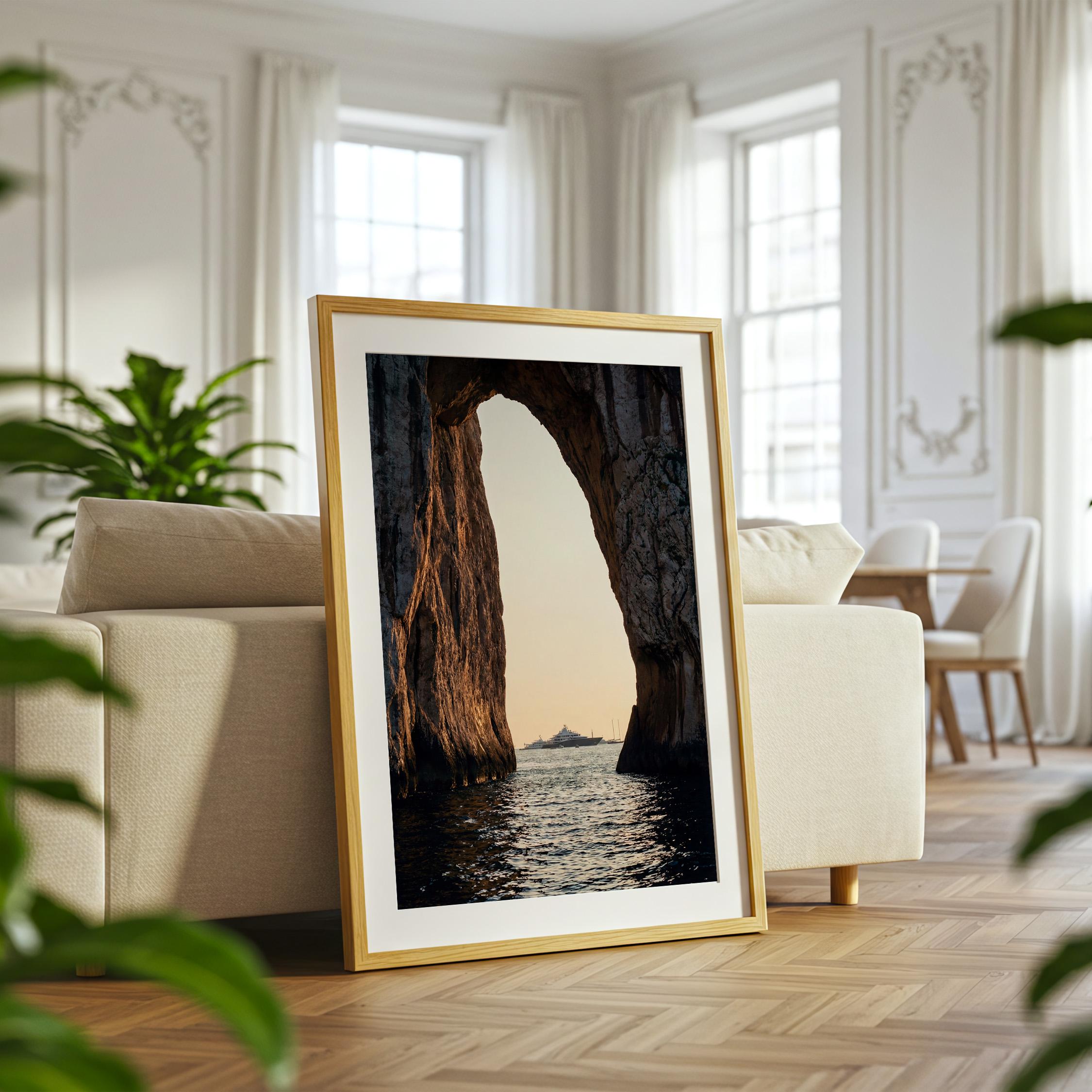 This print captures a dramatic coastal moment as a luxury yacht drifts across calm water beyond the cliffs. The contrast between rugged stone and shimmering sea creates depth and scale, drawing the eye outward.