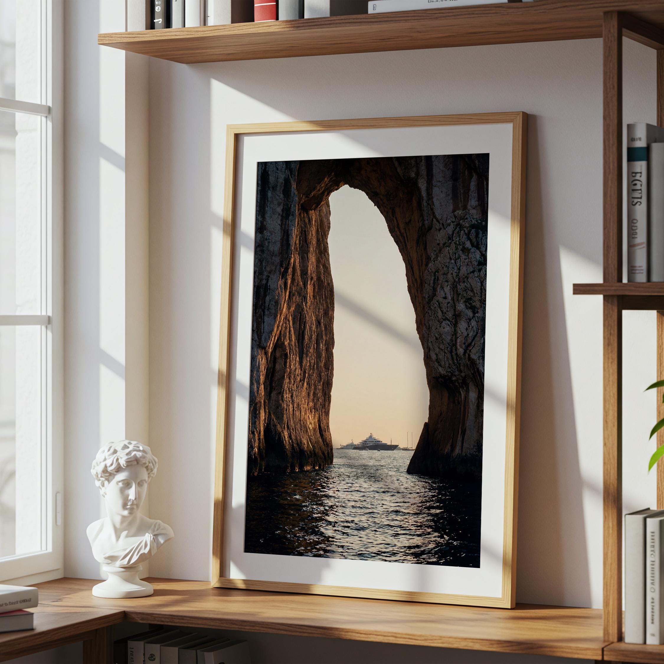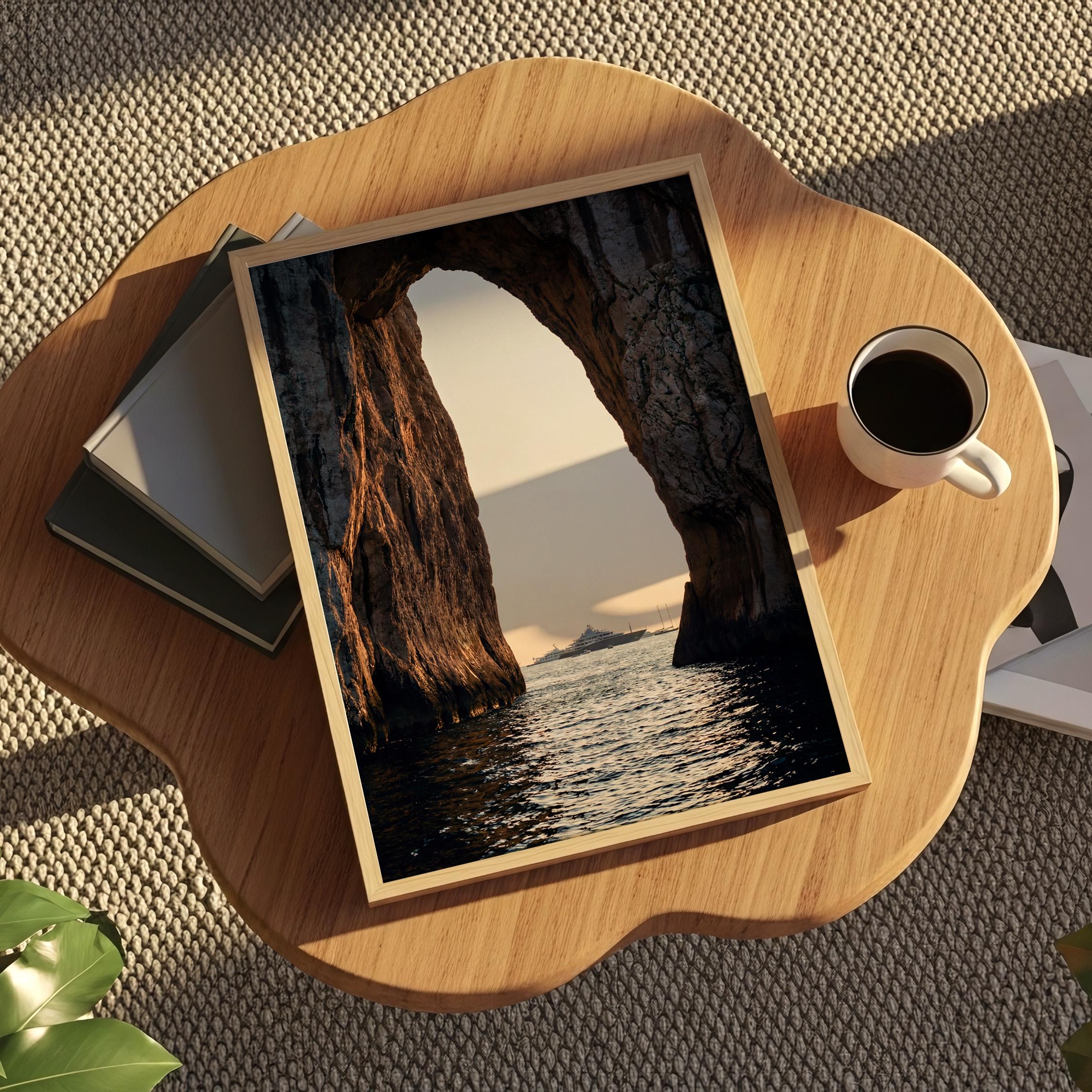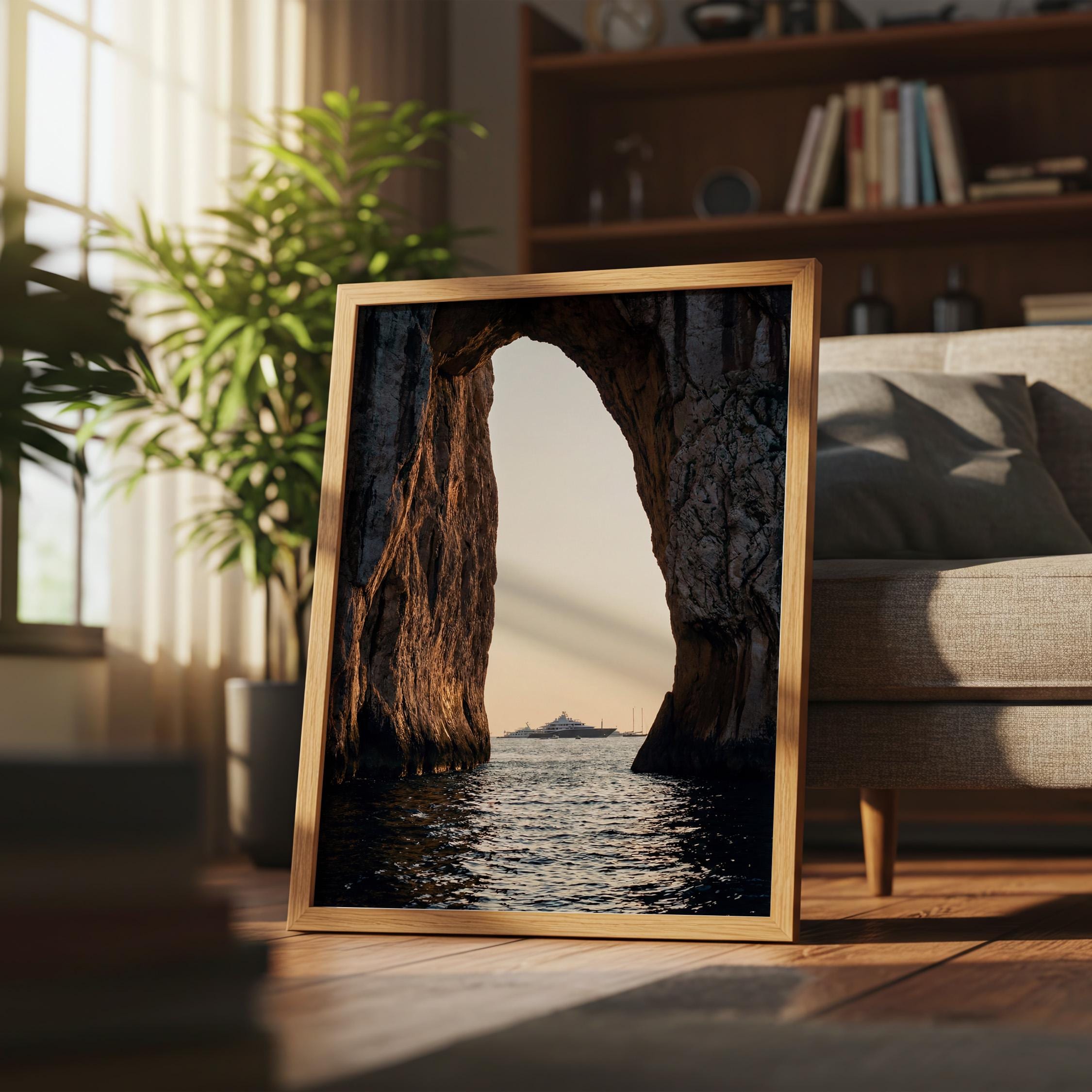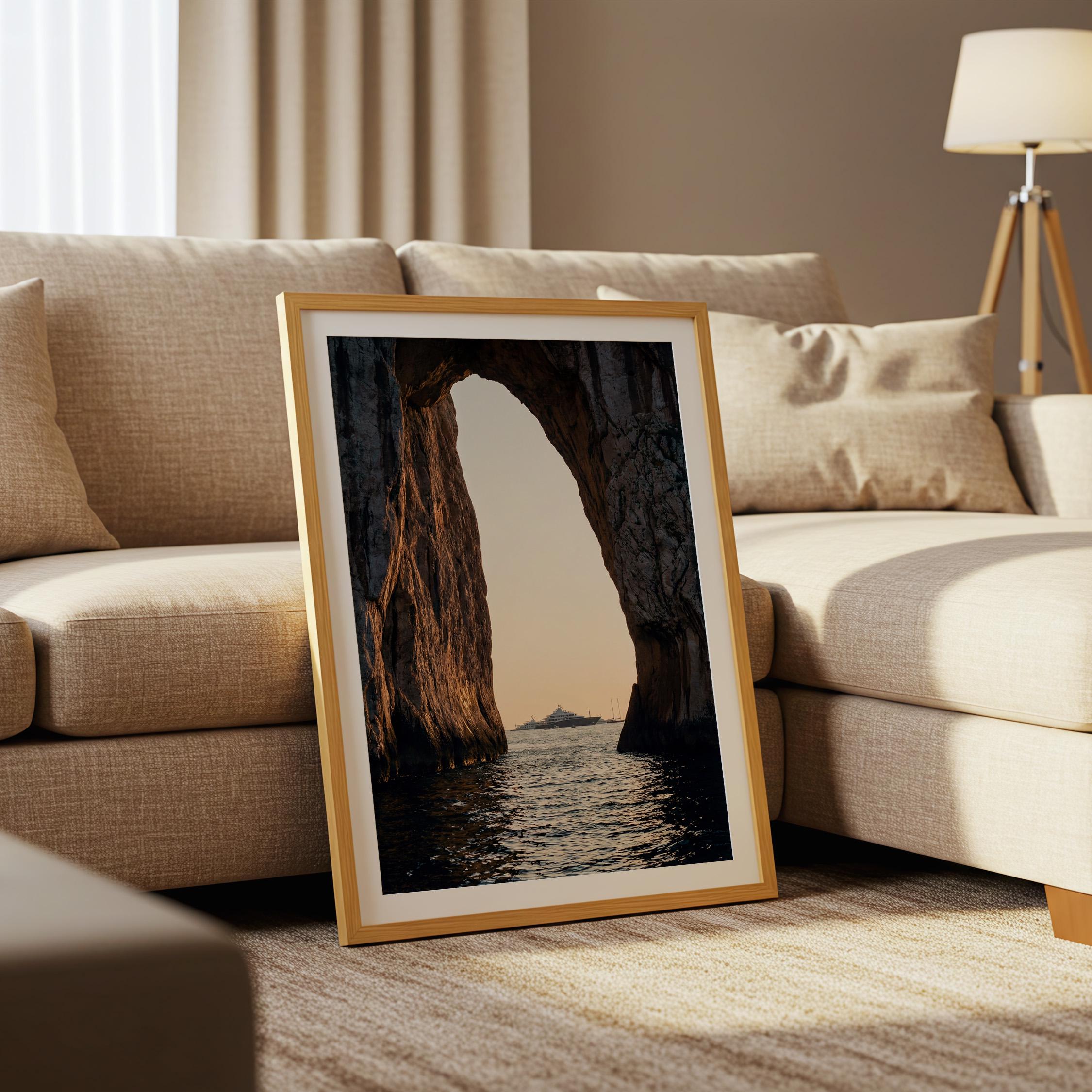 This print captures a dramatic coastal moment as a luxury yacht drifts across calm water beyond the cliffs. The contrast between rugged stone and shimmering sea creates depth and scale, drawing the eye outward.