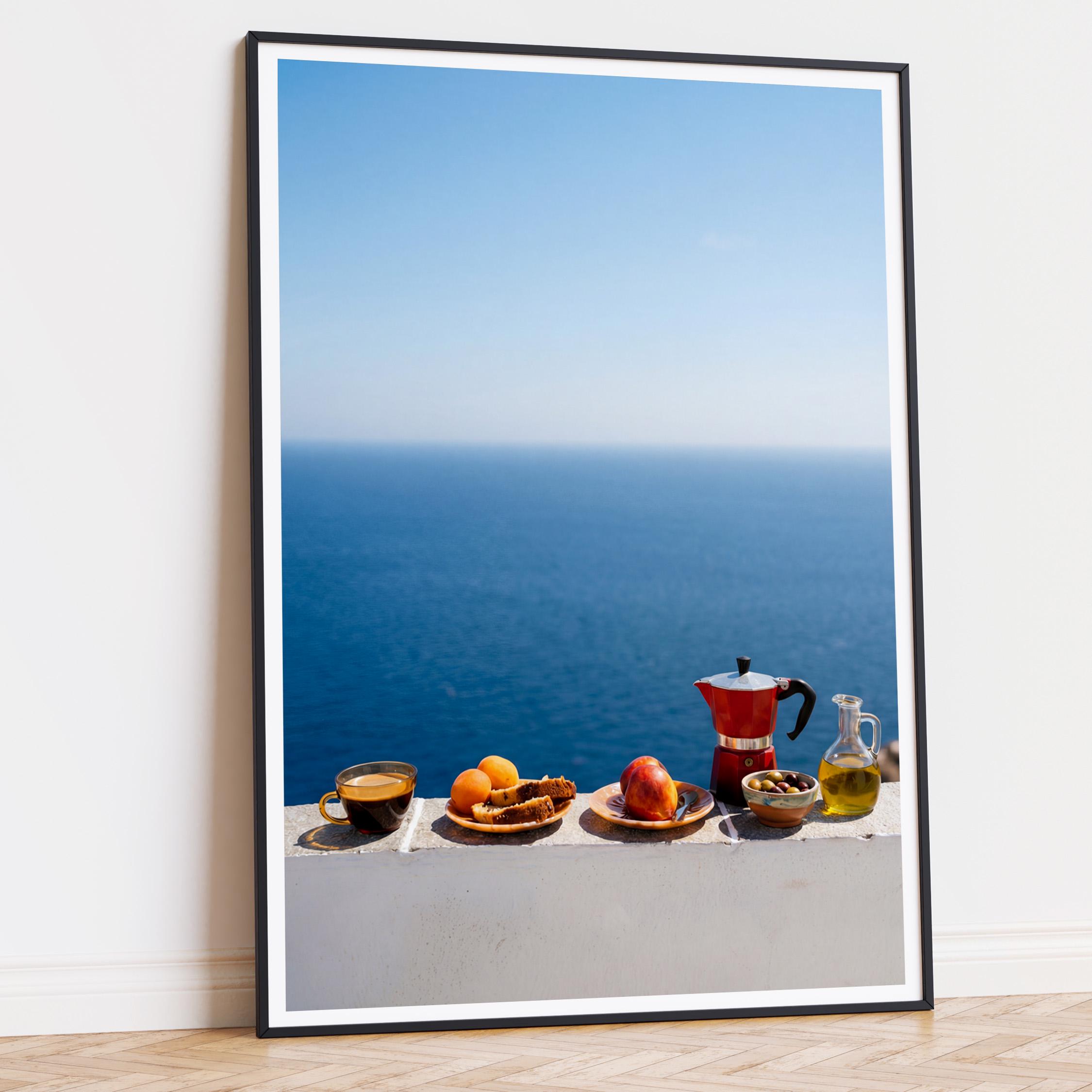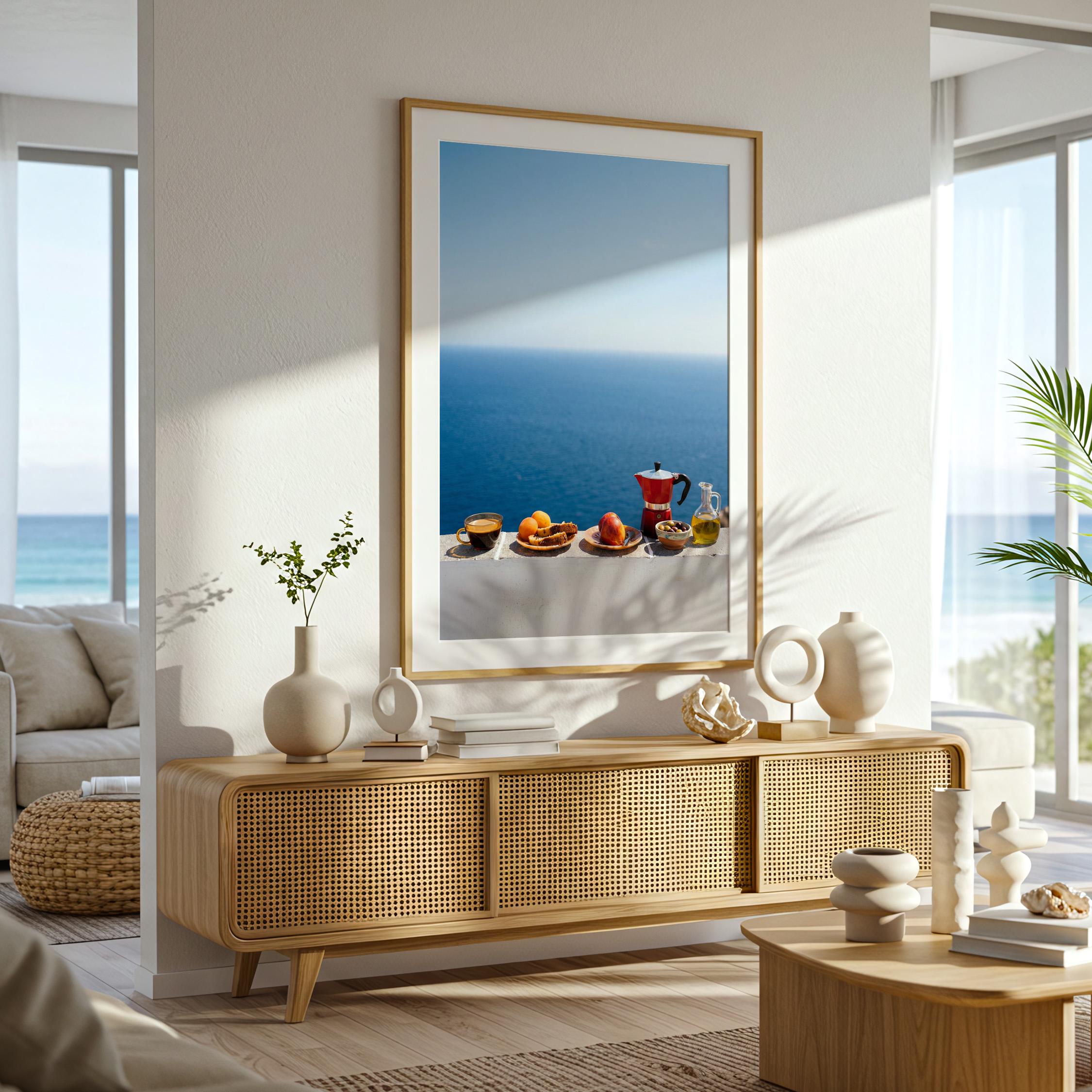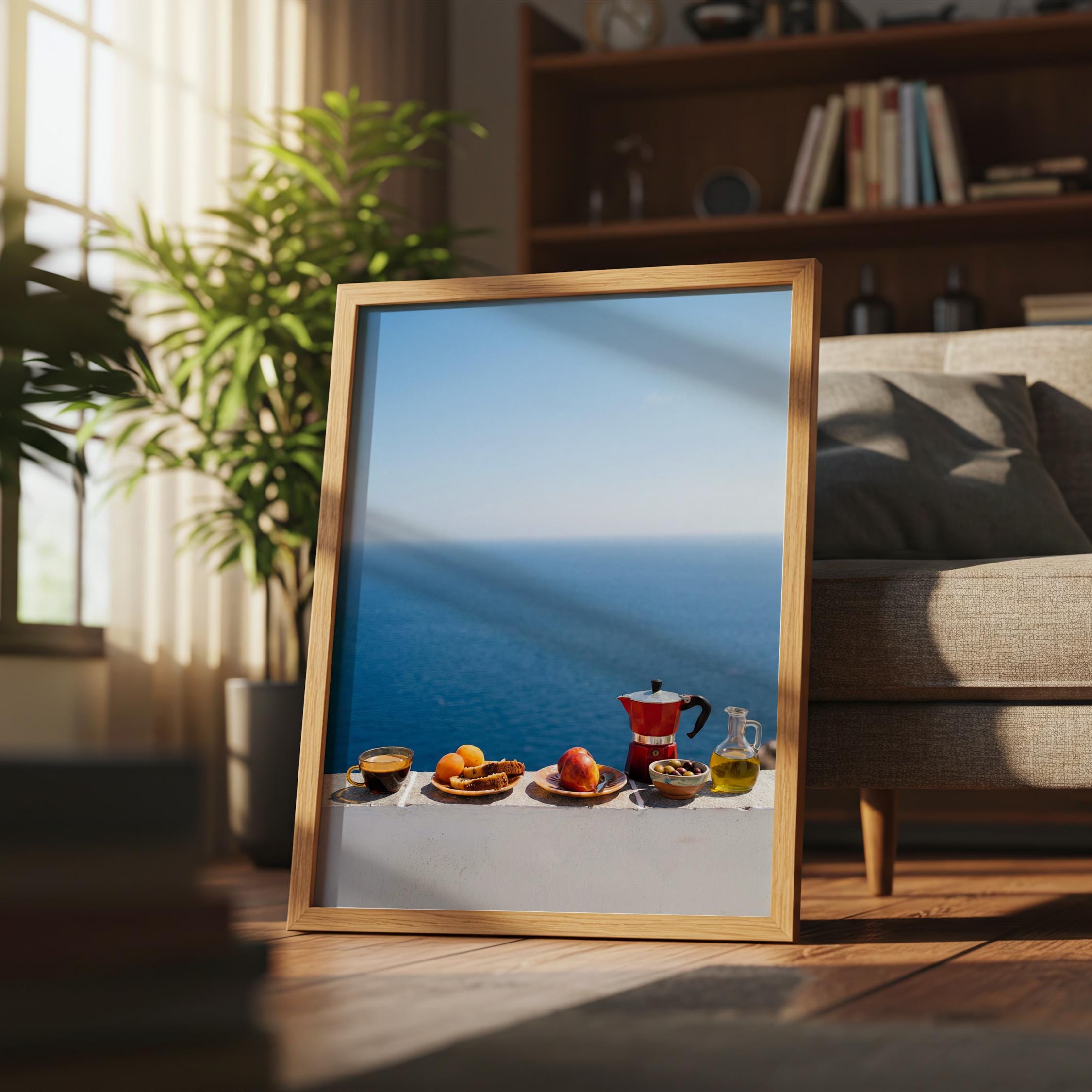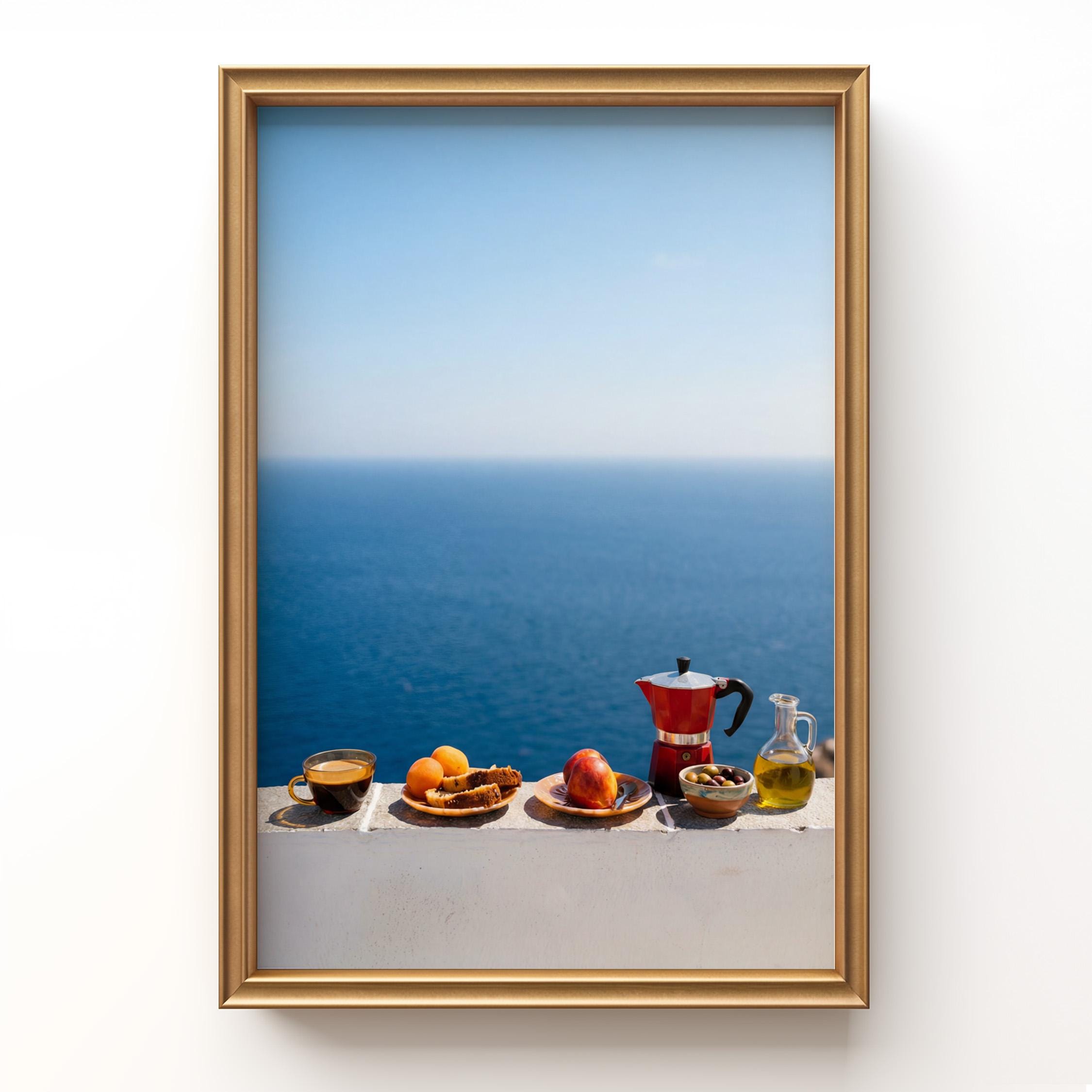This print captures the essence of a Mediterranean morning — simple ingredients, coastal air, and unhurried ritual. Inspired by the Mediterranean diet and its focus on balance and fresh food, the scene feels both nourishing and timeless. Perfect for kitchens, dining spaces, or homes inspired by coastal living and mindful meals.