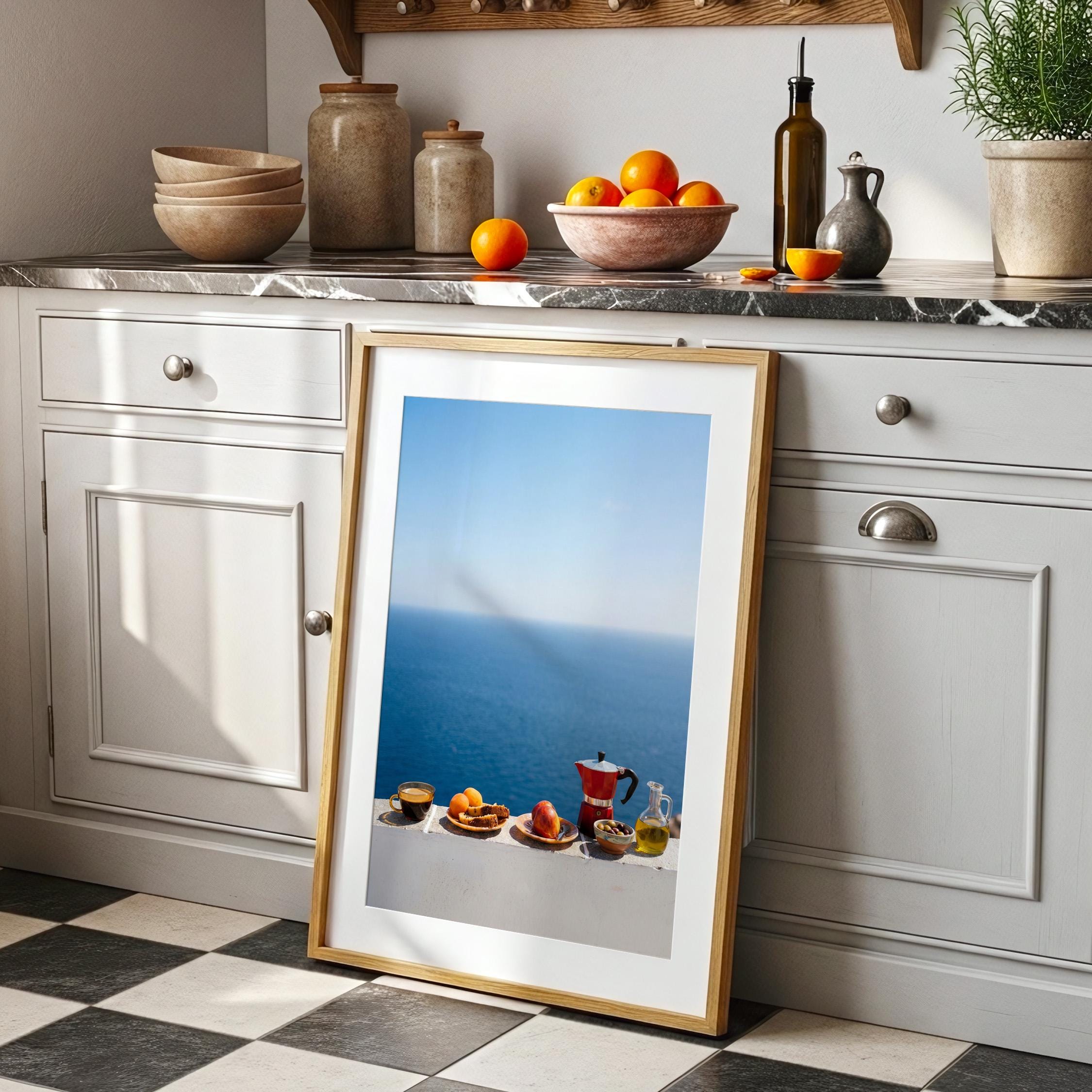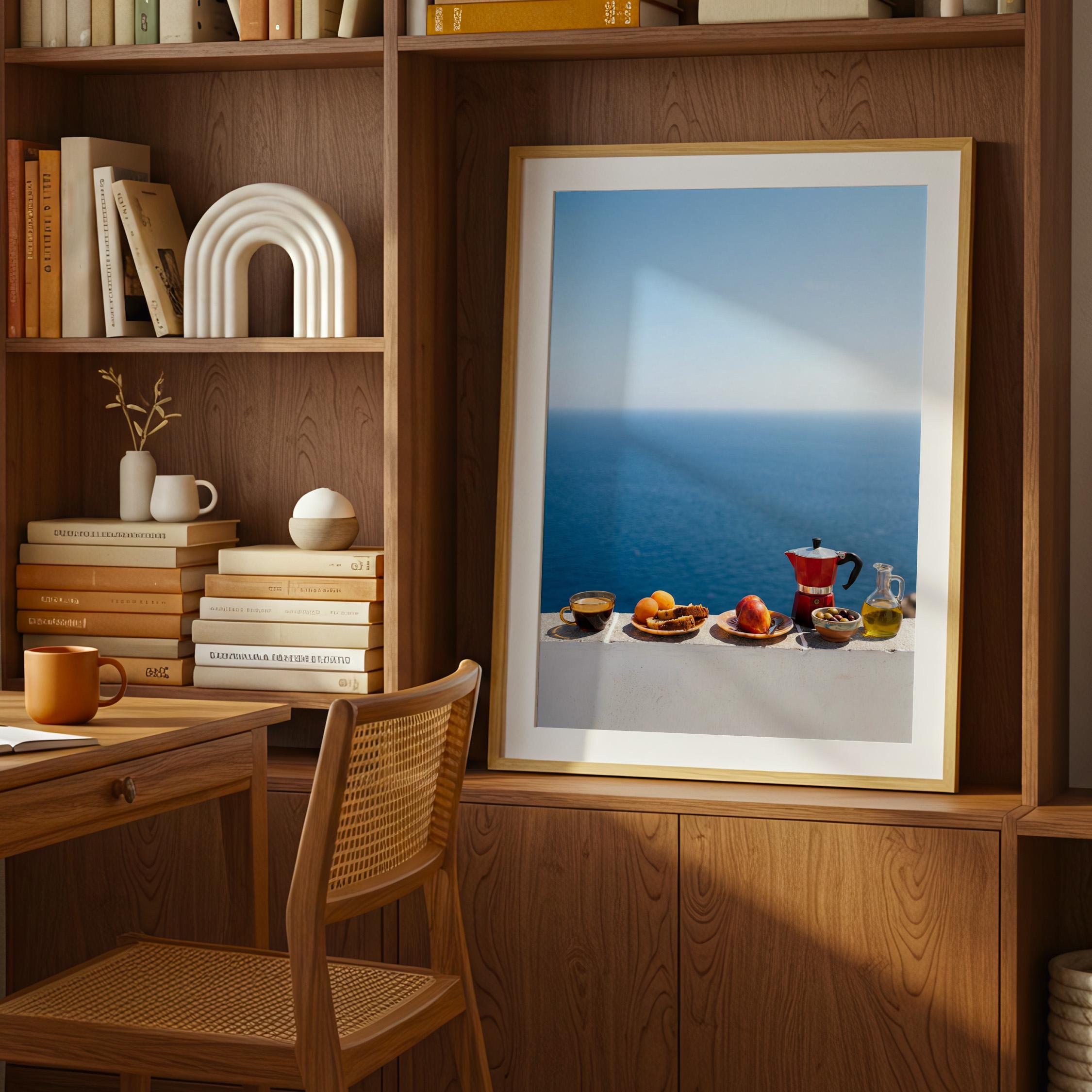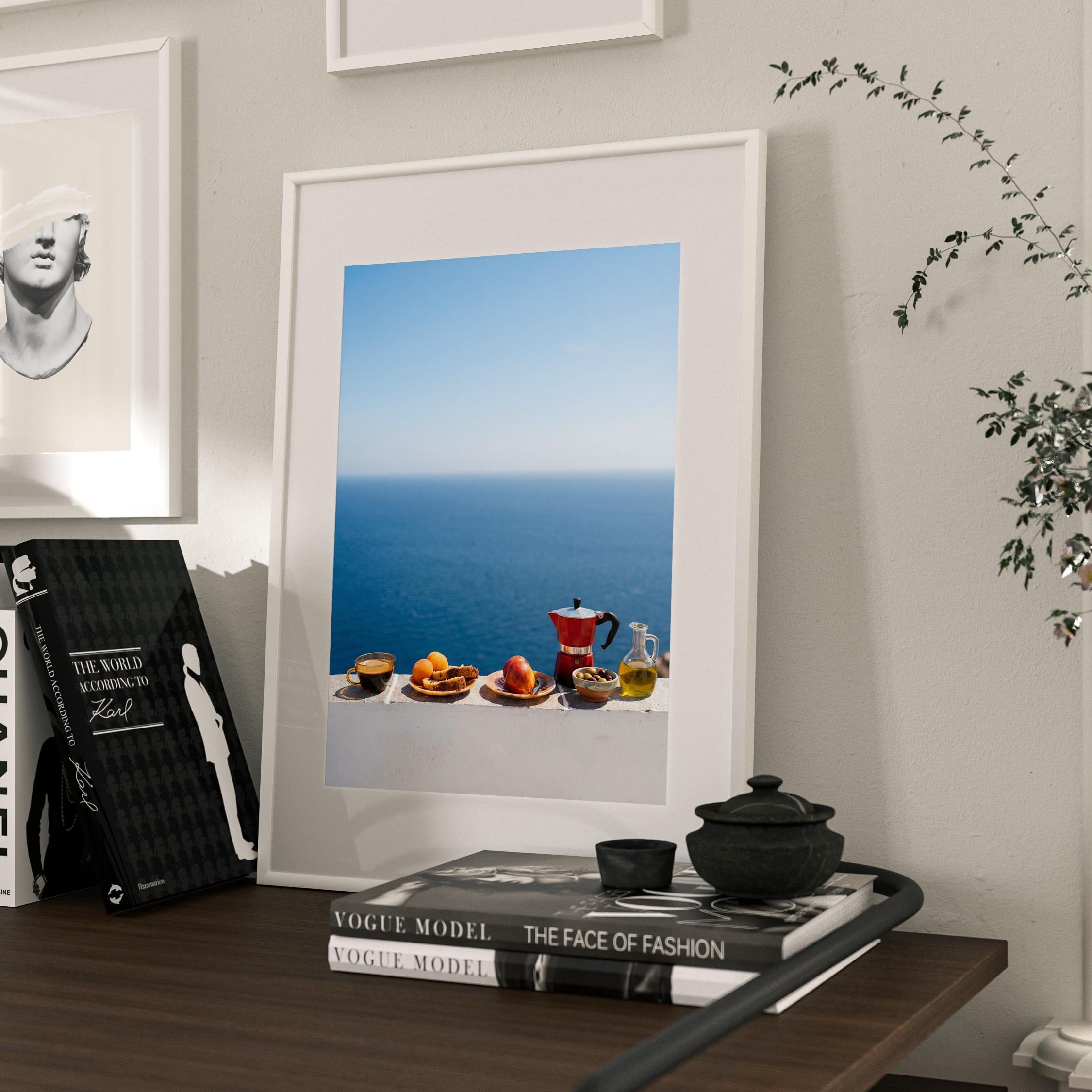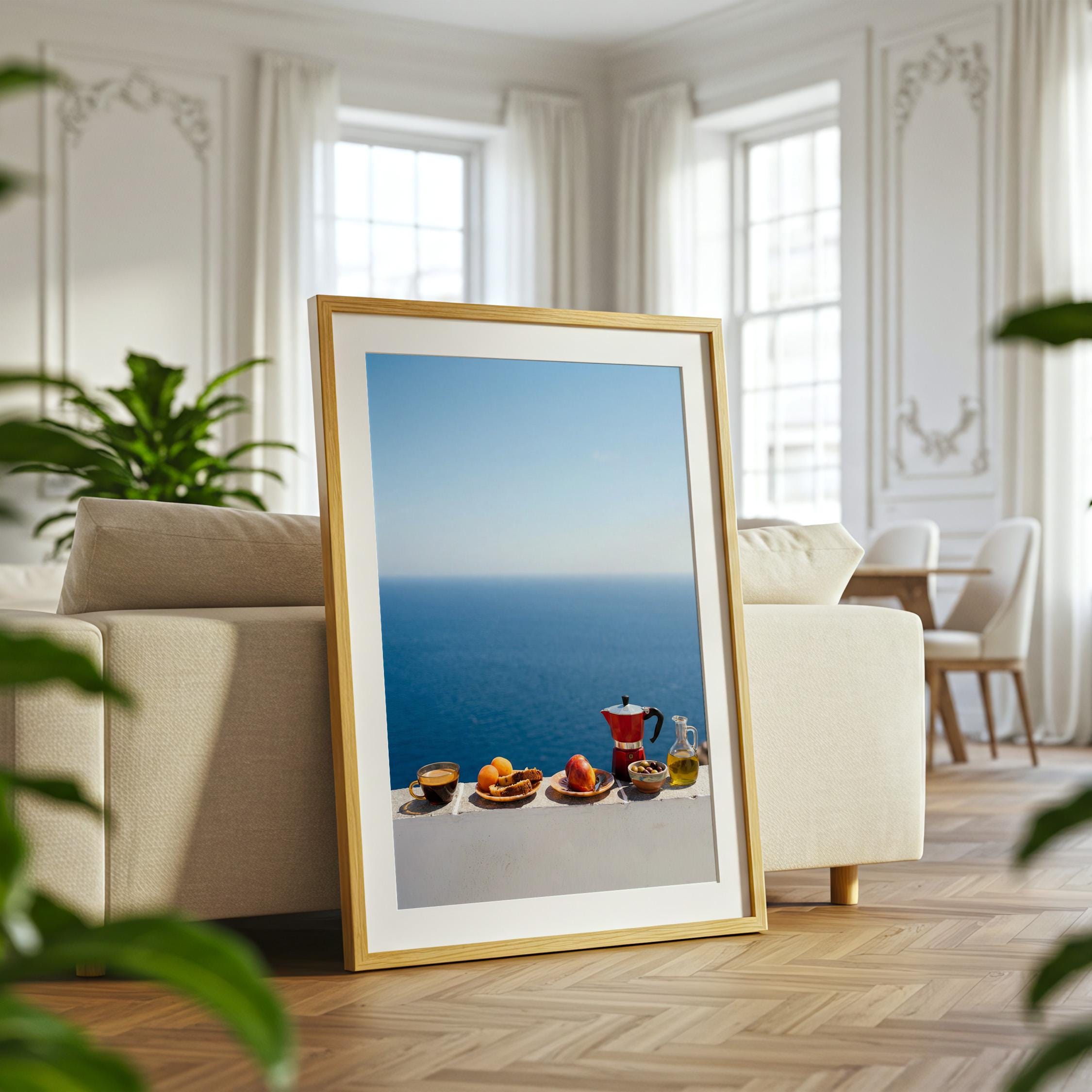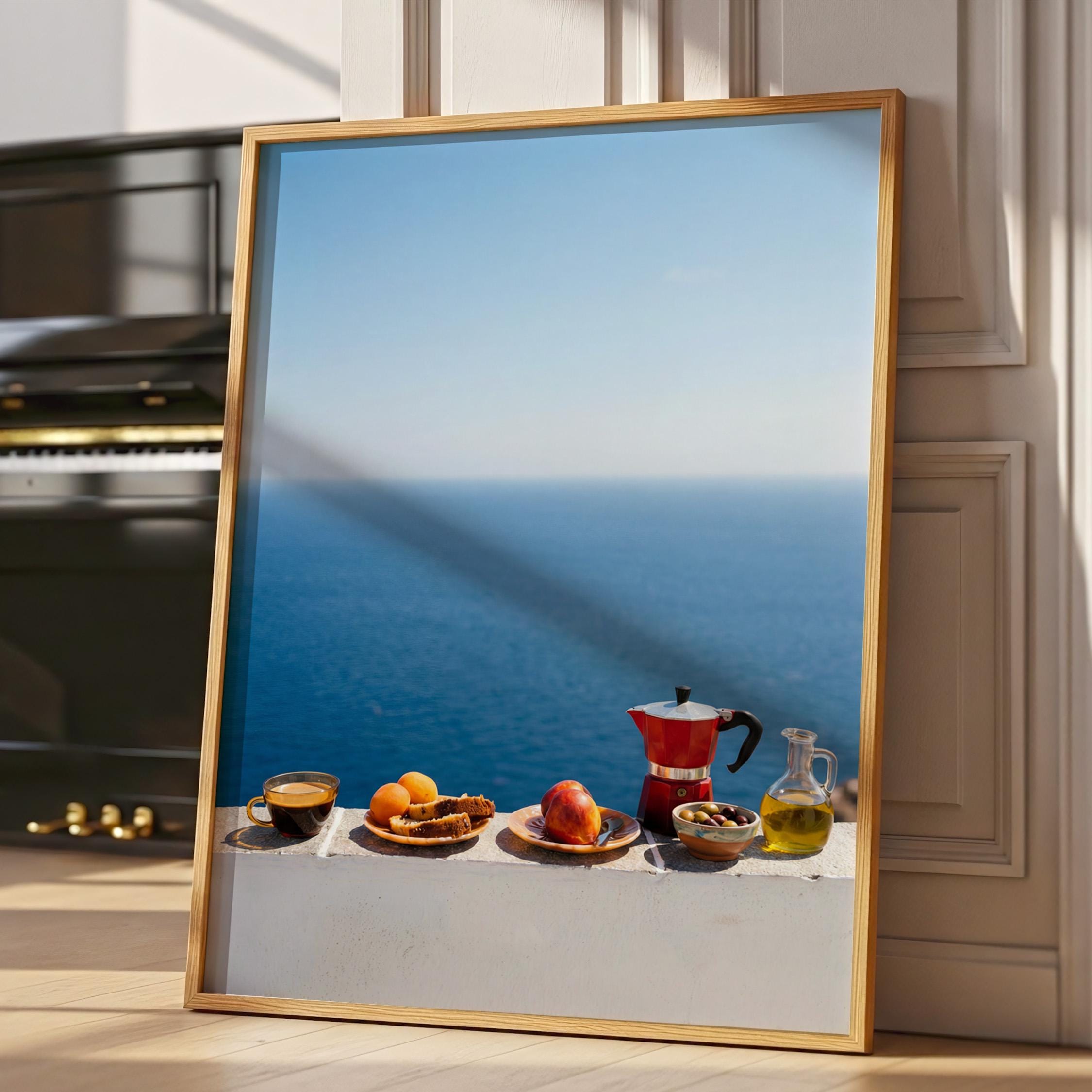 This print captures the essence of a Mediterranean morning — simple ingredients, coastal air, and unhurried ritual. Inspired by the Mediterranean diet and its focus on balance and fresh food, the scene feels both nourishing and timeless. Perfect for kitchens, dining spaces, or homes inspired by coastal living and mindful meals.