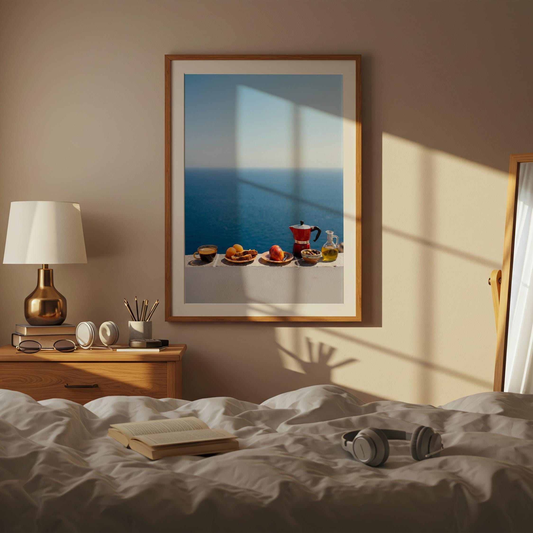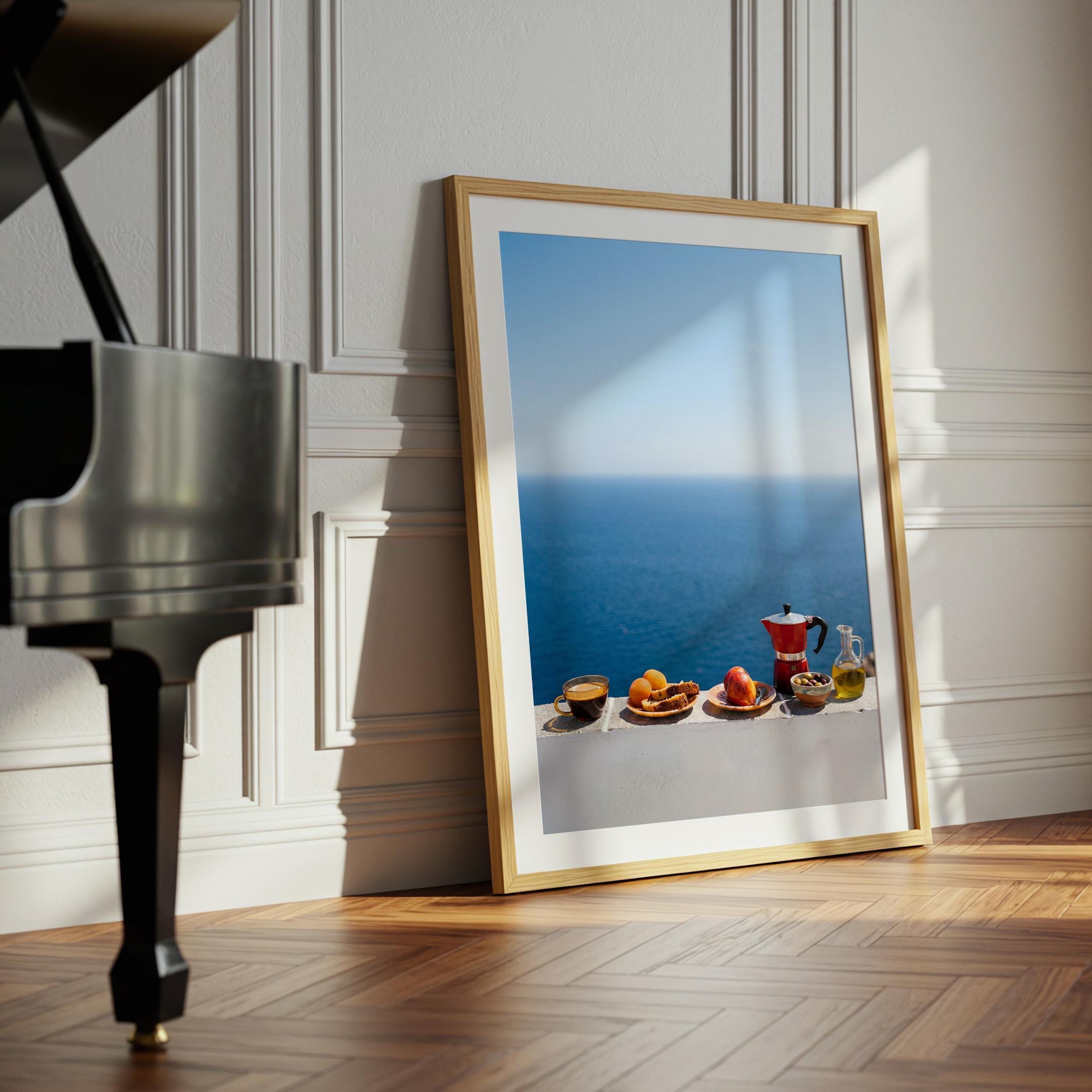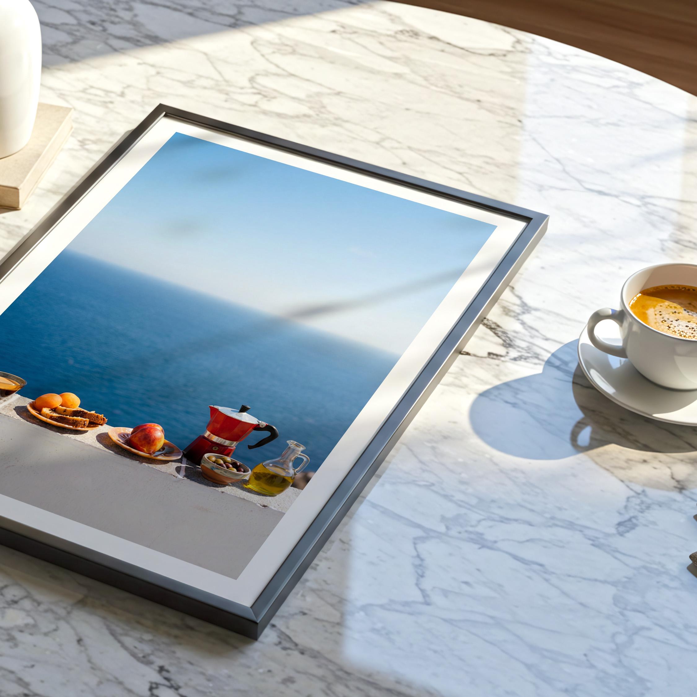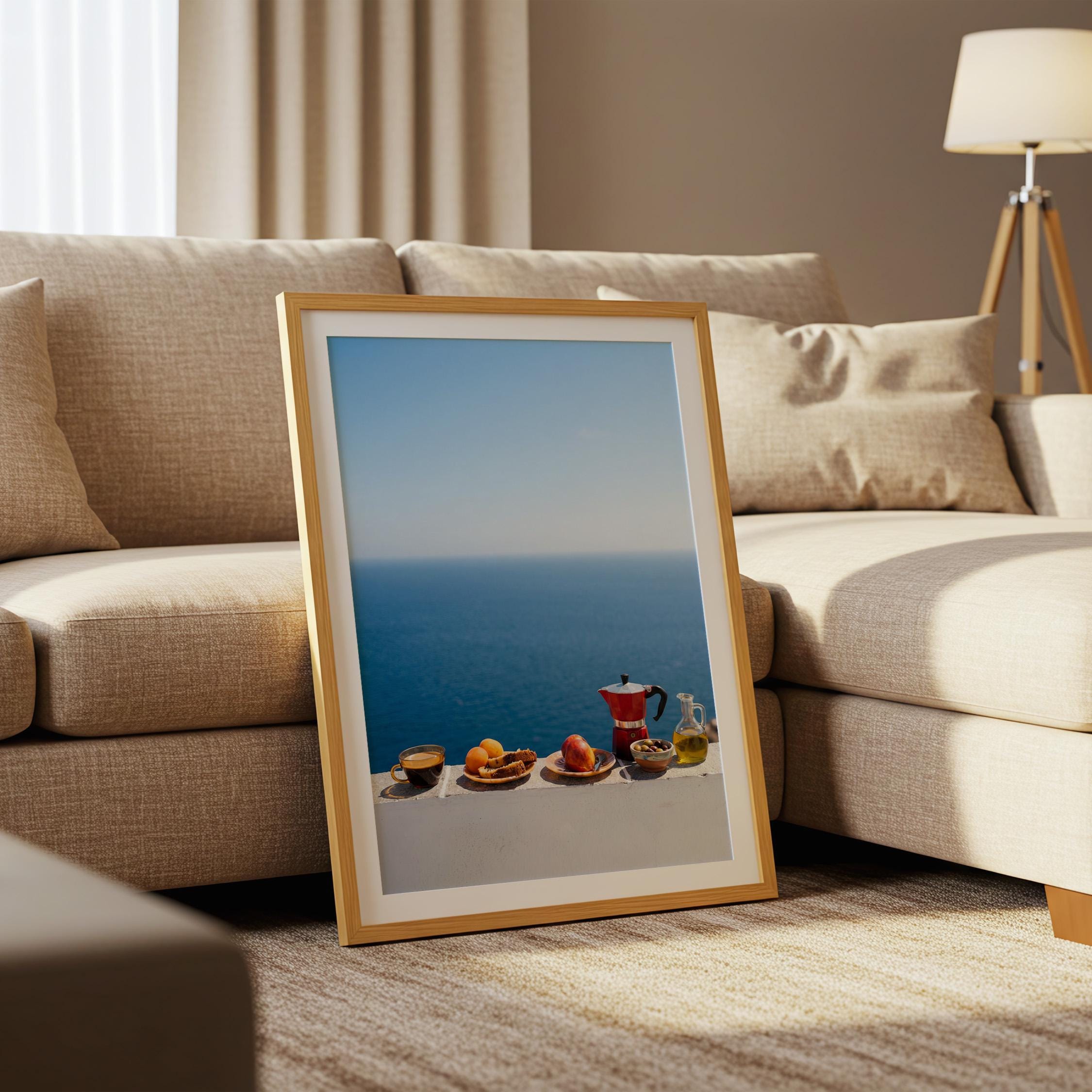 This print captures the essence of a Mediterranean morning — simple ingredients, coastal air, and unhurried ritual. Inspired by the Mediterranean diet and its focus on balance and fresh food, the scene feels both nourishing and timeless. Perfect for kitchens, dining spaces, or homes inspired by coastal living and mindful meals.