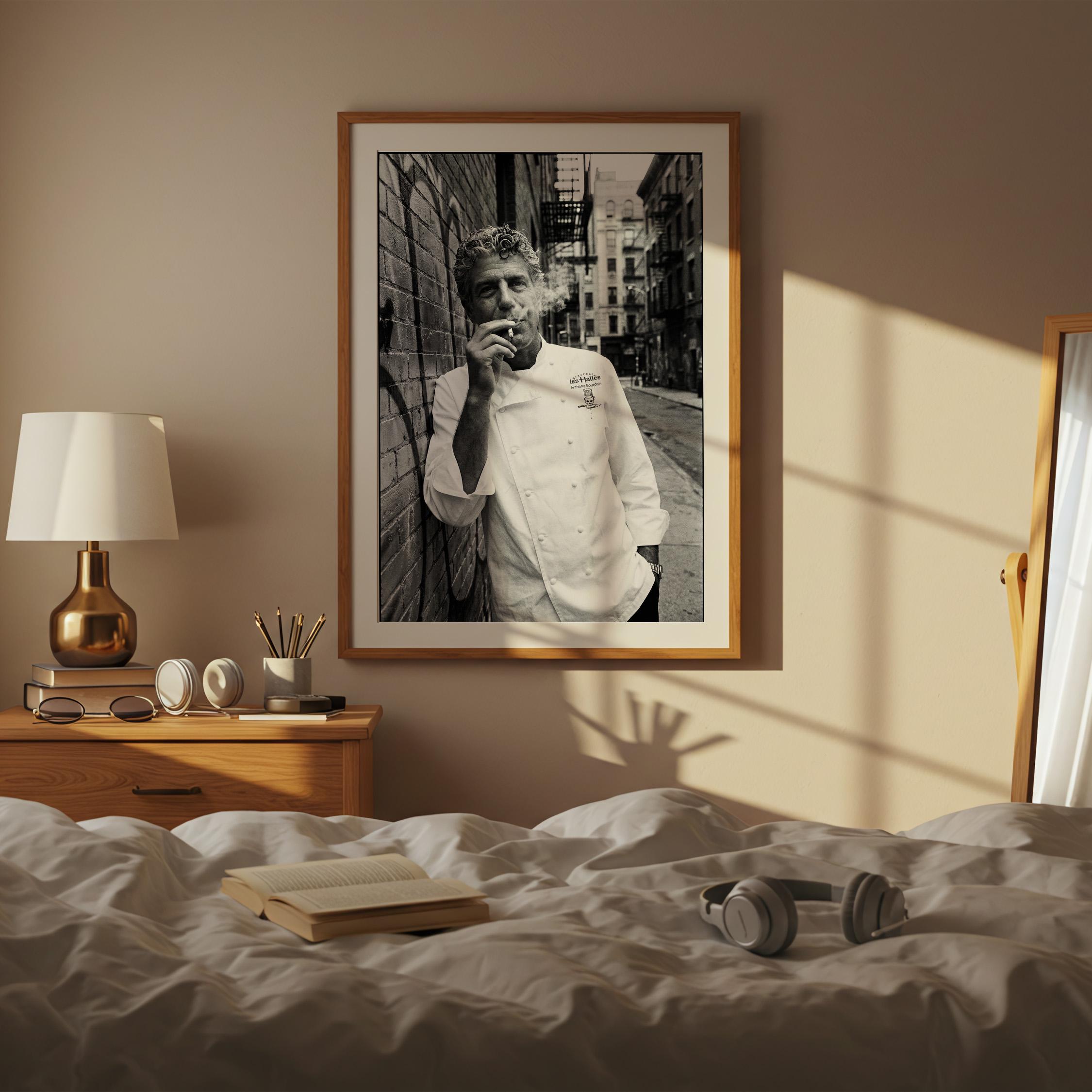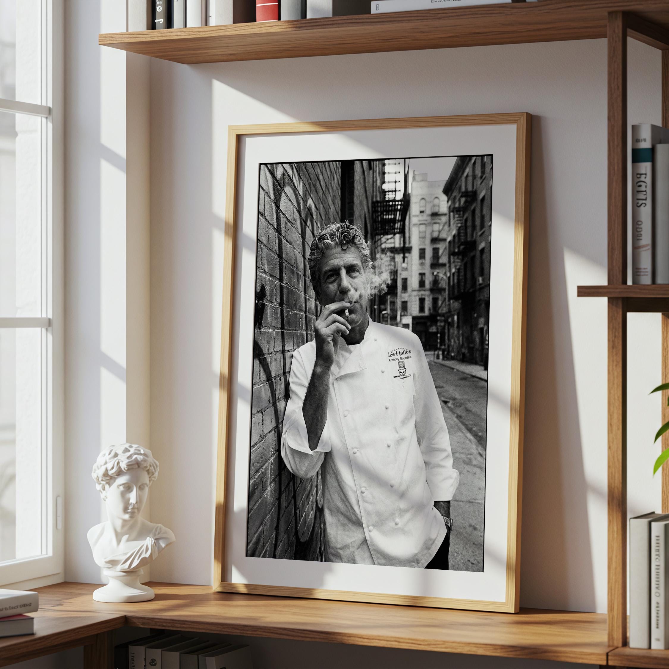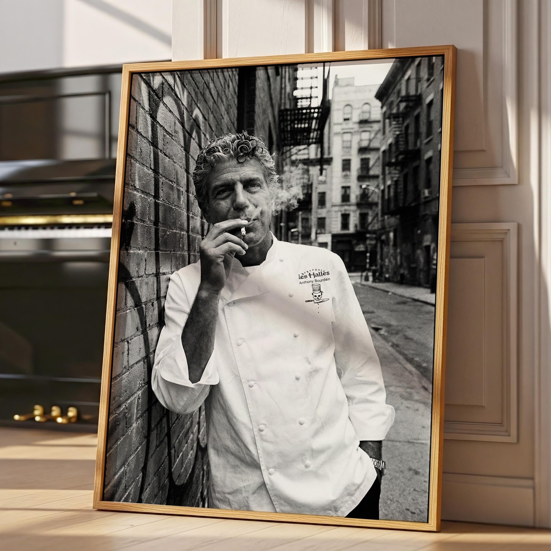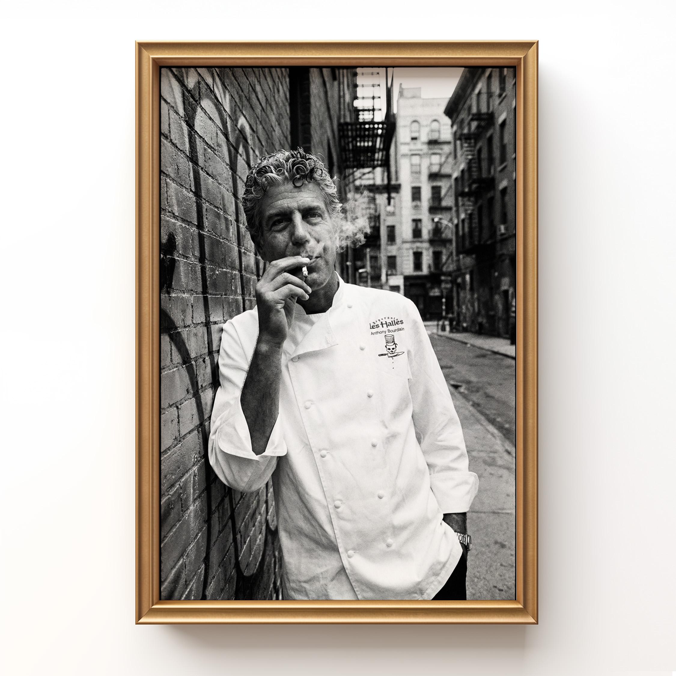 Shot in black and white, this portrait shows Anthony Bourdain leaning against a brick wall in a narrow city lane, cigarette in hand, chef jacket sharp and sleeves rolled. It’s raw, real, and full of the kind of quiet confidence he carried everywhere.