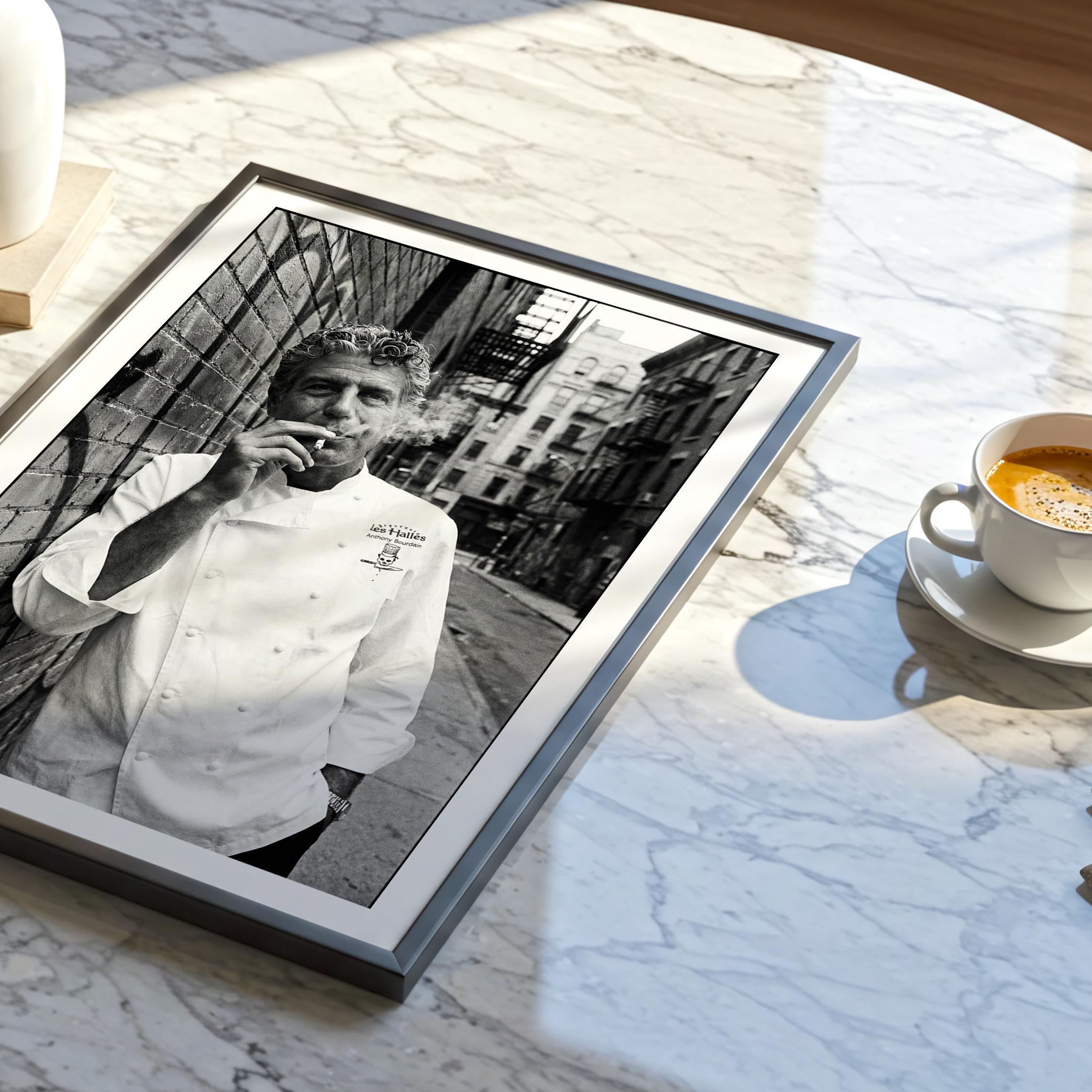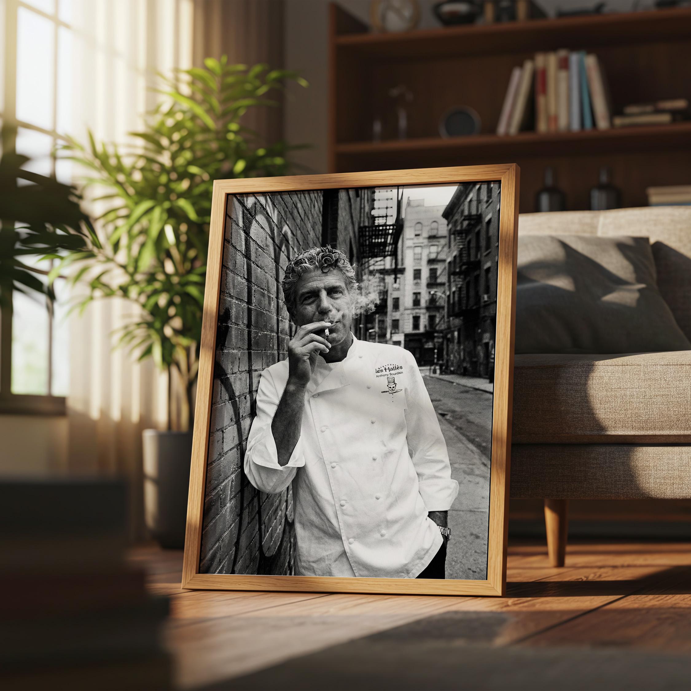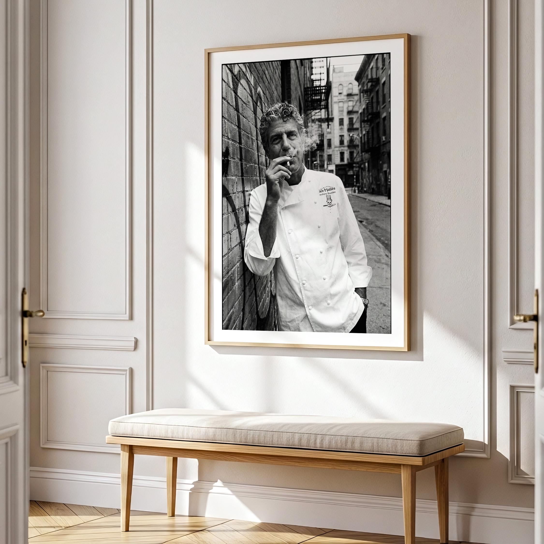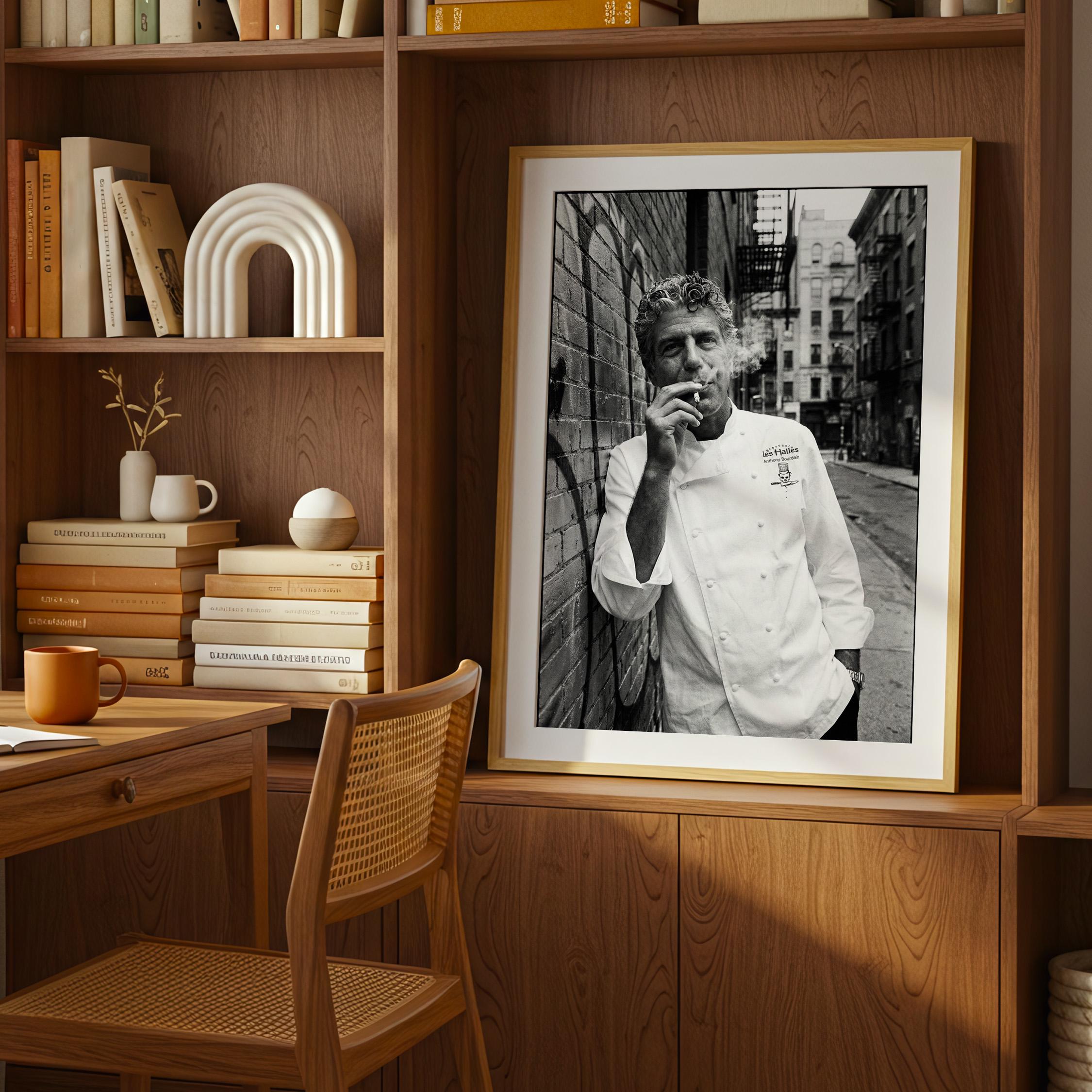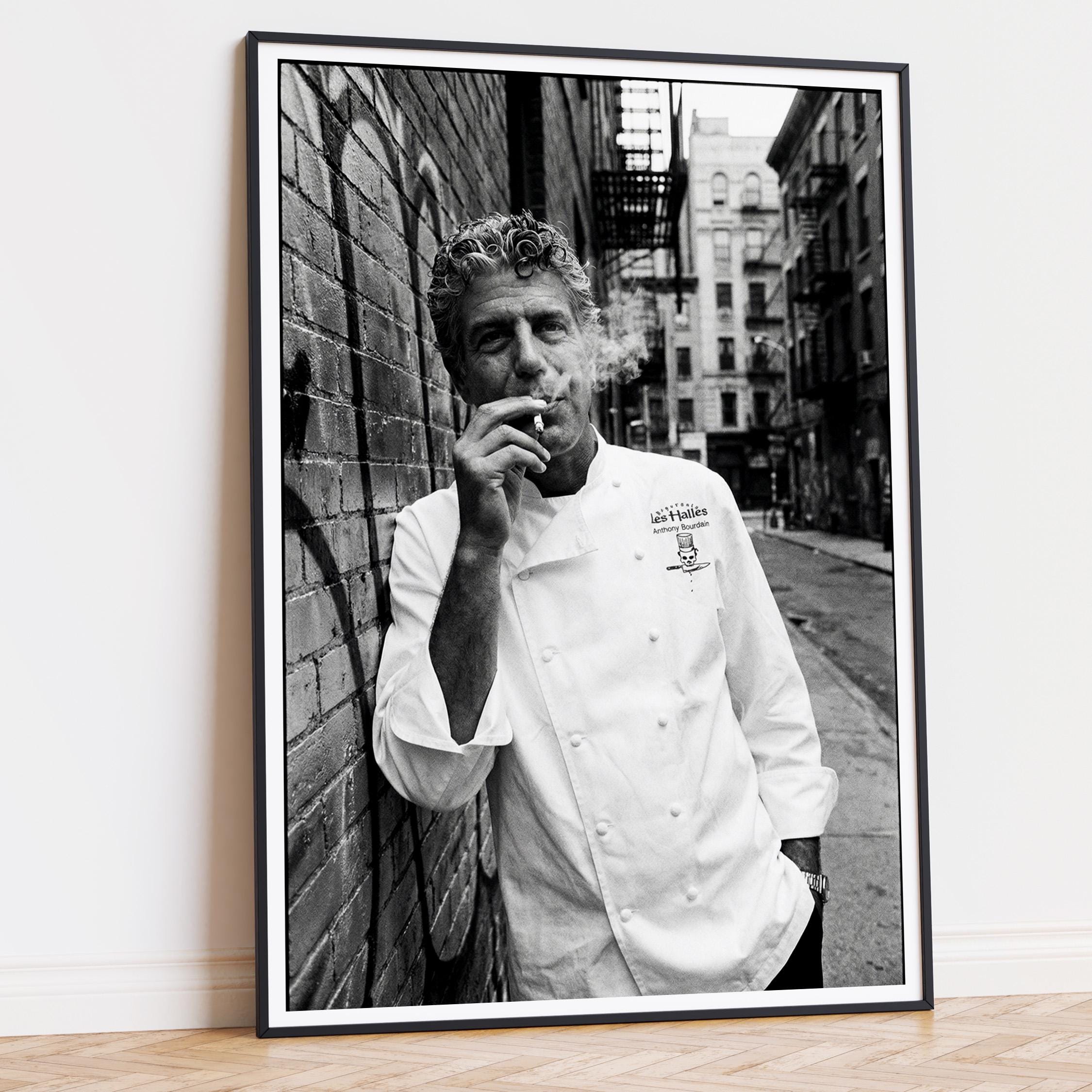 Shot in black and white, this portrait shows Anthony Bourdain leaning against a brick wall in a narrow city lane, cigarette in hand, chef jacket sharp and sleeves rolled. It’s raw, real, and full of the kind of quiet confidence he carried everywhere.