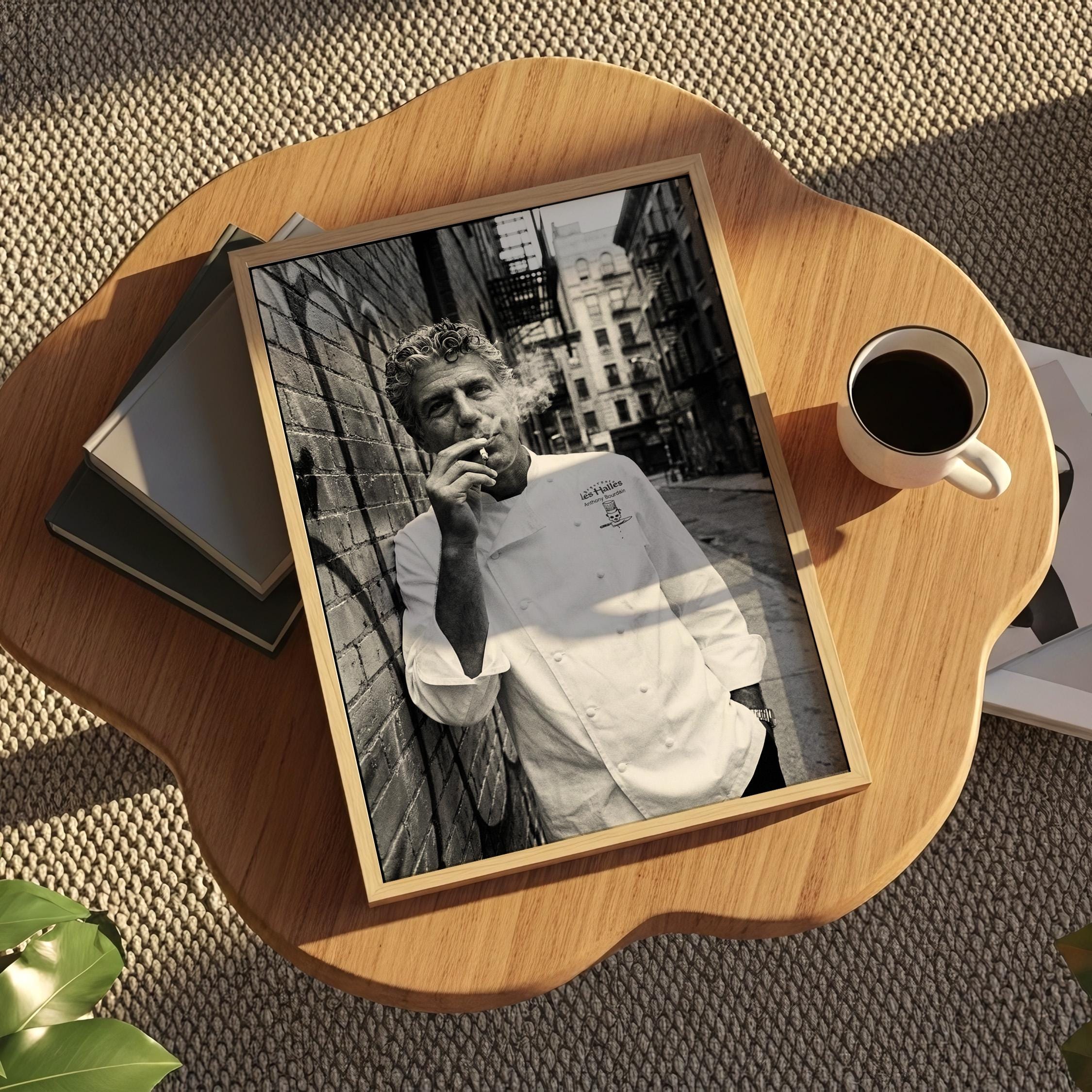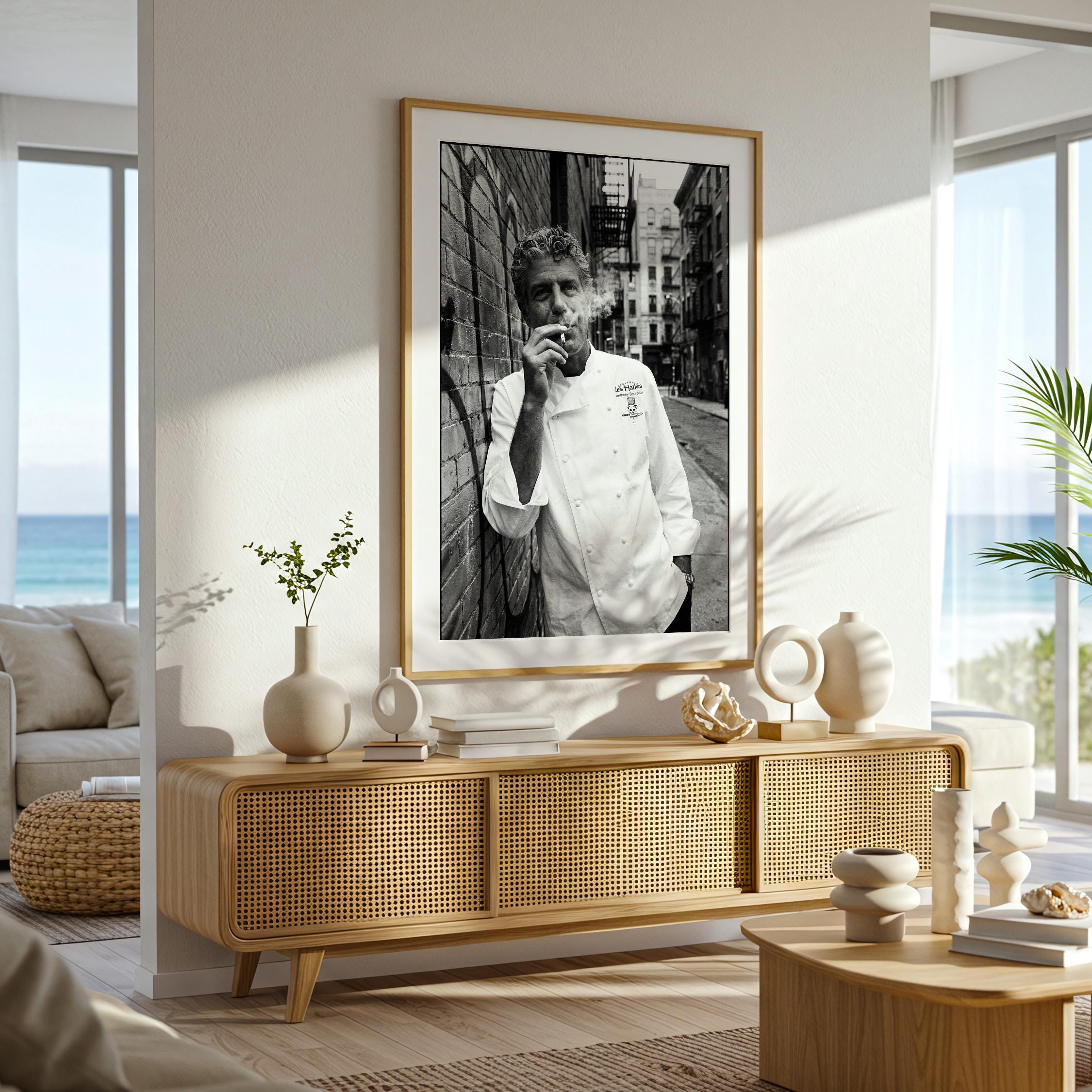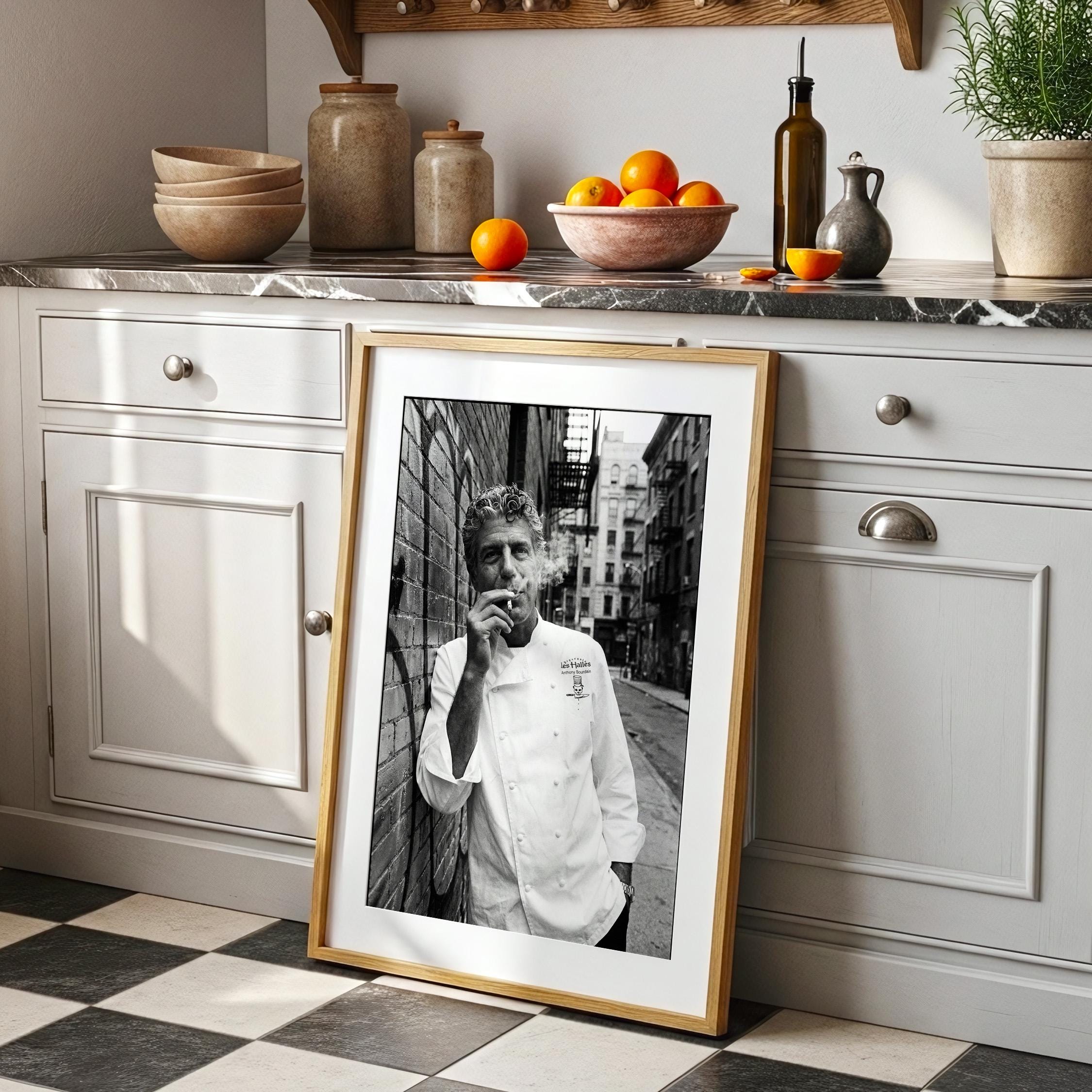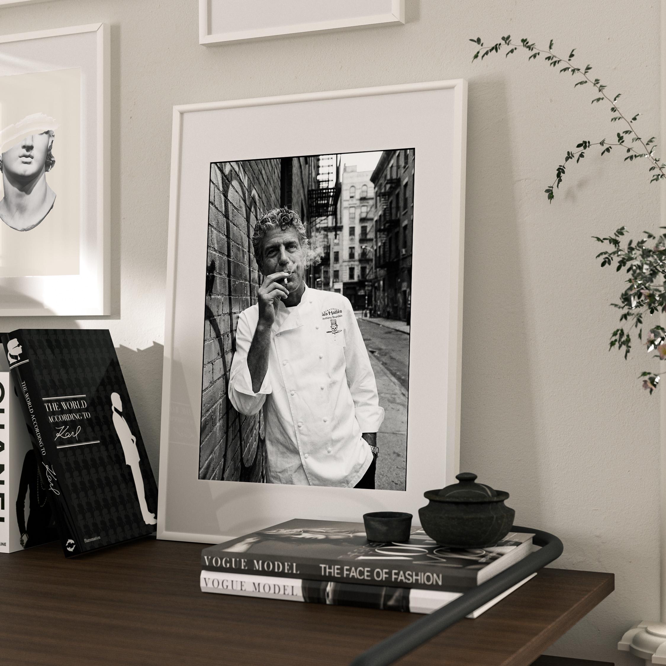 Shot in black and white, this portrait shows Anthony Bourdain leaning against a brick wall in a narrow city lane, cigarette in hand, chef jacket sharp and sleeves rolled. It’s raw, real, and full of the kind of quiet confidence he carried everywhere.