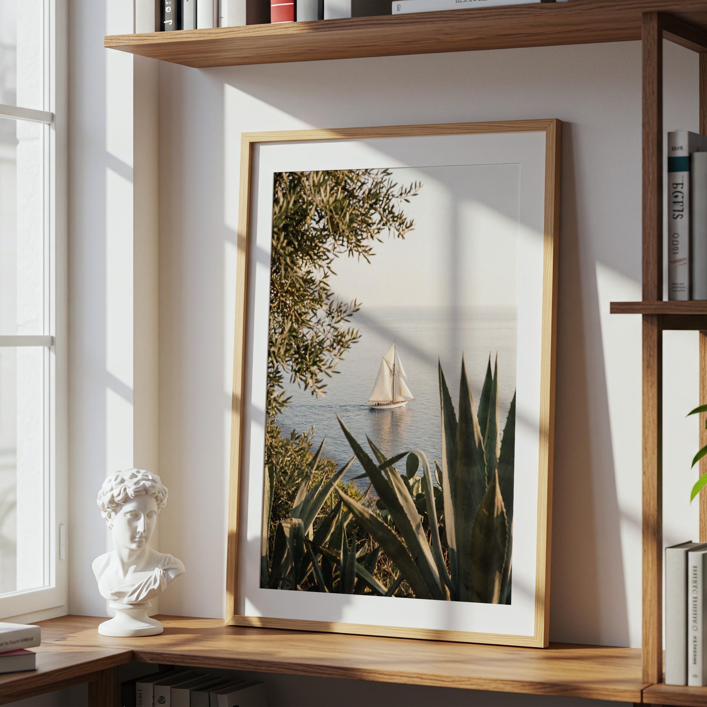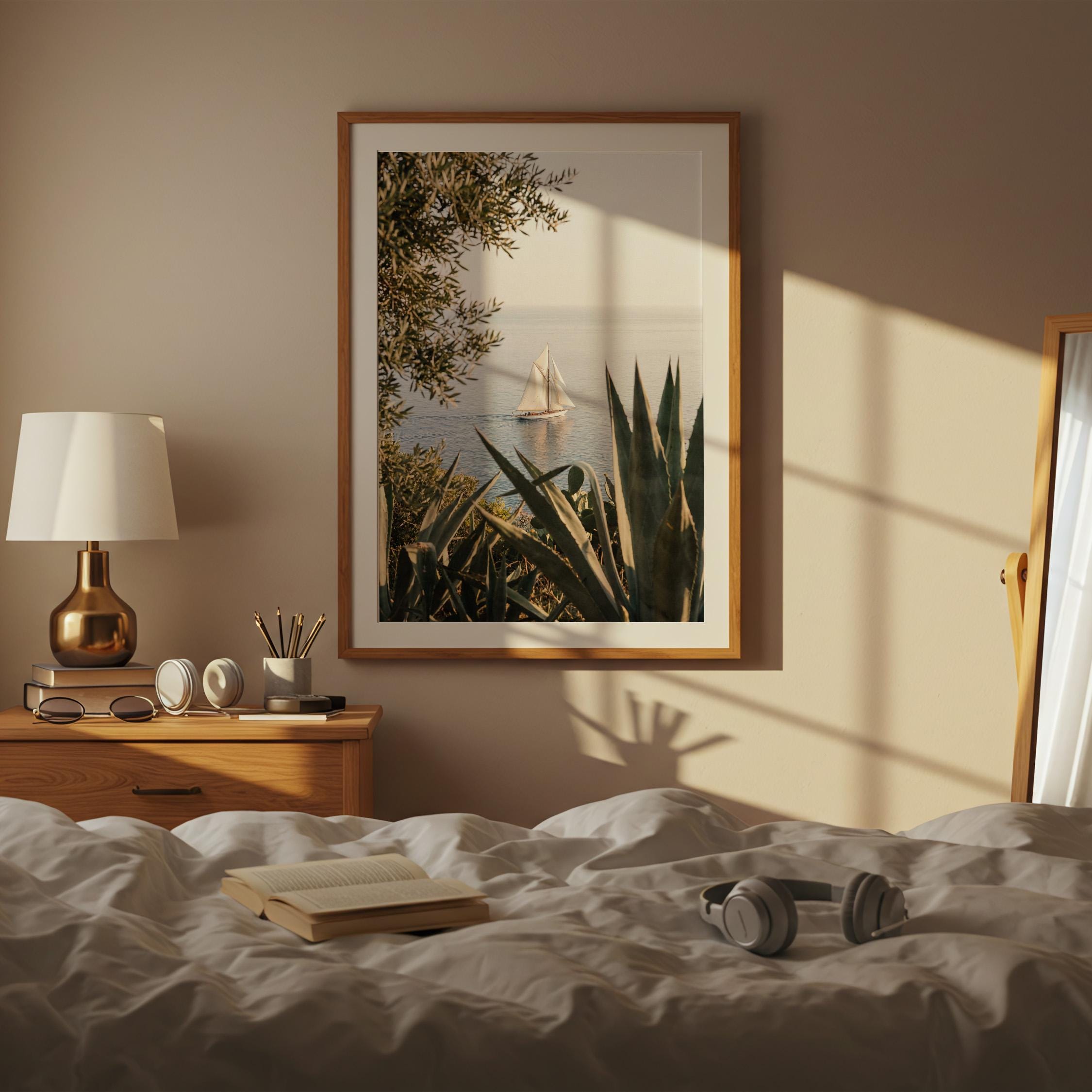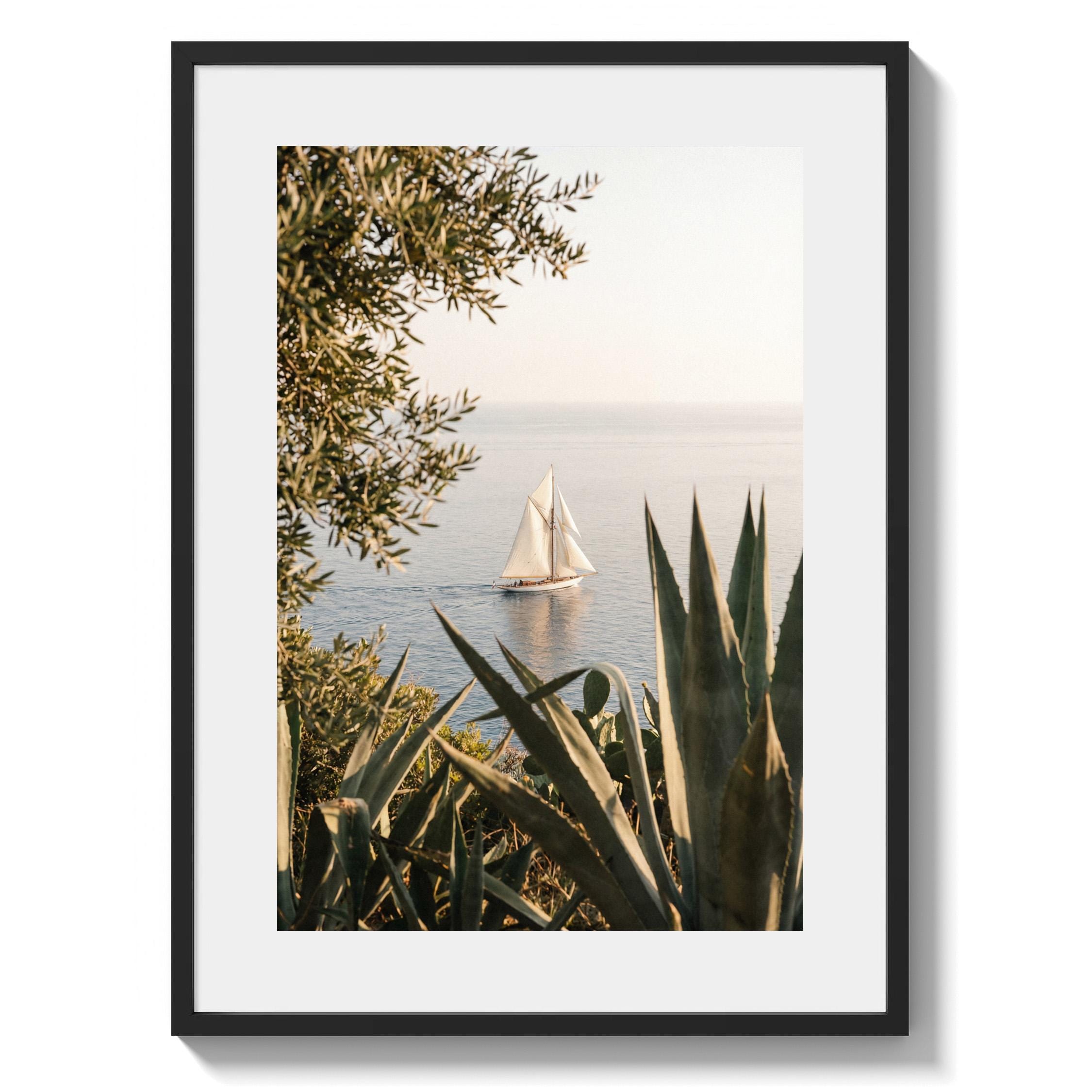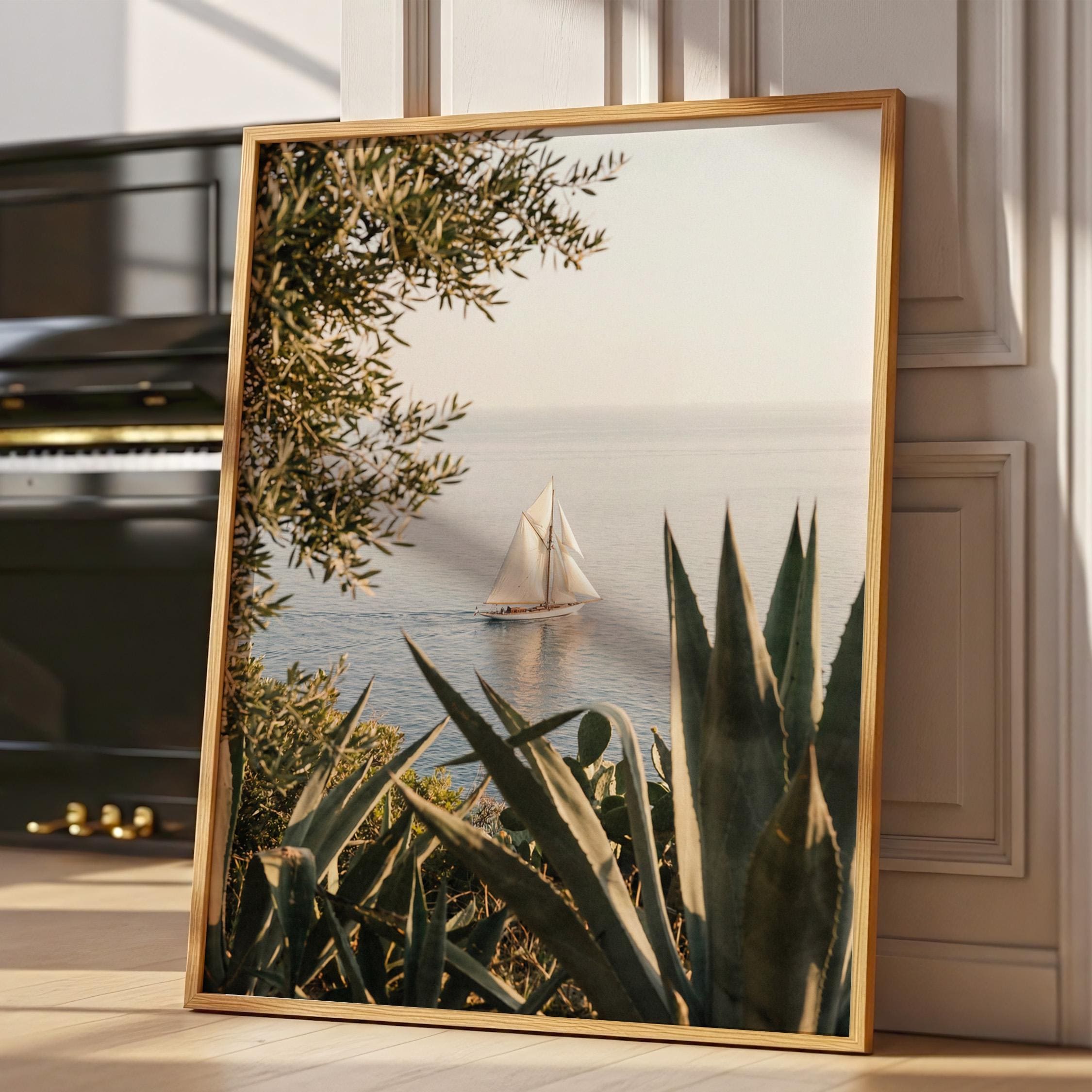 A classic sailboat drifting through calm Mediterranean waters, framed by sun-washed agave and olive branches. The light is soft. The mood is restrained. Nothing forced. This piece carries that old money aesthetic — understated, timeless, composed. It feels like summers on the coast, linen shirts, inherited taste.