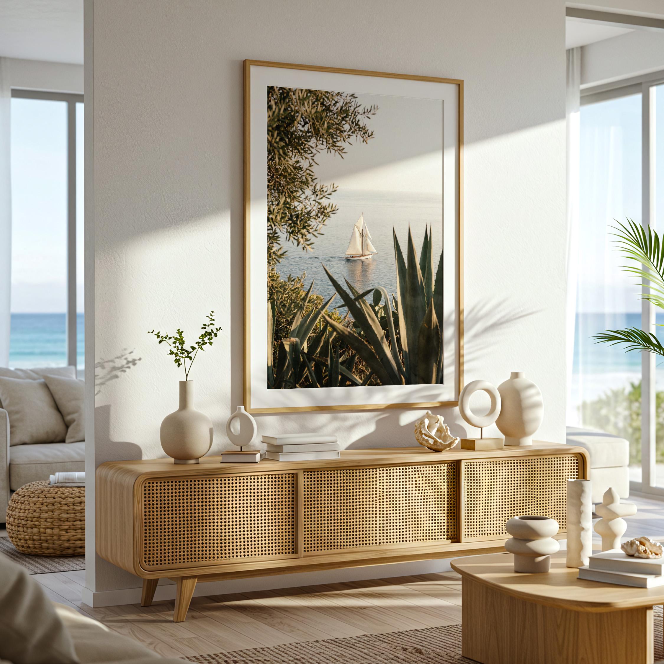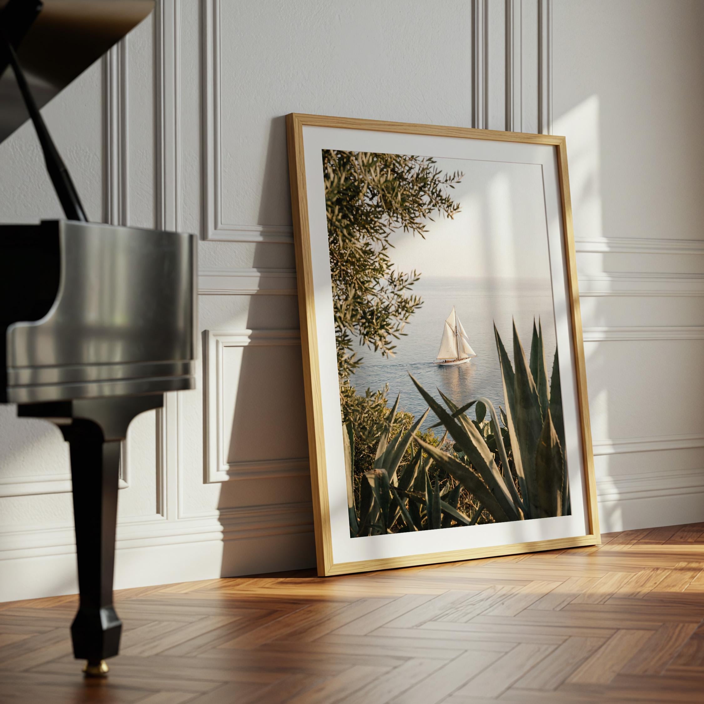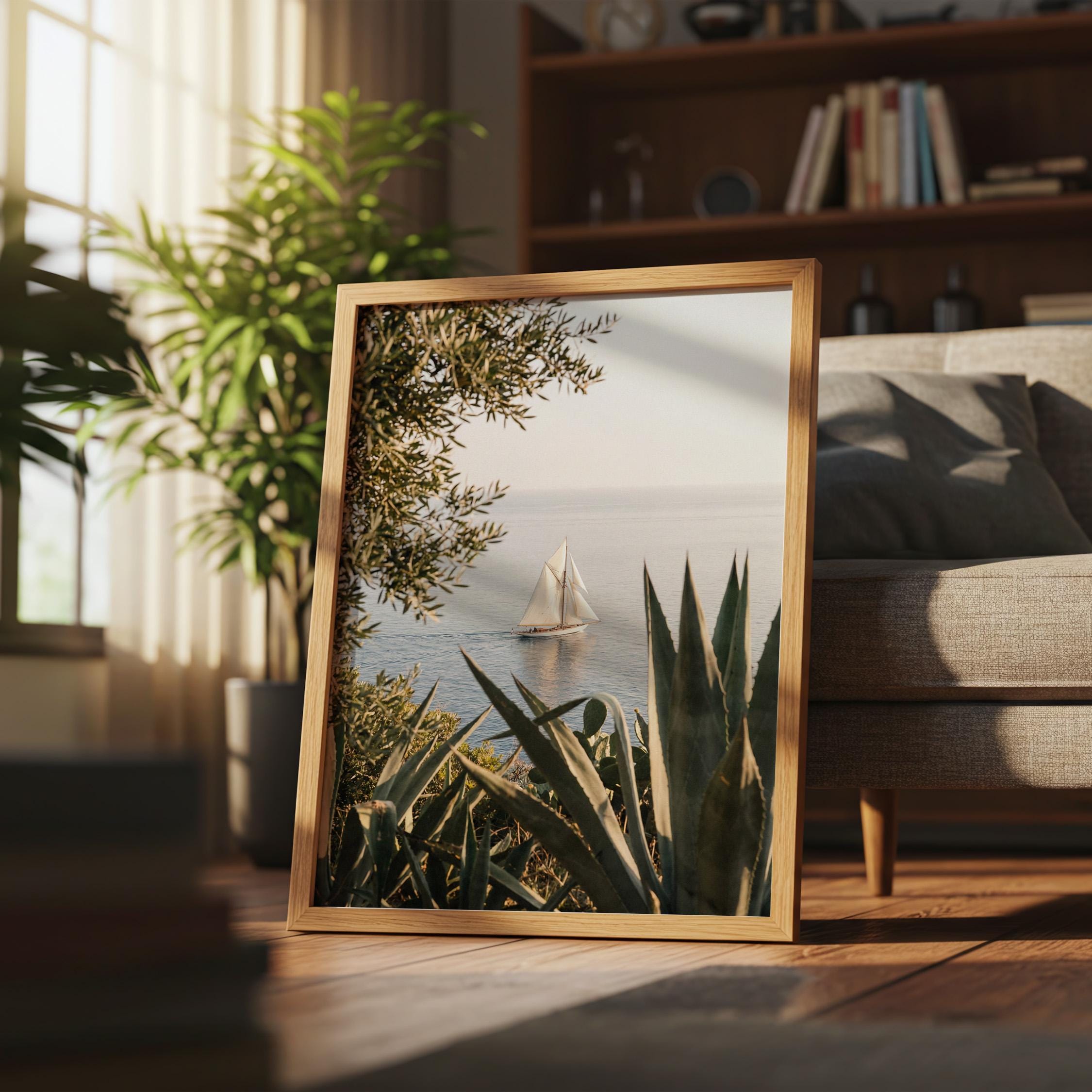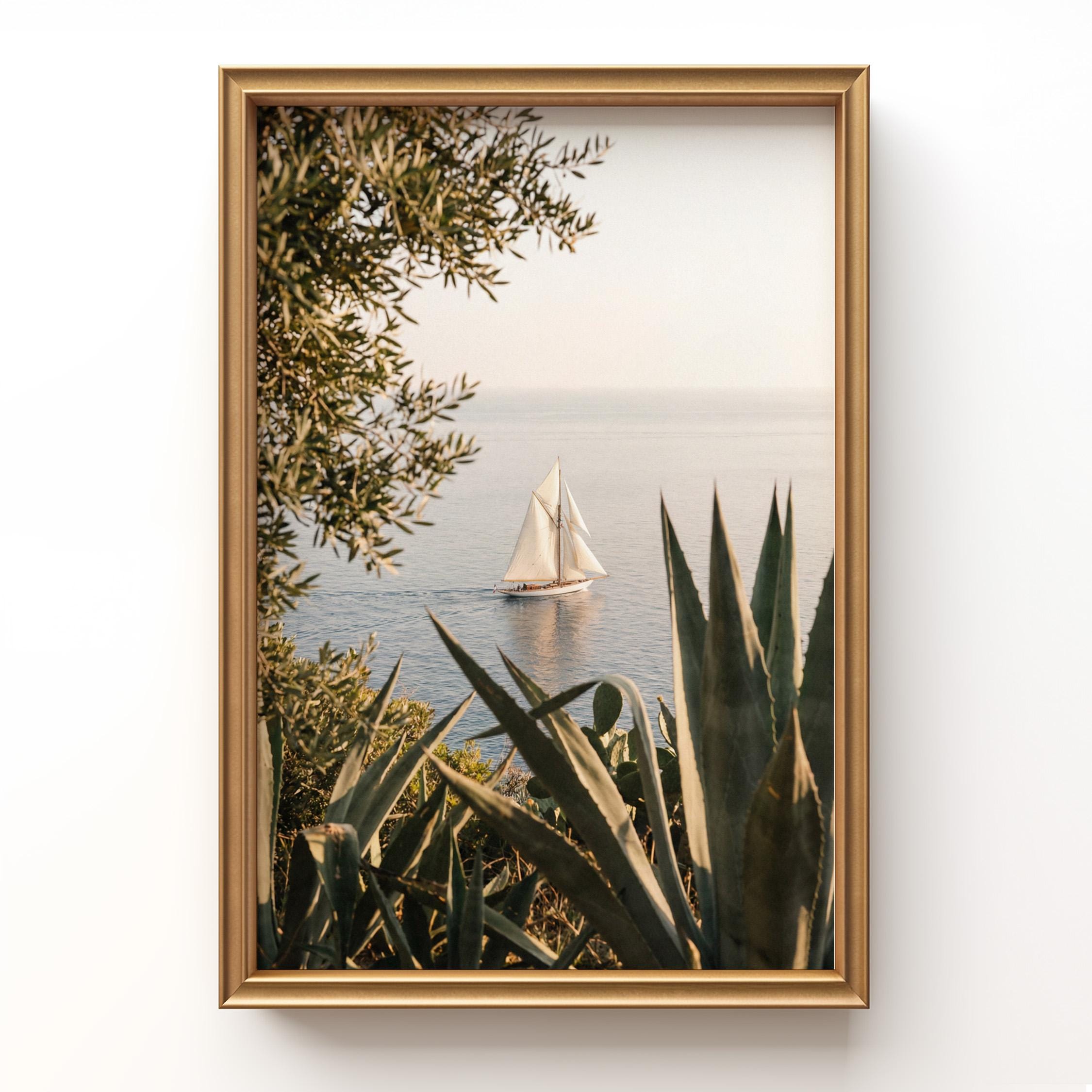 A classic sailboat drifting through calm Mediterranean waters, framed by sun-washed agave and olive branches. The light is soft. The mood is restrained. Nothing forced. This piece carries that old money aesthetic — understated, timeless, composed. It feels like summers on the coast, linen shirts, inherited taste.