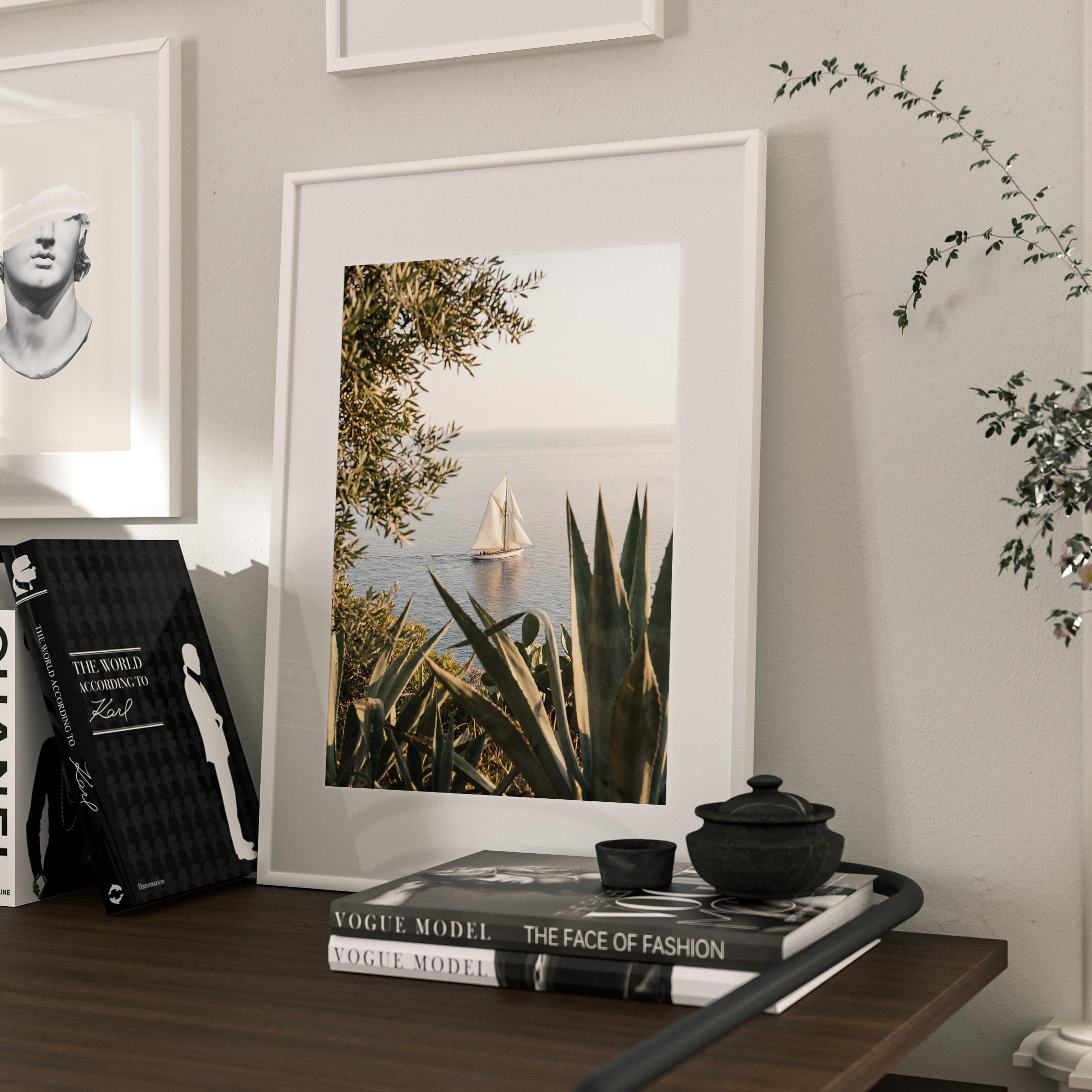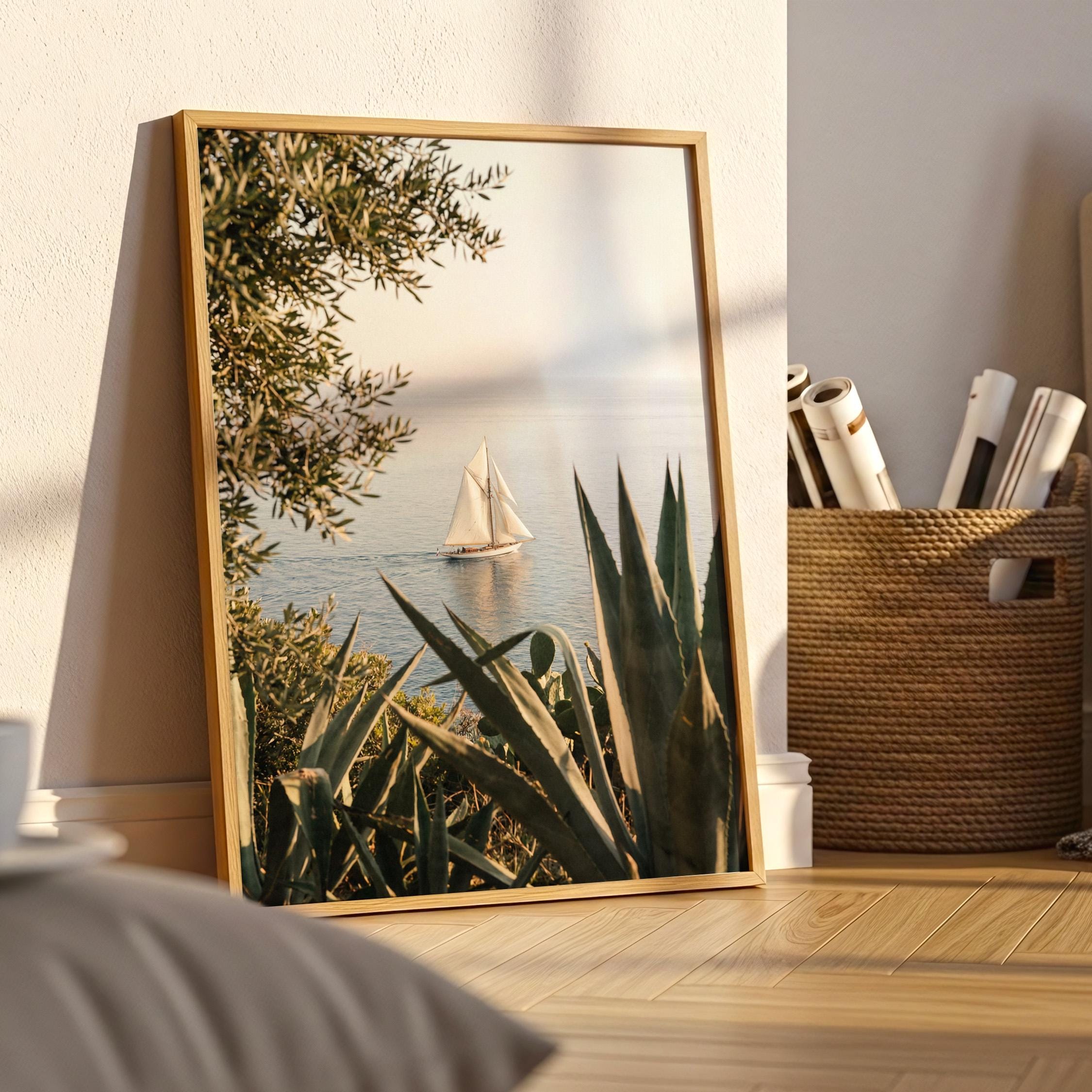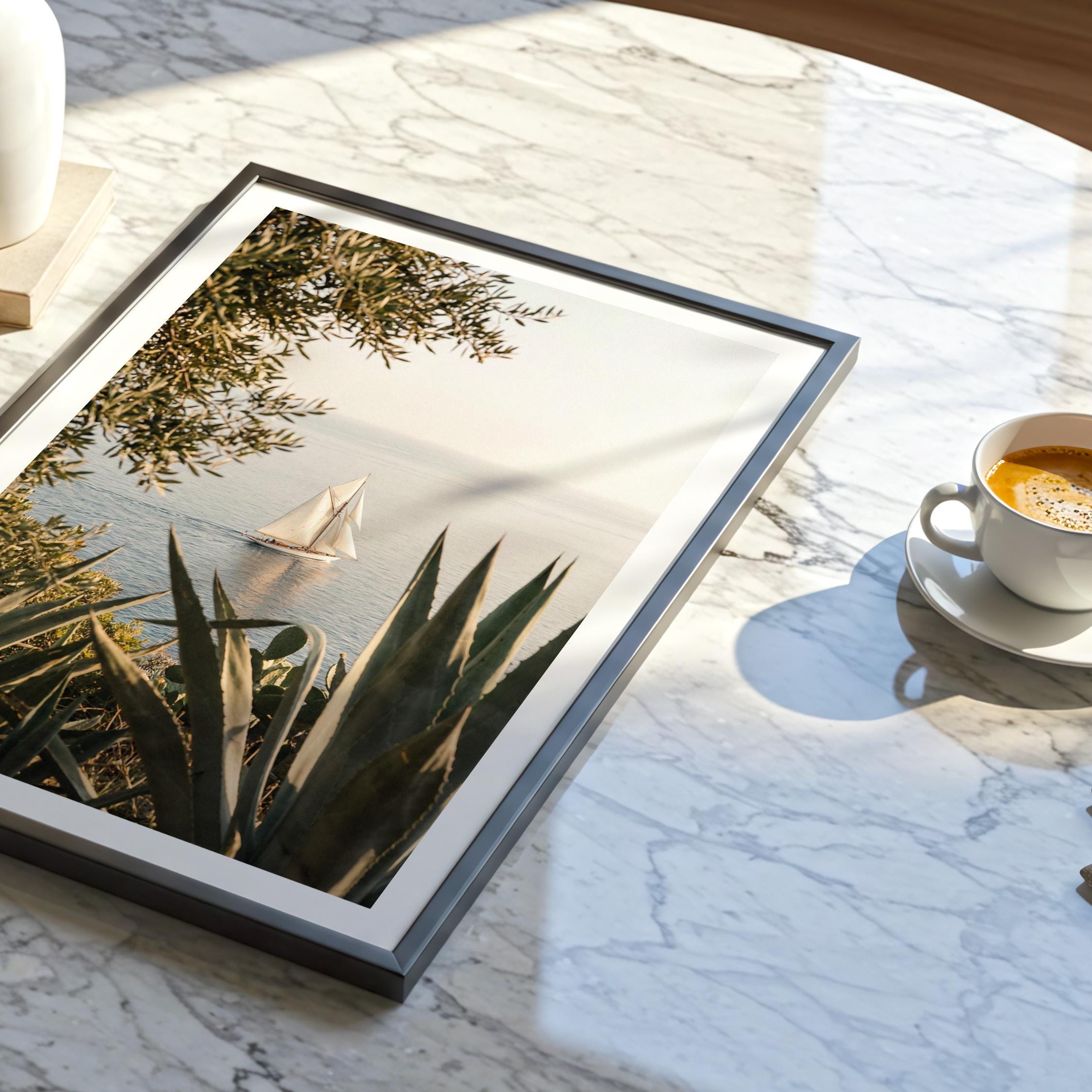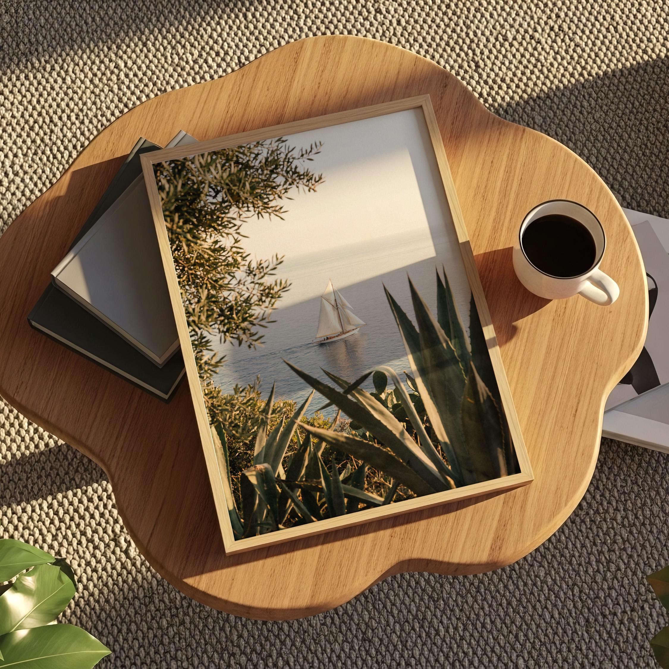 A classic sailboat drifting through calm Mediterranean waters, framed by sun-washed agave and olive branches. The light is soft. The mood is restrained. Nothing forced. This piece carries that old money aesthetic — understated, timeless, composed. It feels like summers on the coast, linen shirts, inherited taste.