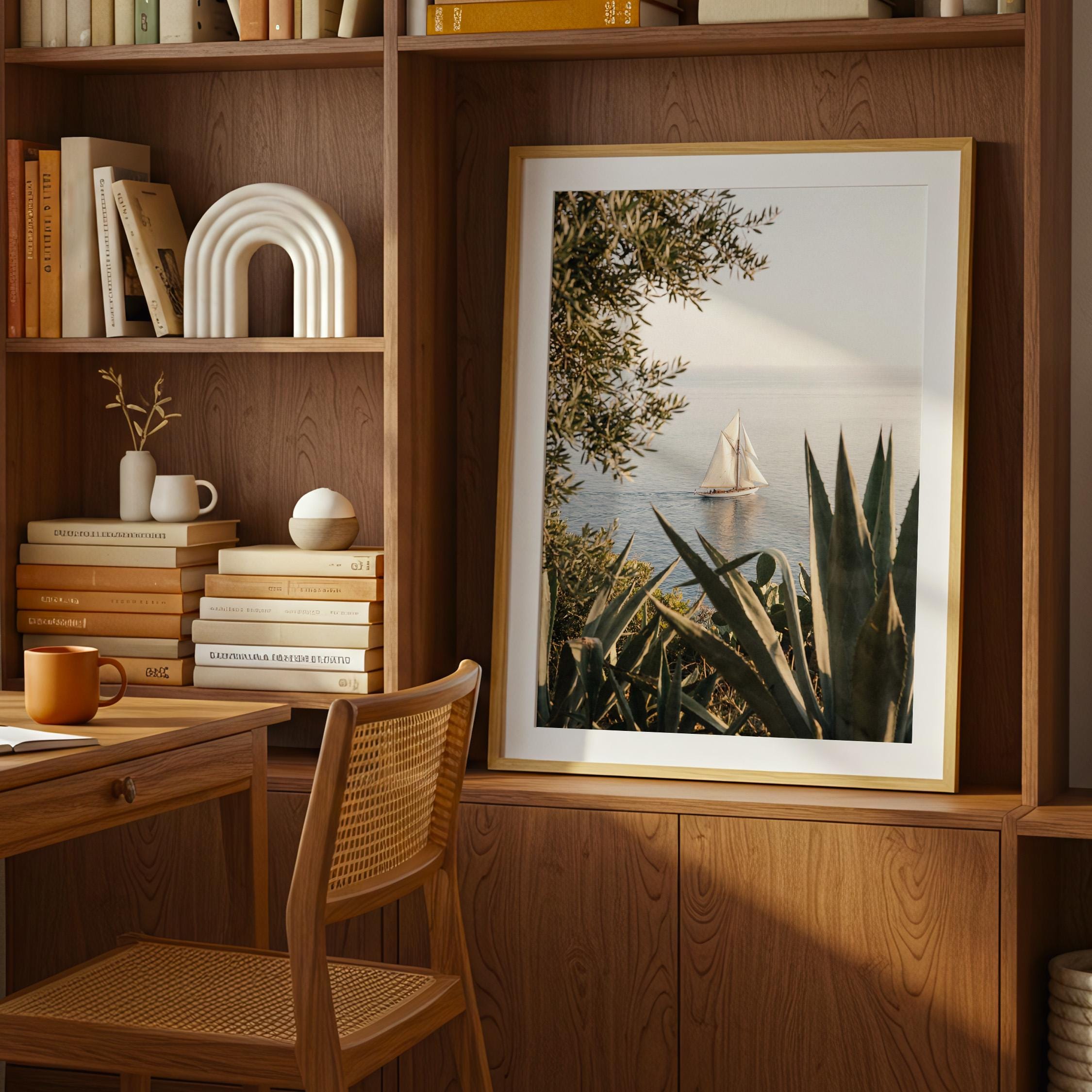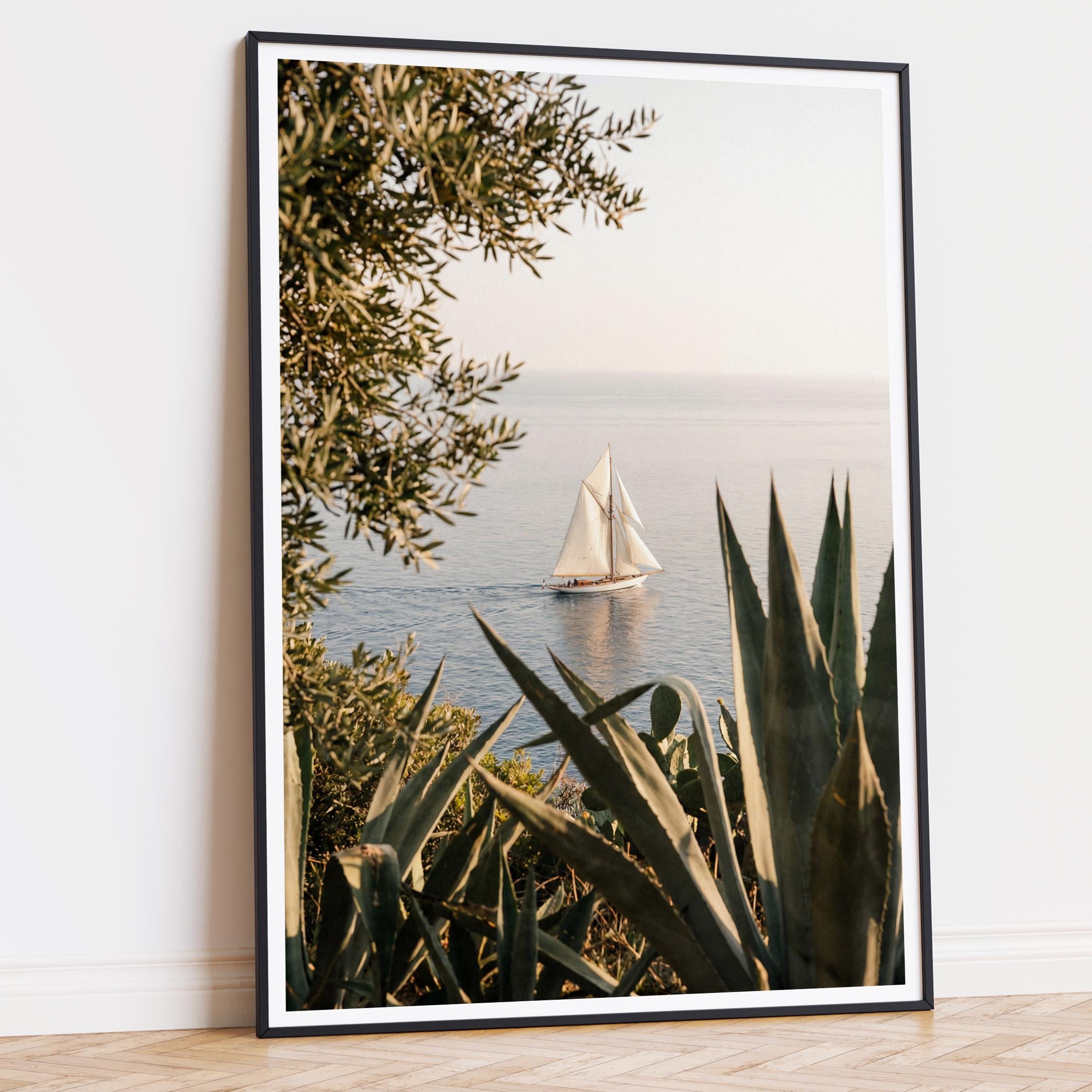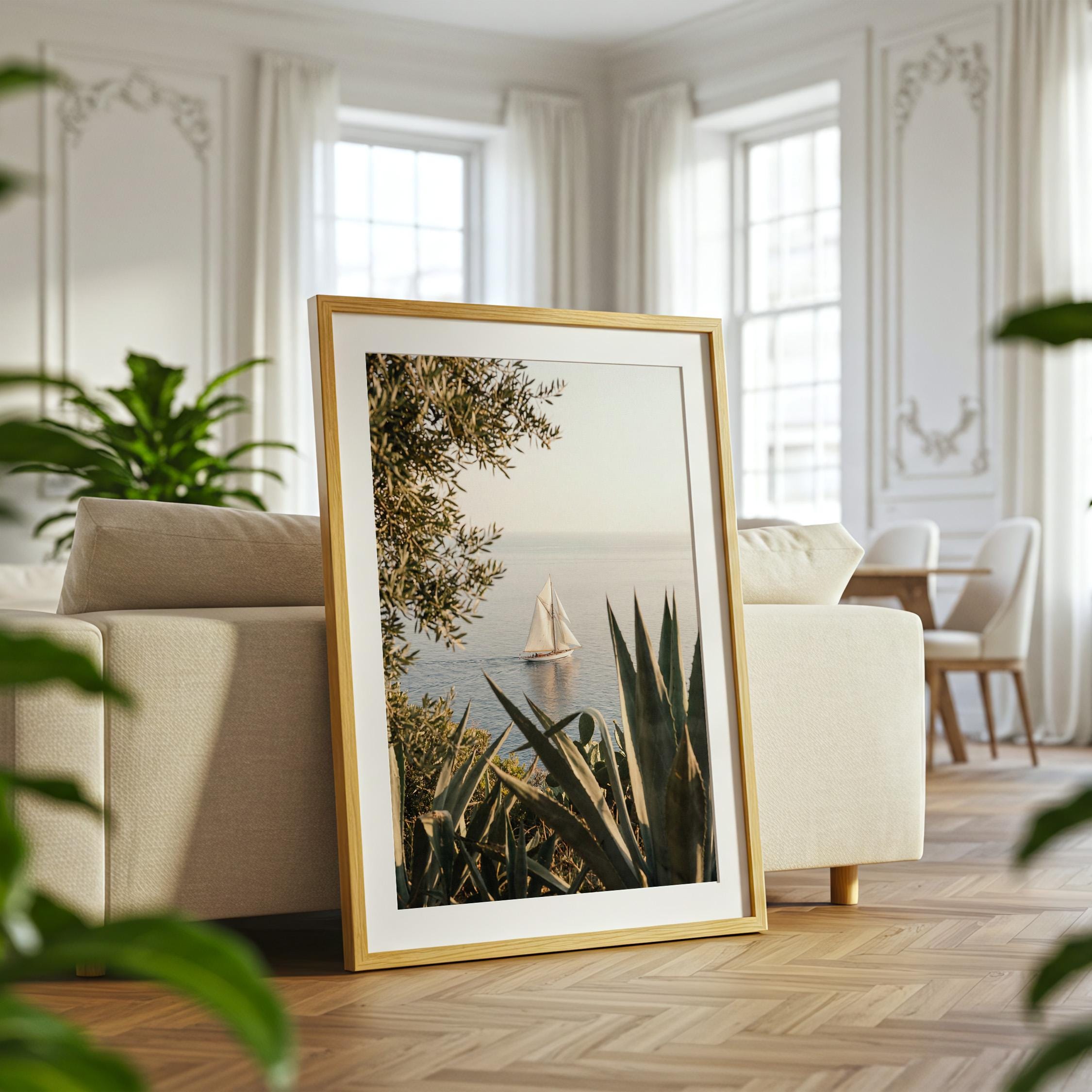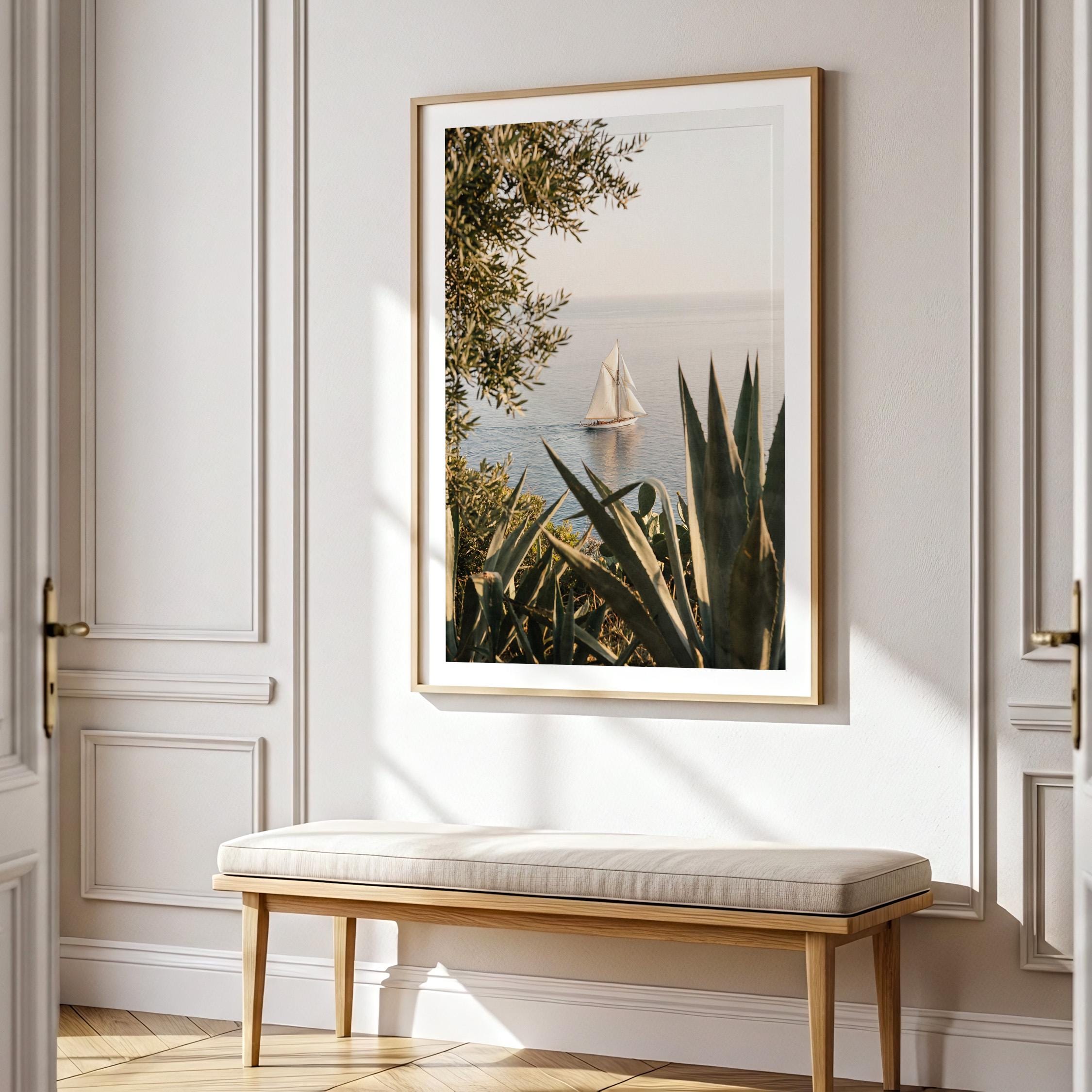 A classic sailboat drifting through calm Mediterranean waters, framed by sun-washed agave and olive branches. The light is soft. The mood is restrained. Nothing forced. This piece carries that old money aesthetic — understated, timeless, composed. It feels like summers on the coast, linen shirts, inherited taste.