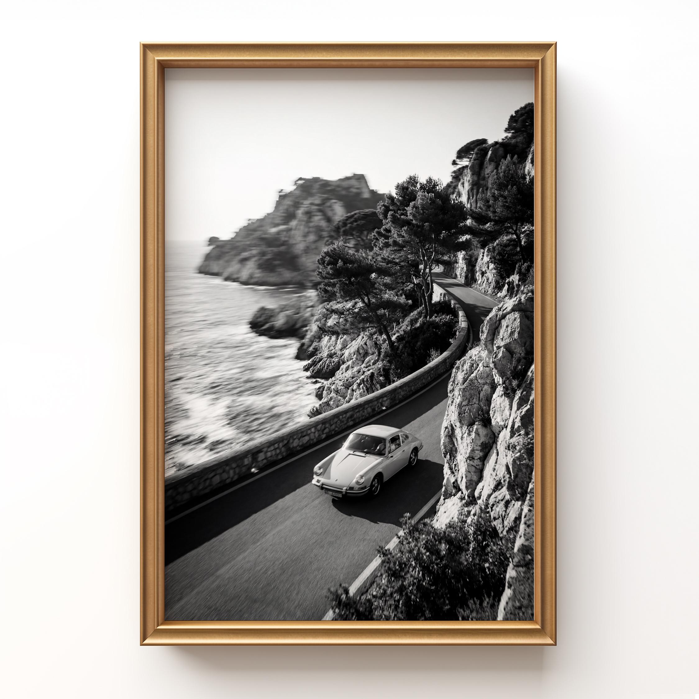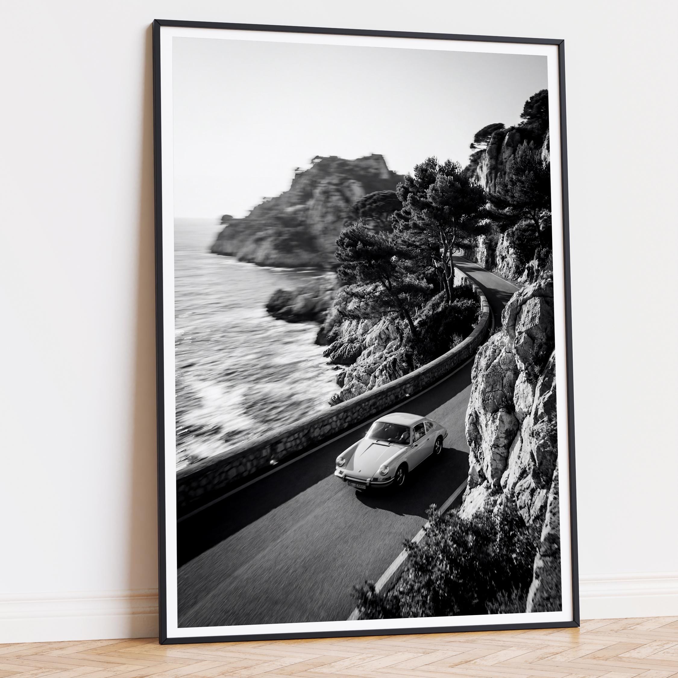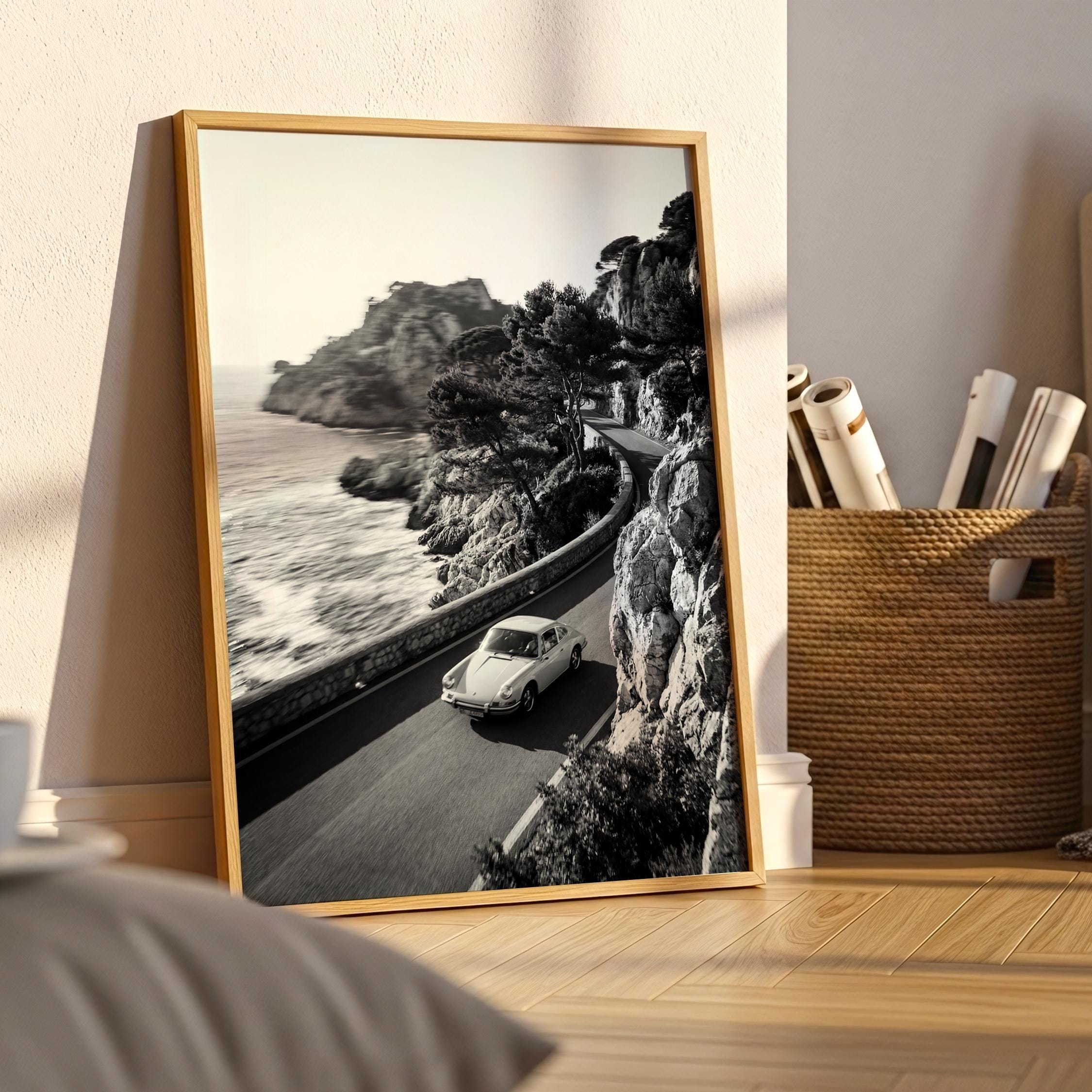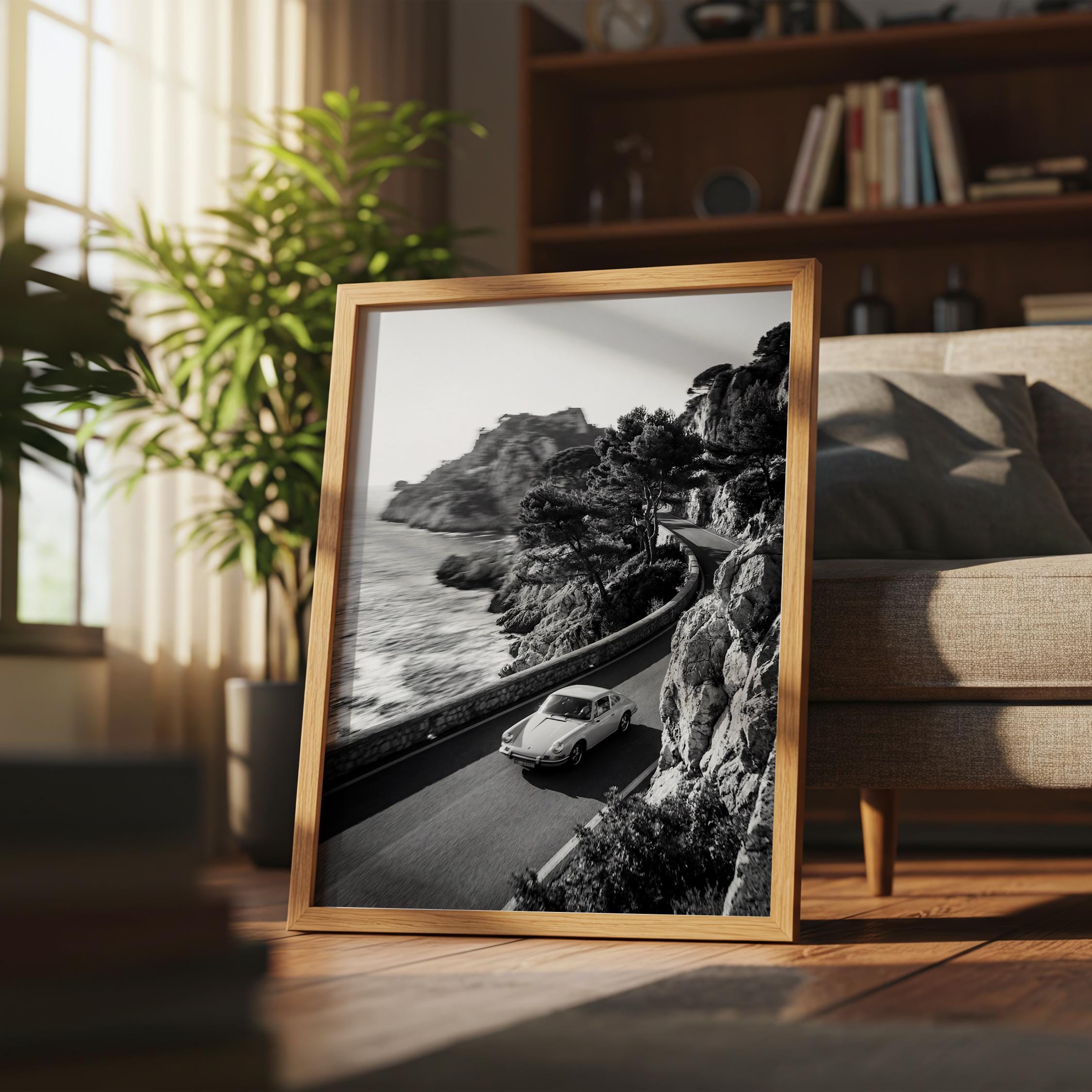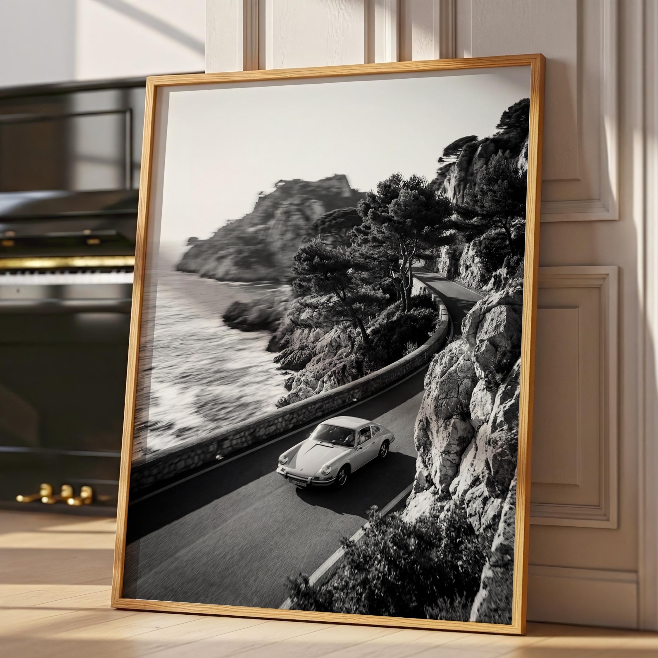 A timeless Porsche 911 carving through a winding coastal road, captured in black and white. The contrast between the sharp curves of the car and the rugged cliffs gives this piece a cinematic, old-school racing feel. This print is made for those who love classic sports cars, European road trips, and clean monochrome interiors. It works beautifully in a modern office, garage, studio, or minimalist living space.