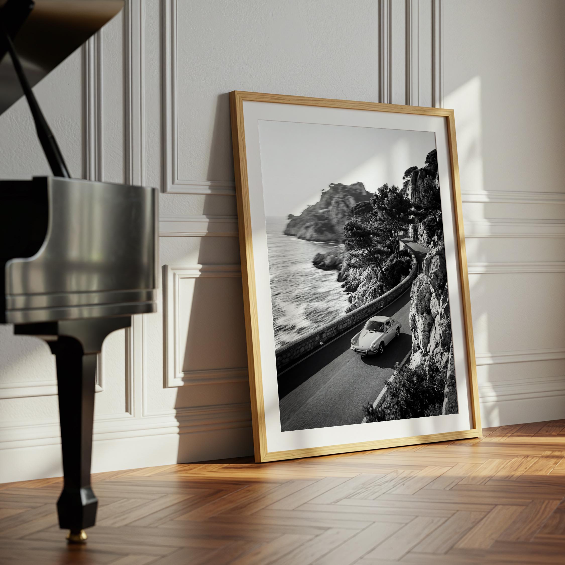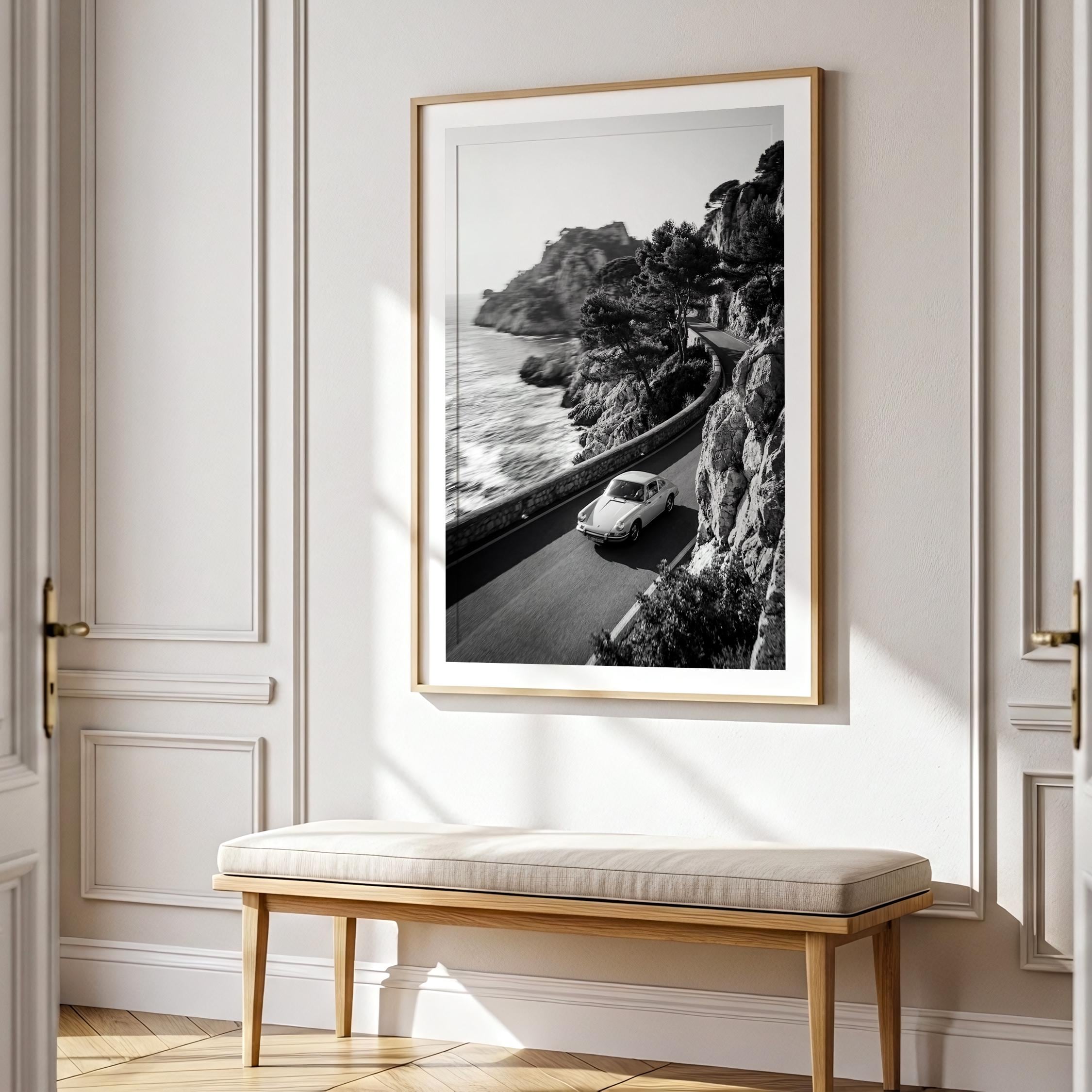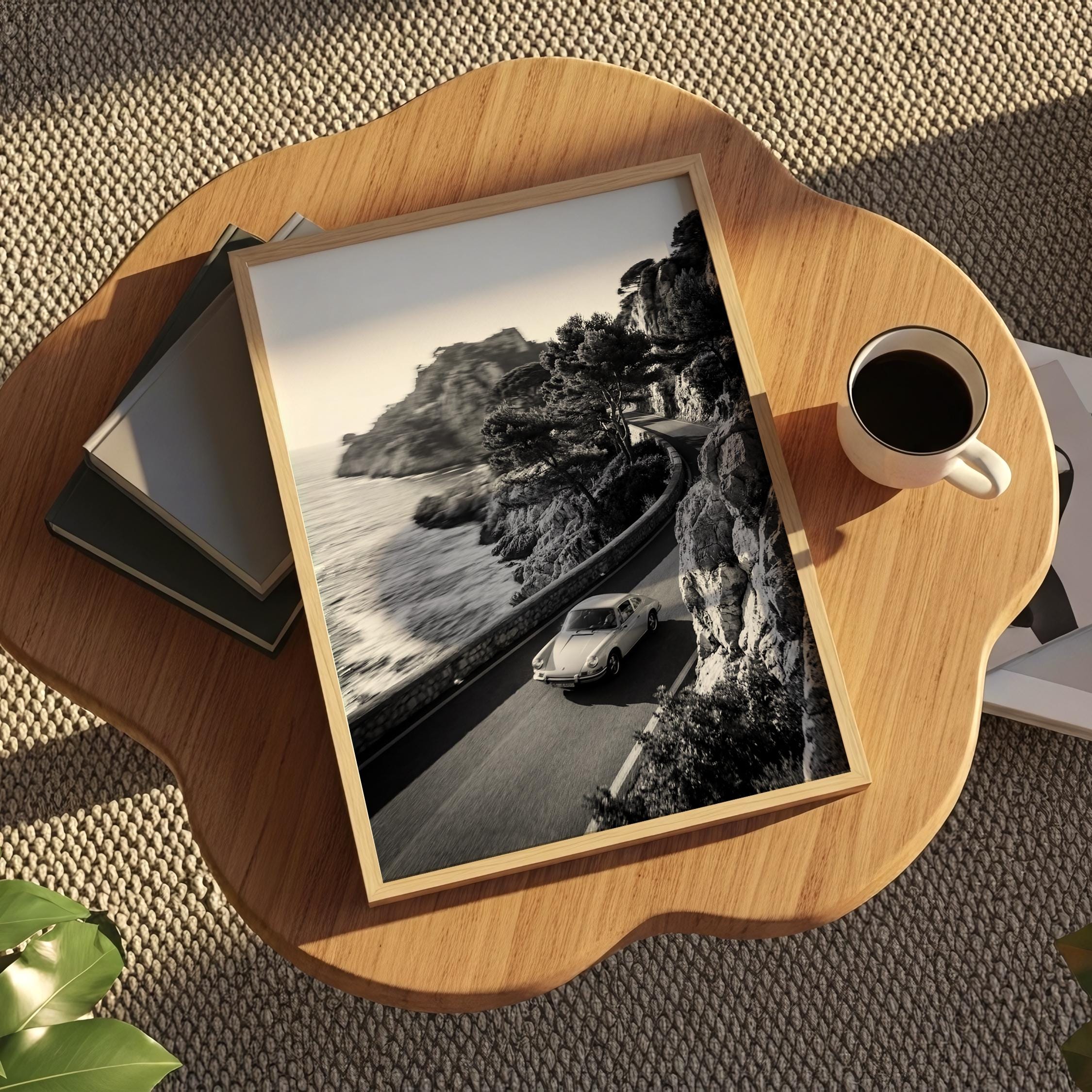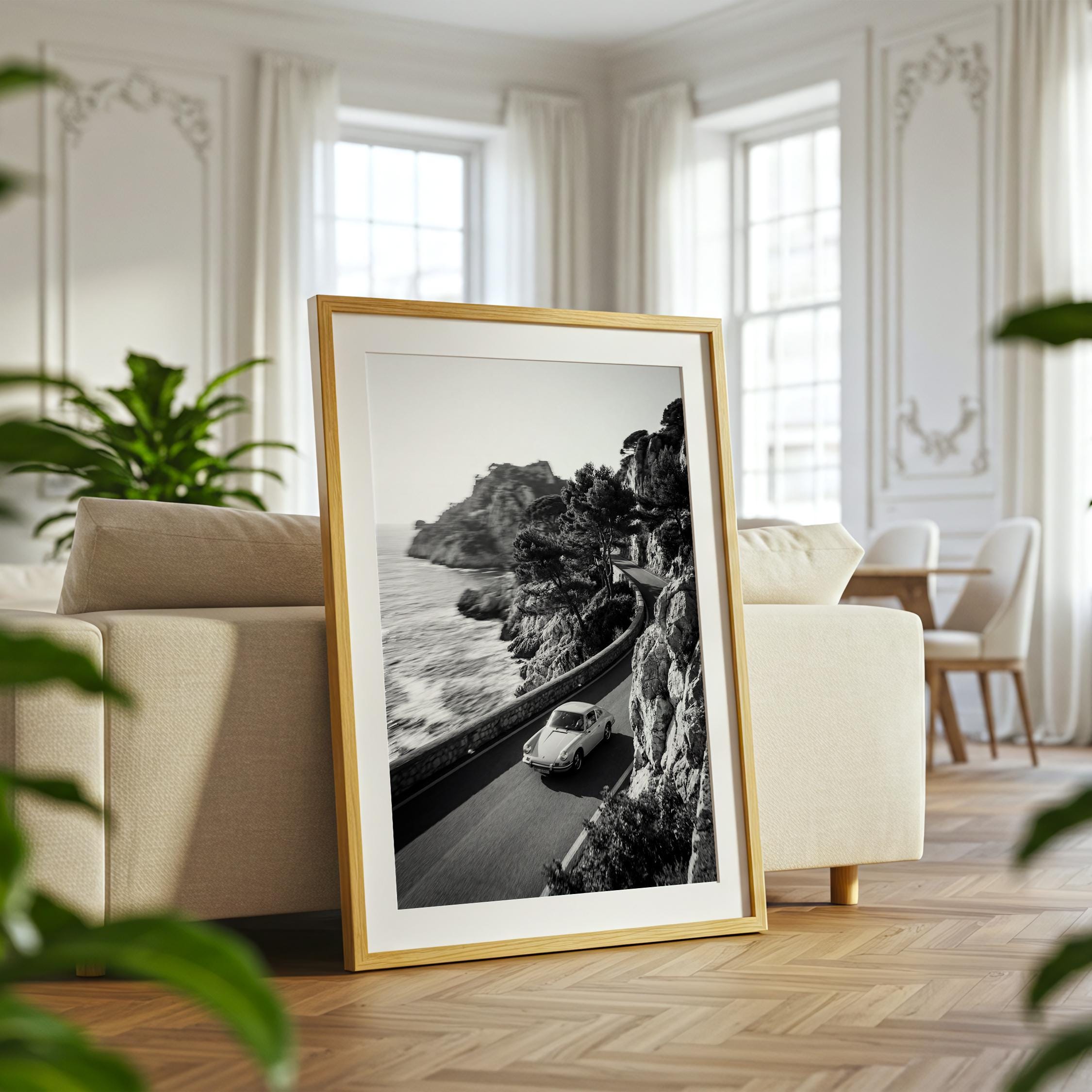 A timeless Porsche 911 carving through a winding coastal road, captured in black and white. The contrast between the sharp curves of the car and the rugged cliffs gives this piece a cinematic, old-school racing feel. This print is made for those who love classic sports cars, European road trips, and clean monochrome interiors. It works beautifully in a modern office, garage, studio, or minimalist living space.
