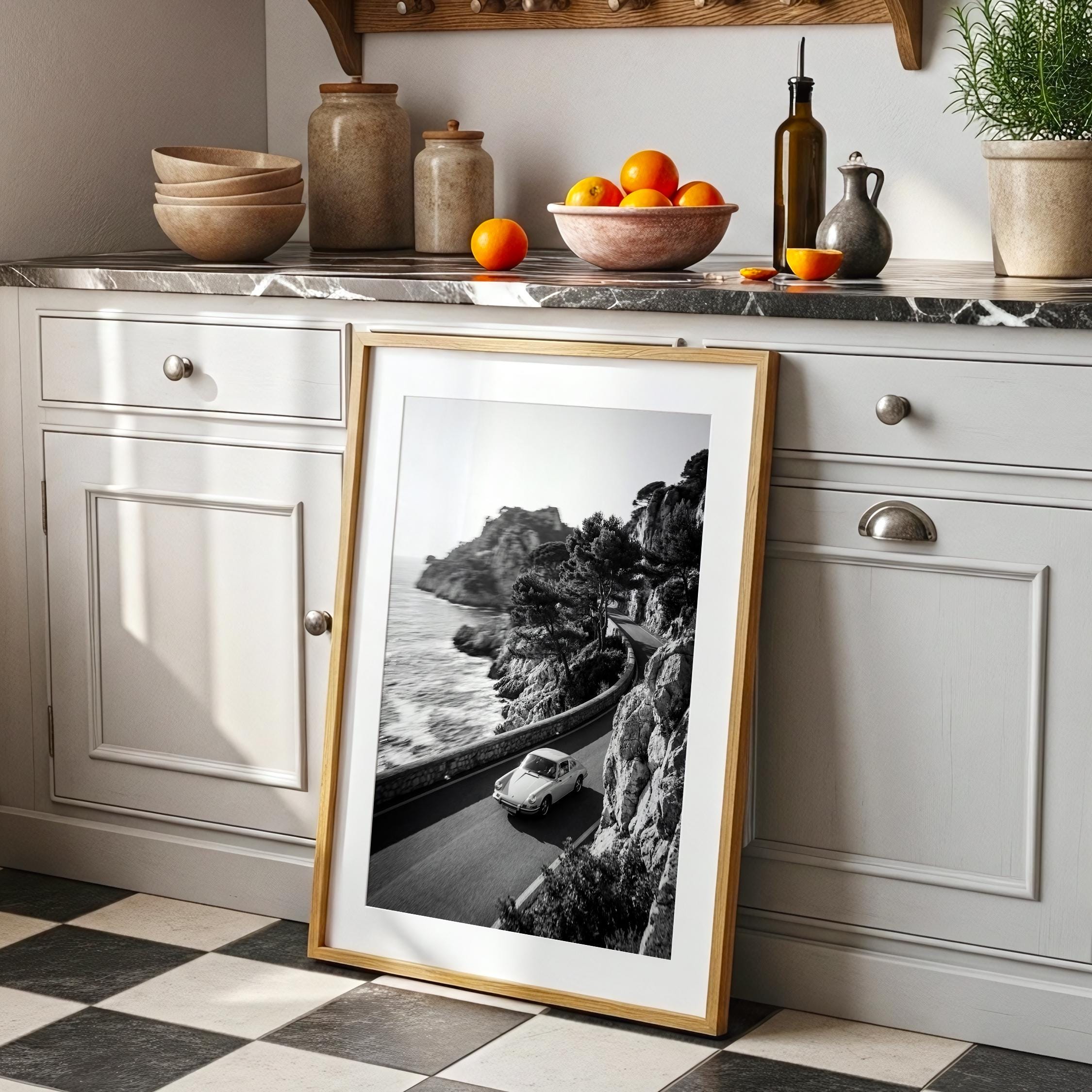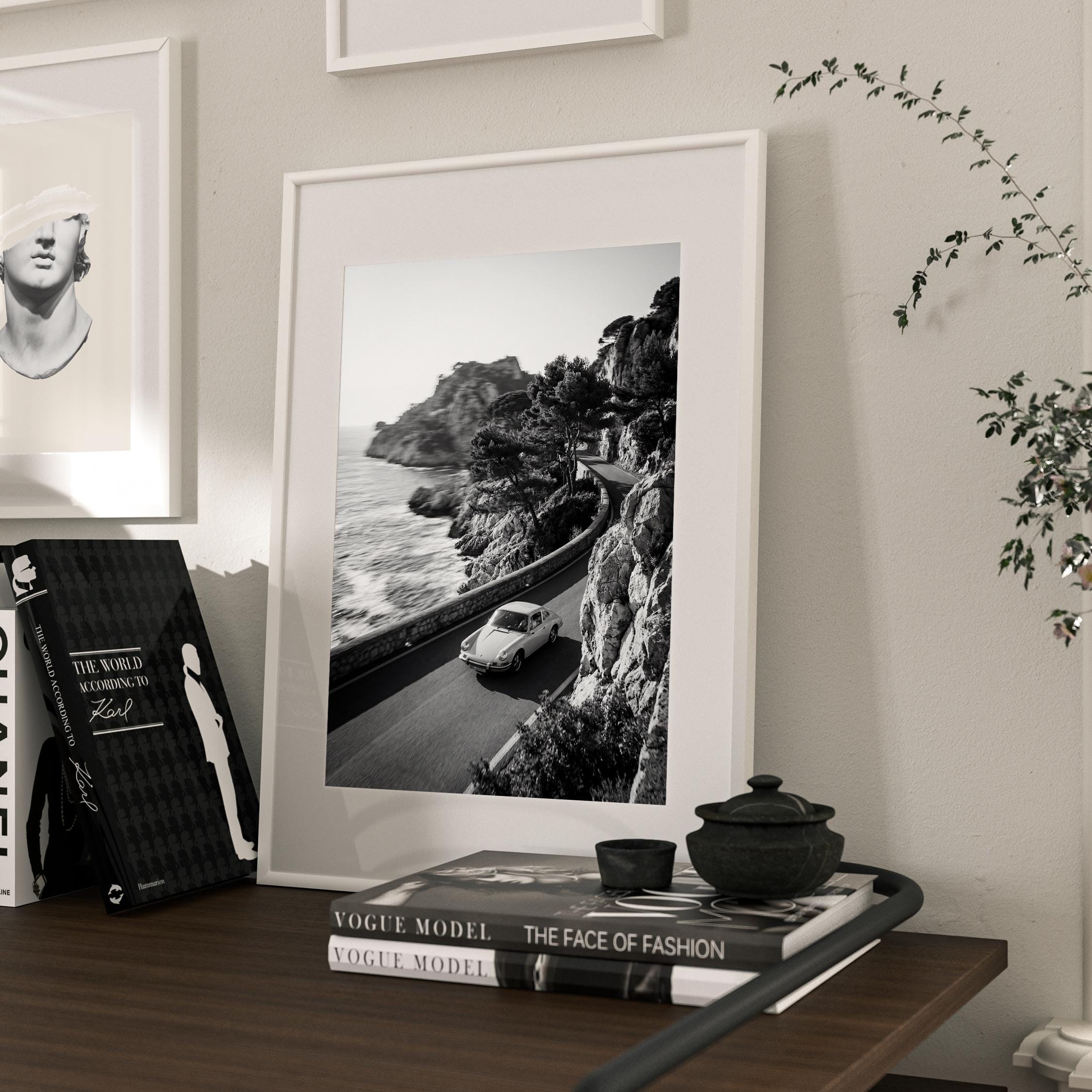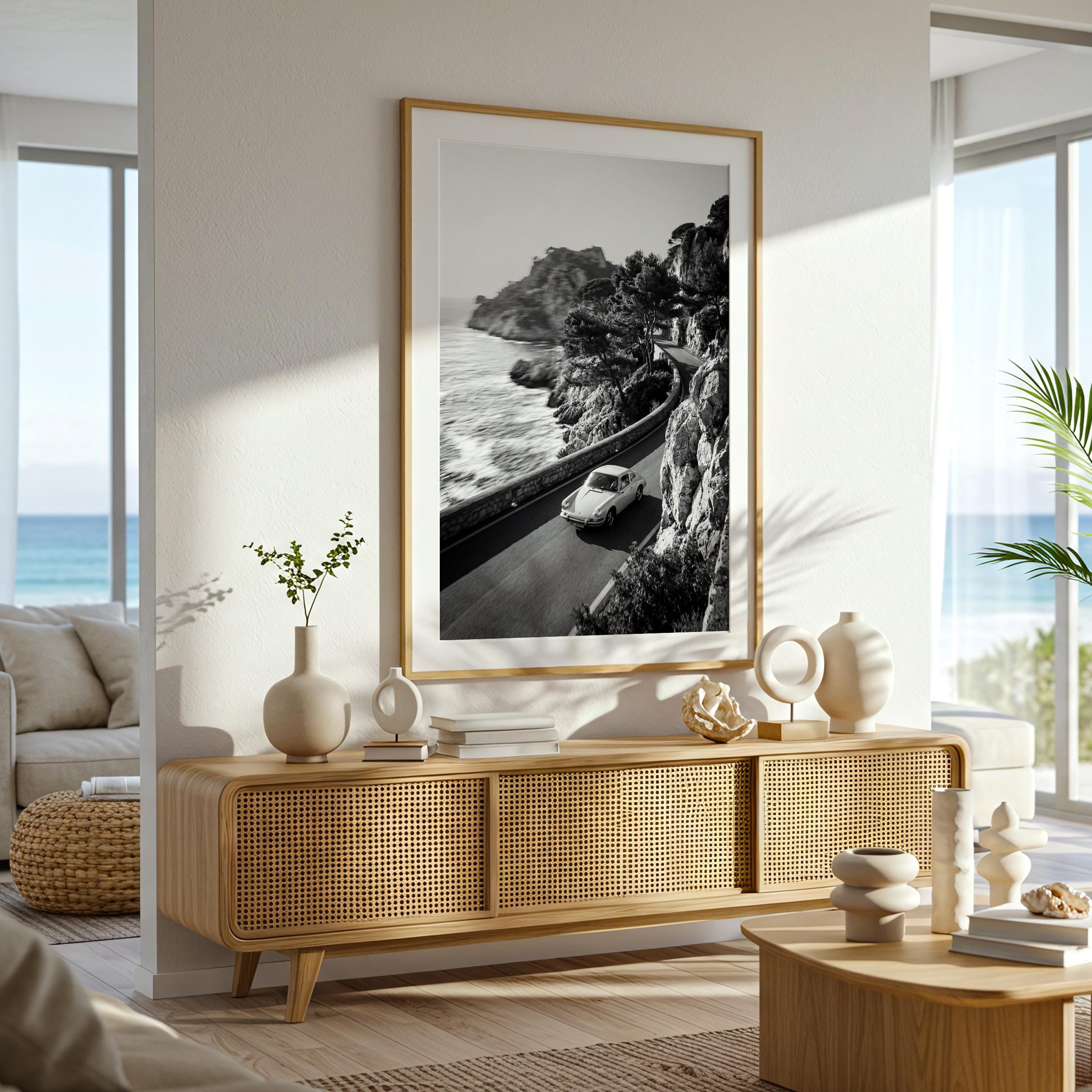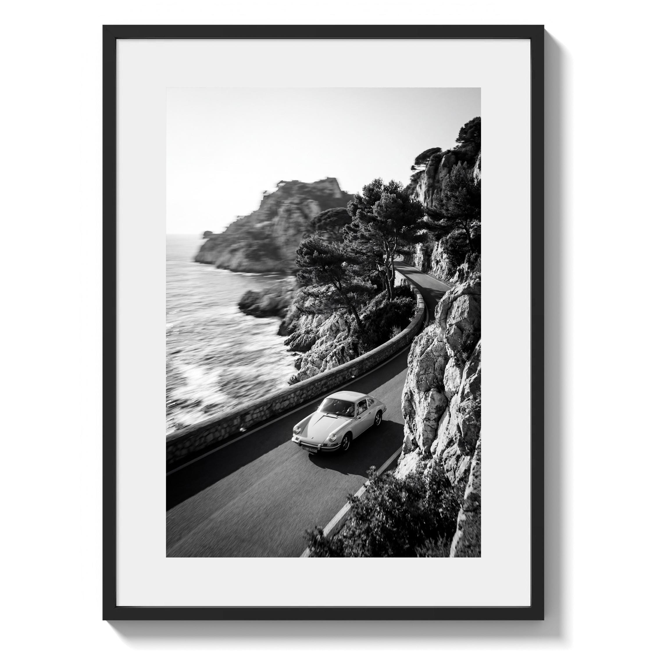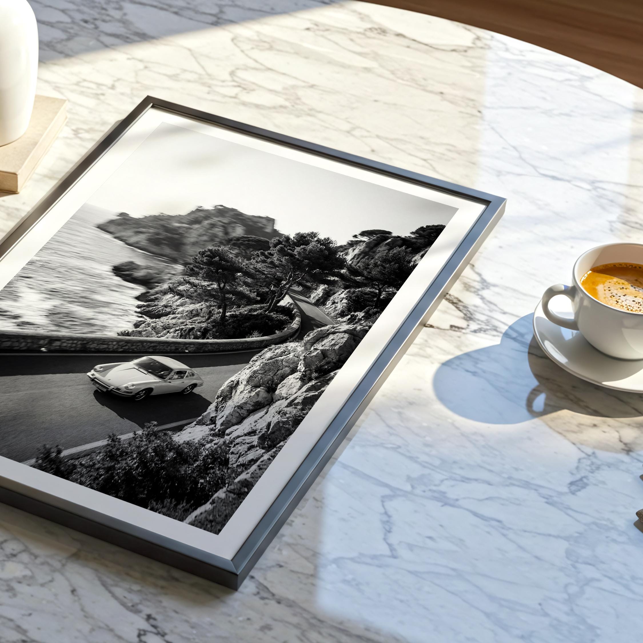 A timeless Porsche 911 carving through a winding coastal road, captured in black and white. The contrast between the sharp curves of the car and the rugged cliffs gives this piece a cinematic, old-school racing feel. This print is made for those who love classic sports cars, European road trips, and clean monochrome interiors. It works beautifully in a modern office, garage, studio, or minimalist living space.