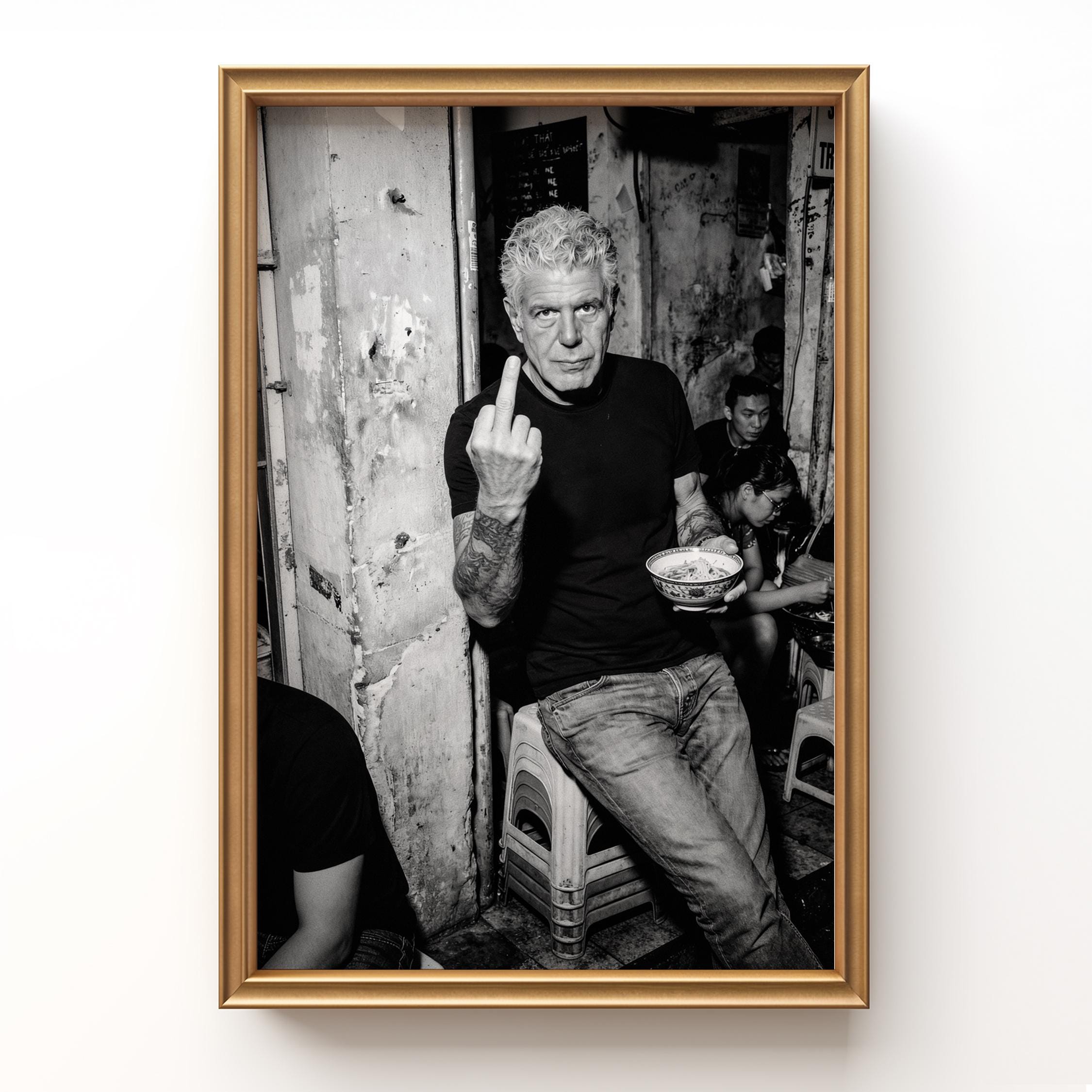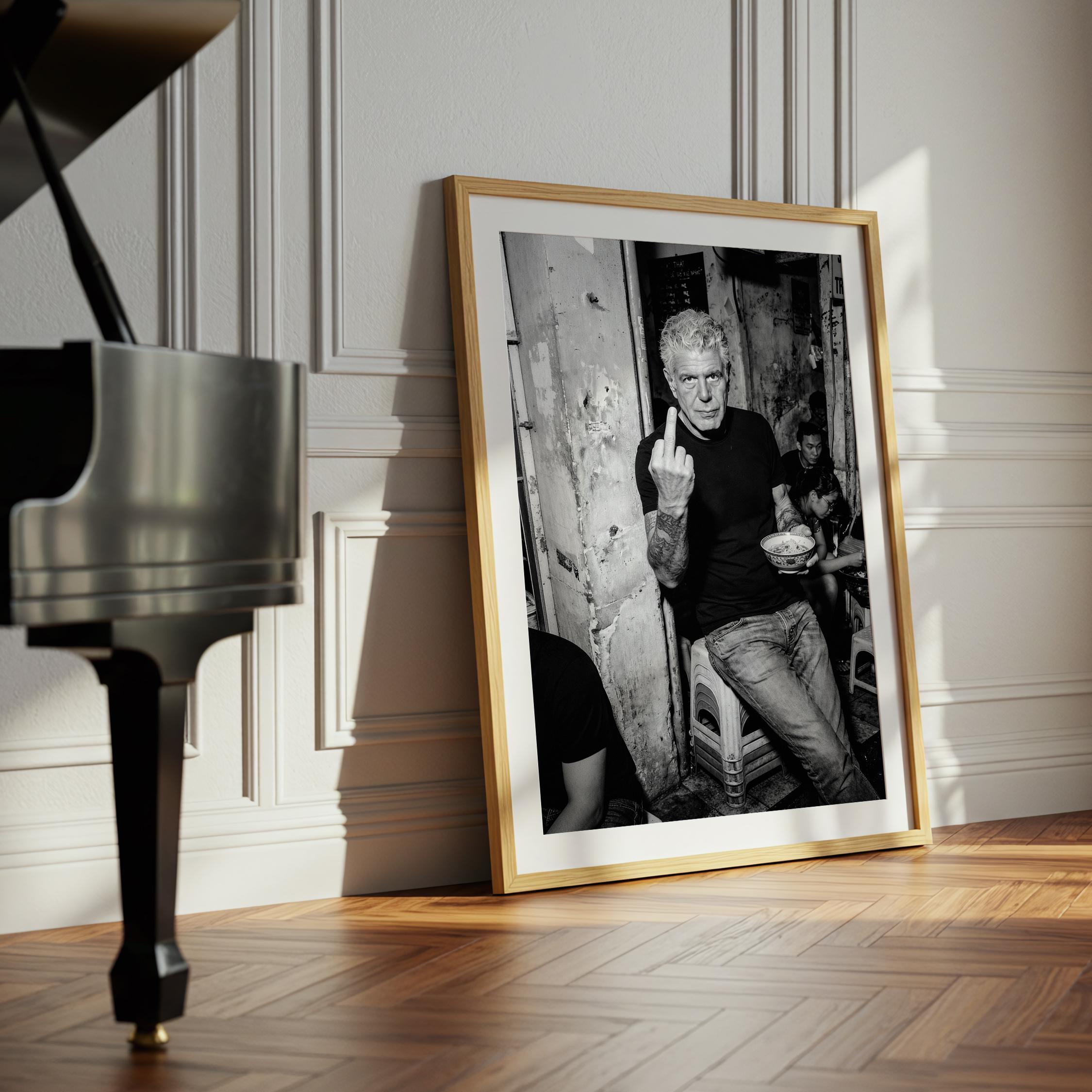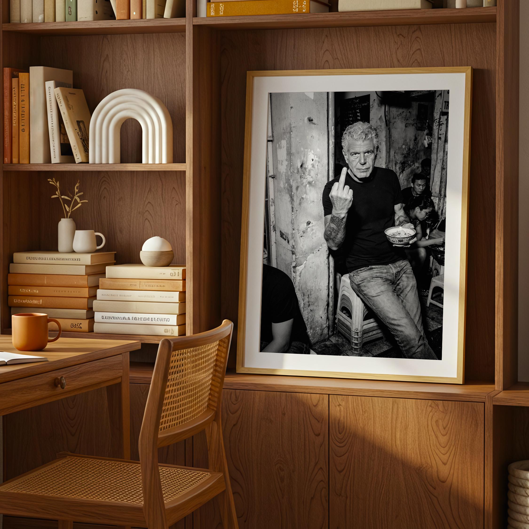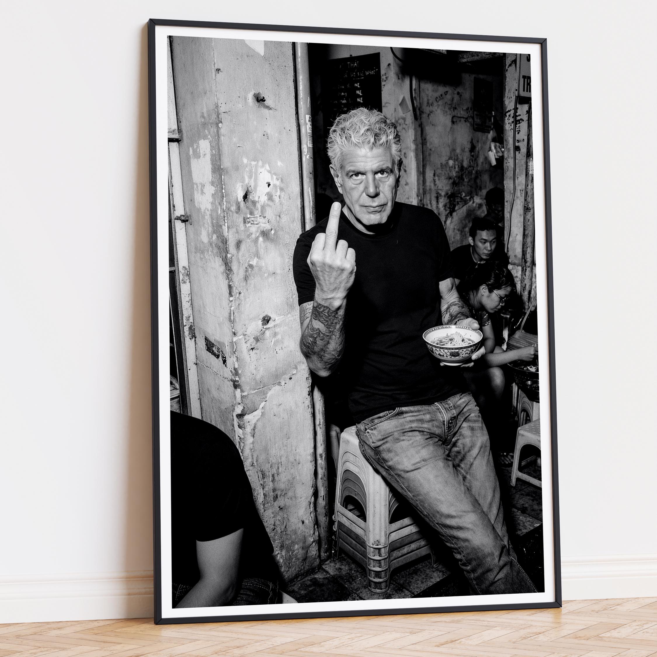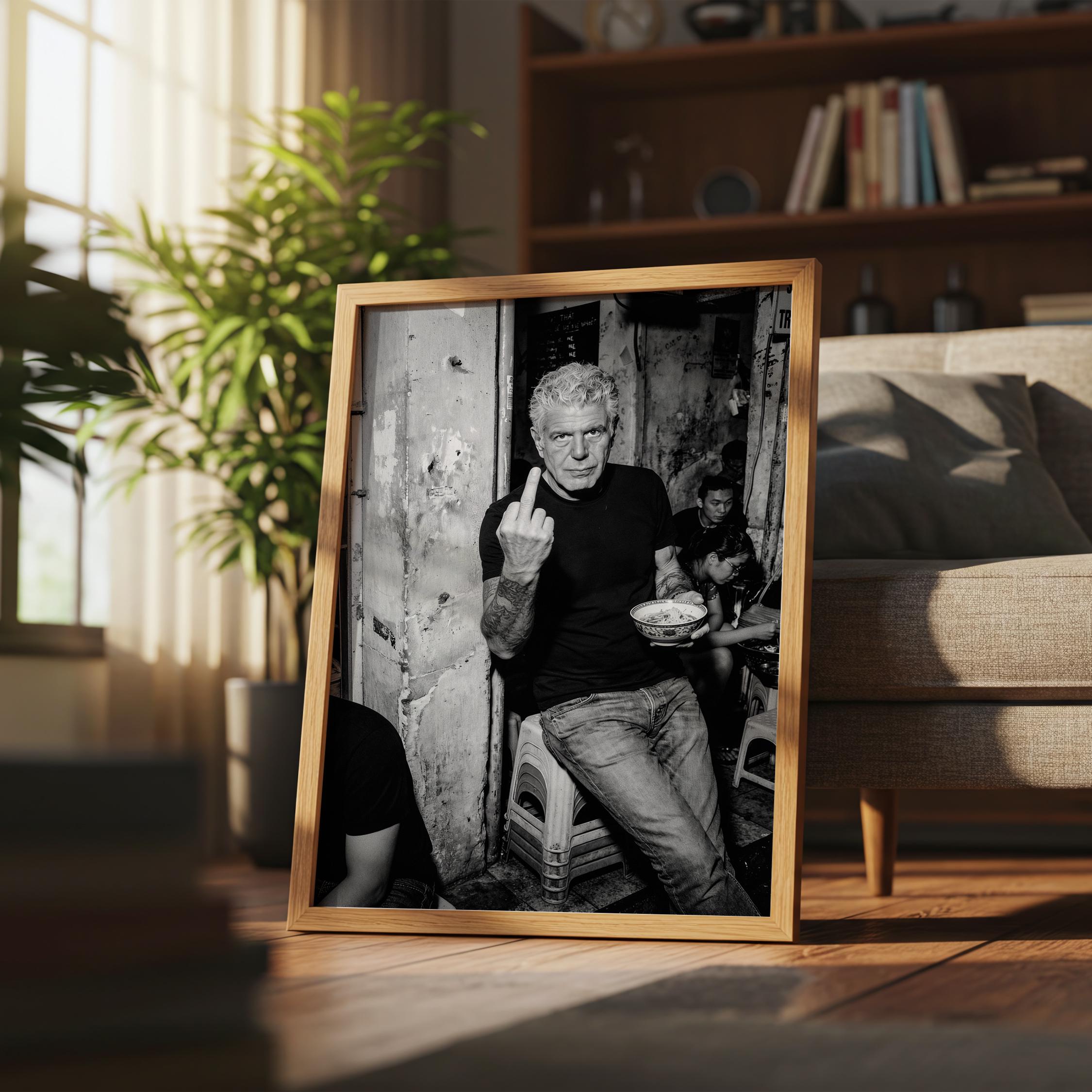 A raw black and white portrait inspired by Anthony Bourdain’s unapologetic spirit. Shot in a gritty street setting, bowl in hand, attitude intact. It captures the honesty, edge, and irreverence that made him iconic.