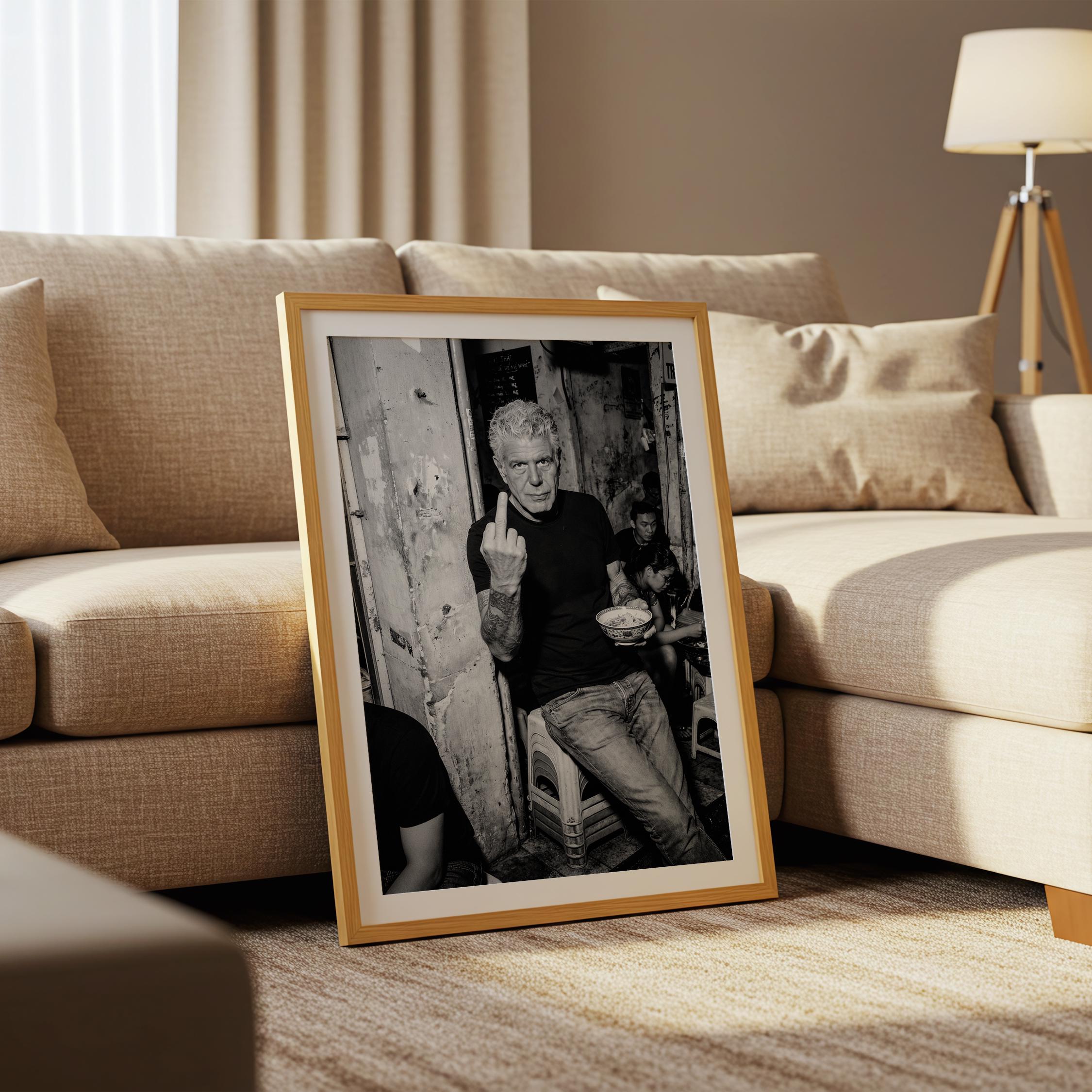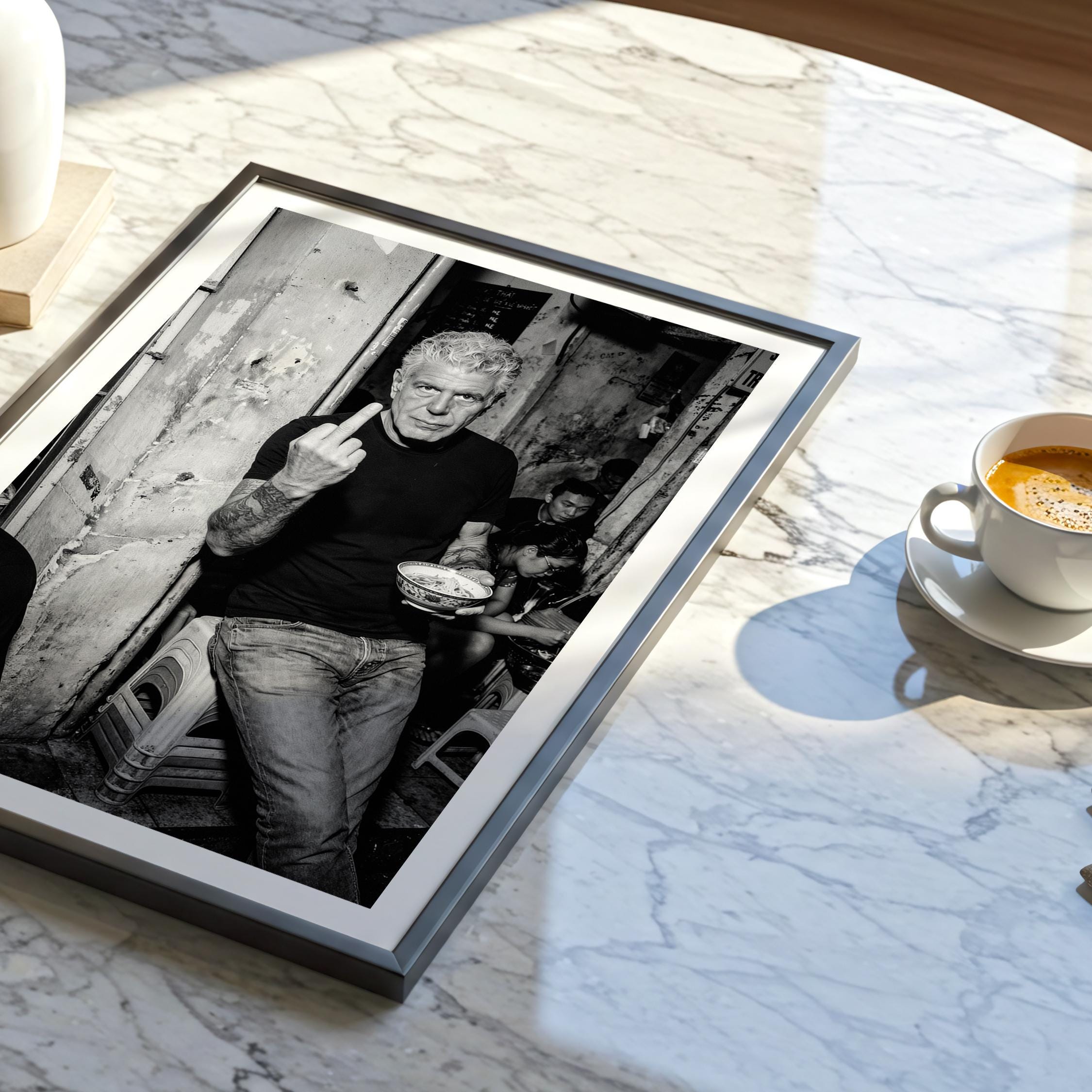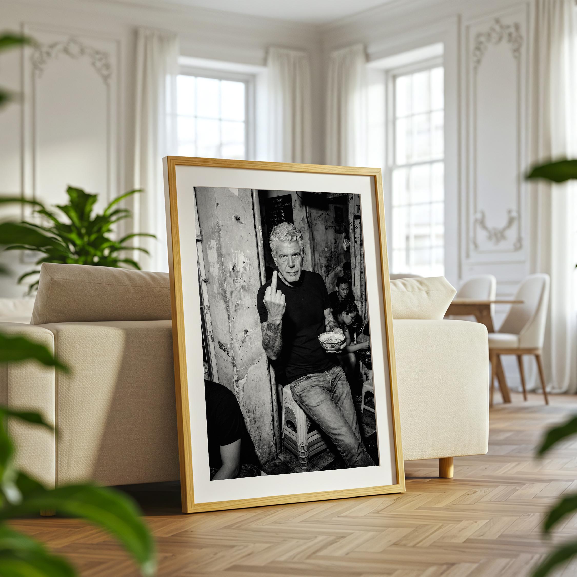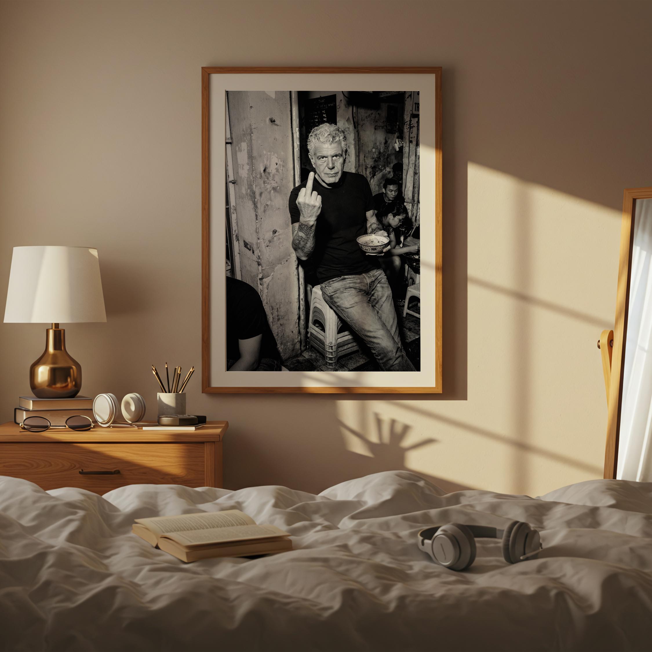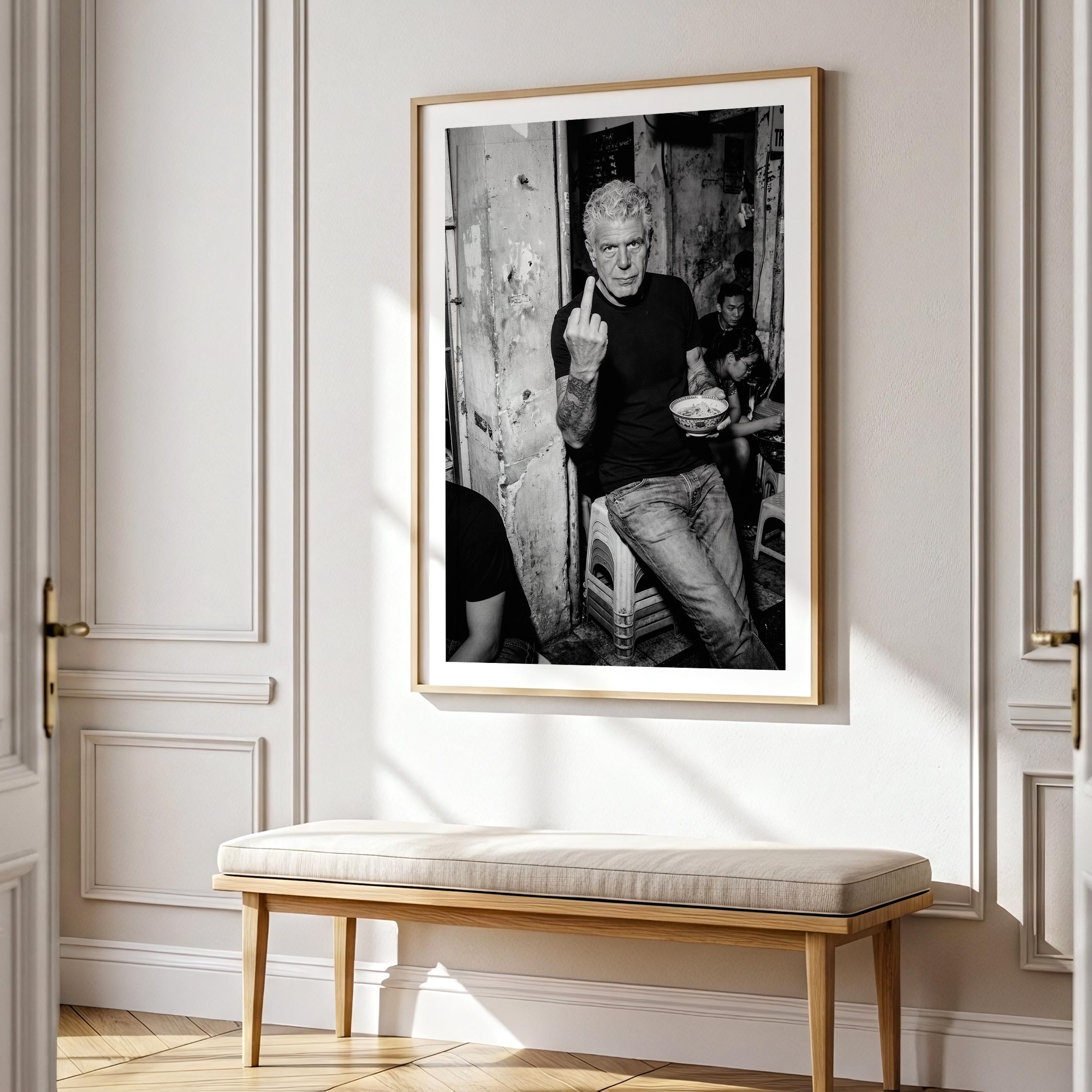 A raw black and white portrait inspired by Anthony Bourdain’s unapologetic spirit. Shot in a gritty street setting, bowl in hand, attitude intact. It captures the honesty, edge, and irreverence that made him iconic.