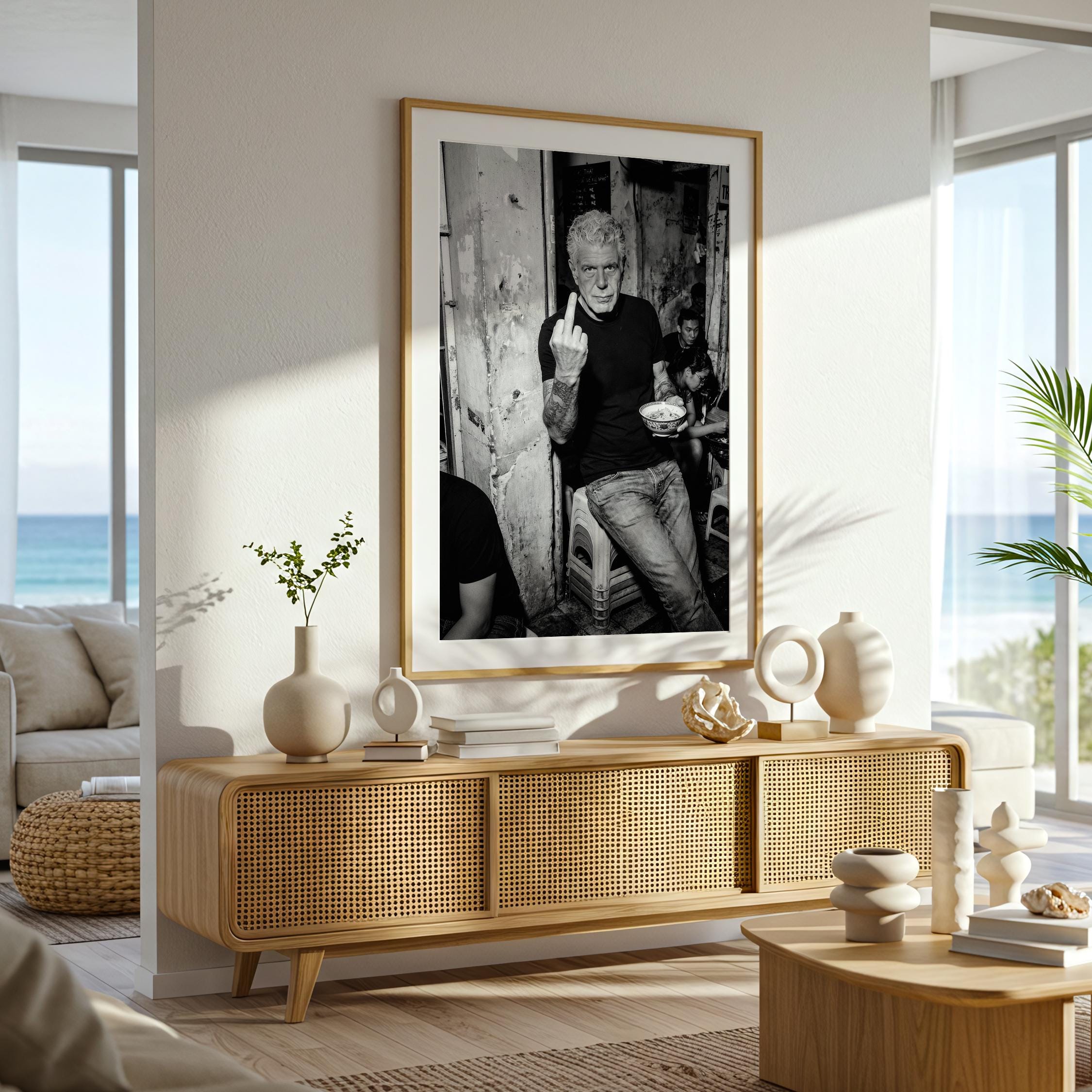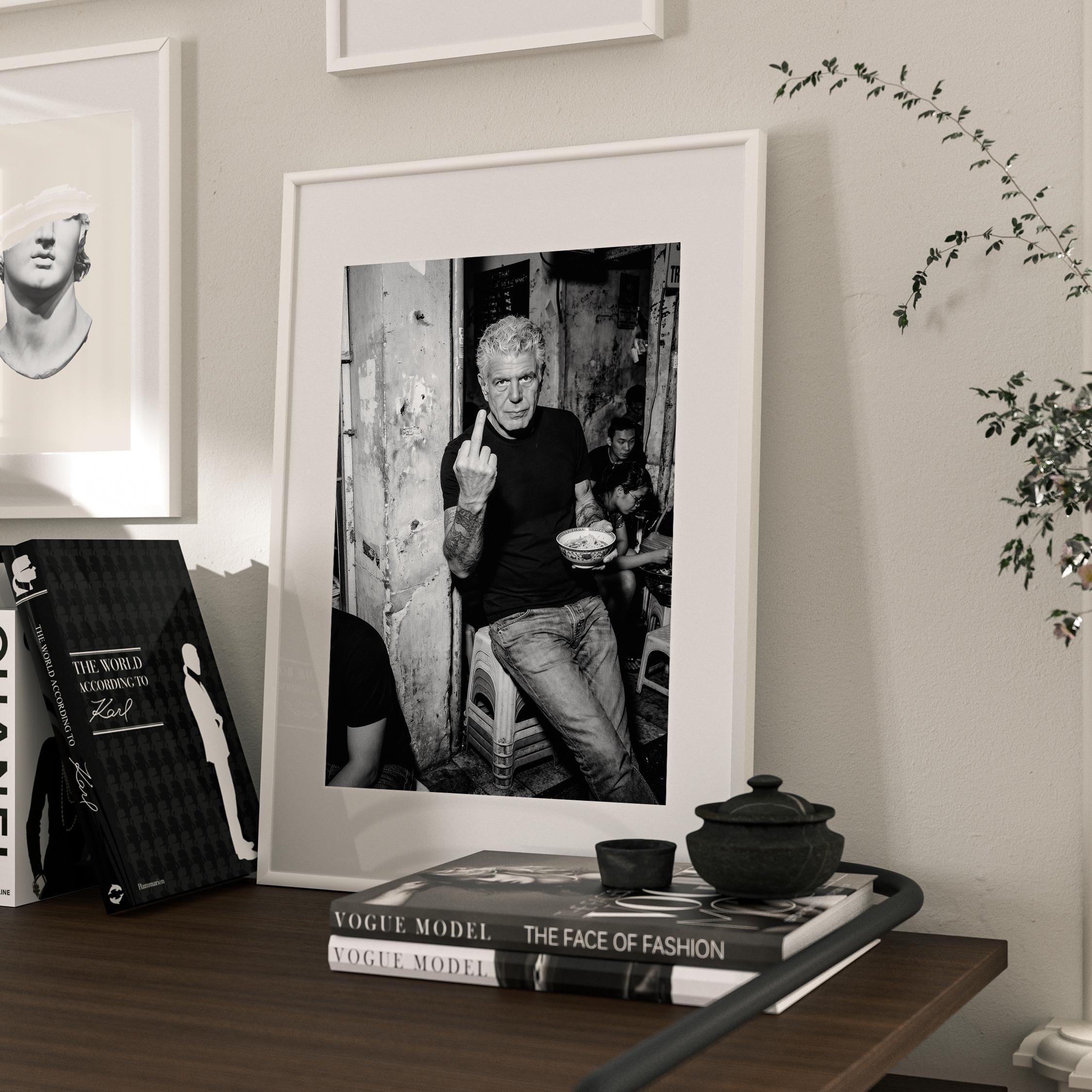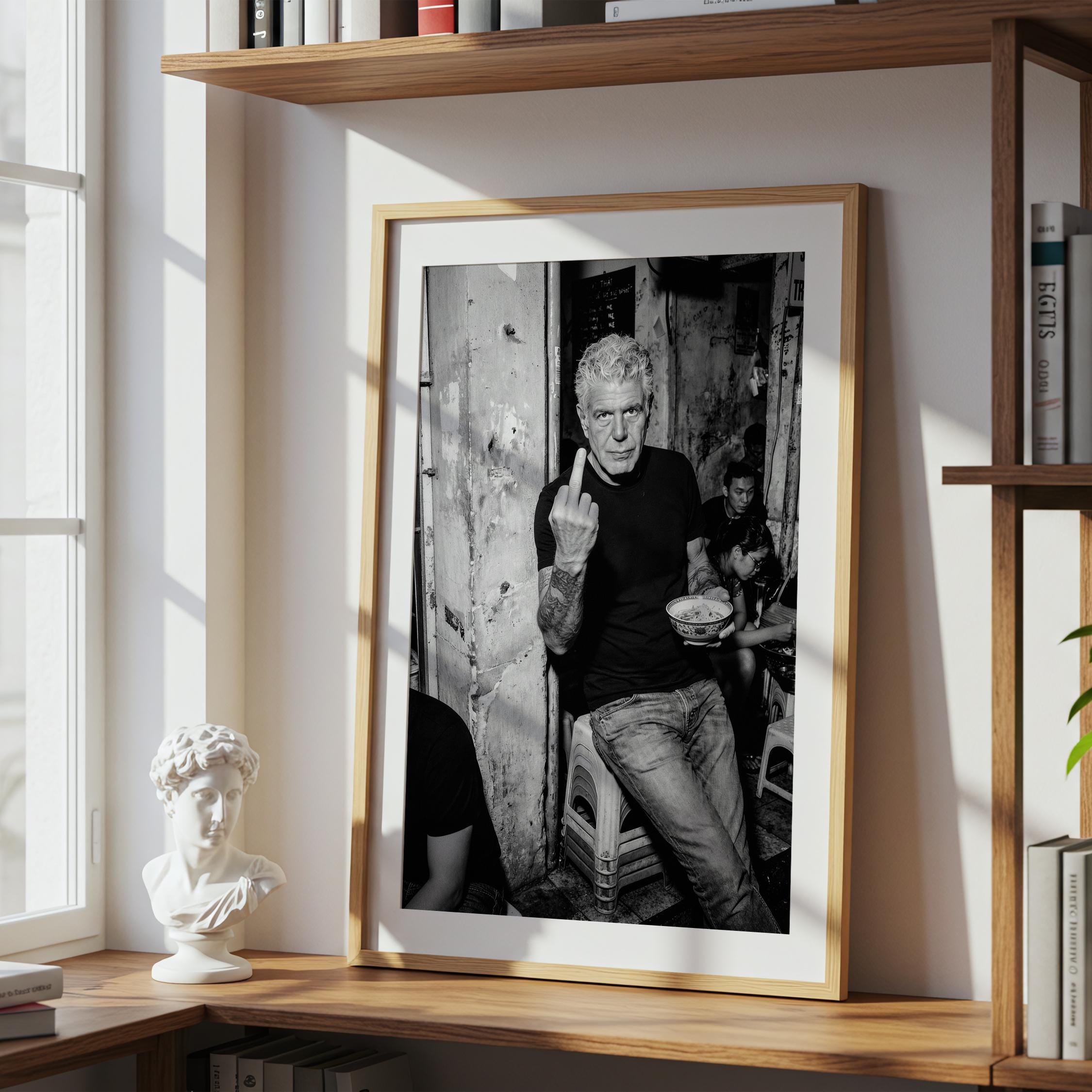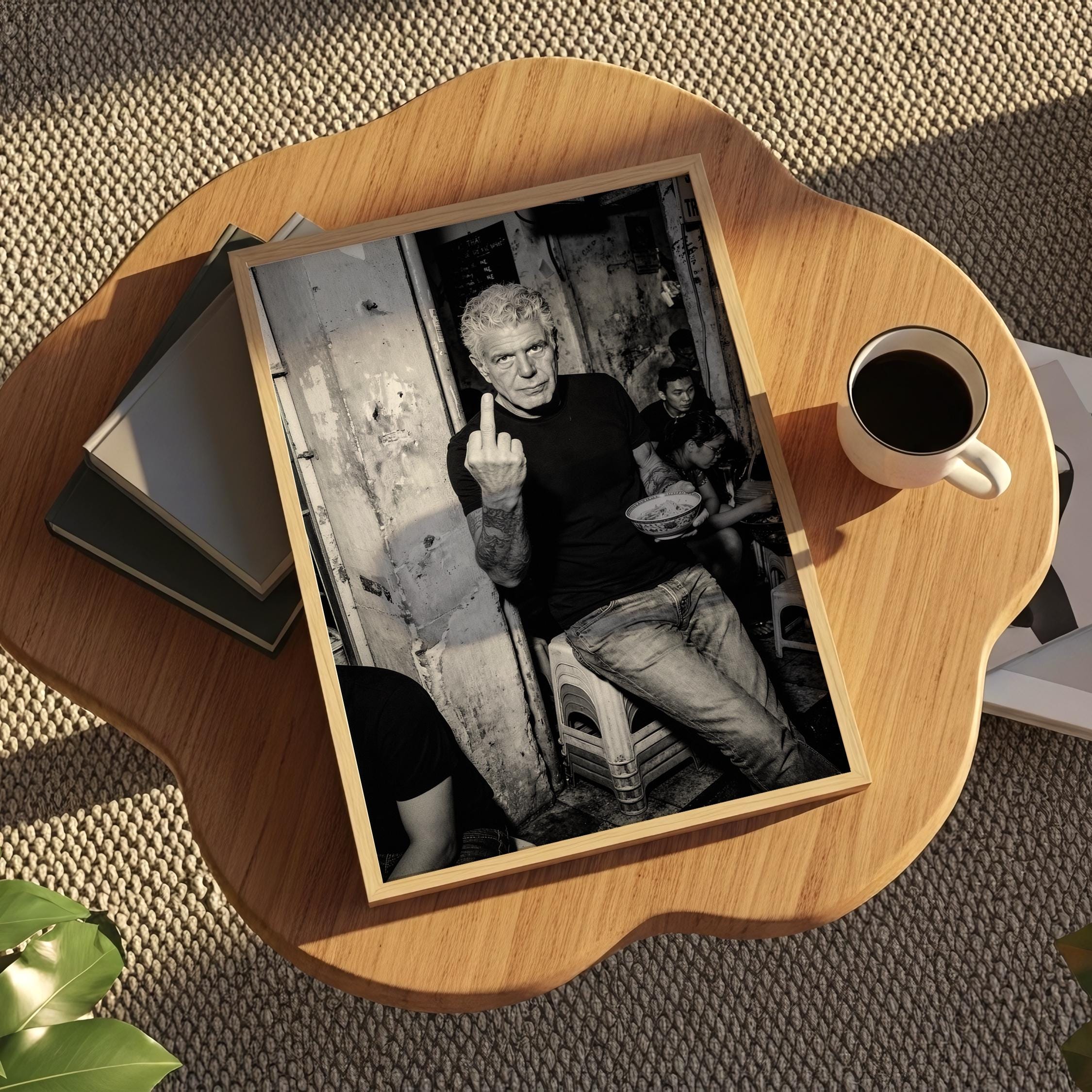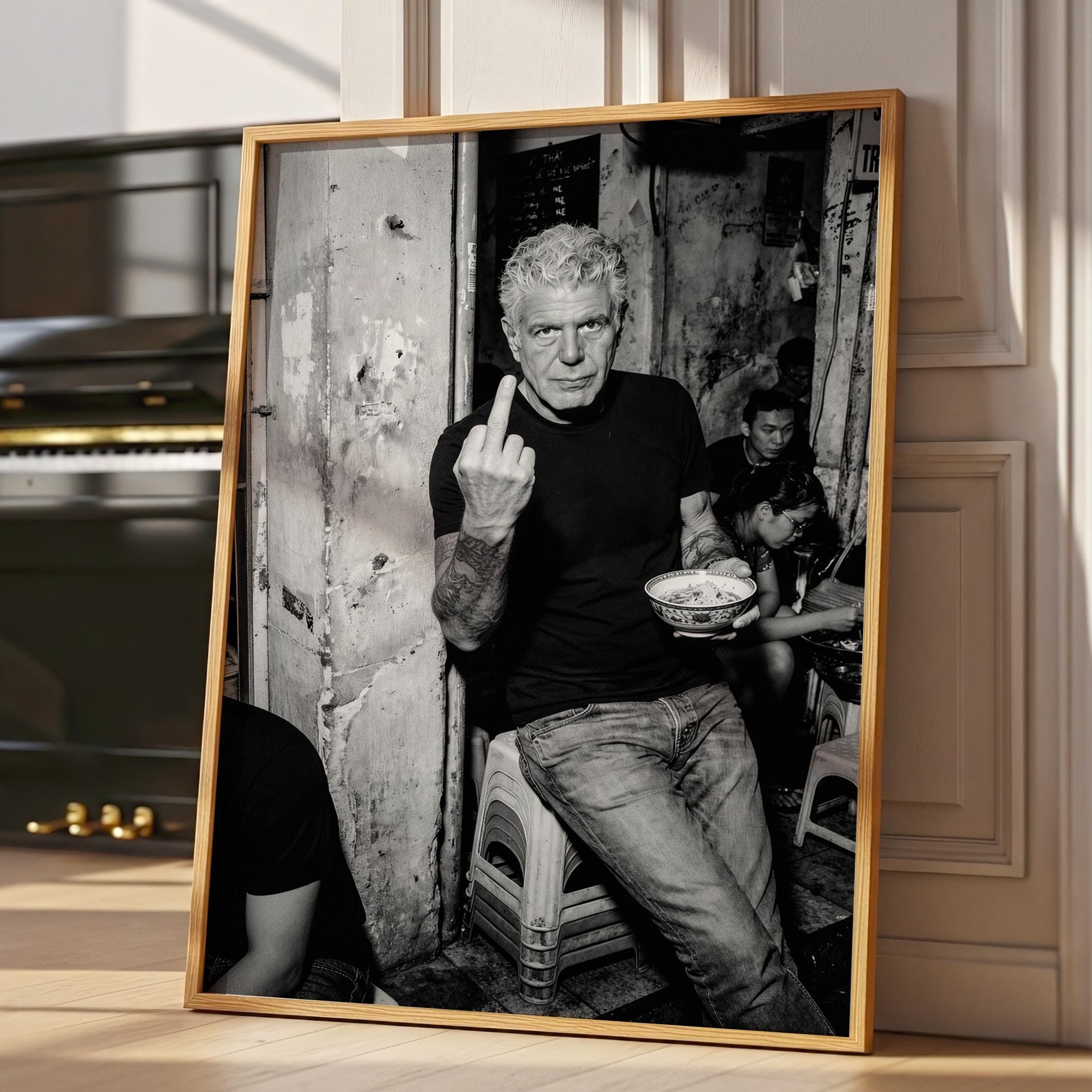 A raw black and white portrait inspired by Anthony Bourdain’s unapologetic spirit. Shot in a gritty street setting, bowl in hand, attitude intact. It captures the honesty, edge, and irreverence that made him iconic.
