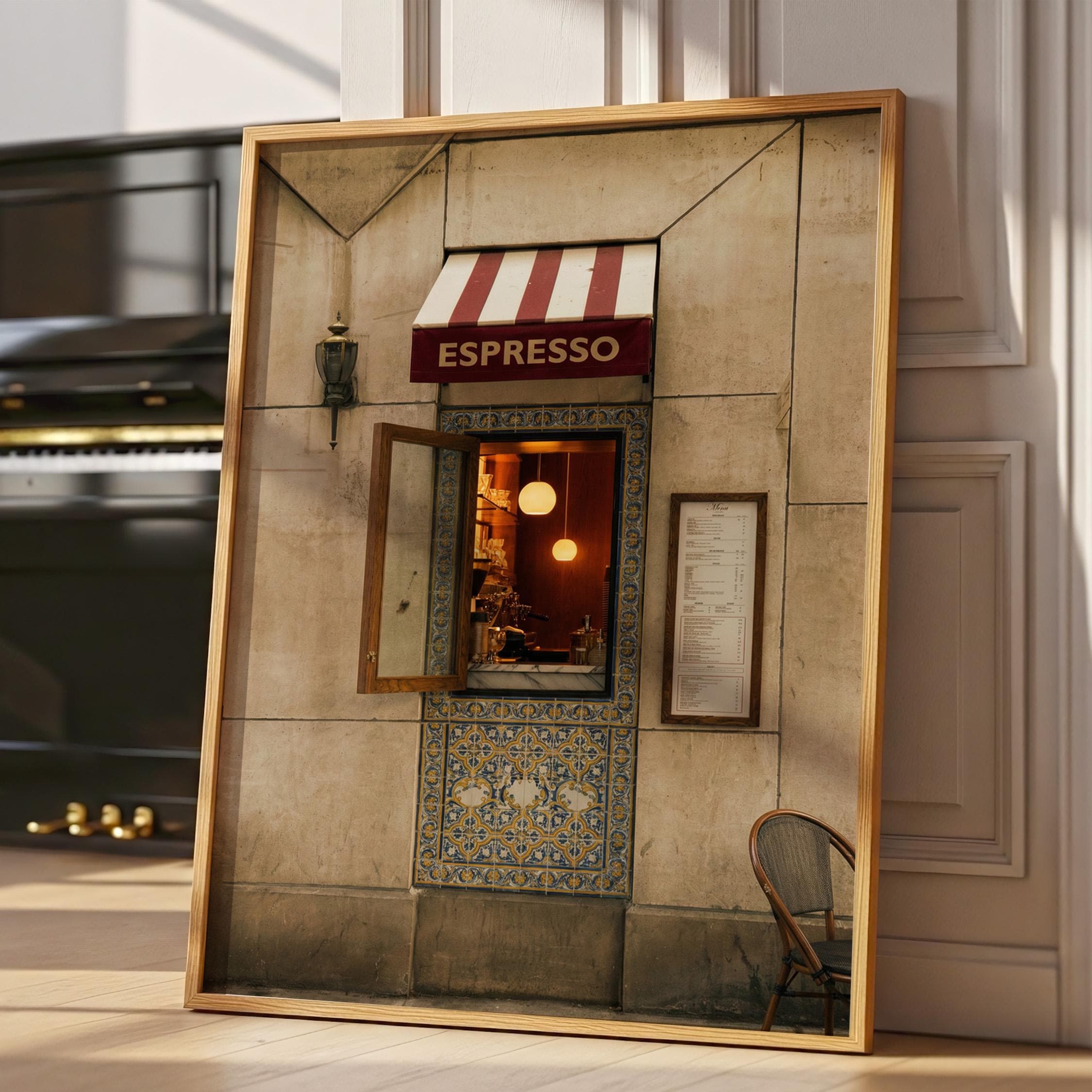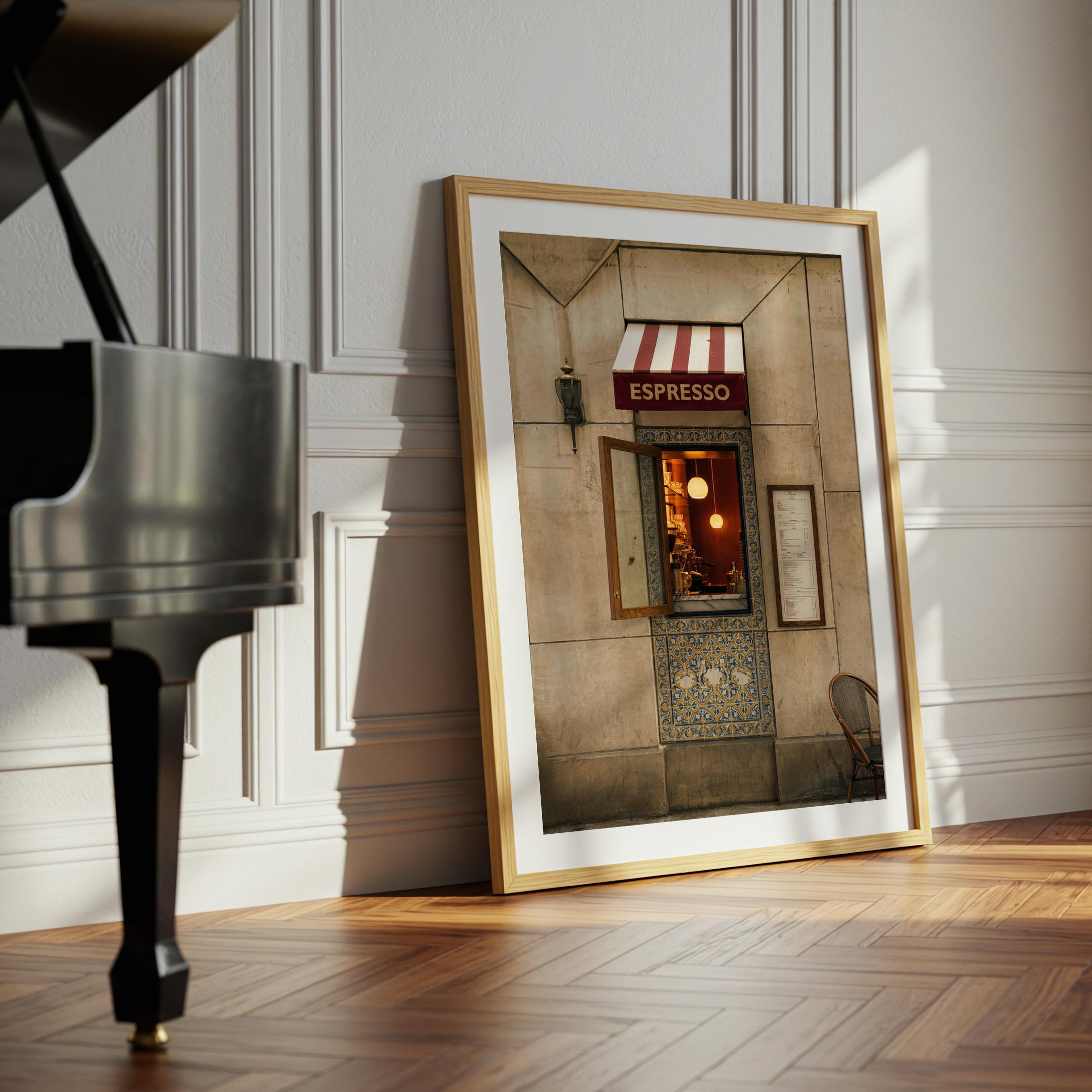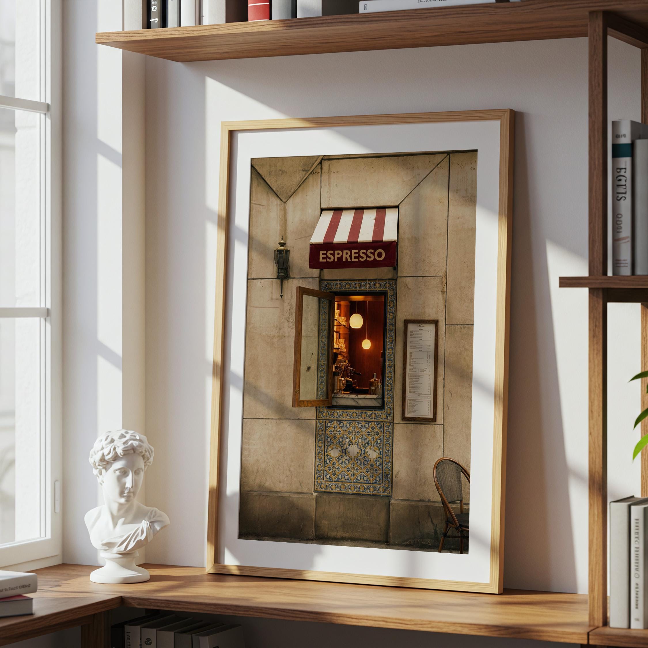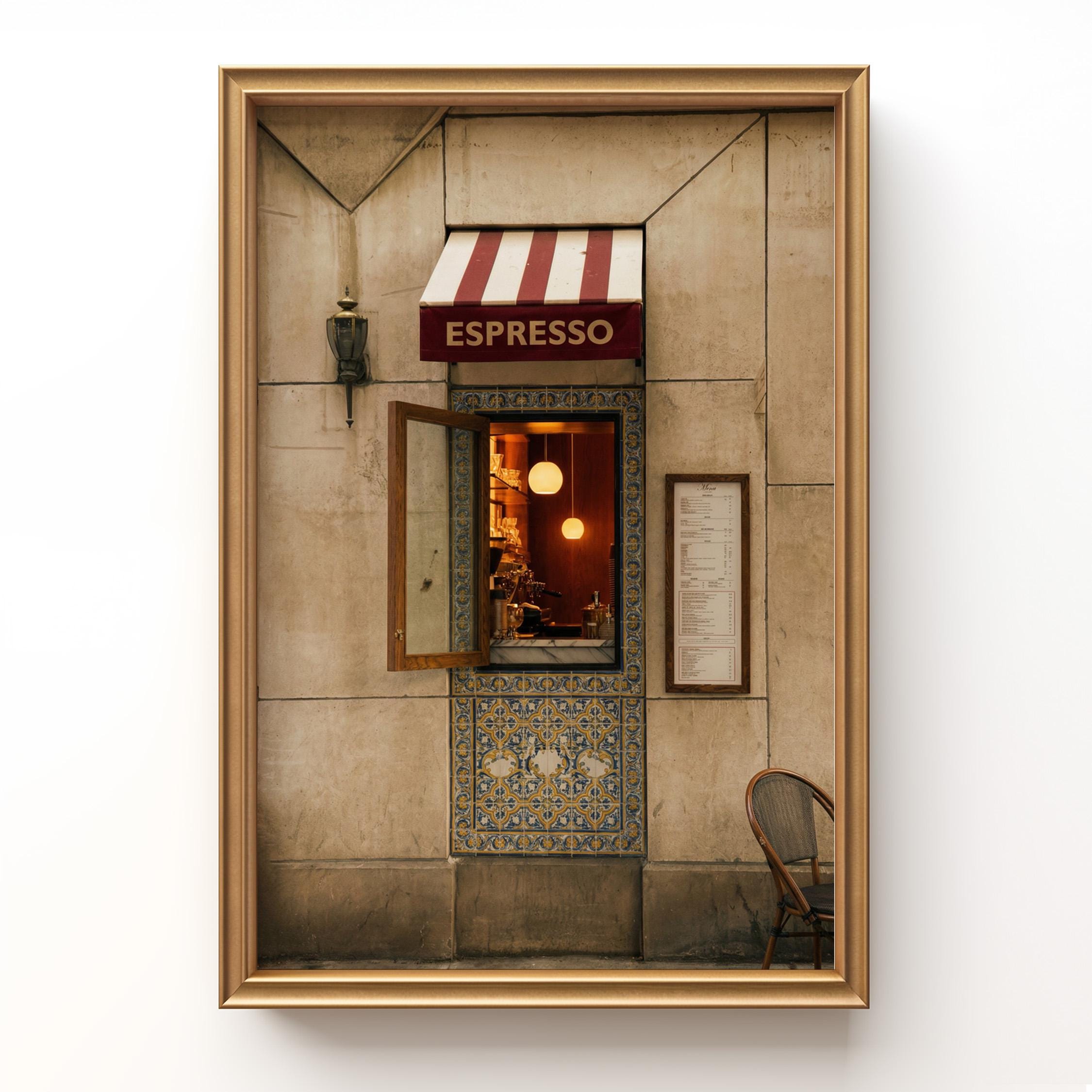 A small espresso bar somewhere in Italy. This print captures the quiet charm of an Italian café window at golden hour. It feels local, intimate, and timeless — like a quick stop for coffee in Rome, Florence, or a tucked-away street in Naples.