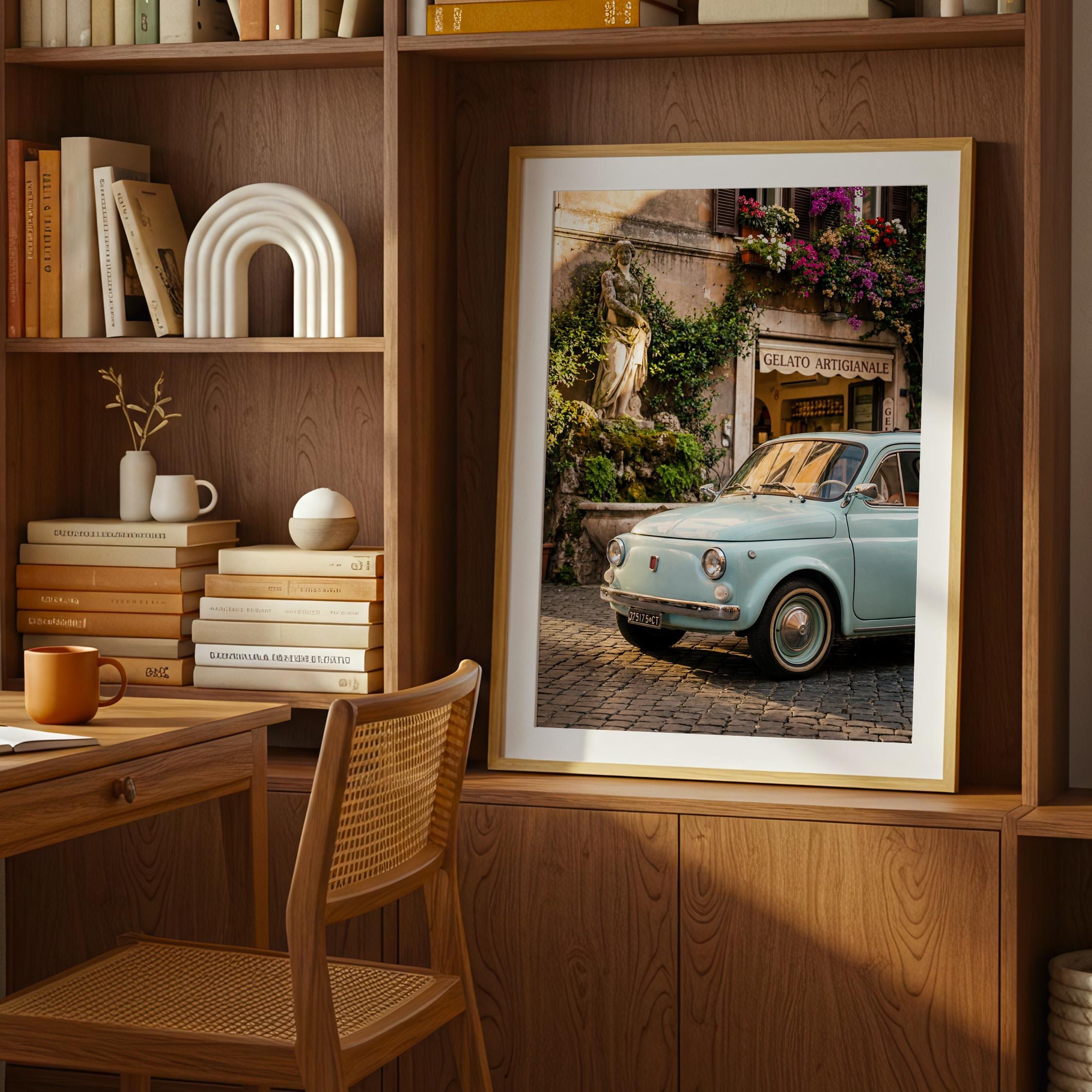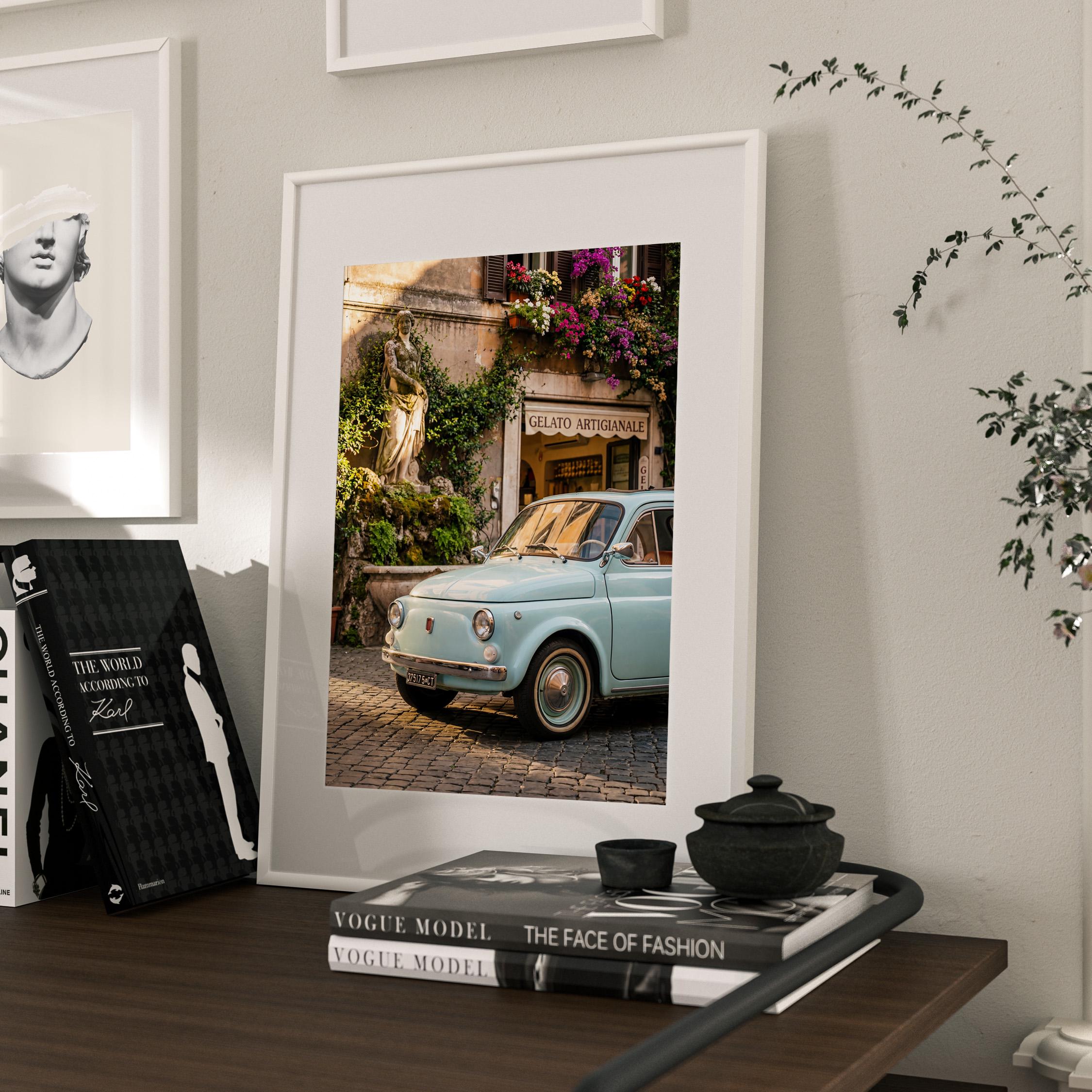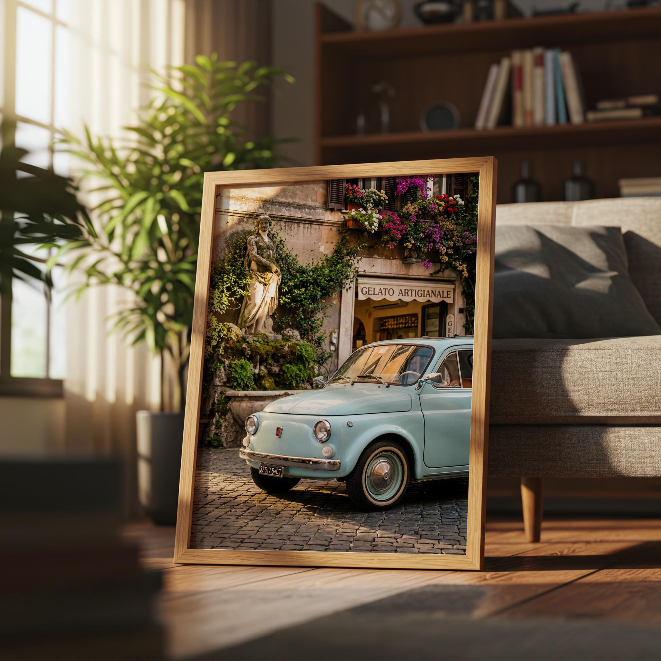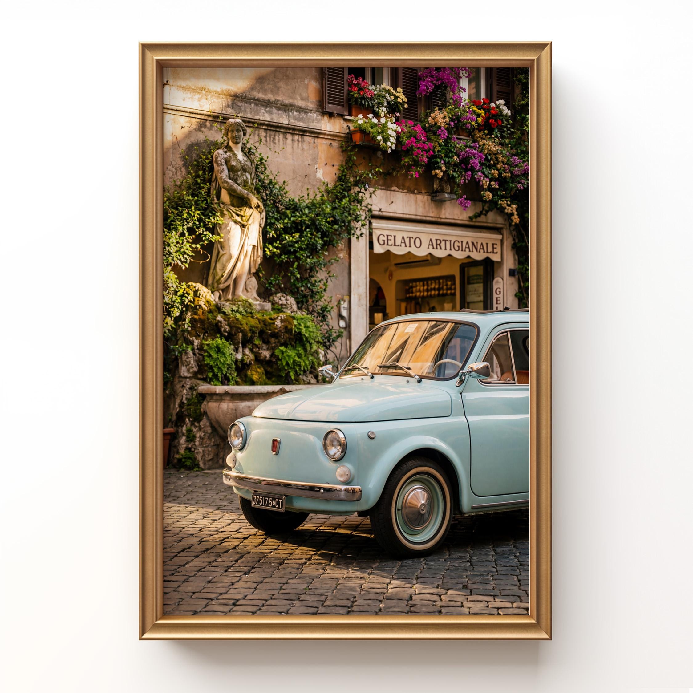 A turquoise vintage Fiat 500 parked outside a gelateria in Rome. Terracotta walls, blooming flowers, and warm late-afternoon light bring the whole scene to life. This printable captures classic Italian street charm, small cars, cobblestone roads, hand-painted signs, and effortless beauty.