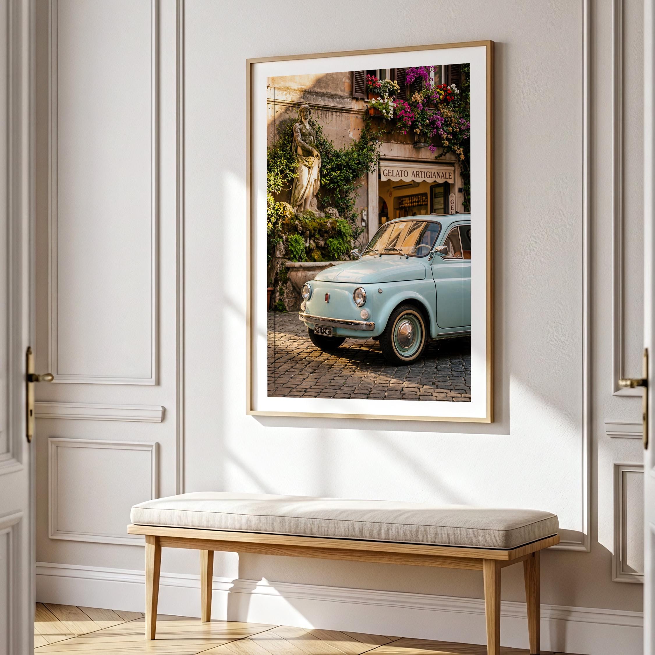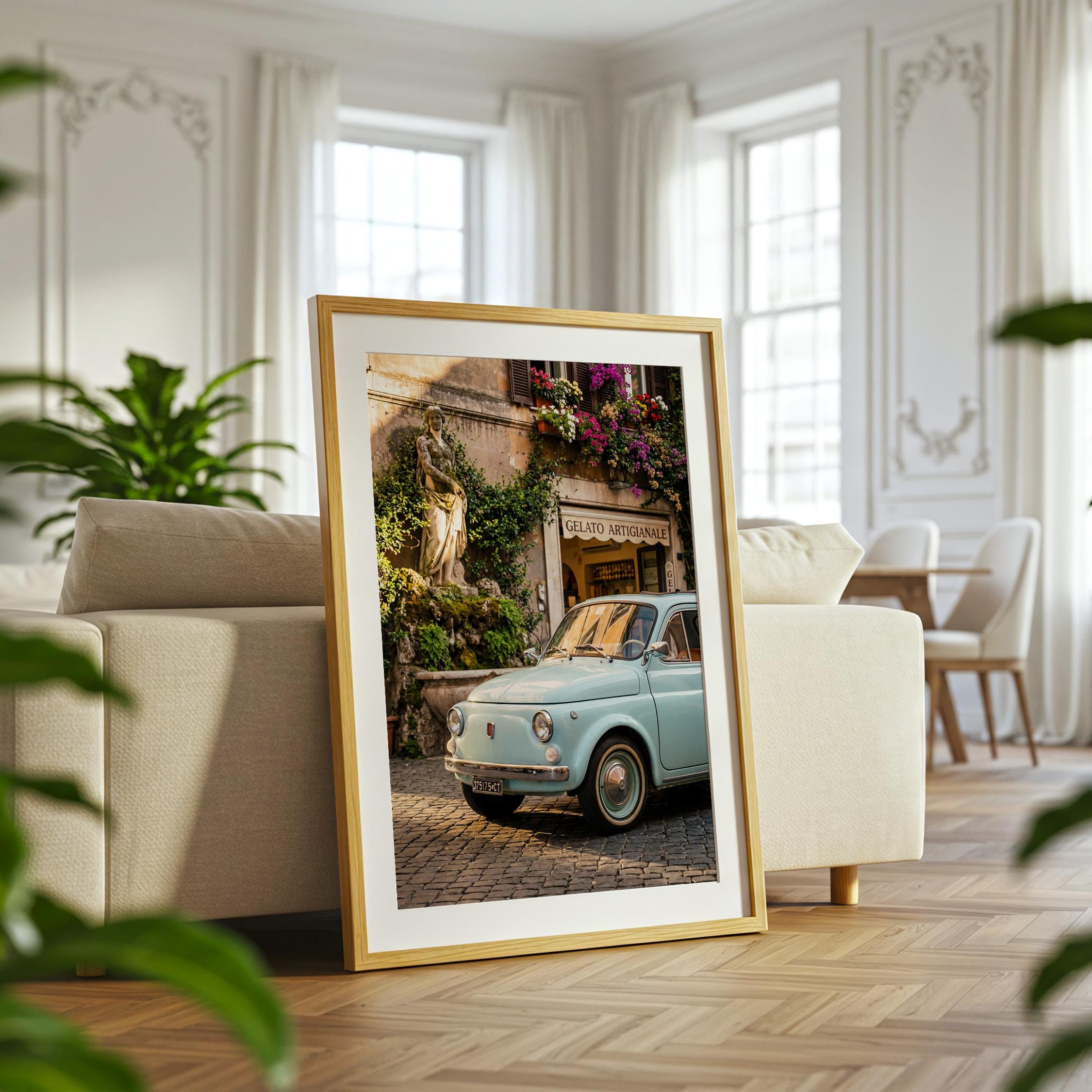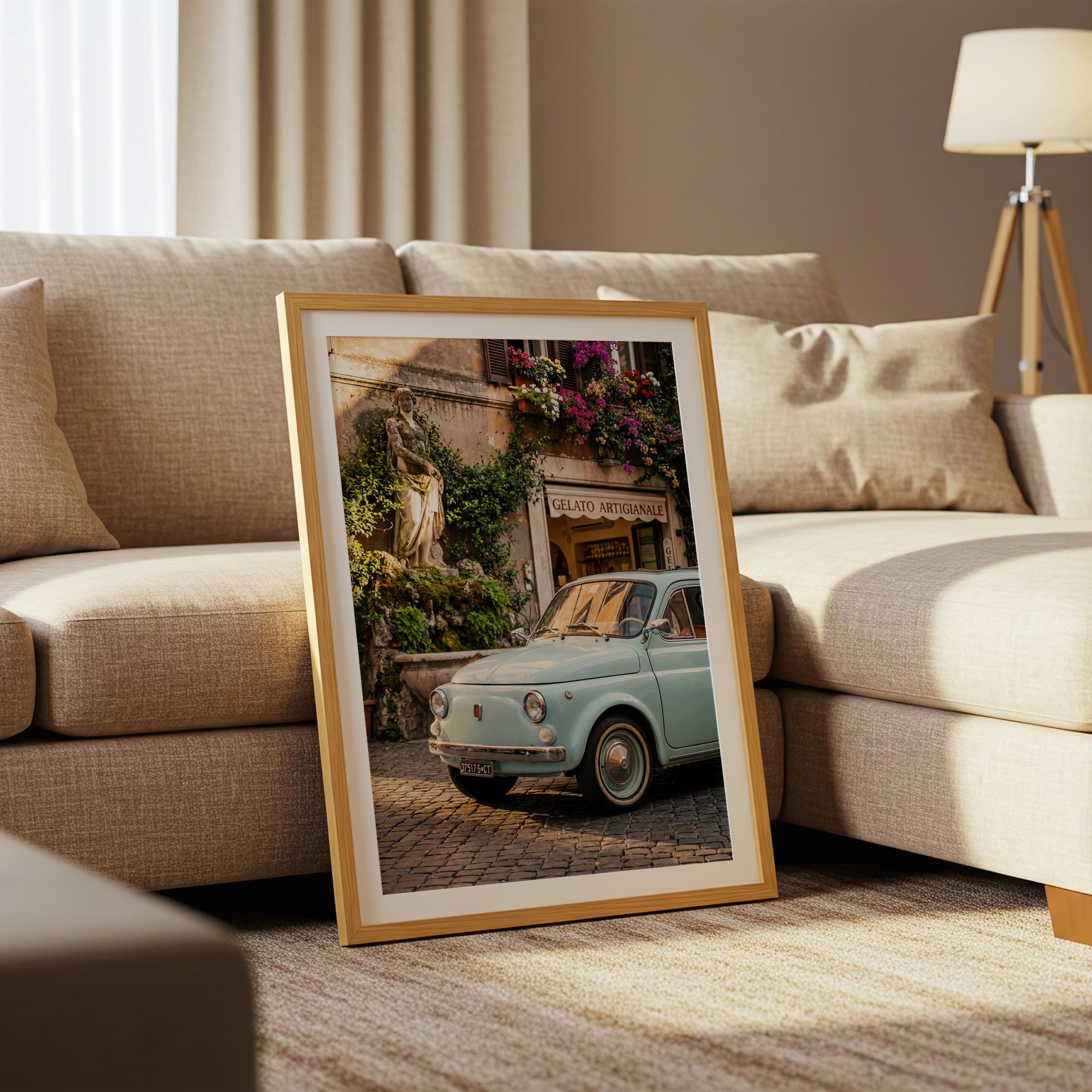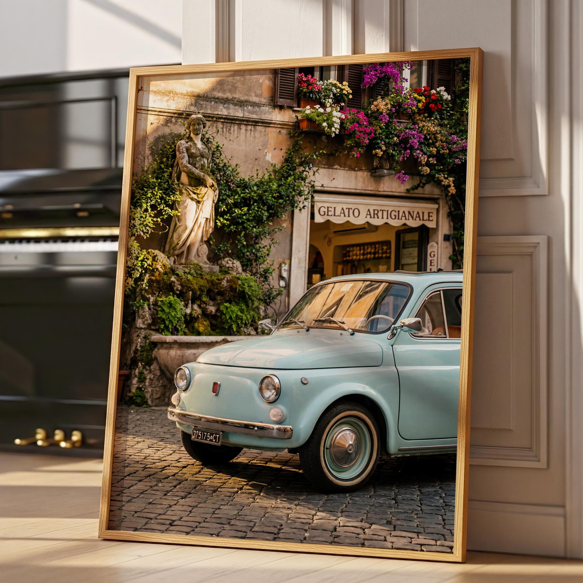 A turquoise vintage Fiat 500 parked outside a gelateria in Rome. Terracotta walls, blooming flowers, and warm late-afternoon light bring the whole scene to life. This printable captures classic Italian street charm, small cars, cobblestone roads, hand-painted signs, and effortless beauty.