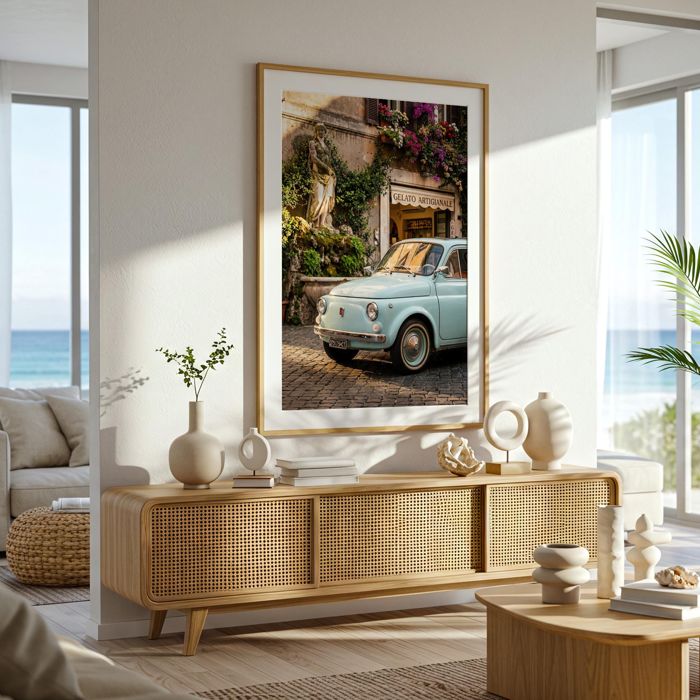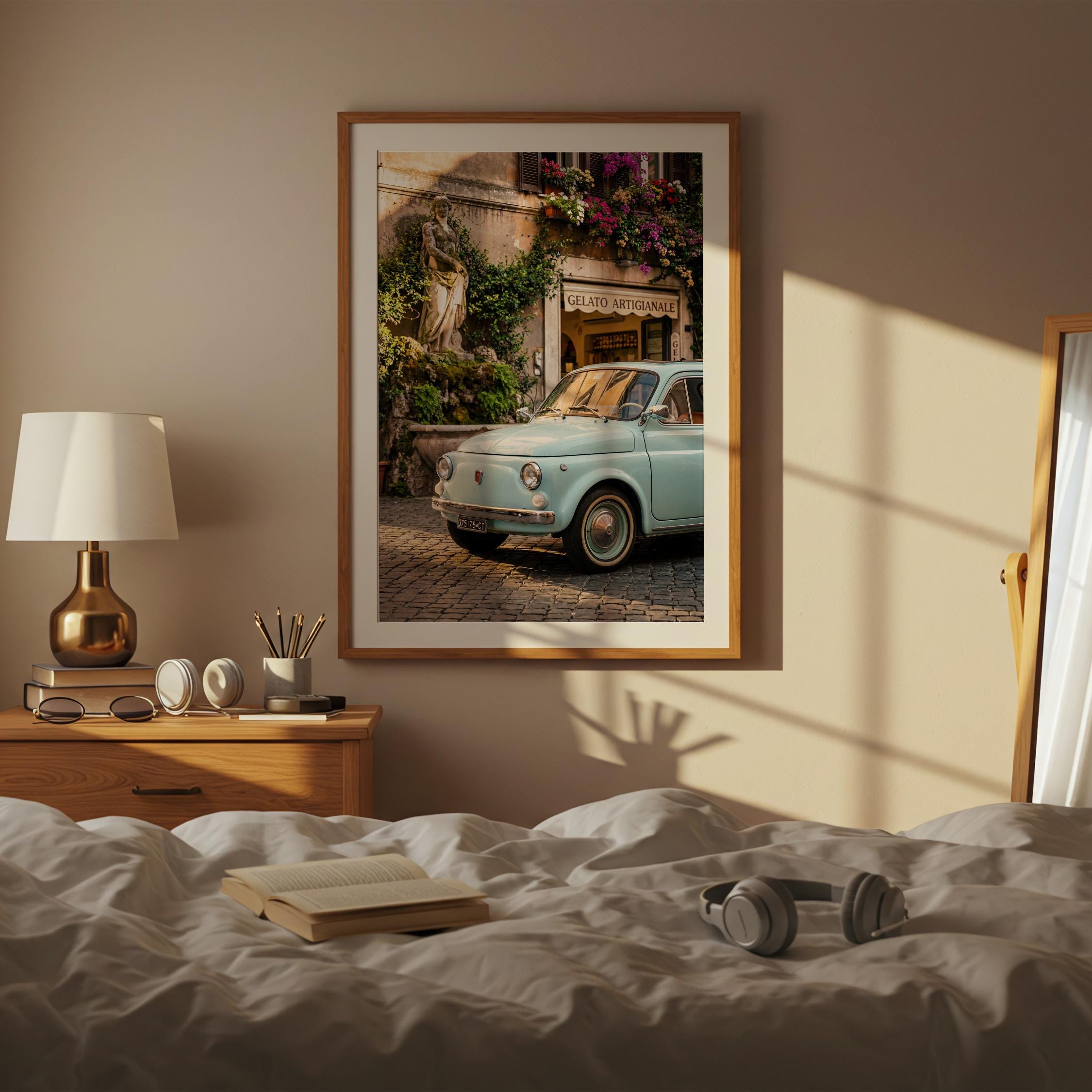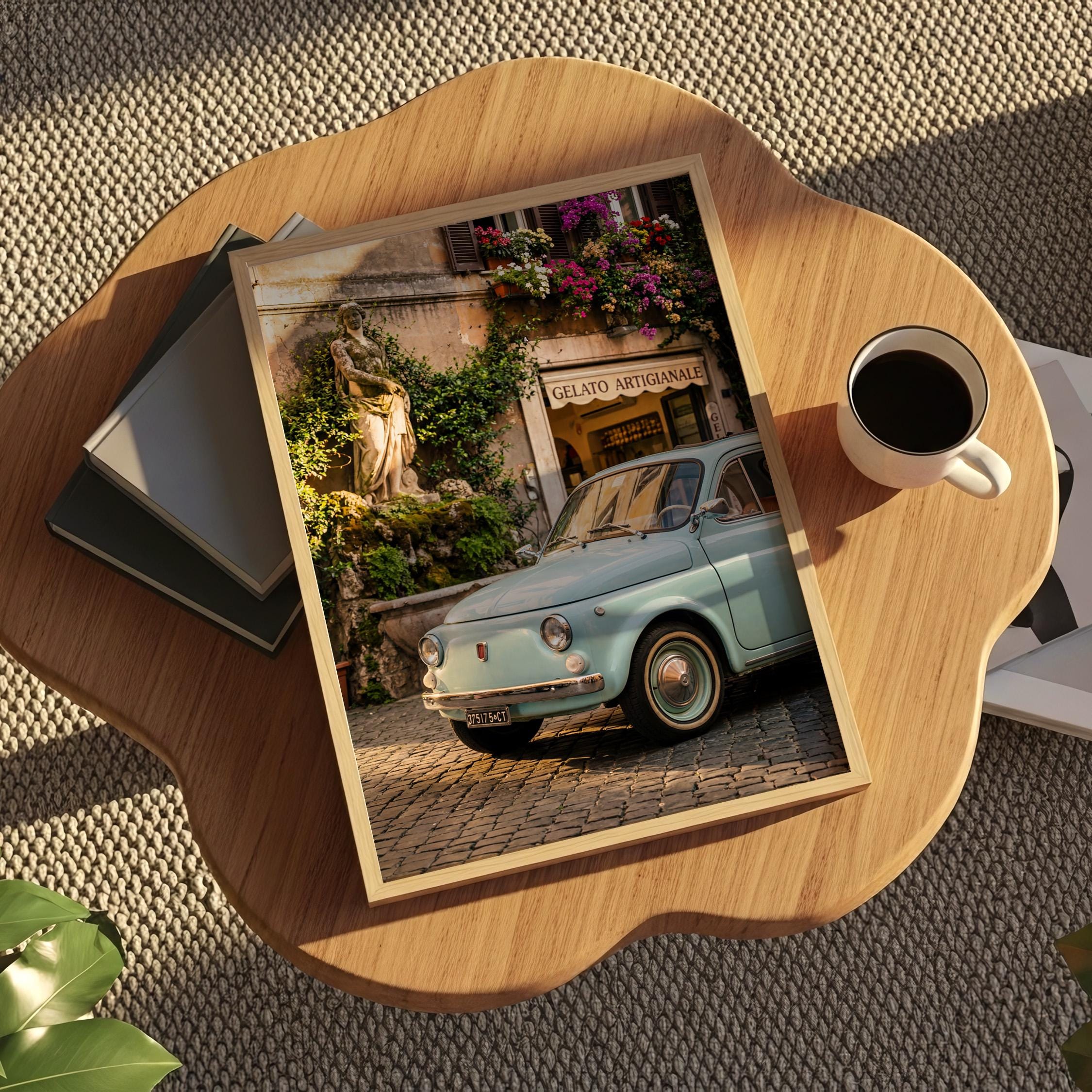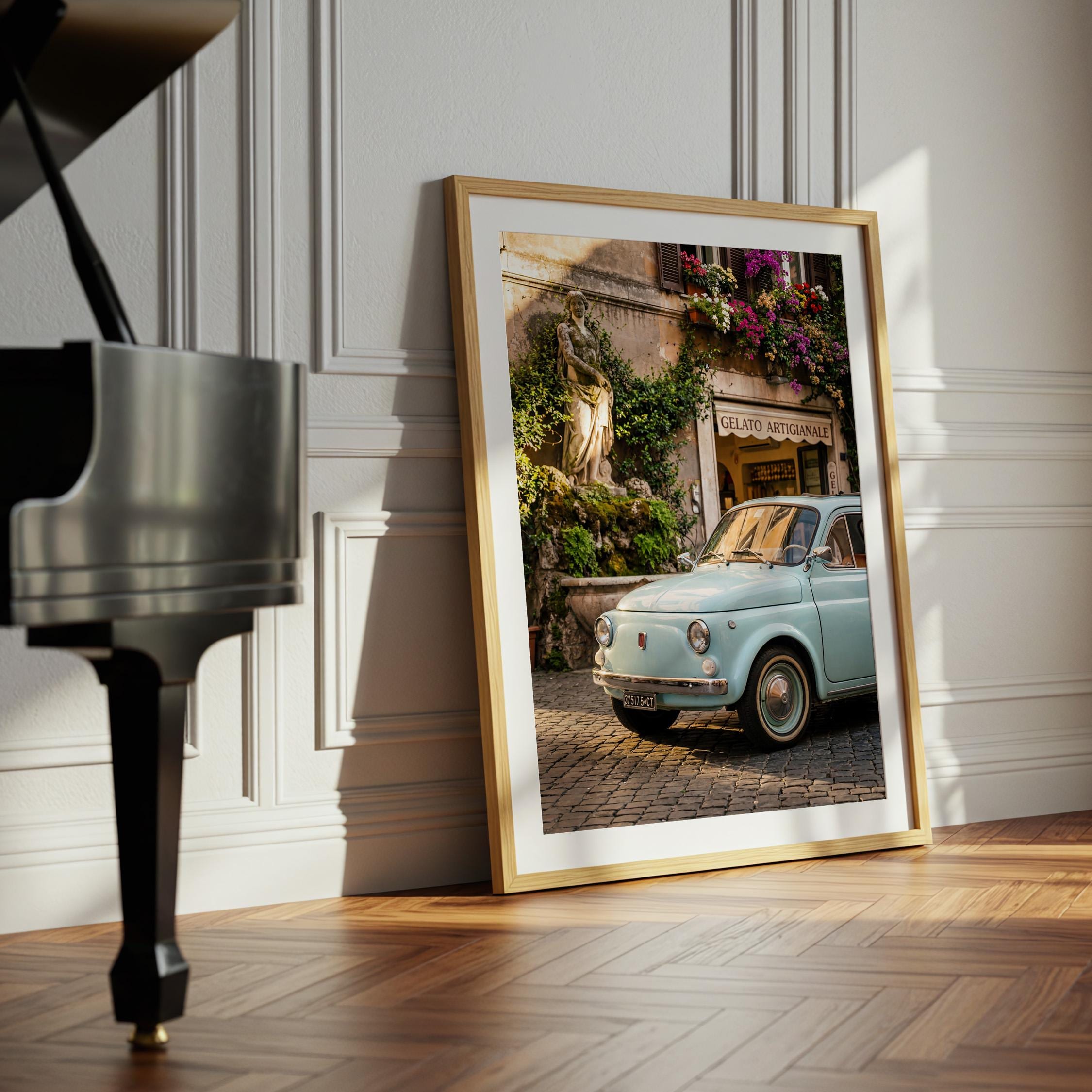 A turquoise vintage Fiat 500 parked outside a gelateria in Rome. Terracotta walls, blooming flowers, and warm late-afternoon light bring the whole scene to life. This printable captures classic Italian street charm, small cars, cobblestone roads, hand-painted signs, and effortless beauty.