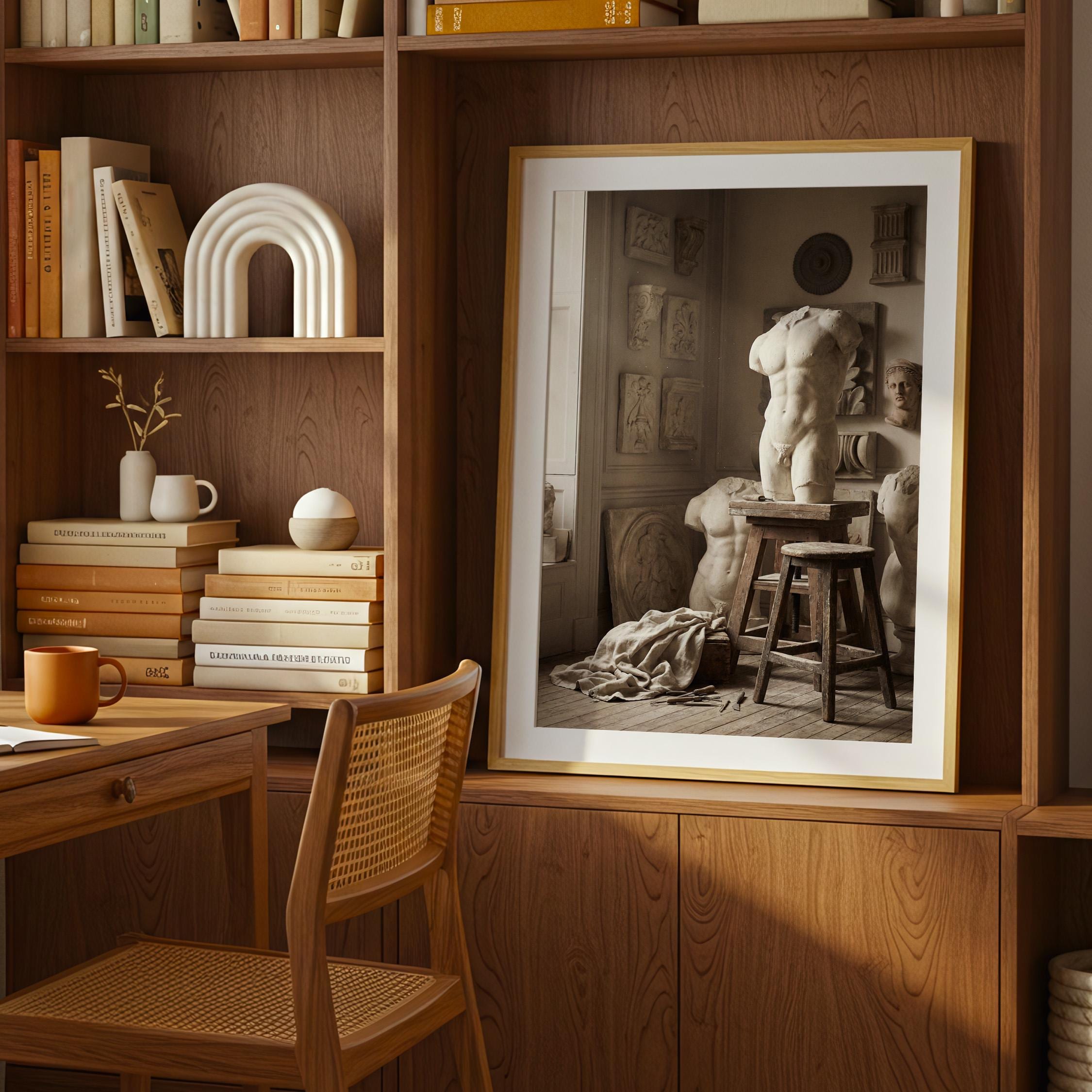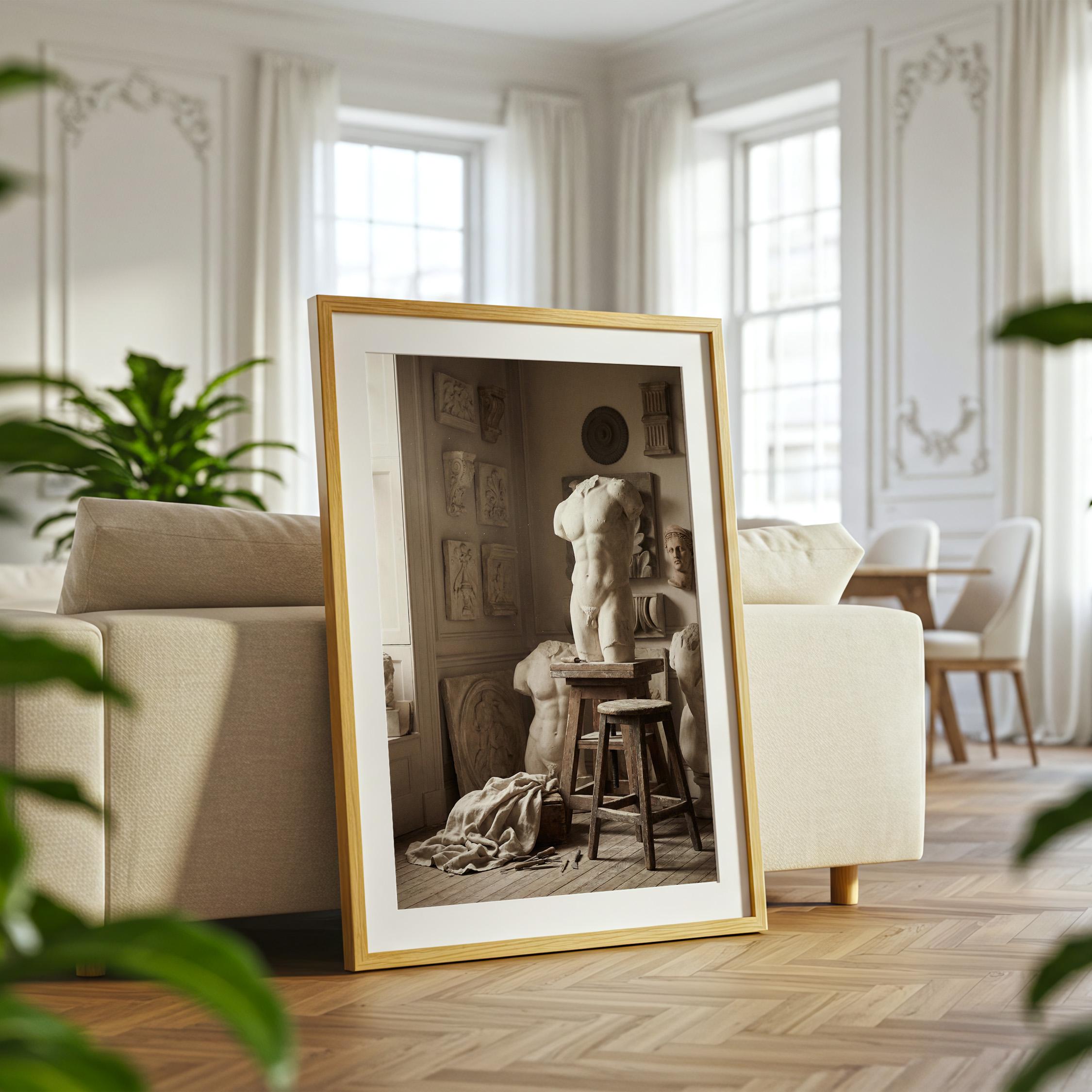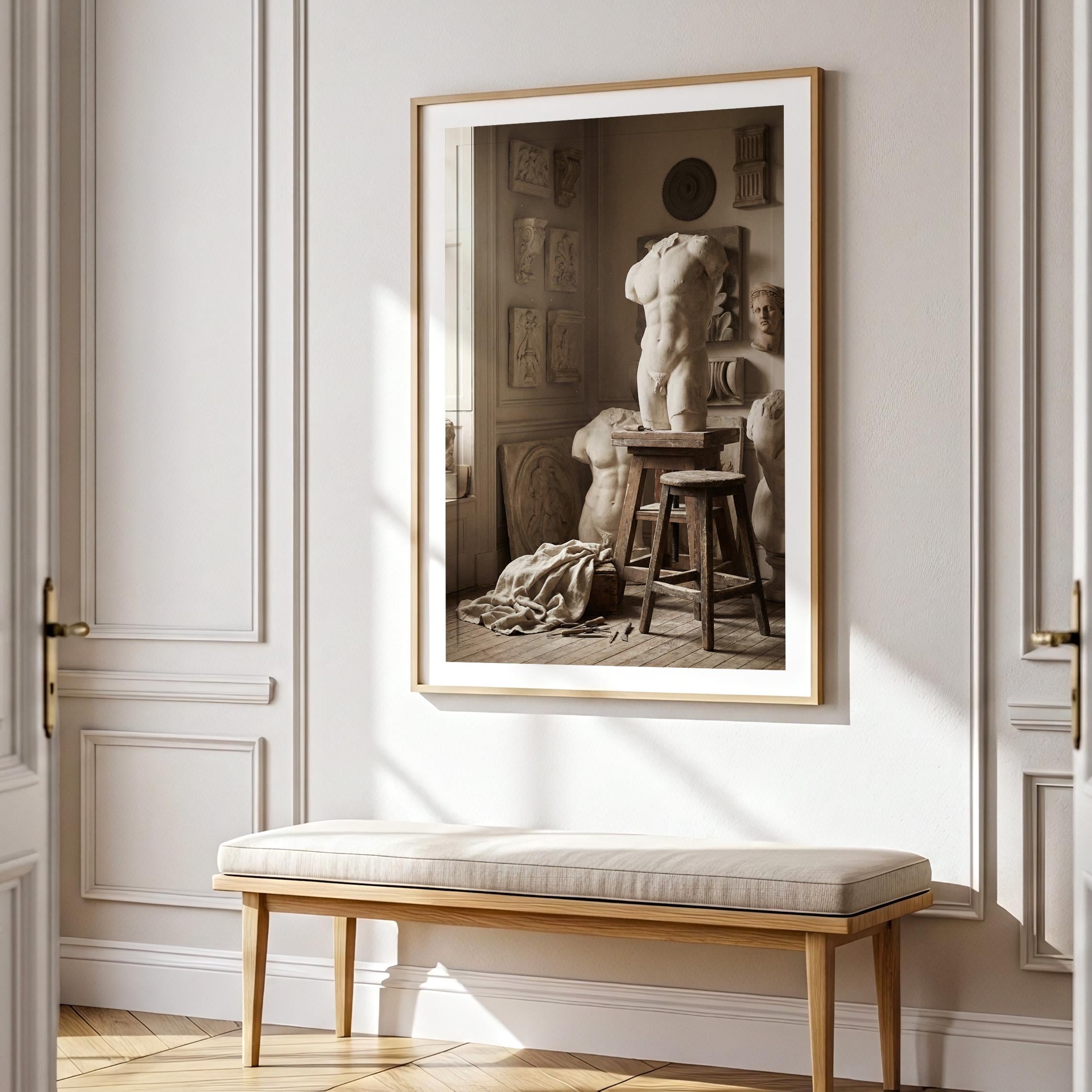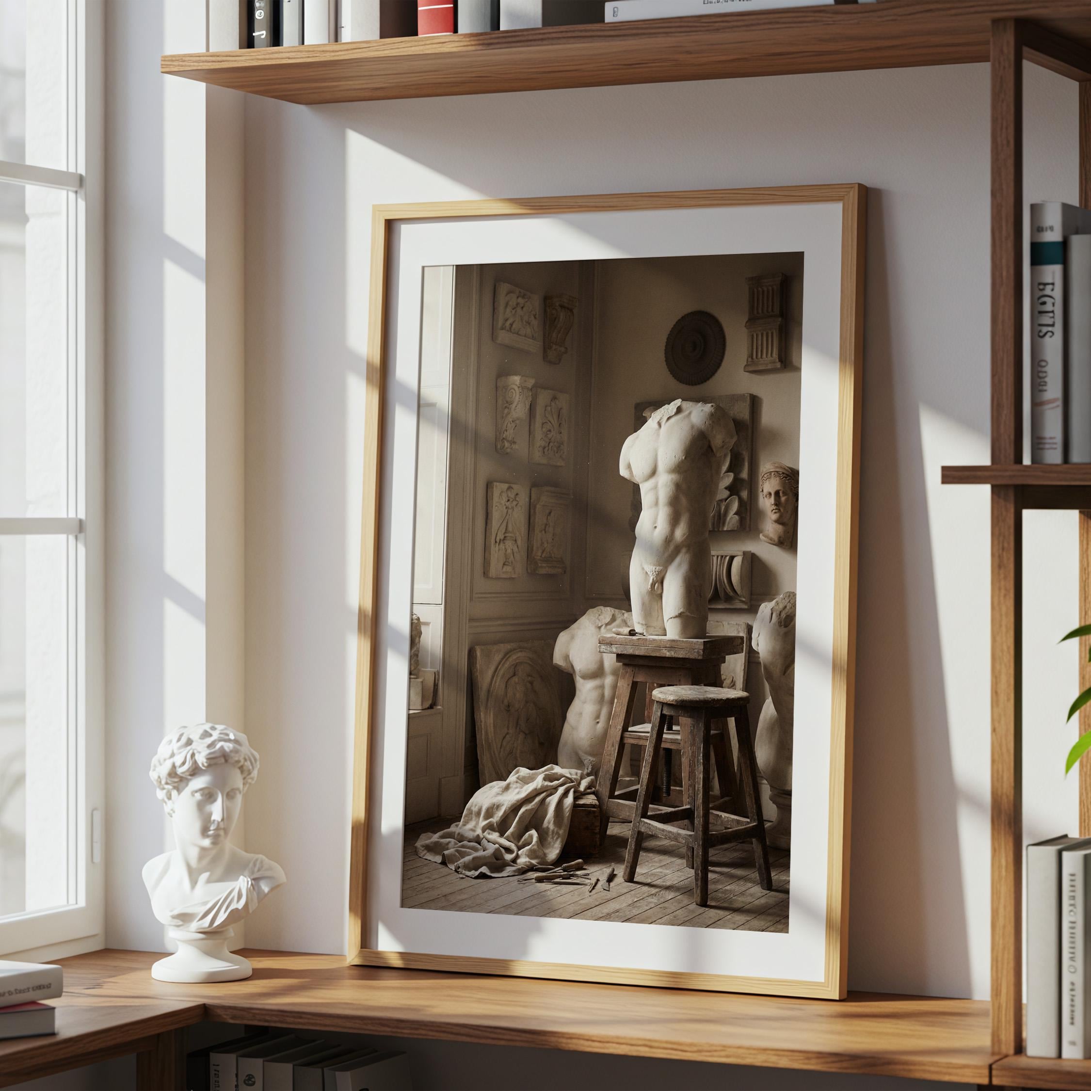 A Renaissance studio scene inspired by Michelangelo’s David. Marble forms, soft light, and the quiet discipline of classical craftsmanship. This print evokes the atmosphere of old master ateliers and museum halls. Ideal for art studios, libraries, offices, and interiors shaped by classical taste and old money aesthetic.