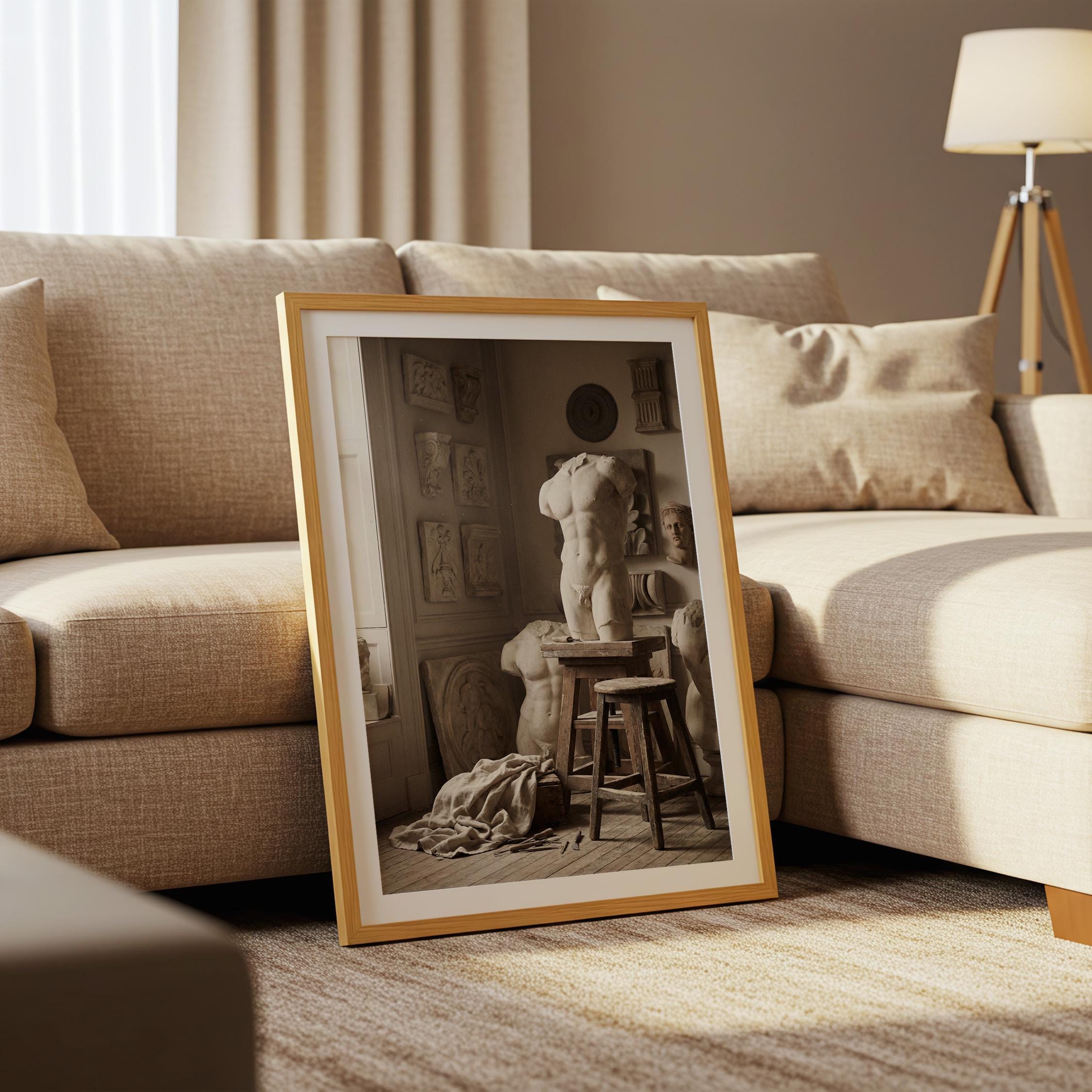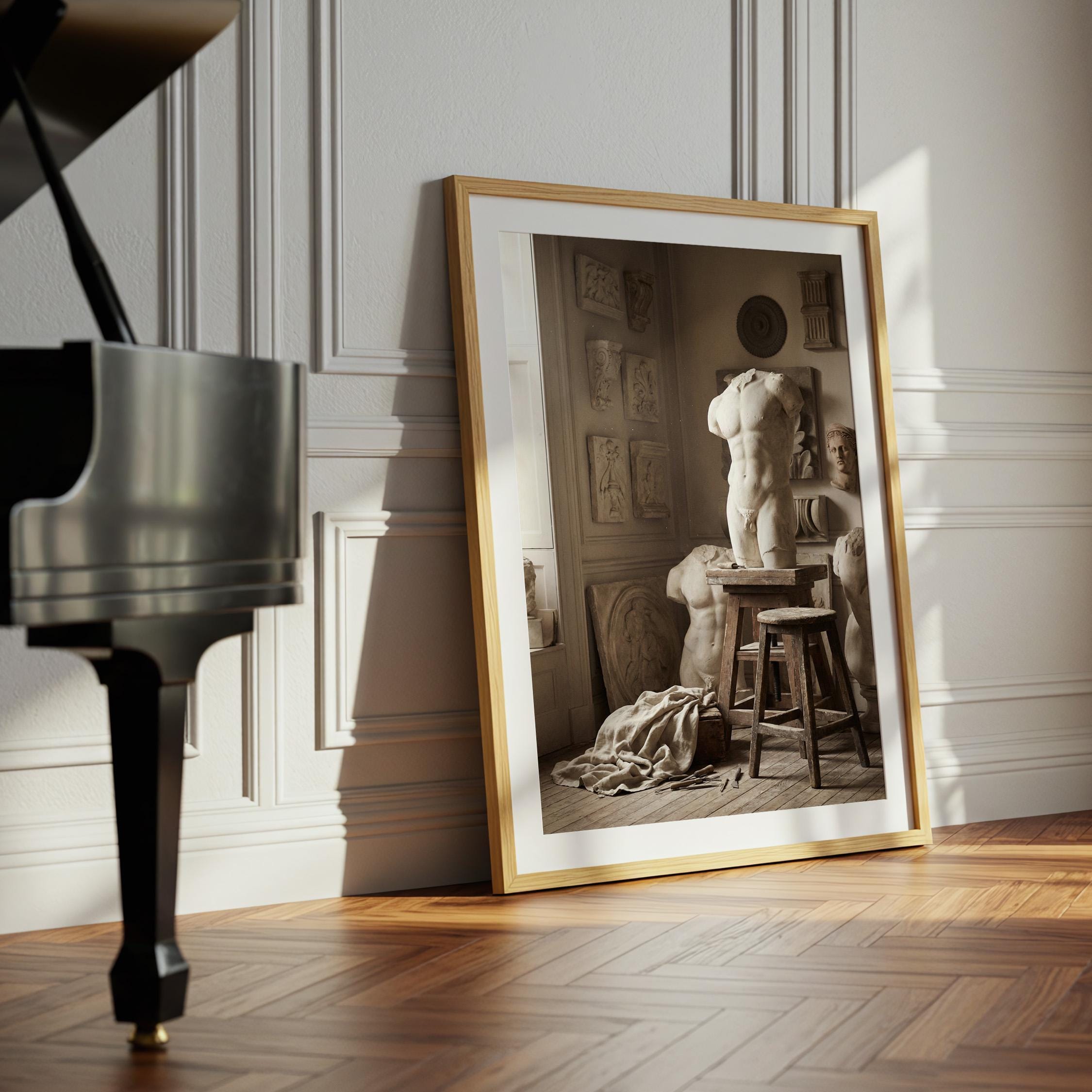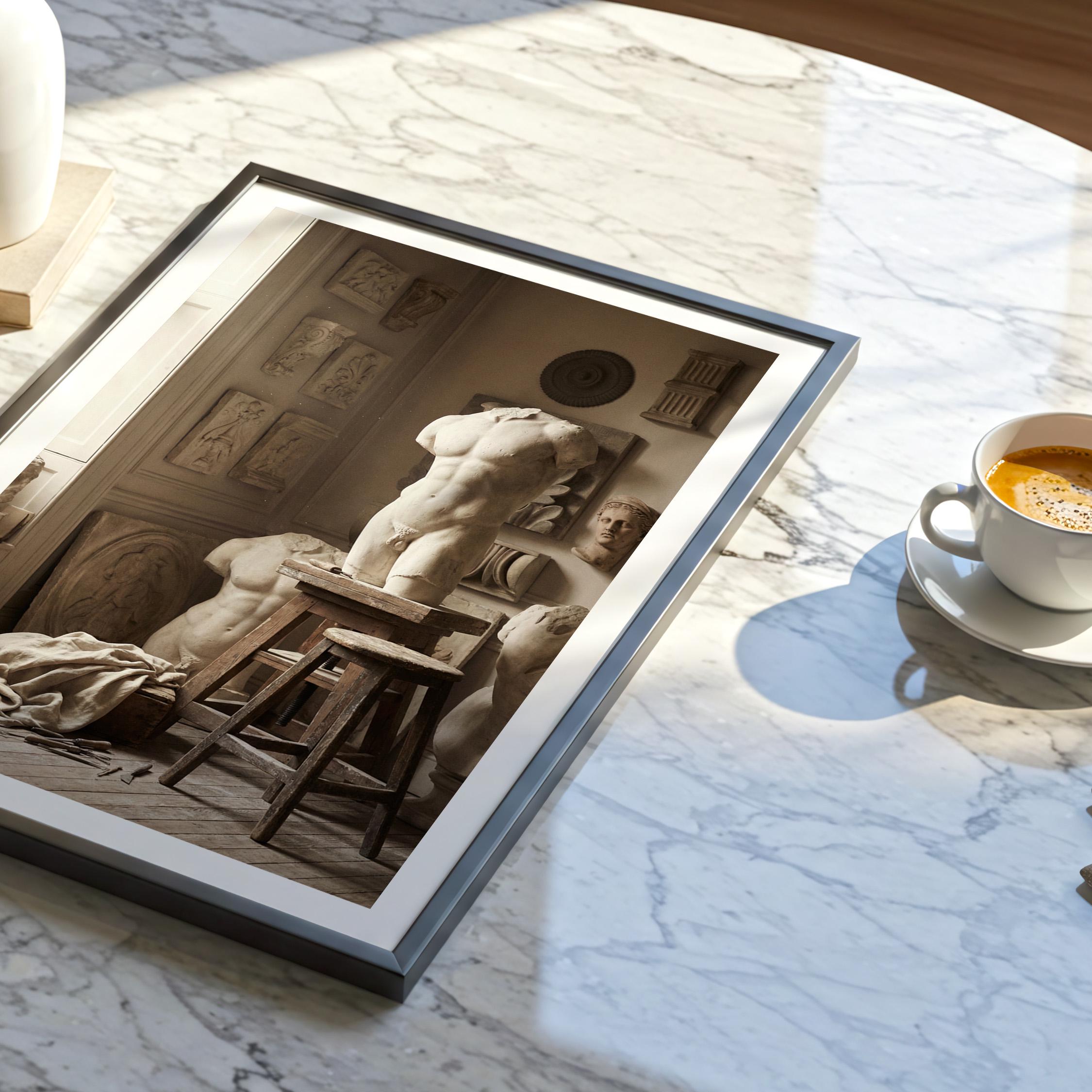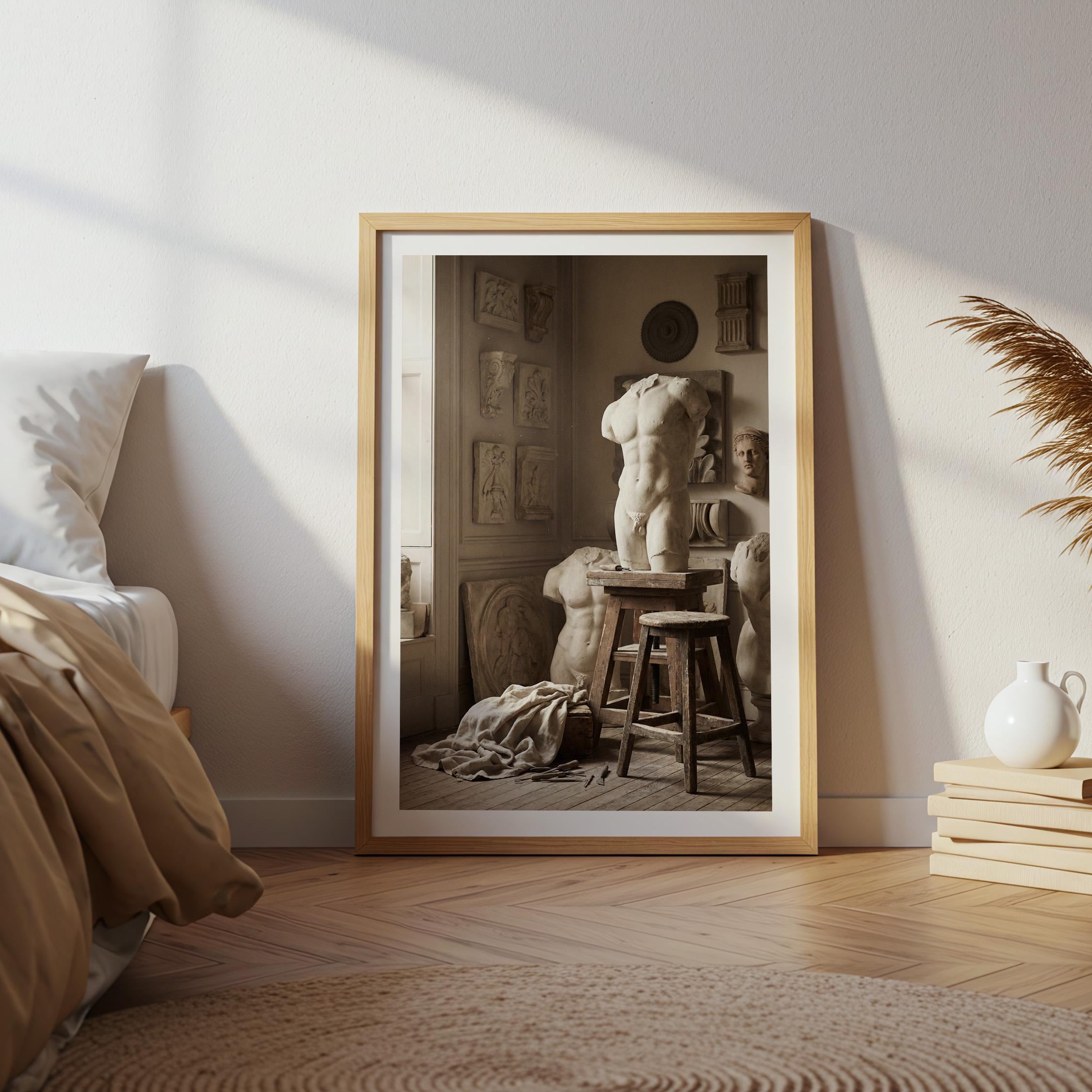 A Renaissance studio scene inspired by Michelangelo’s David. Marble forms, soft light, and the quiet discipline of classical craftsmanship. This print evokes the atmosphere of old master ateliers and museum halls. Ideal for art studios, libraries, offices, and interiors shaped by classical taste and old money aesthetic.