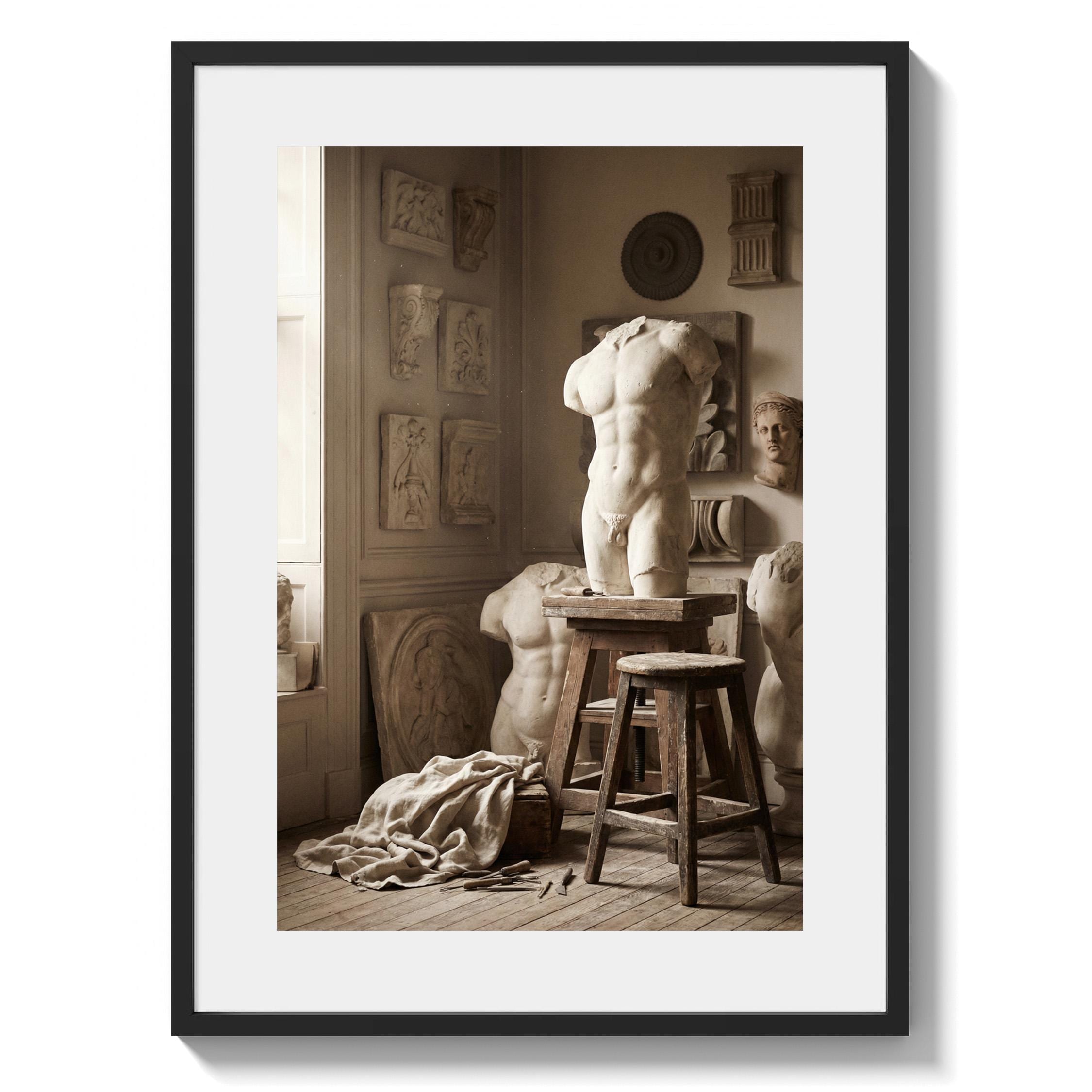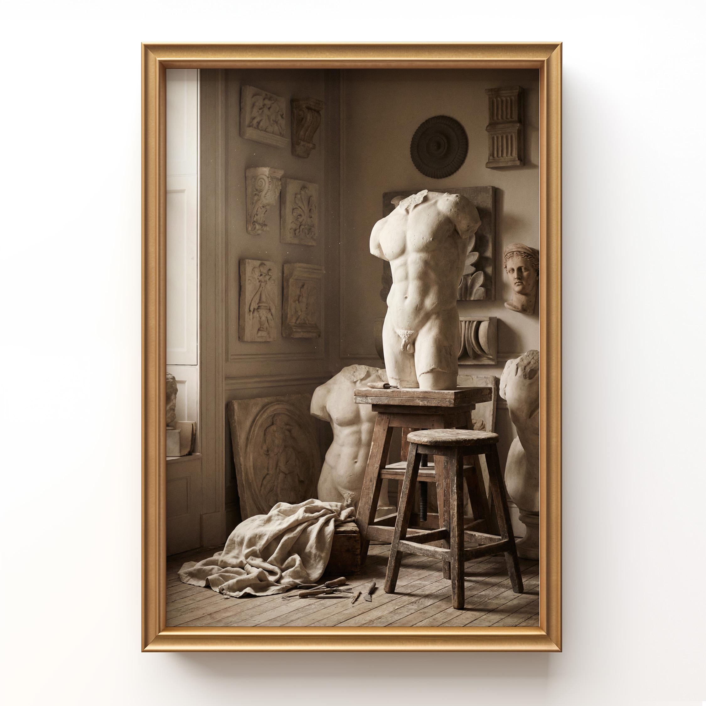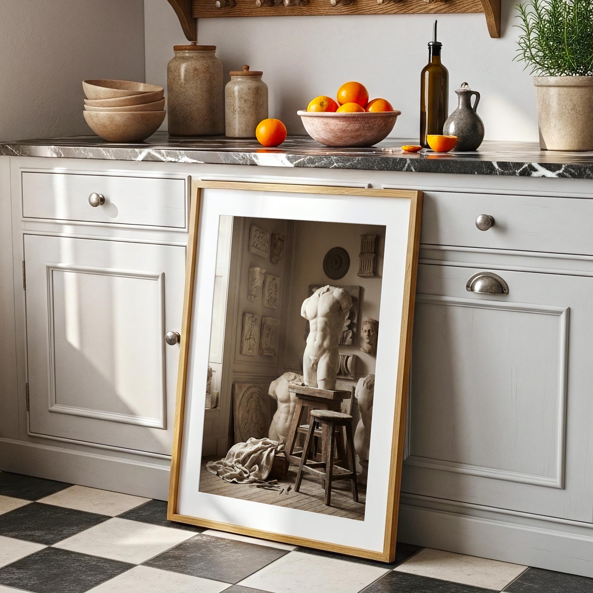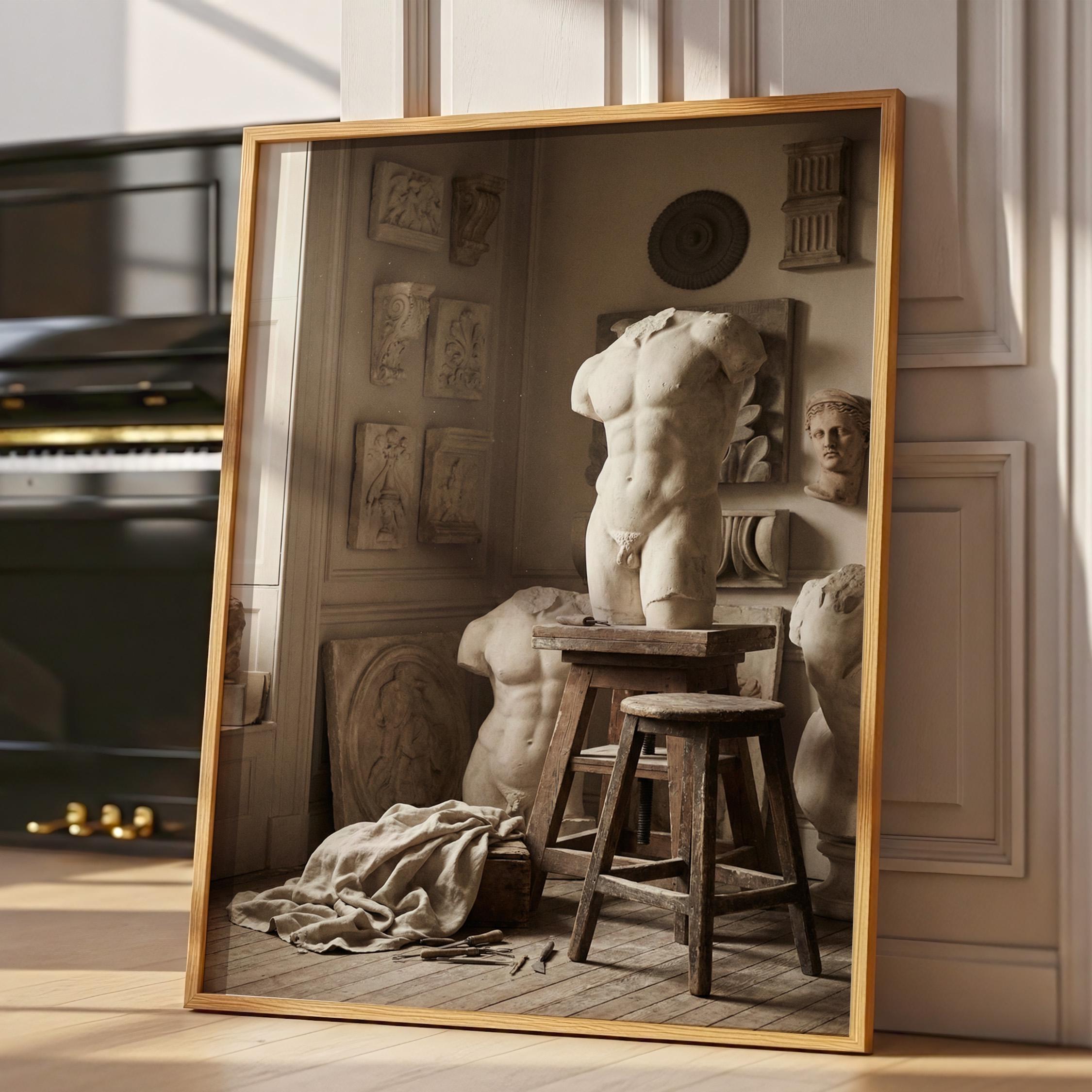 A Renaissance studio scene inspired by Michelangelo’s David. Marble forms, soft light, and the quiet discipline of classical craftsmanship. This print evokes the atmosphere of old master ateliers and museum halls. Ideal for art studios, libraries, offices, and interiors shaped by classical taste and old money aesthetic.