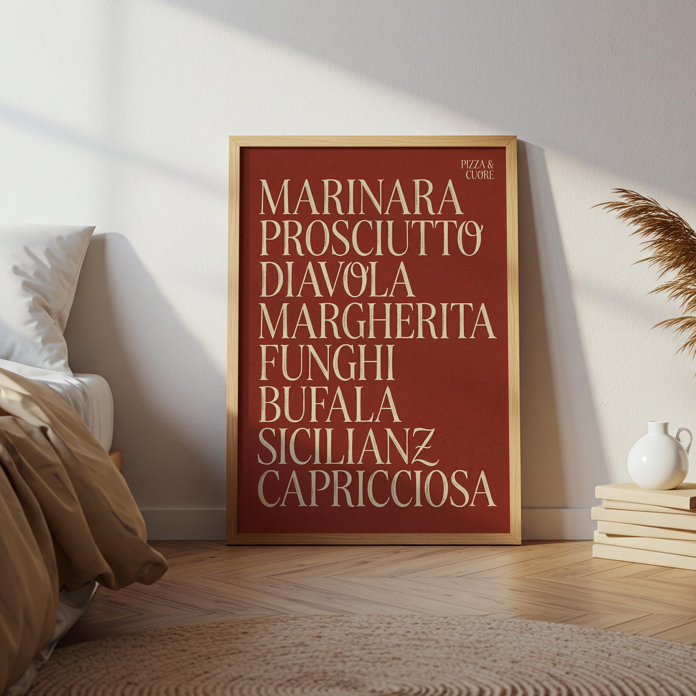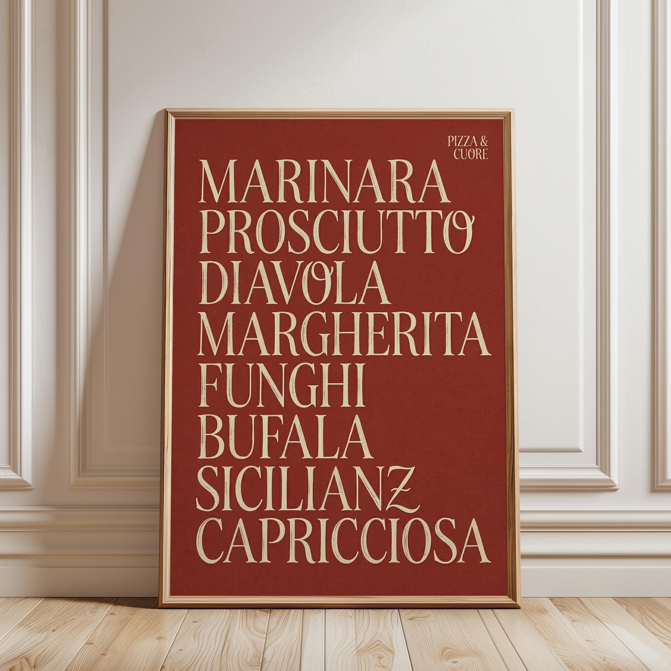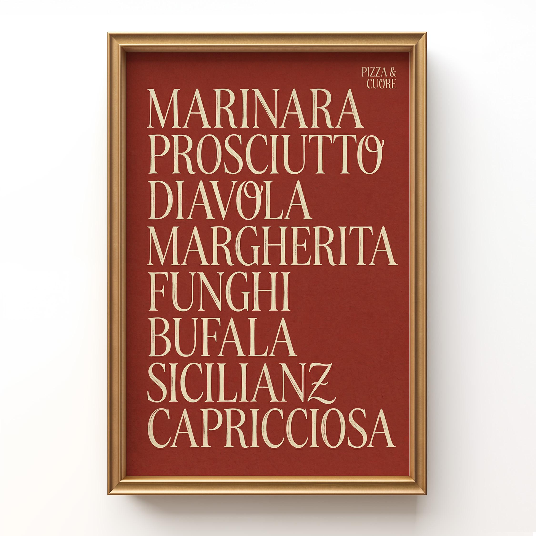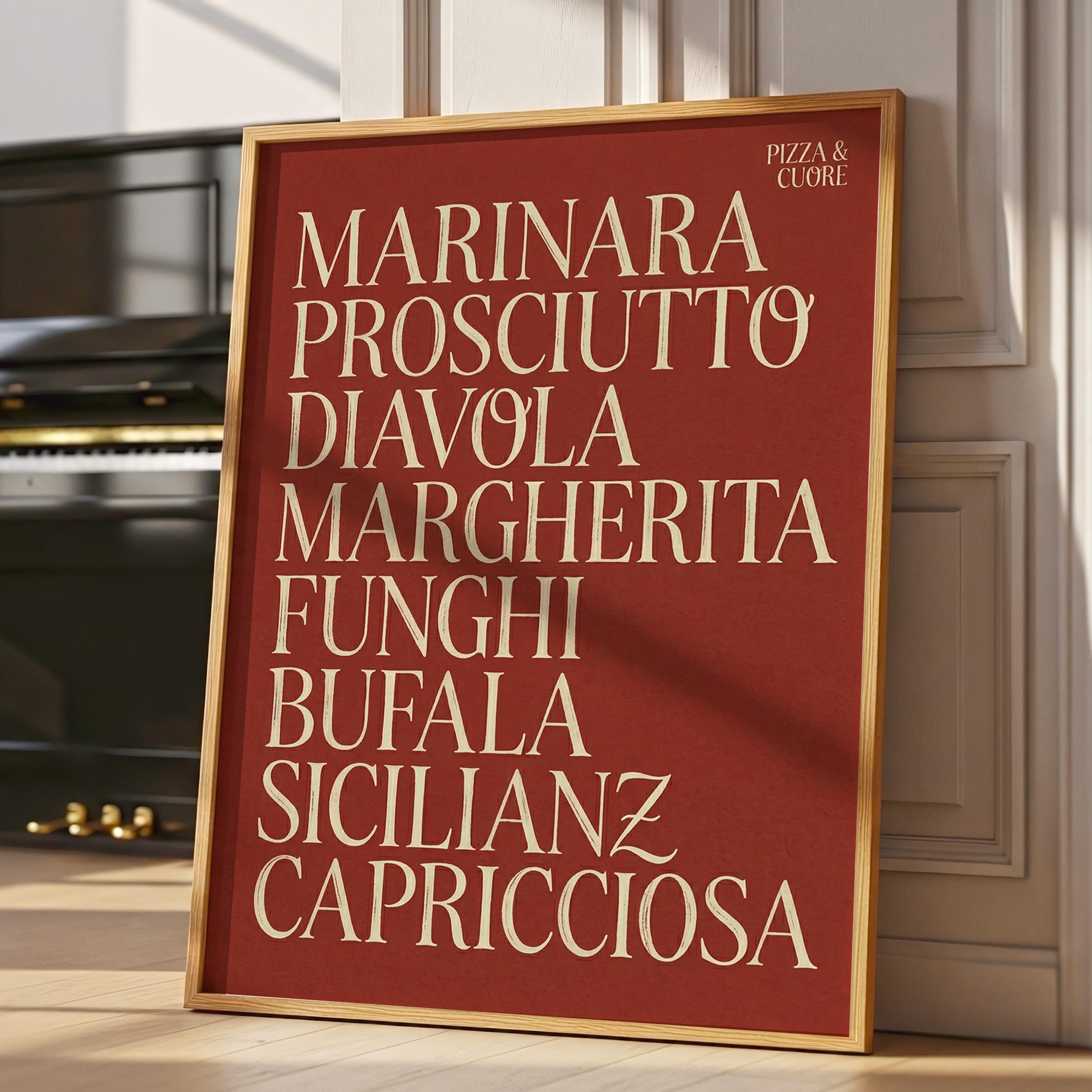A vintage Italian pizza menu poster inspired by traditional trattoria signage. Warm terracotta tones and elegant serif typography list classic Italian pizzas including Marinara, Prosciutto, Diavola, Margherita, Funghi, Bufala, Sicilian, and Capricciosa. The simple layout and timeless lettering evoke the charm of authentic Italian pizzerias. Perfect for kitchens, dining rooms, cafés, or restaurant spaces that celebrate Italian food culture.