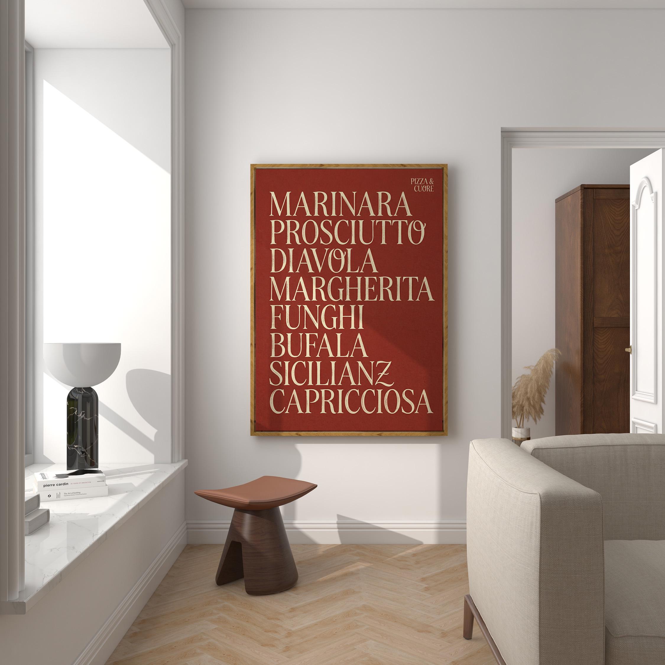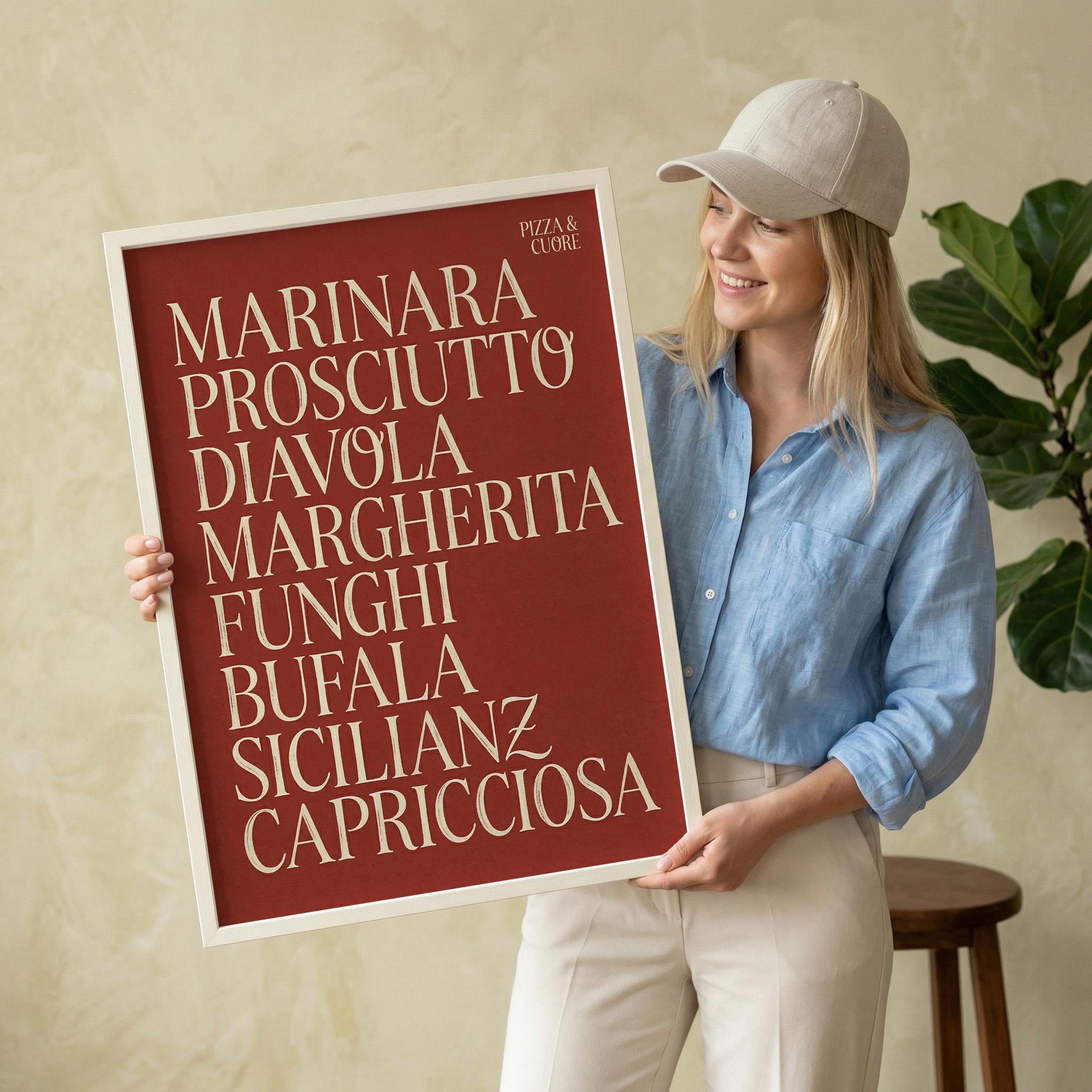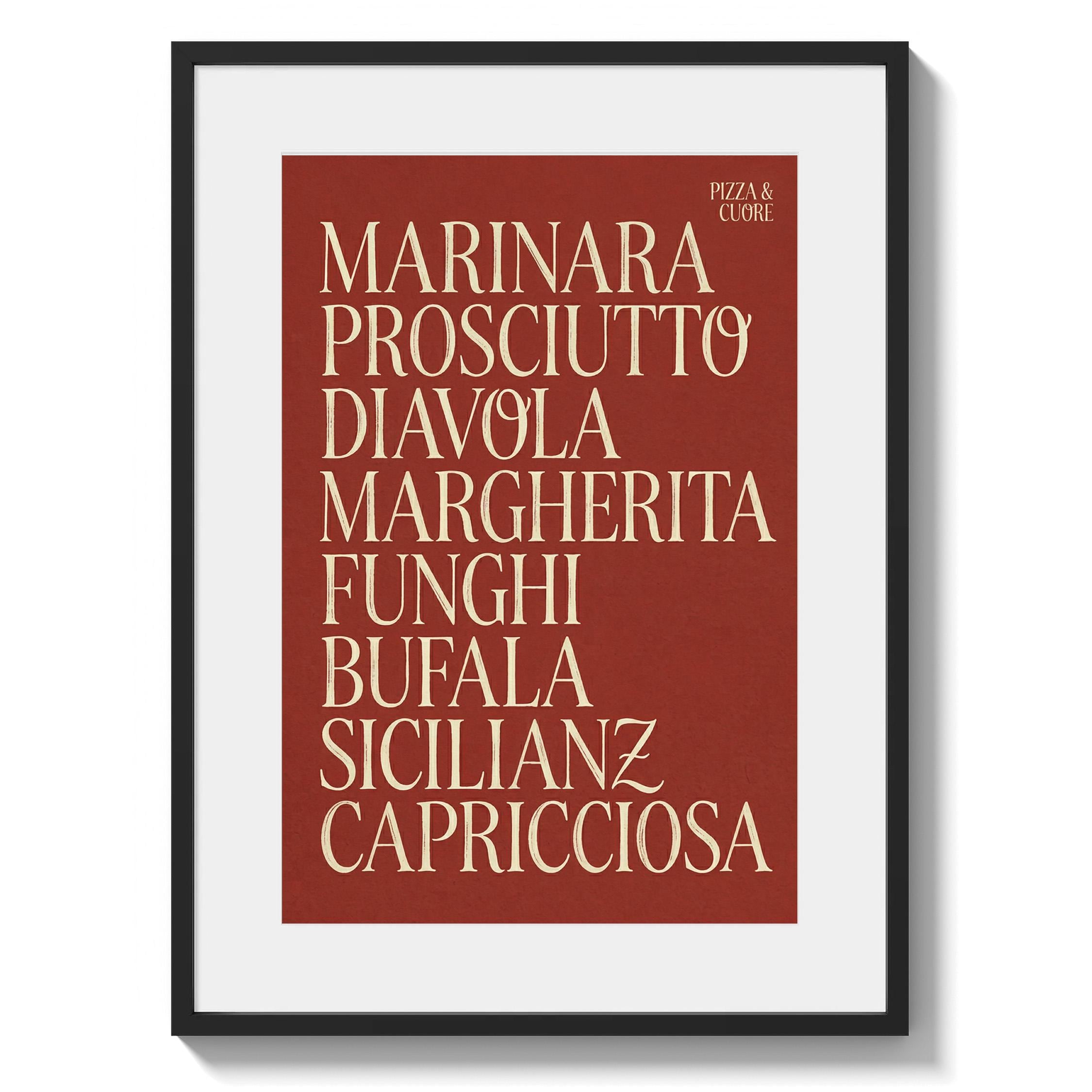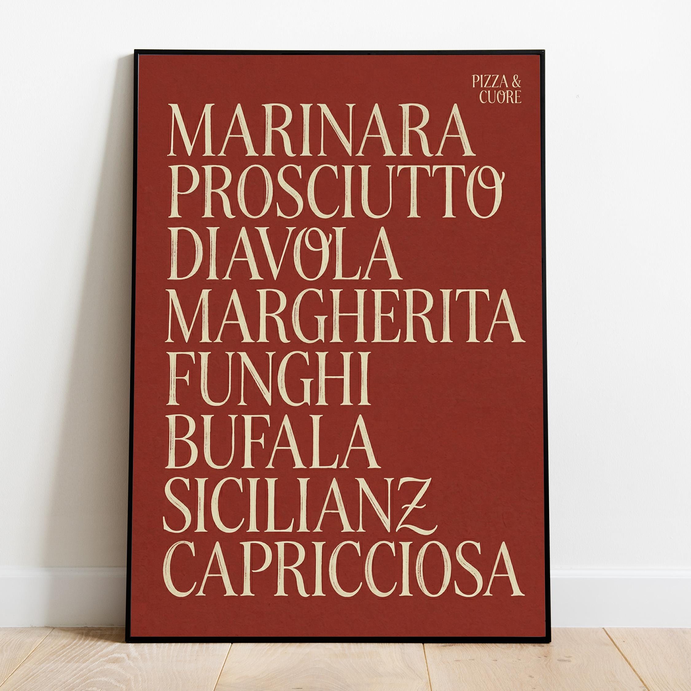A vintage Italian pizza menu poster inspired by traditional trattoria signage. Warm terracotta tones and elegant serif typography list classic Italian pizzas including Marinara, Prosciutto, Diavola, Margherita, Funghi, Bufala, Sicilian, and Capricciosa. The simple layout and timeless lettering evoke the charm of authentic Italian pizzerias. Perfect for kitchens, dining rooms, cafés, or restaurant spaces that celebrate Italian food culture.