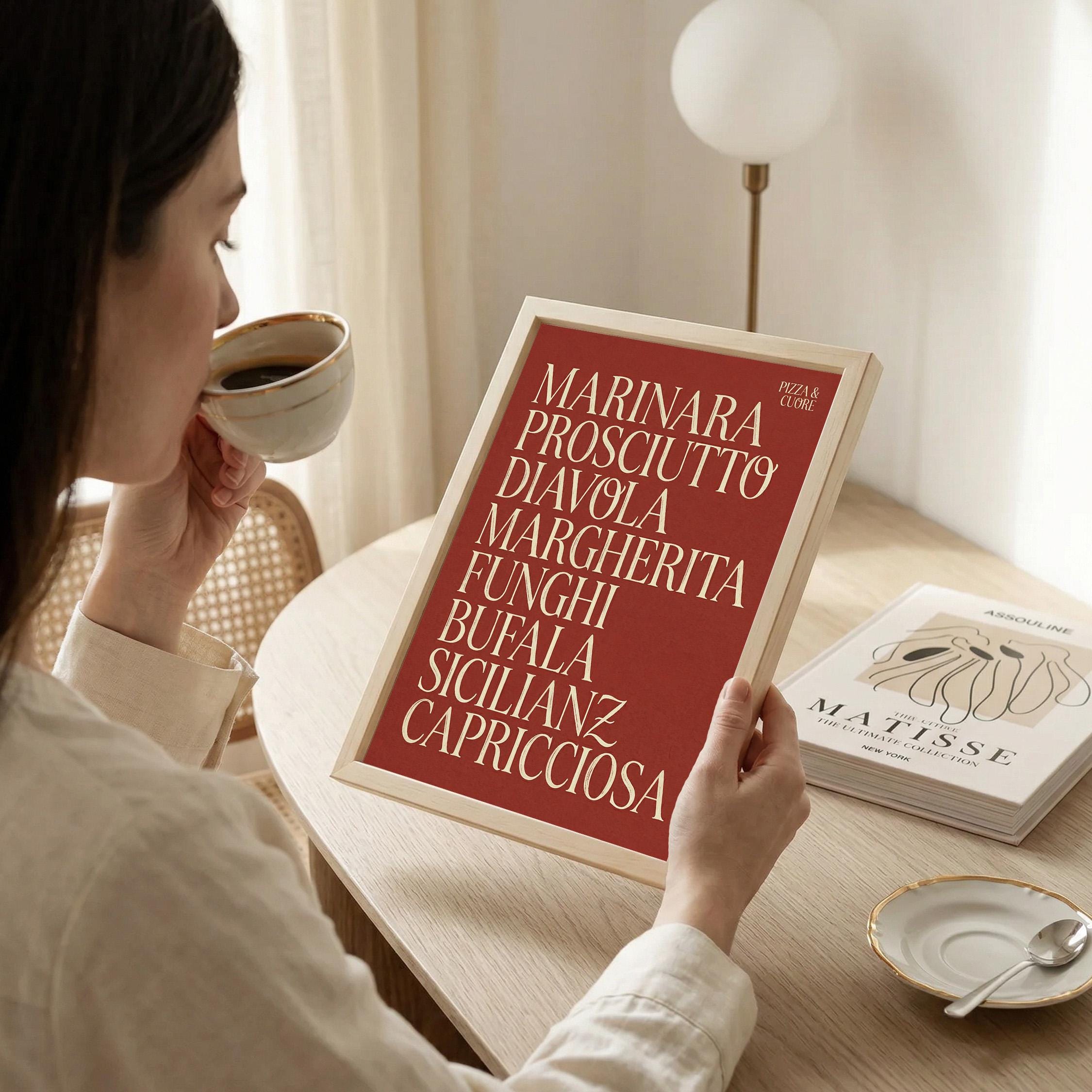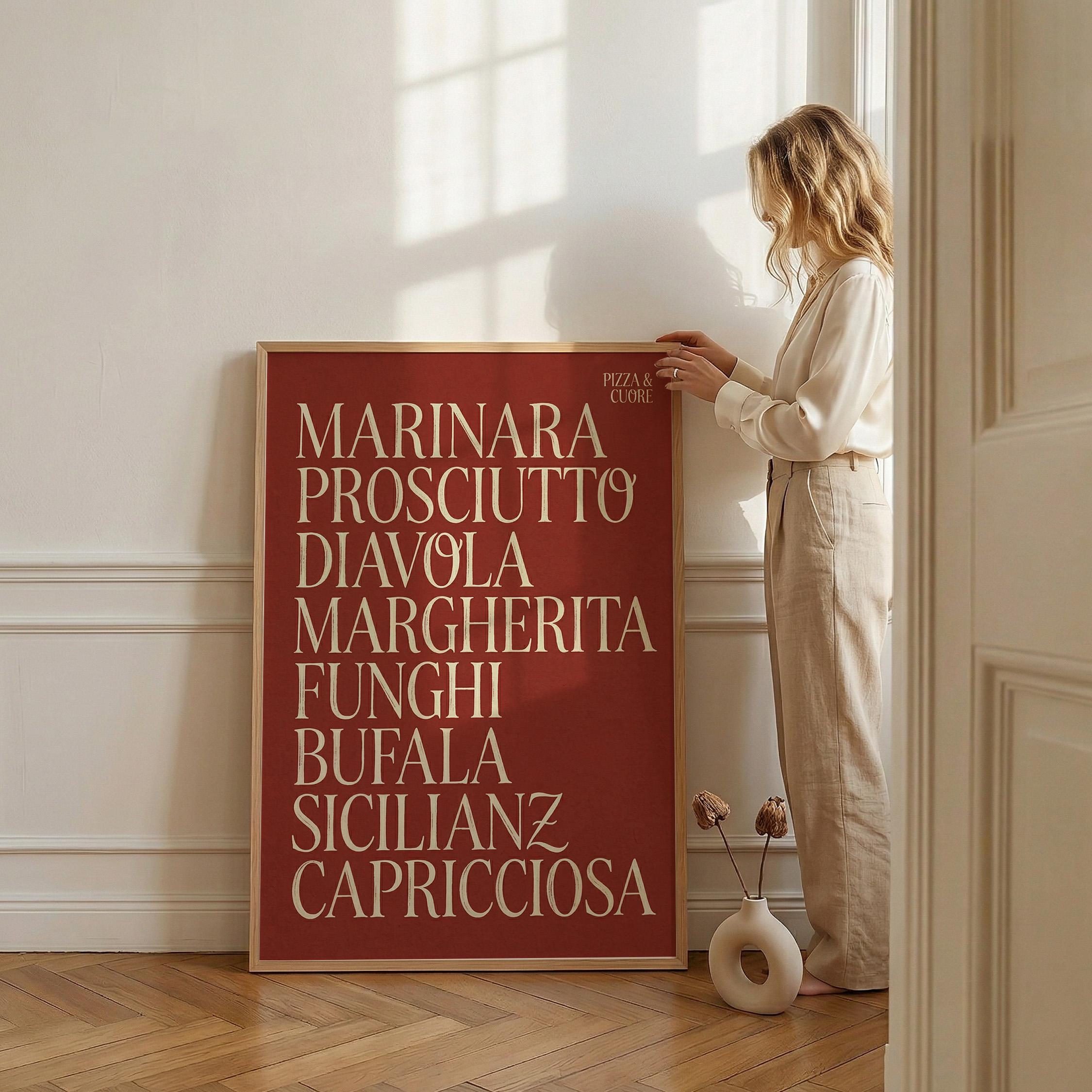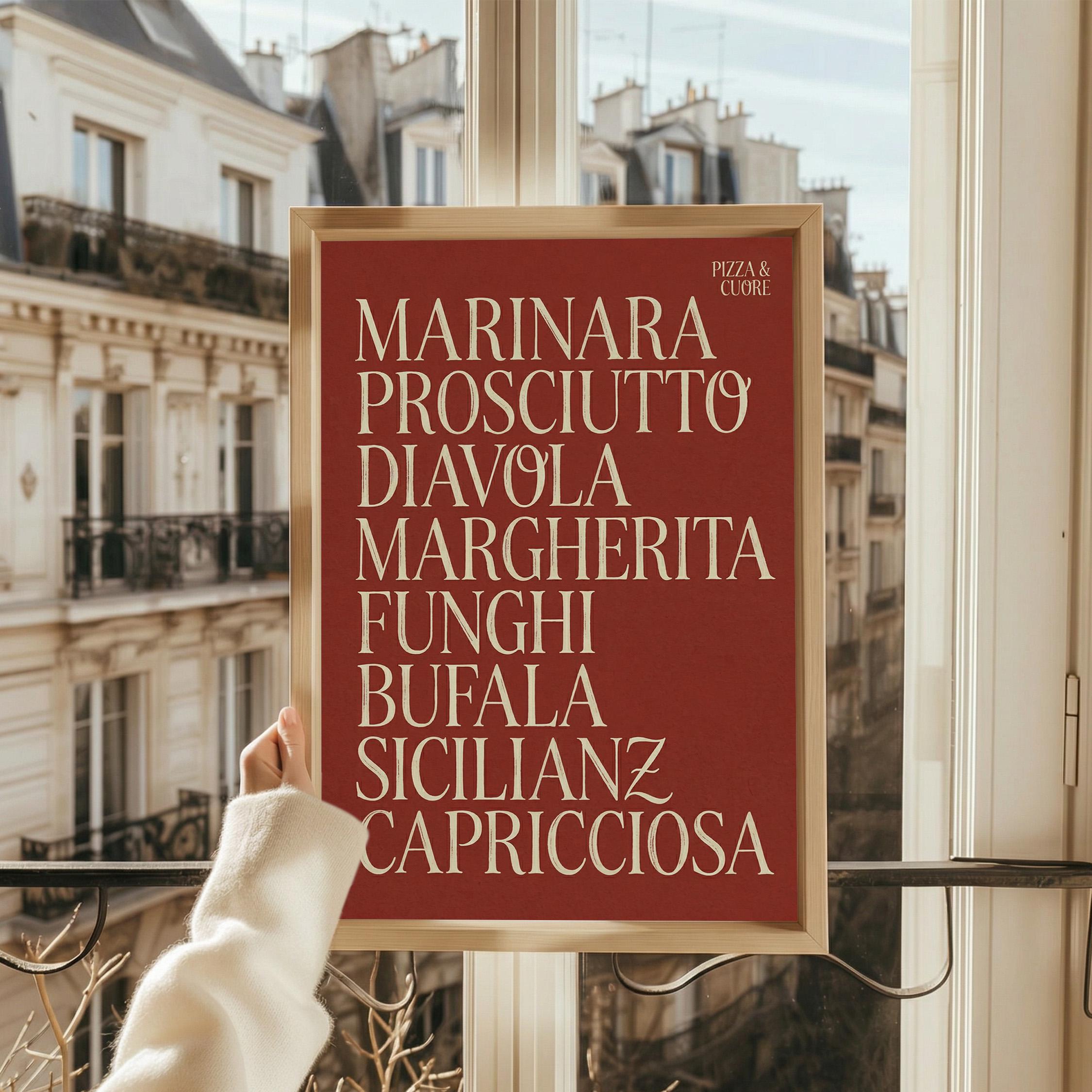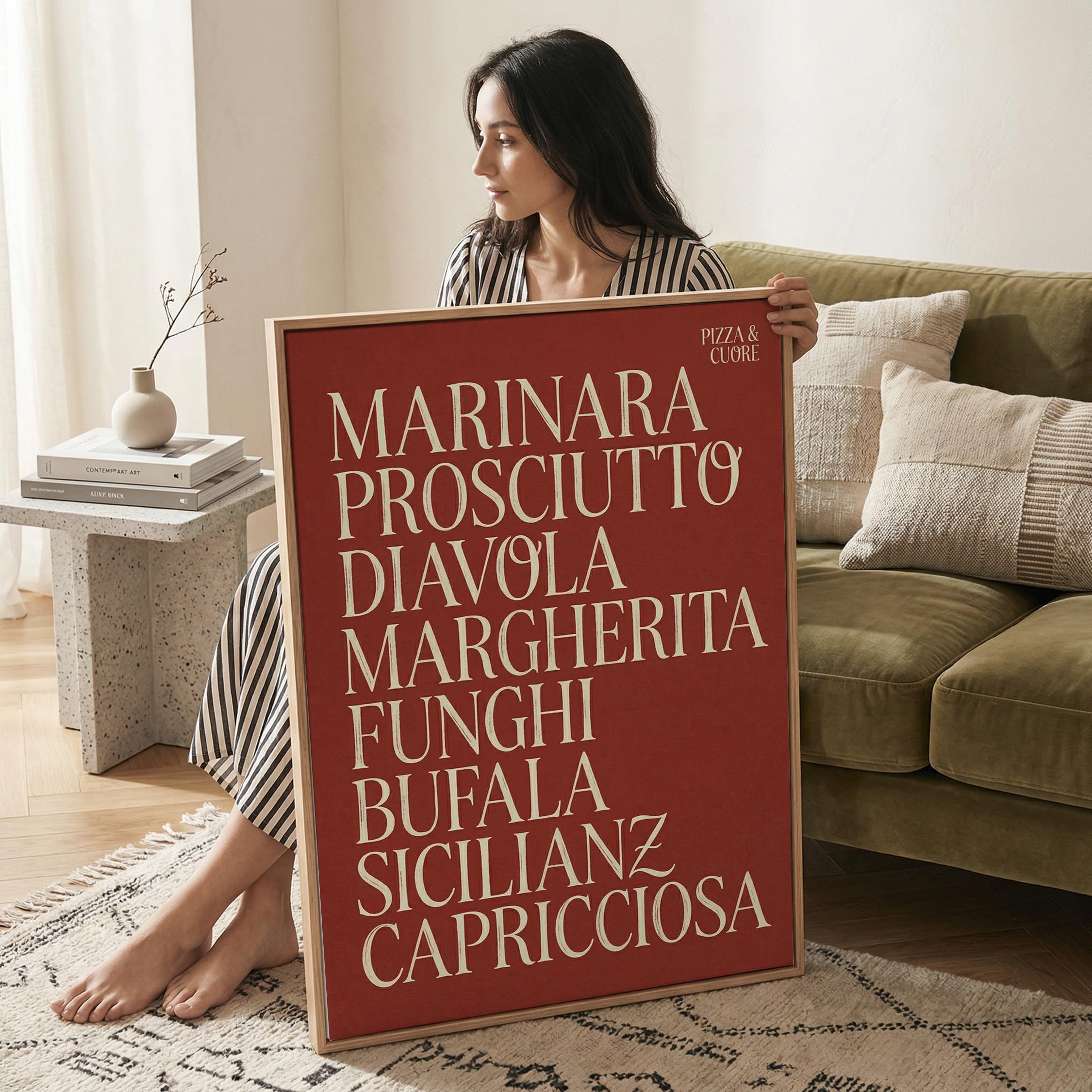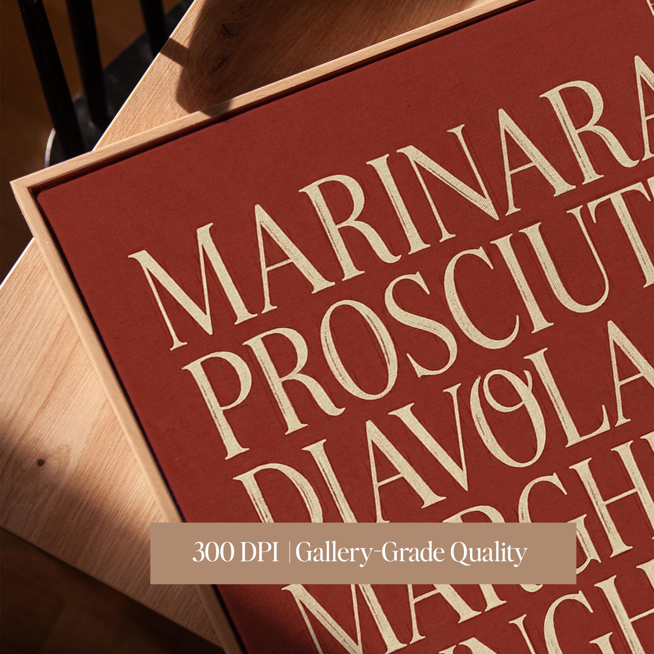 A vintage Italian pizza menu poster inspired by traditional trattoria signage. Warm terracotta tones and elegant serif typography list classic Italian pizzas including Marinara, Prosciutto, Diavola, Margherita, Funghi, Bufala, Sicilian, and Capricciosa. The simple layout and timeless lettering evoke the charm of authentic Italian pizzerias. Perfect for kitchens, dining rooms, cafés, or restaurant spaces that celebrate Italian food culture.
