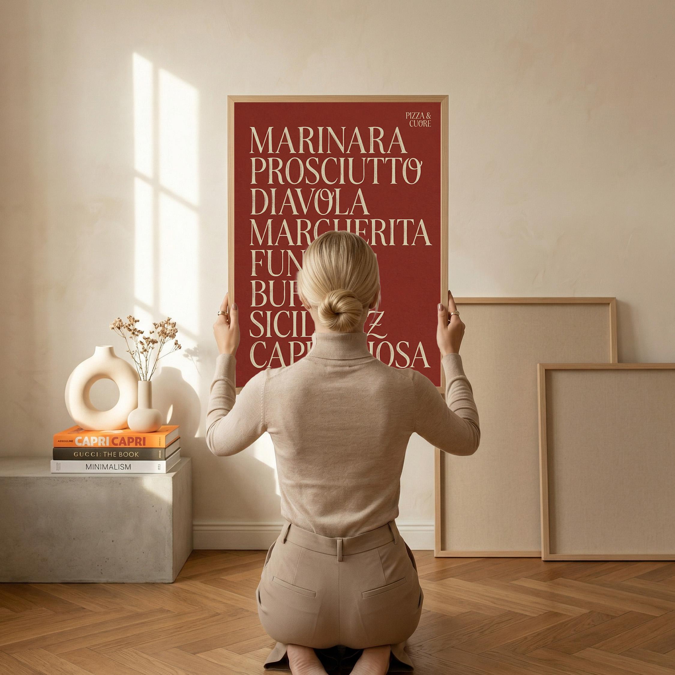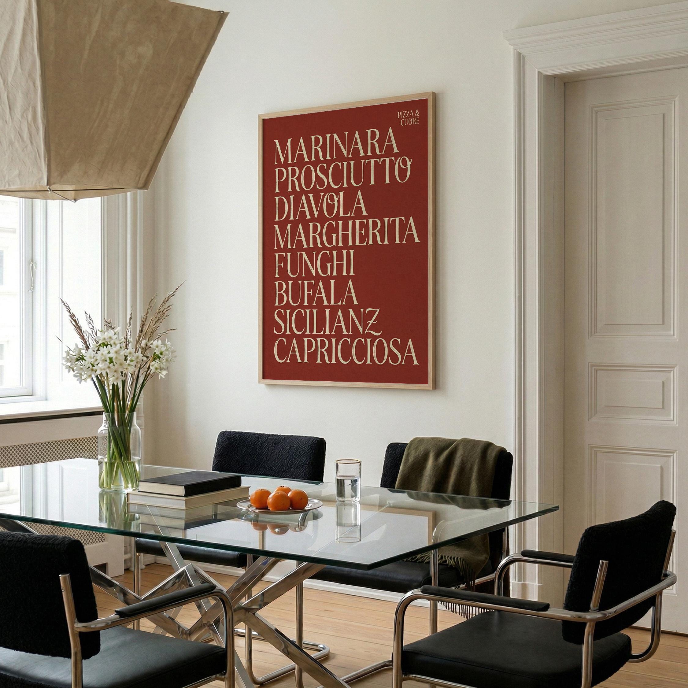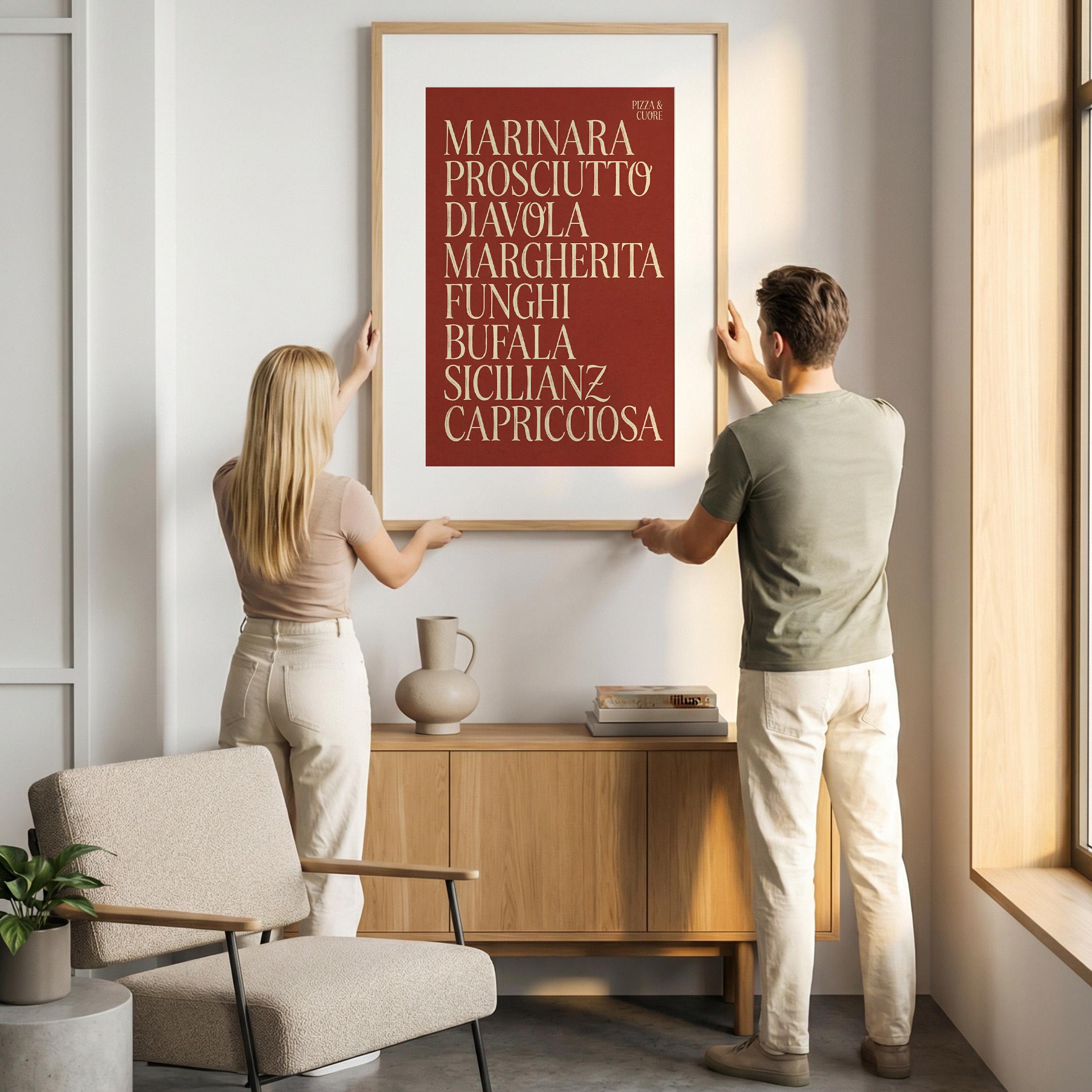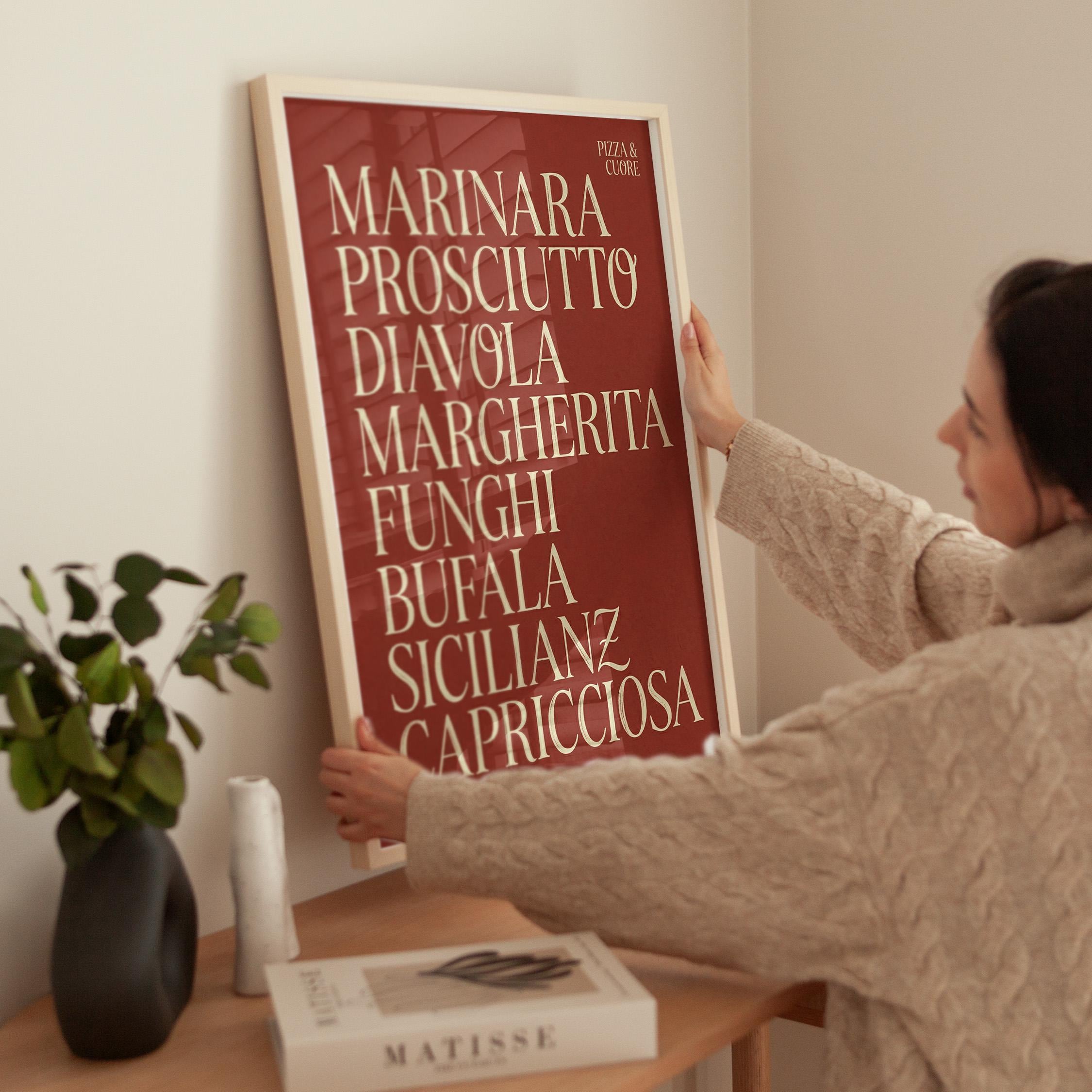 A vintage Italian pizza menu poster inspired by traditional trattoria signage. Warm terracotta tones and elegant serif typography list classic Italian pizzas including Marinara, Prosciutto, Diavola, Margherita, Funghi, Bufala, Sicilian, and Capricciosa. The simple layout and timeless lettering evoke the charm of authentic Italian pizzerias. Perfect for kitchens, dining rooms, cafés, or restaurant spaces that celebrate Italian food culture.
