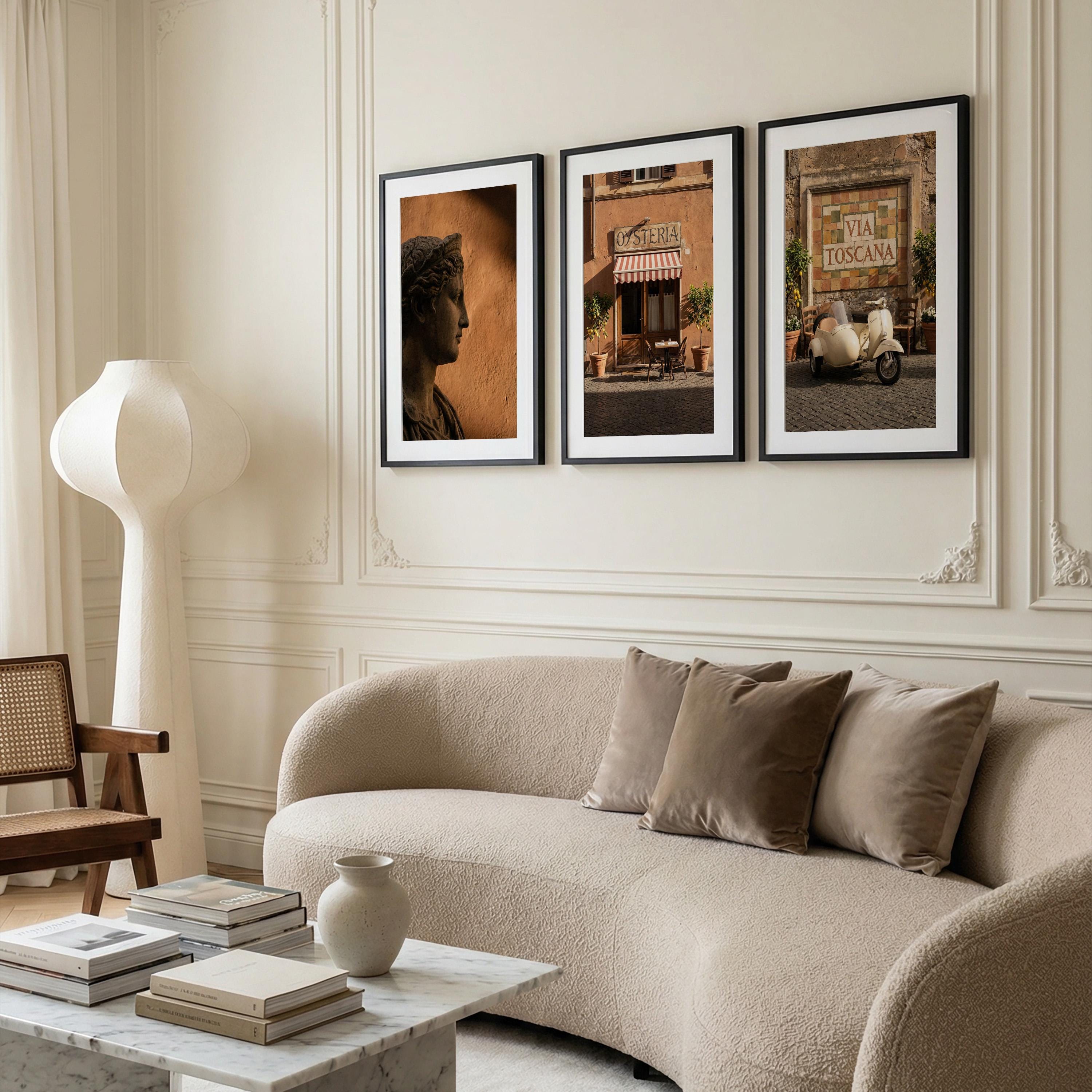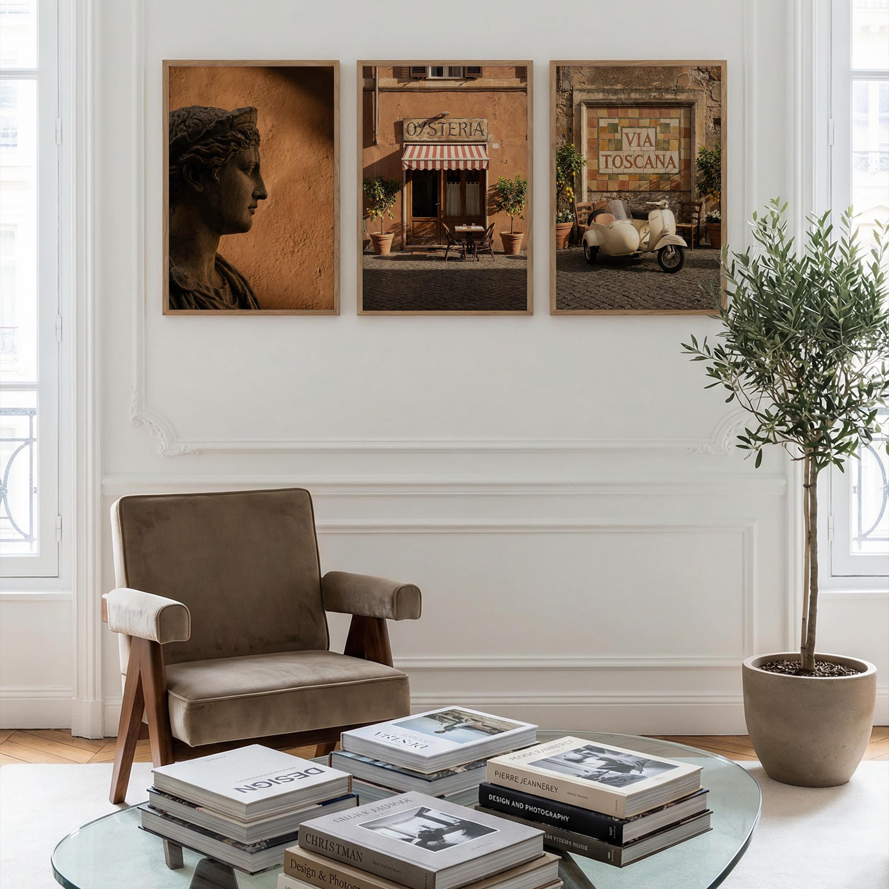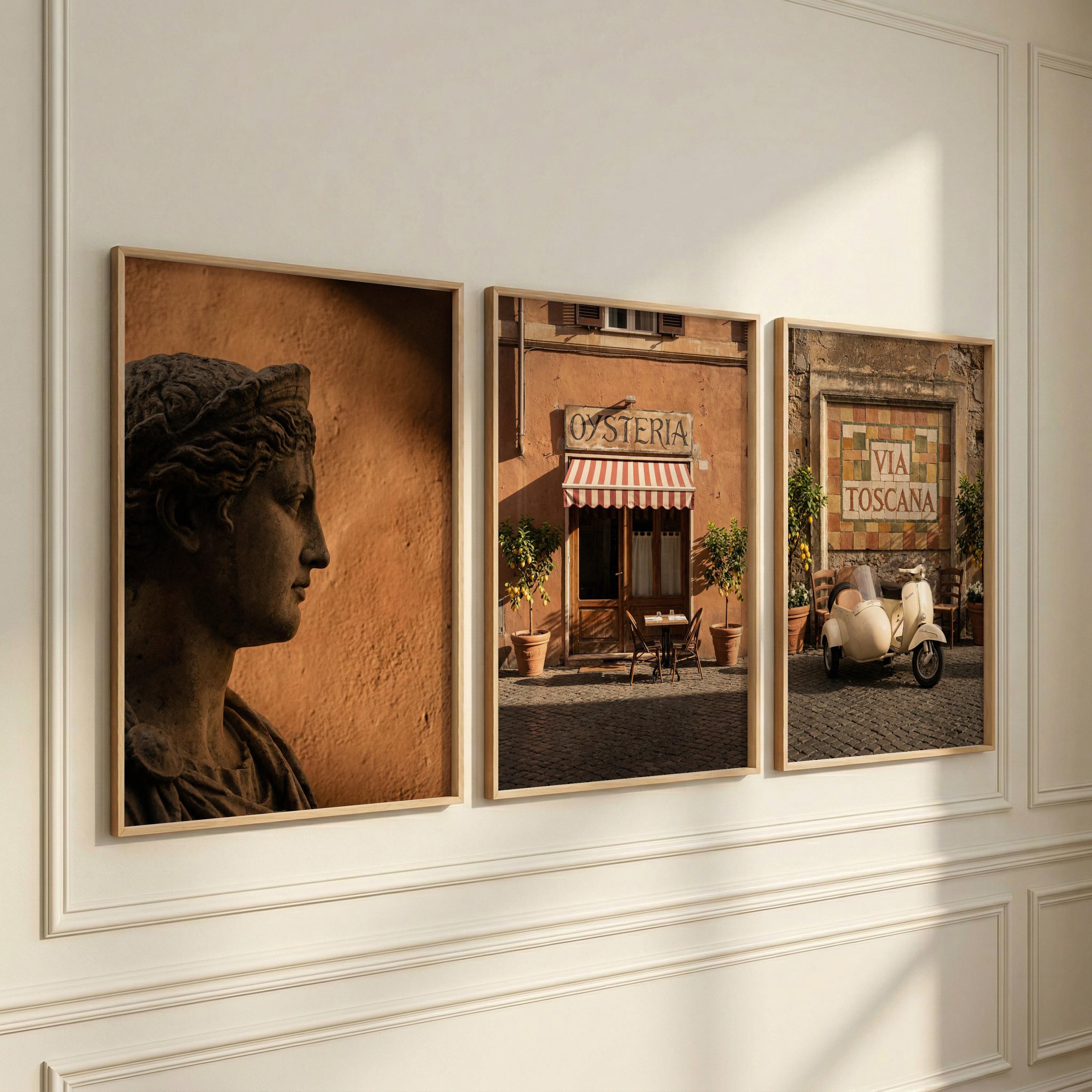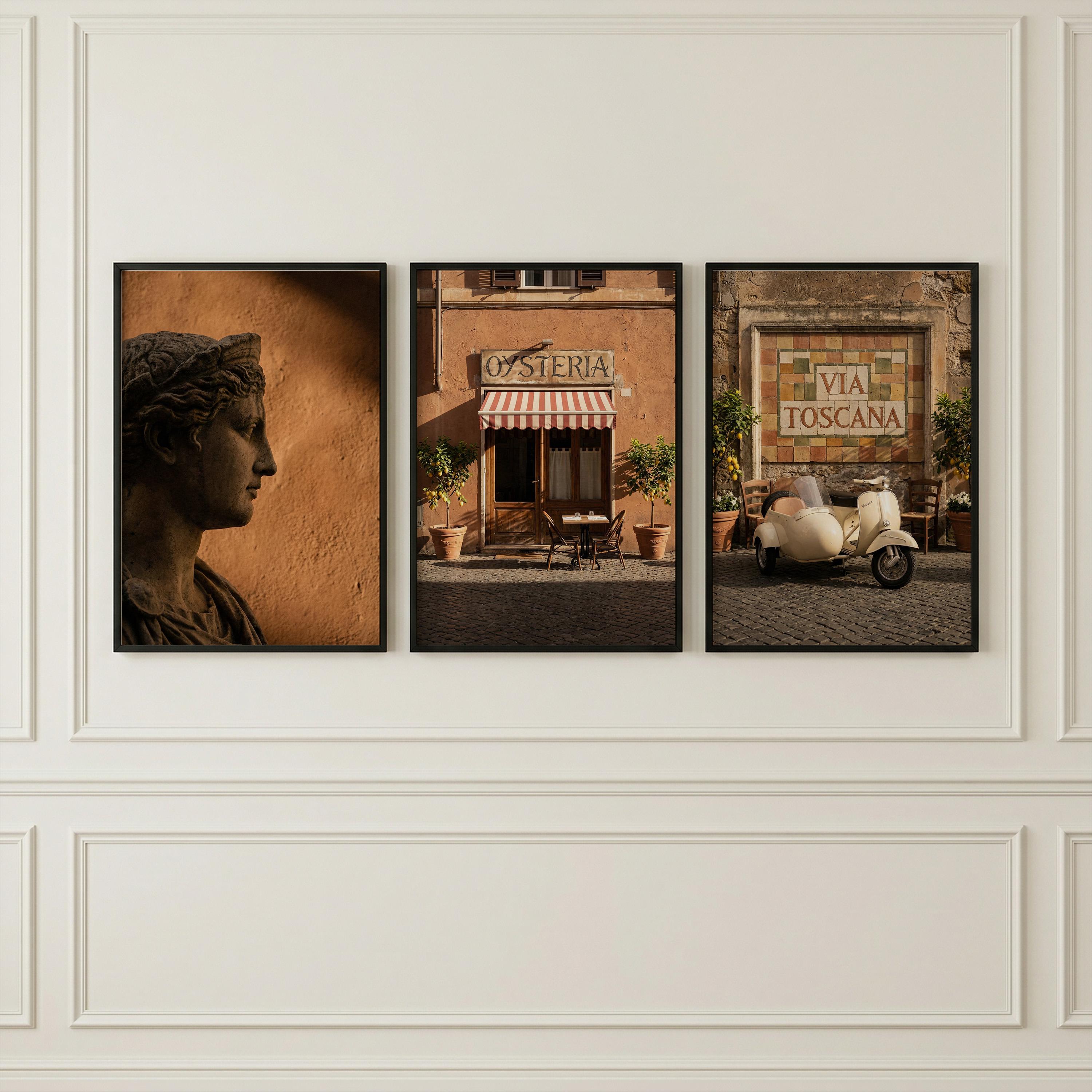 This 3 piece wall art set captures the atmosphere of sunlit Italian streets and warm Tuscan architecture. The trio features a classical statue portrait, a charming Italian osteria storefront, and a rustic Via Toscana street scene with a vintage scooter.