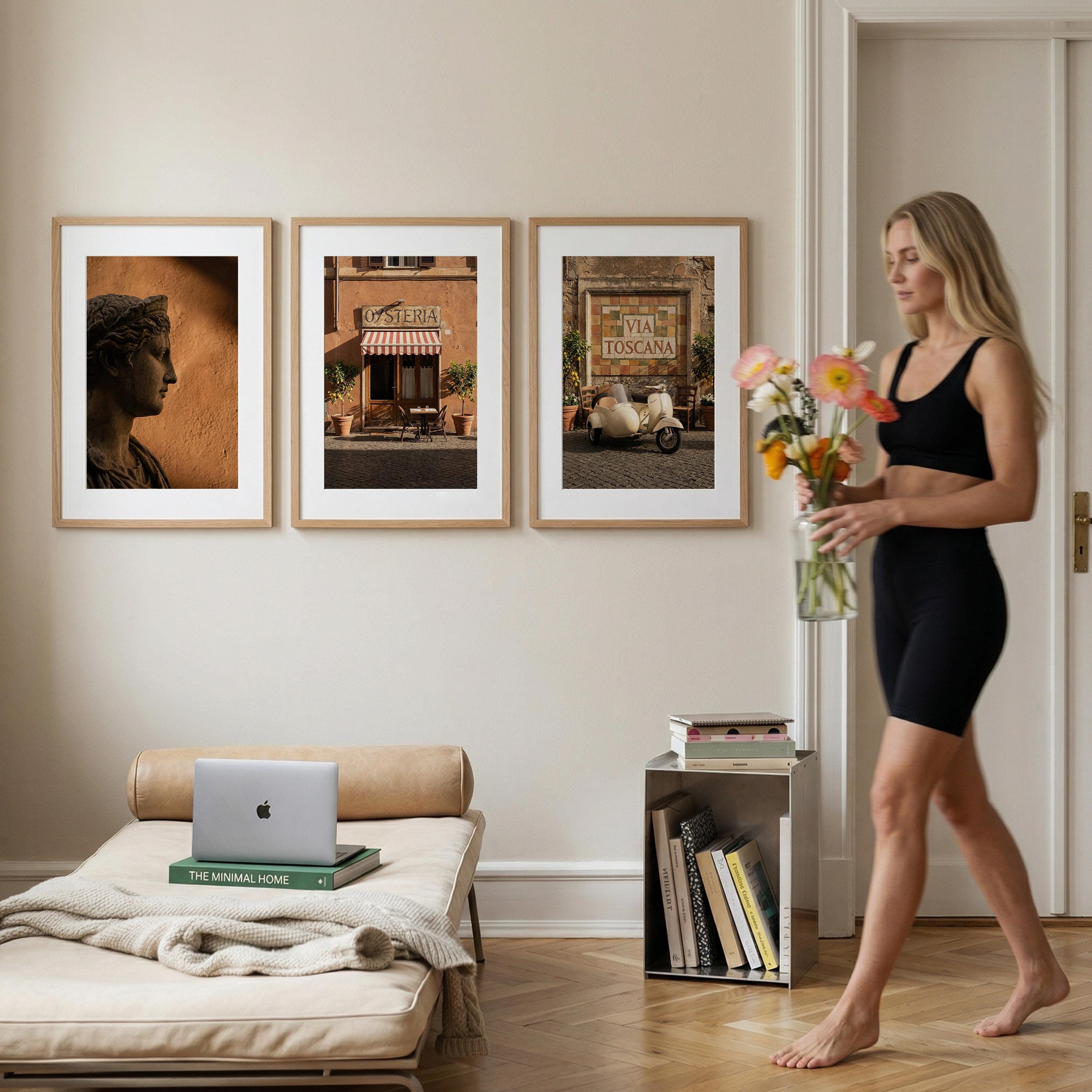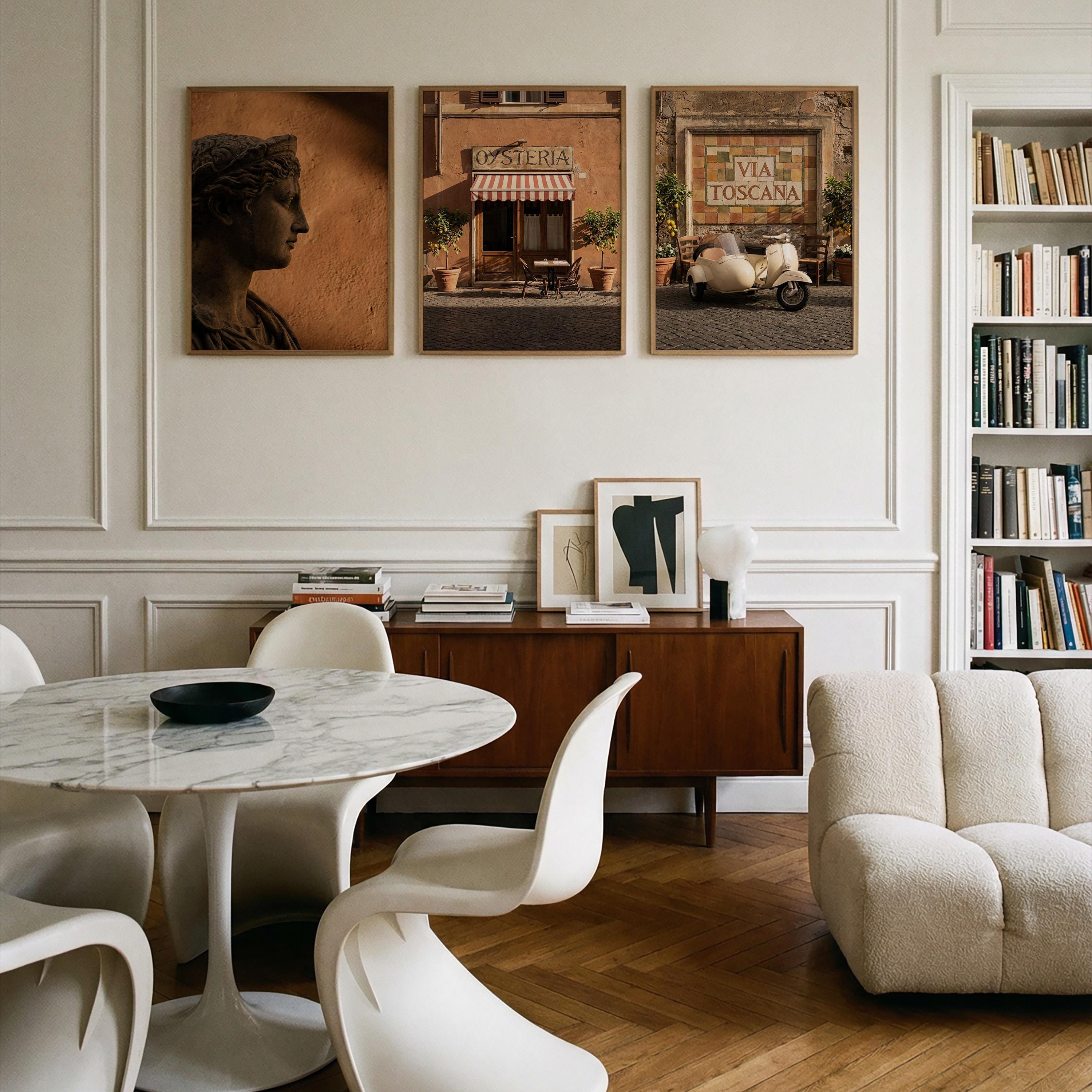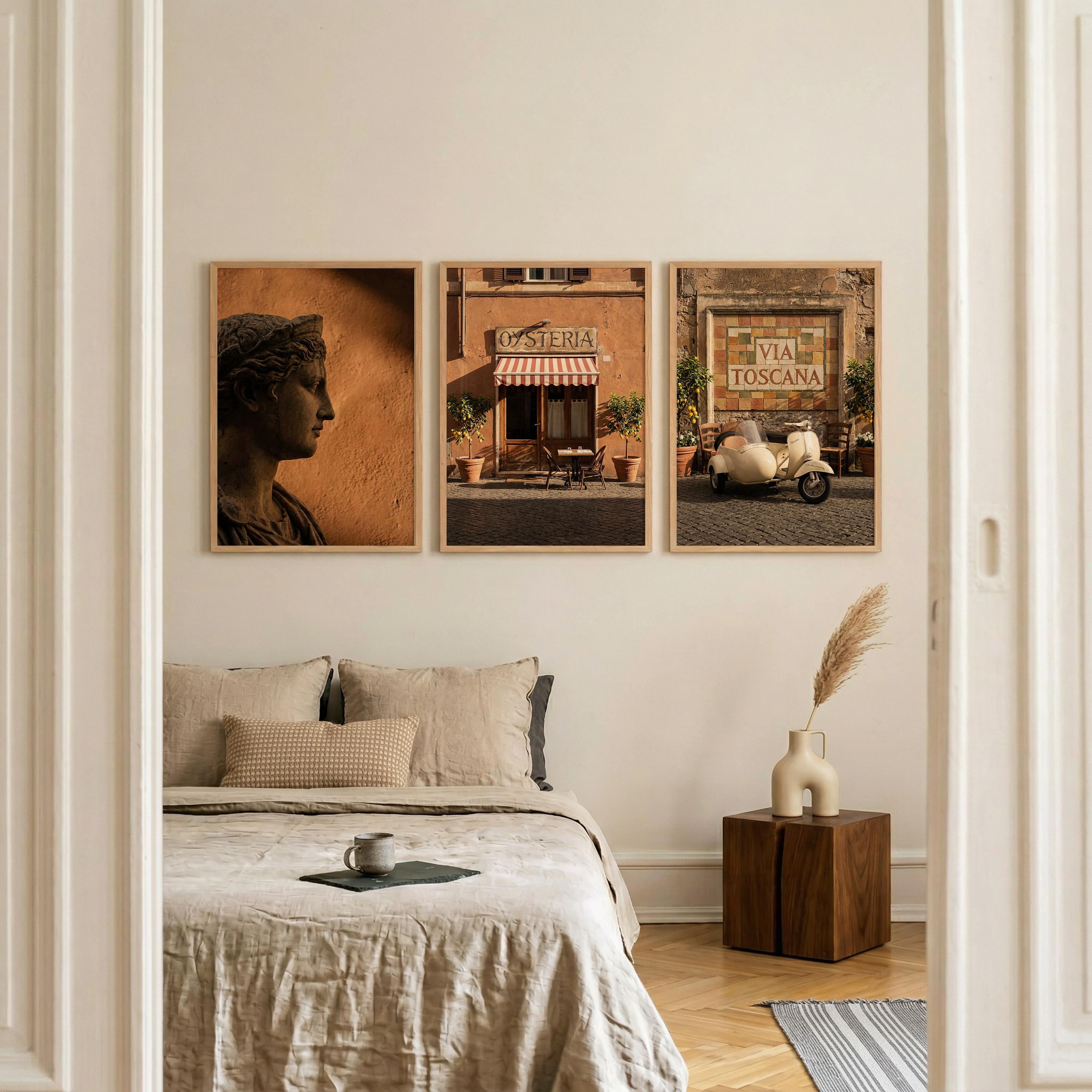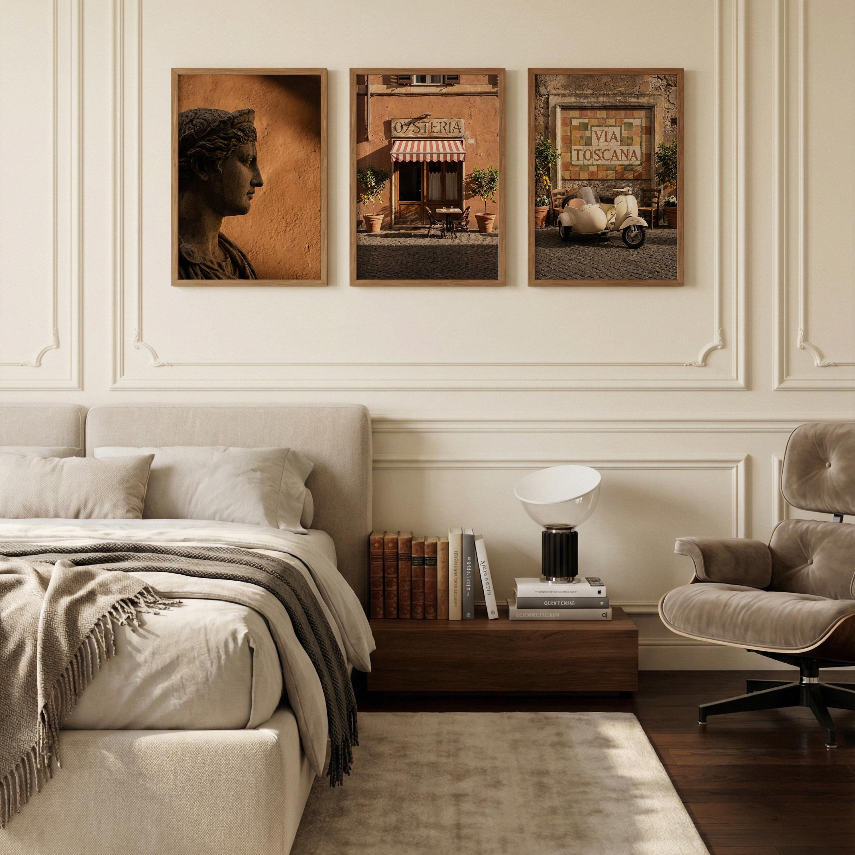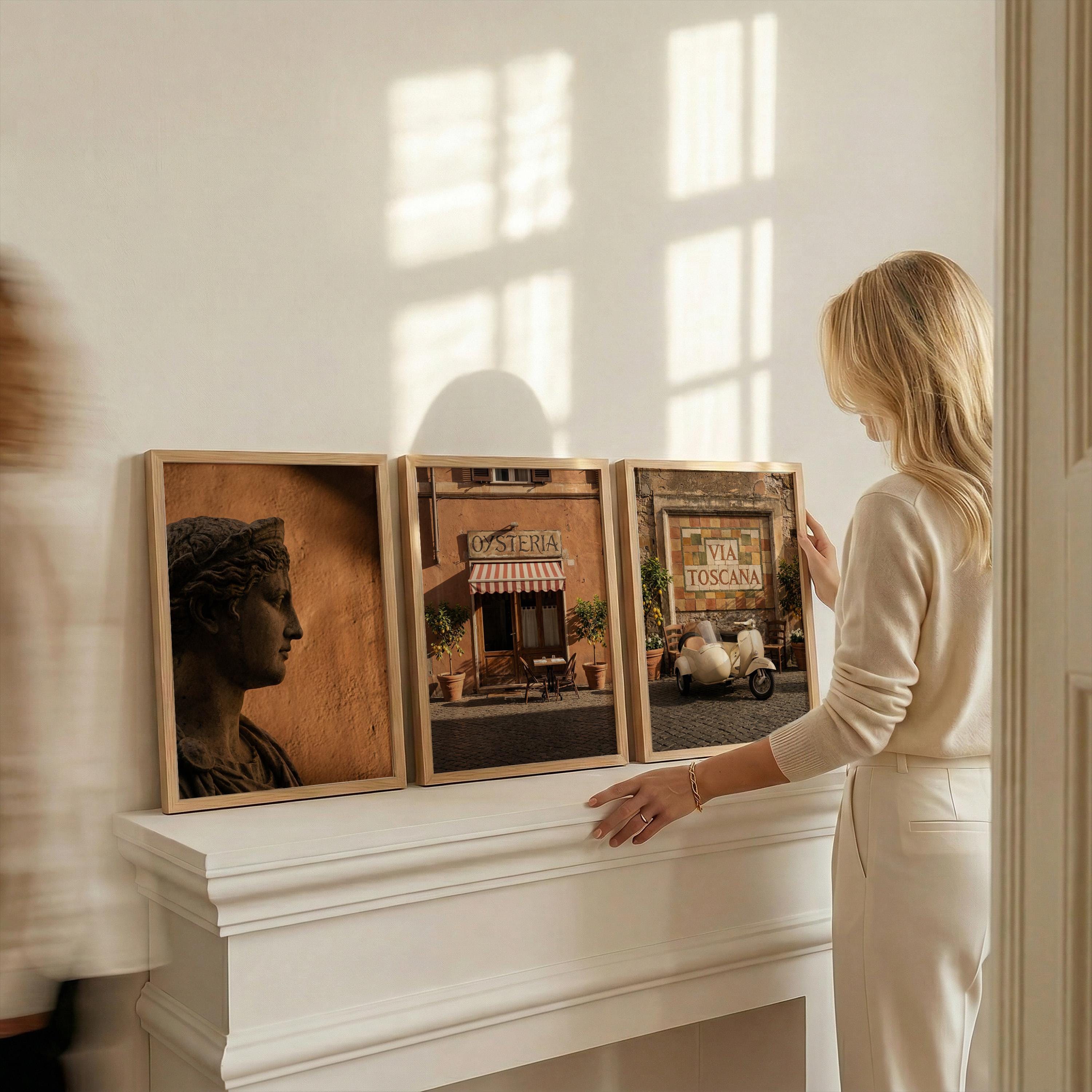 This 3 piece wall art set captures the atmosphere of sunlit Italian streets and warm Tuscan architecture. The trio features a classical statue portrait, a charming Italian osteria storefront, and a rustic Via Toscana street scene with a vintage scooter.