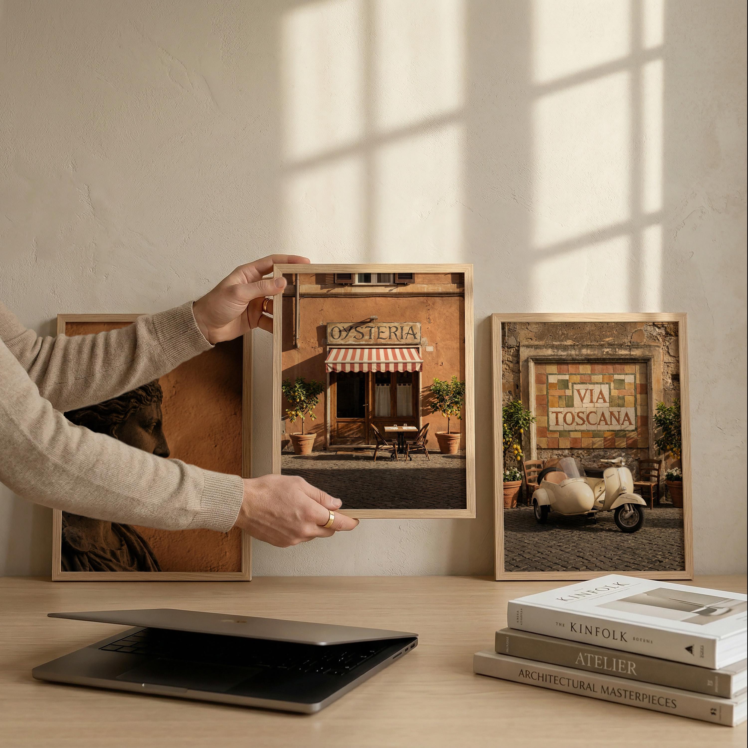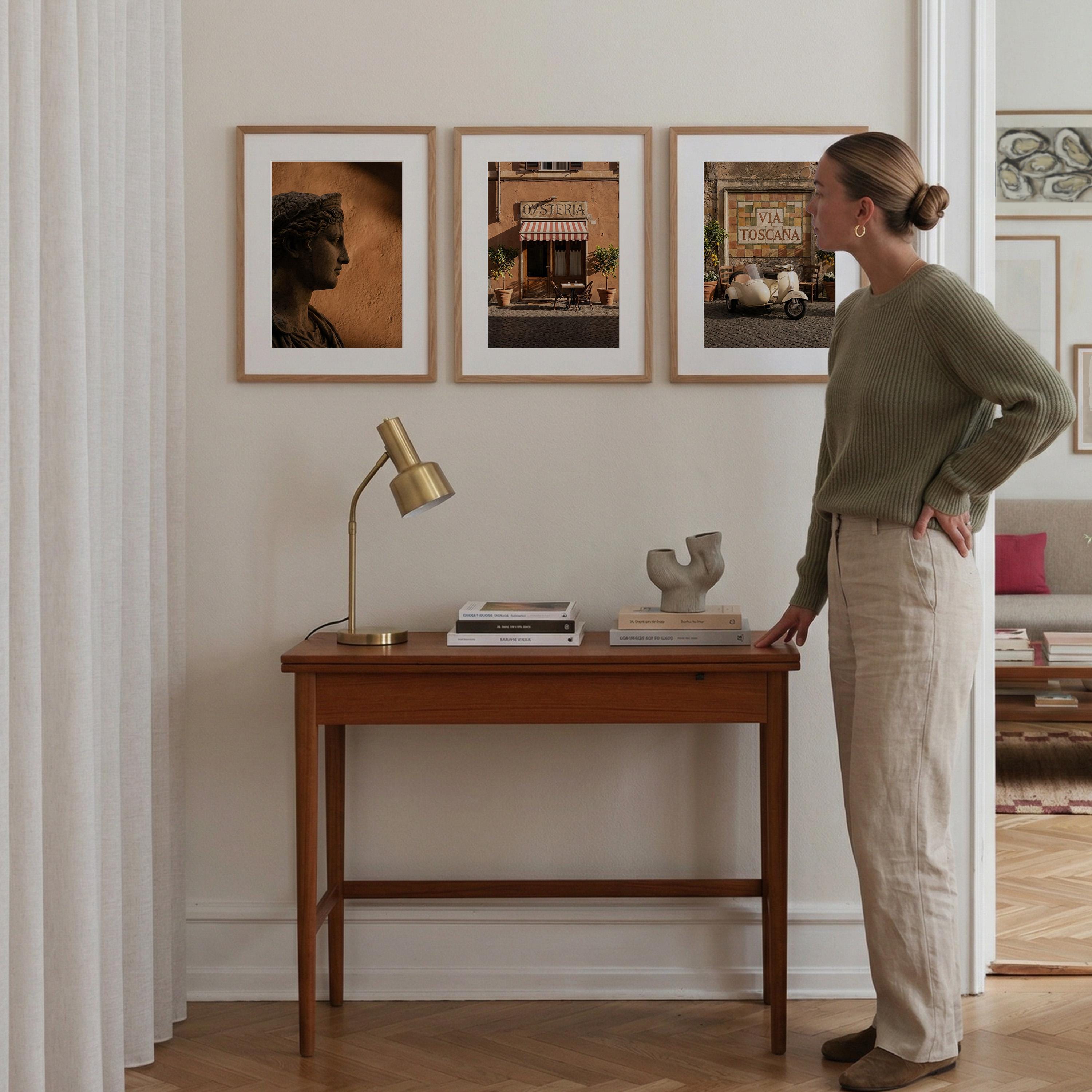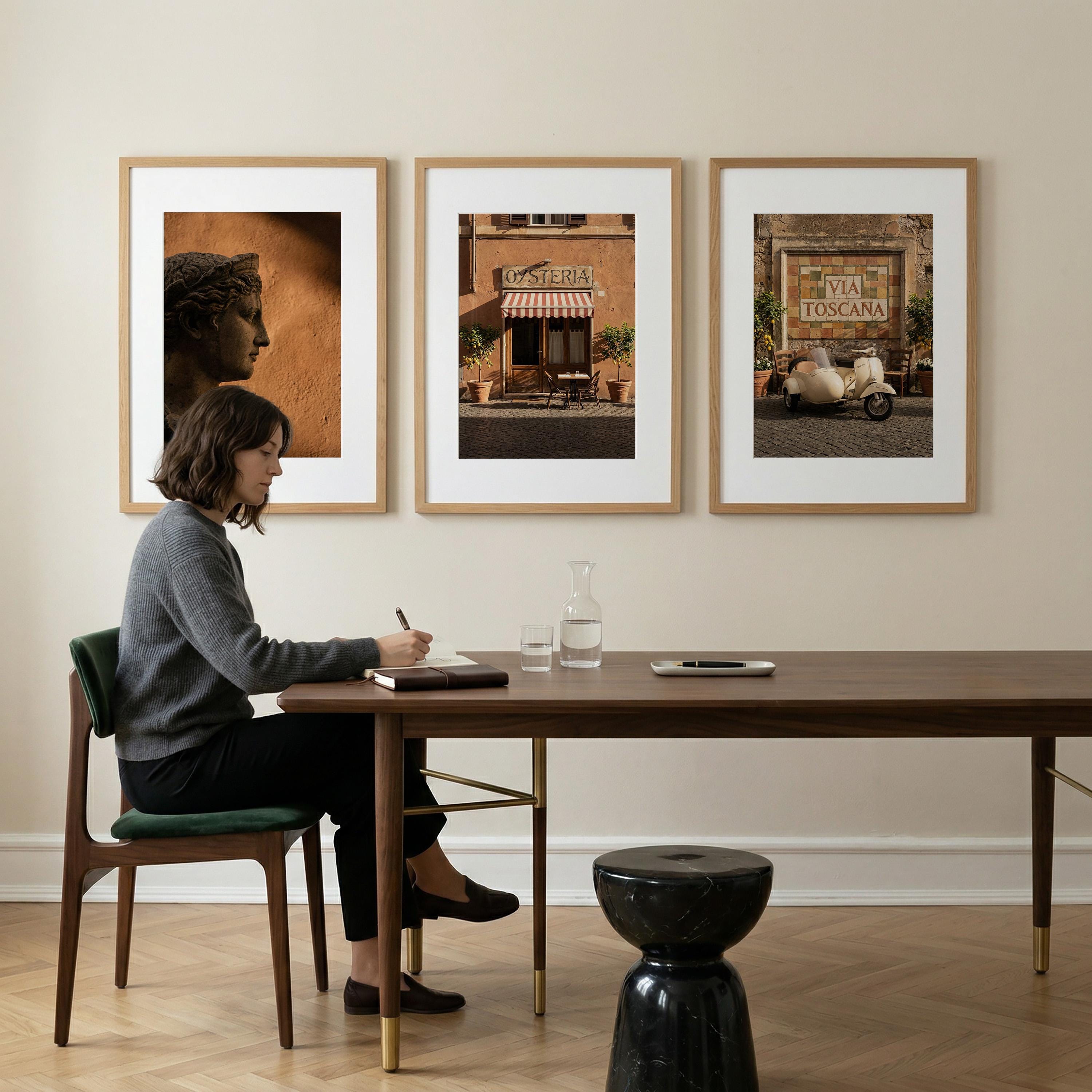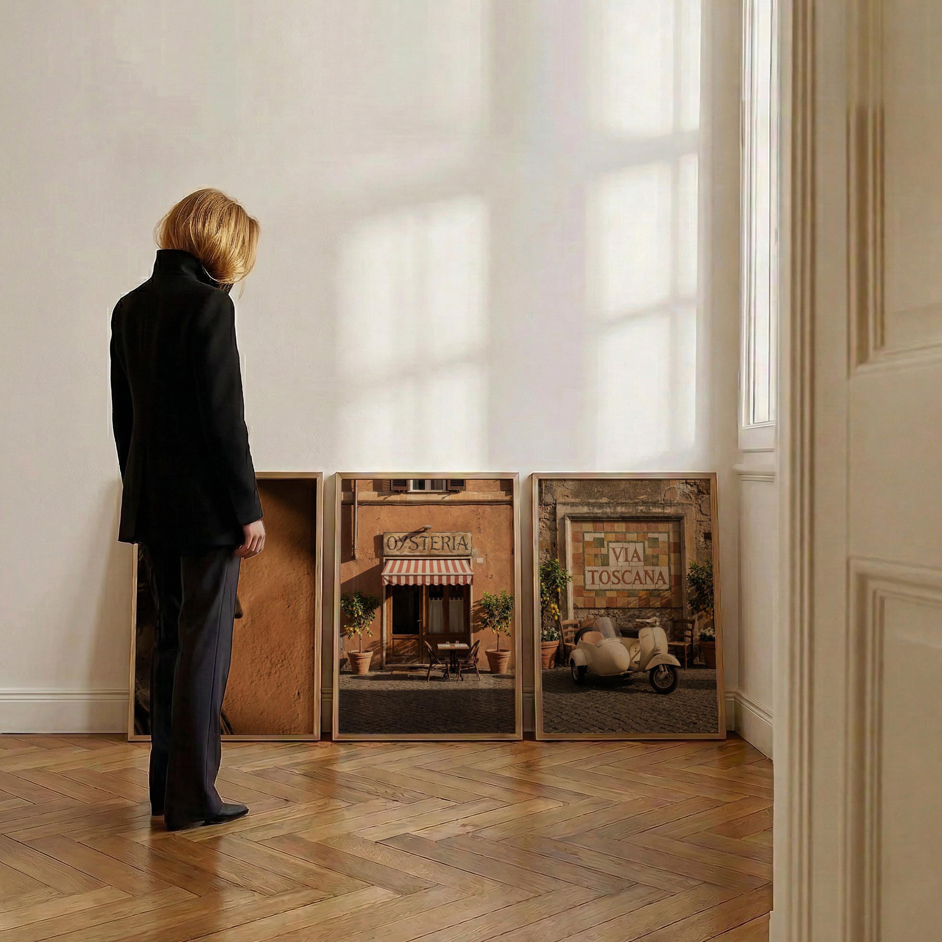This 3 piece wall art set captures the atmosphere of sunlit Italian streets and warm Tuscan architecture. The trio features a classical statue portrait, a charming Italian osteria storefront, and a rustic Via Toscana street scene with a vintage scooter.