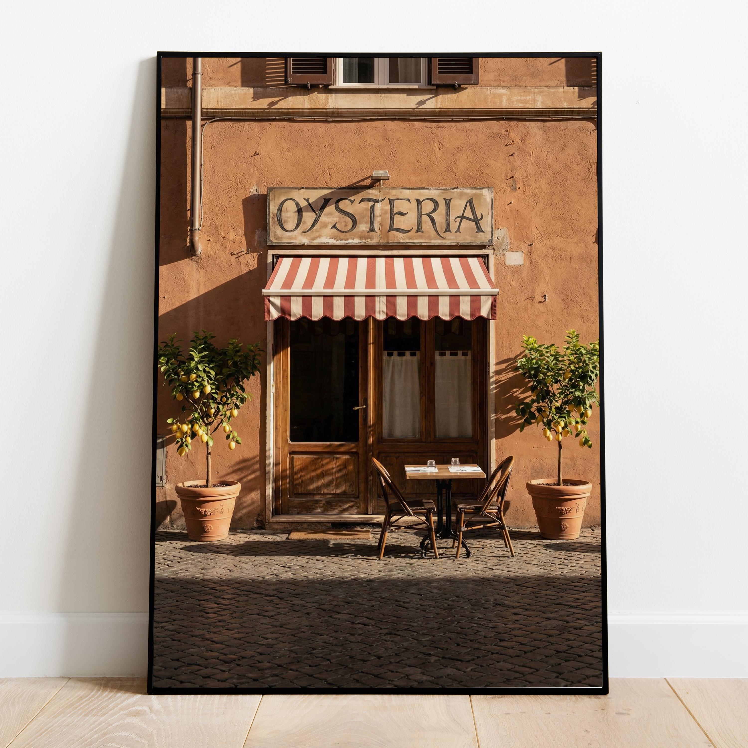 Together these prints create a balanced Mediterranean gallery wall inspired by travel, café culture, and historic European streets. Terracotta tones, citrus trees, striped awnings, and textured stone walls give the set a warm and timeless character.