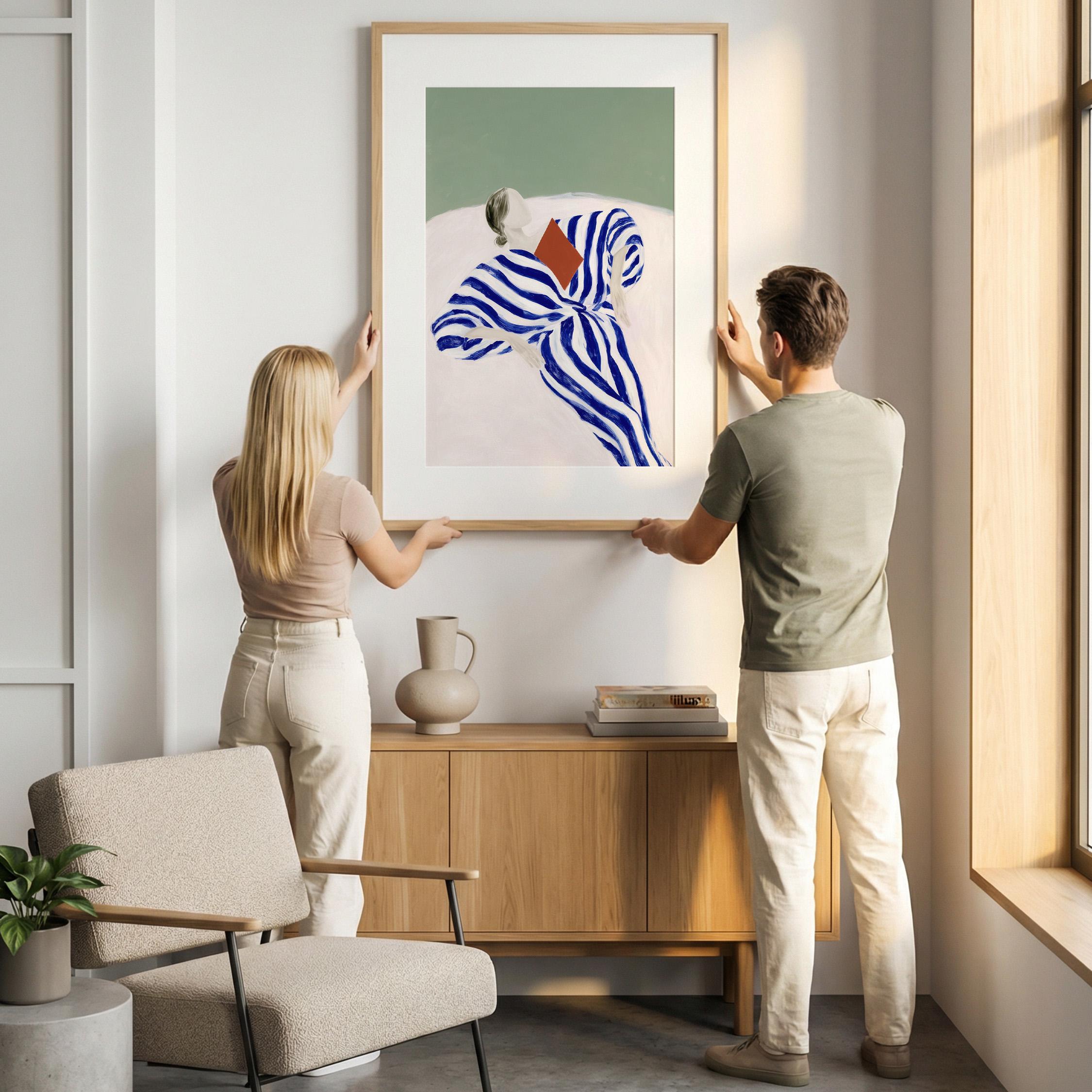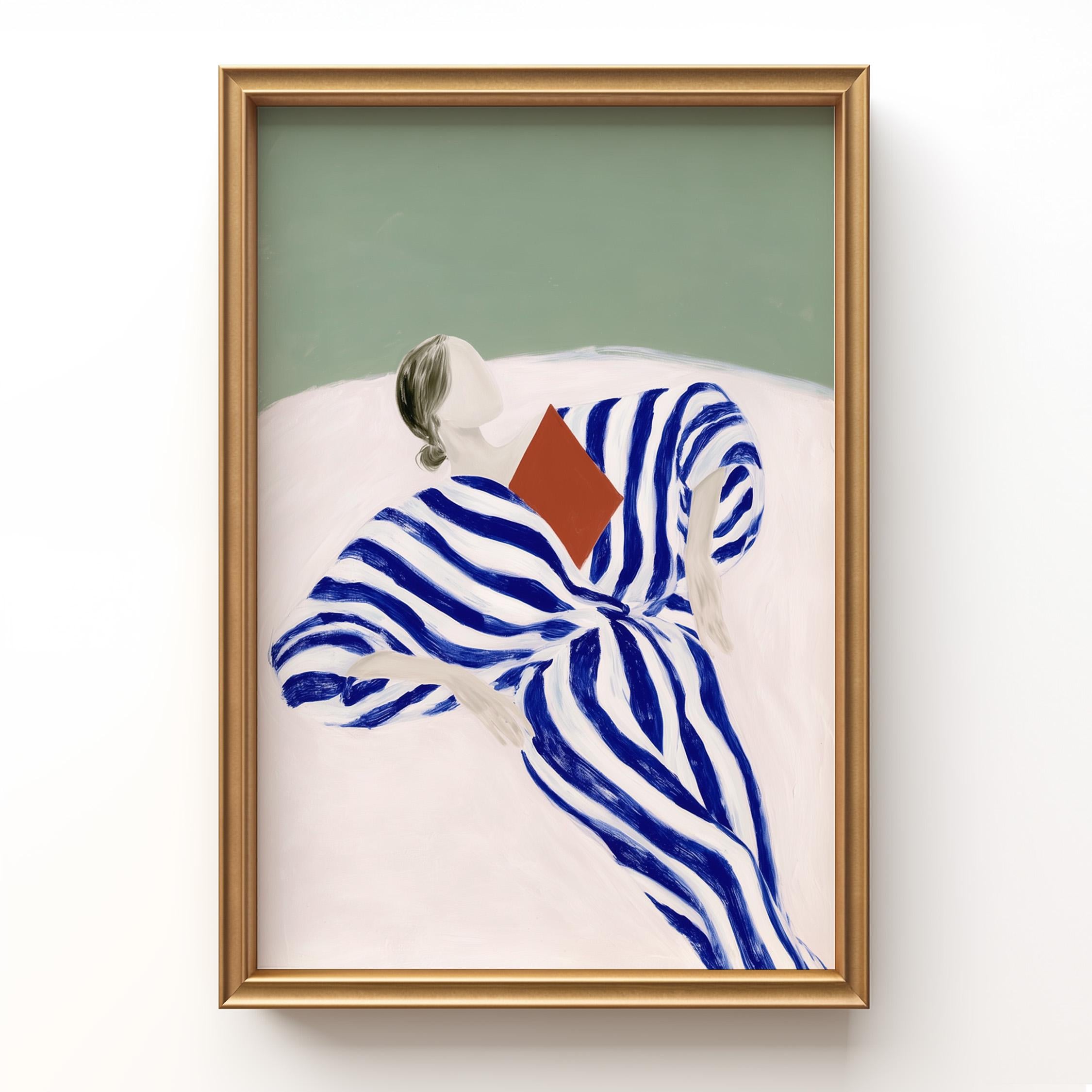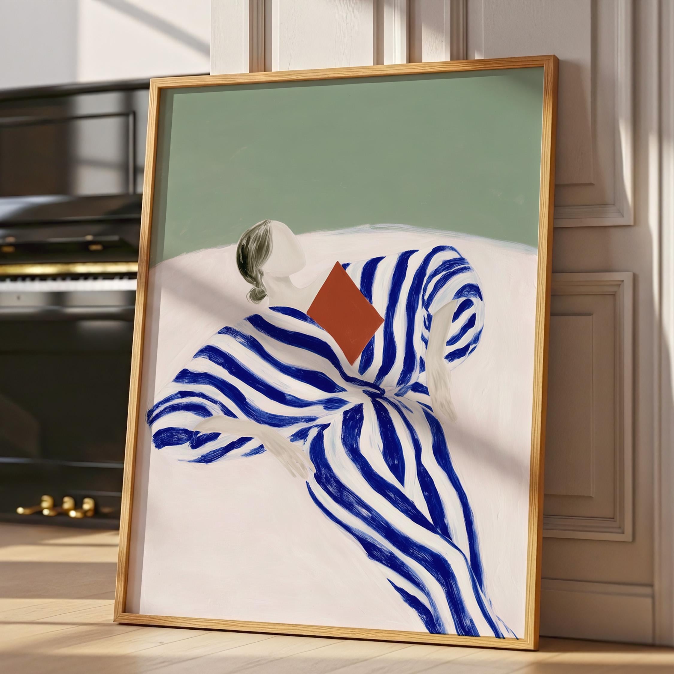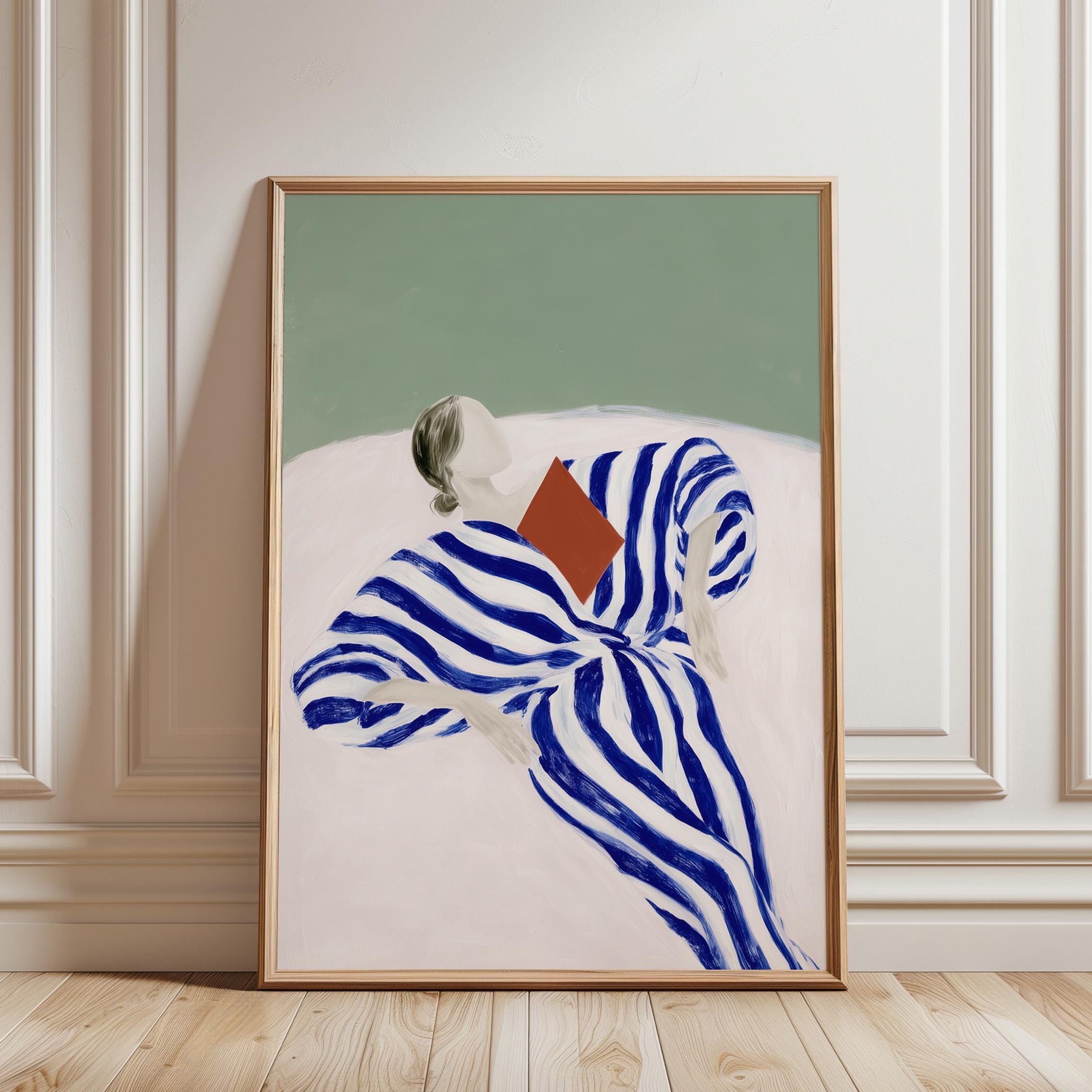 Minimalist woman reading wall art featuring a relaxed figure wrapped in a flowing blue striped dress. The bold painterly stripes create movement and contrast against the soft green background, giving the piece a calm yet graphic presence.