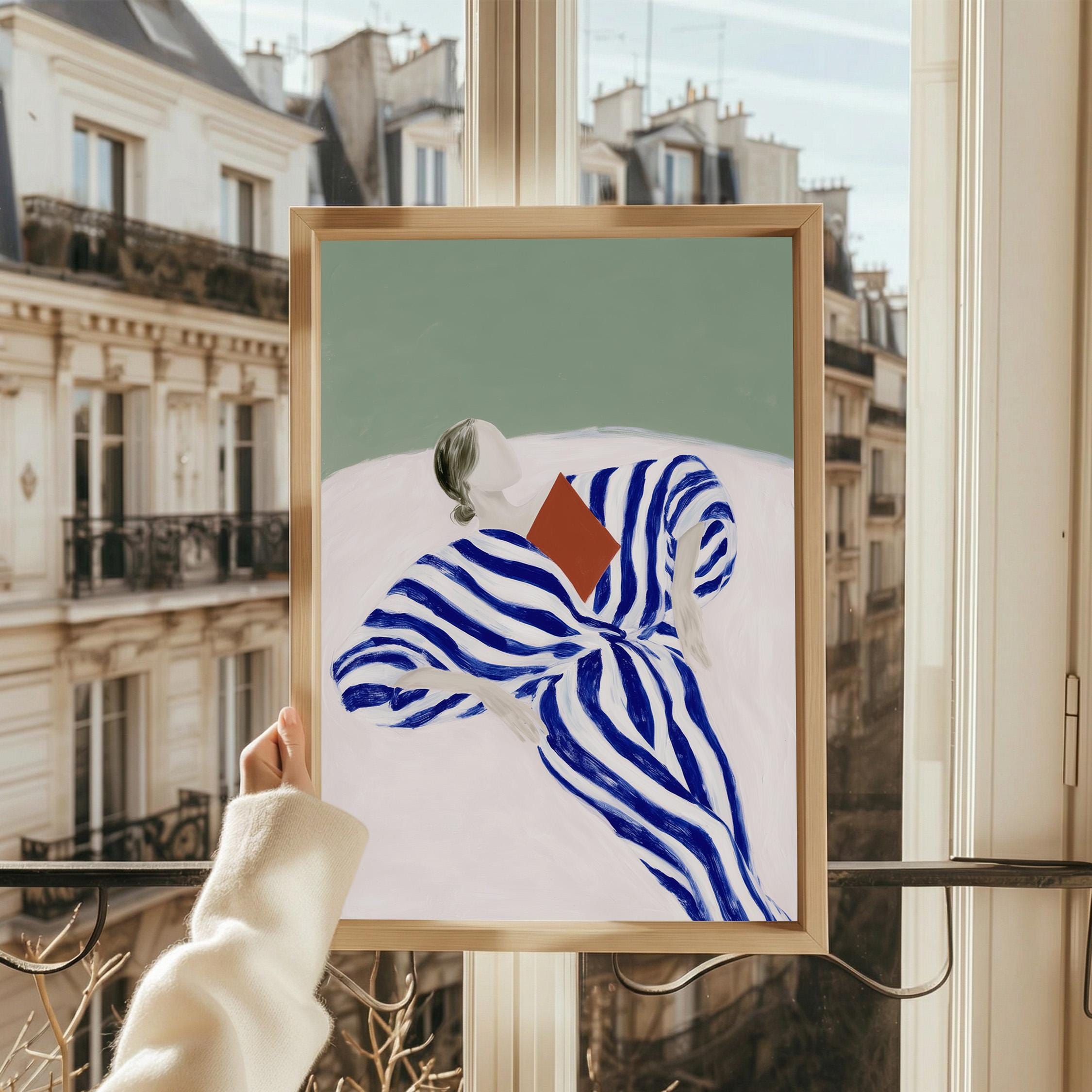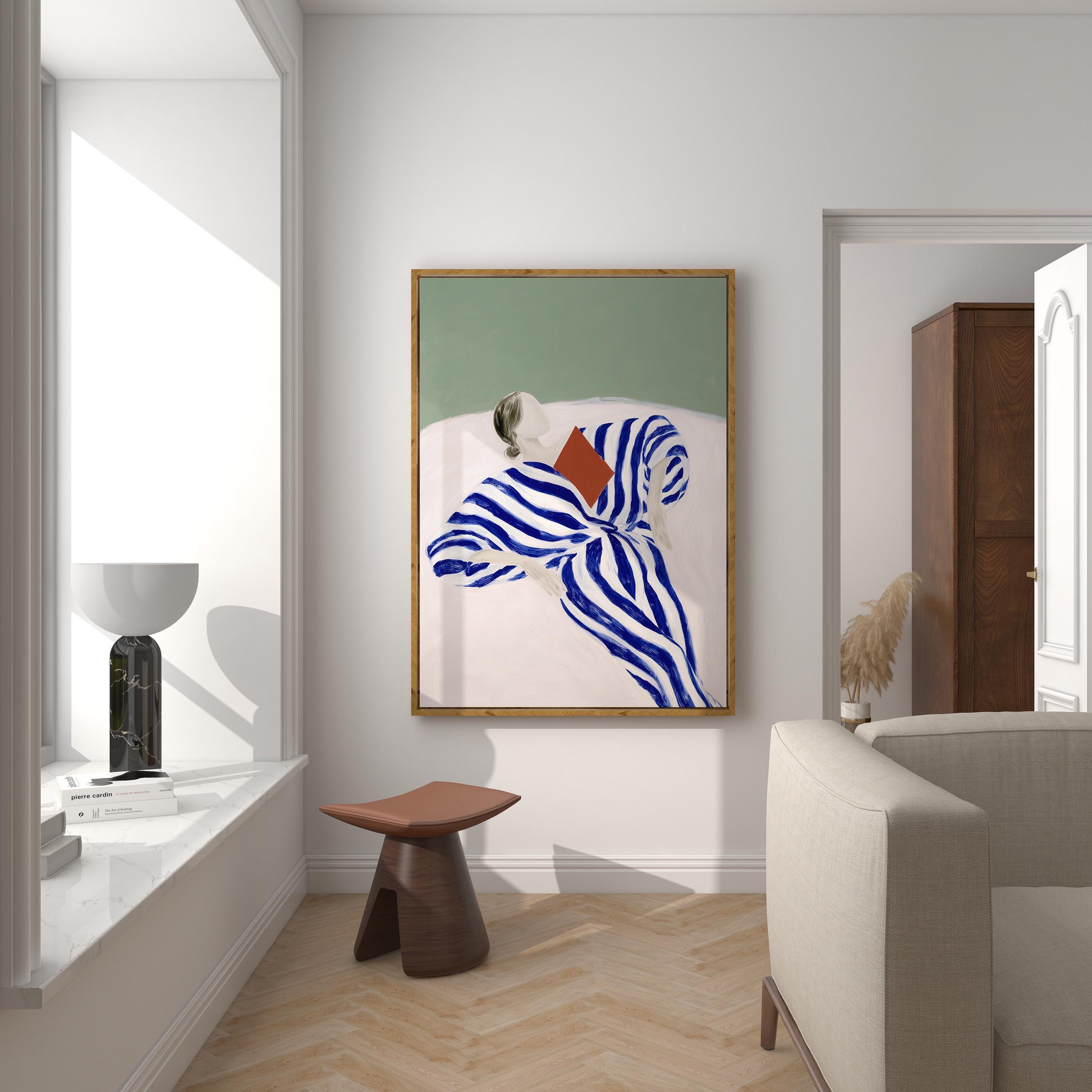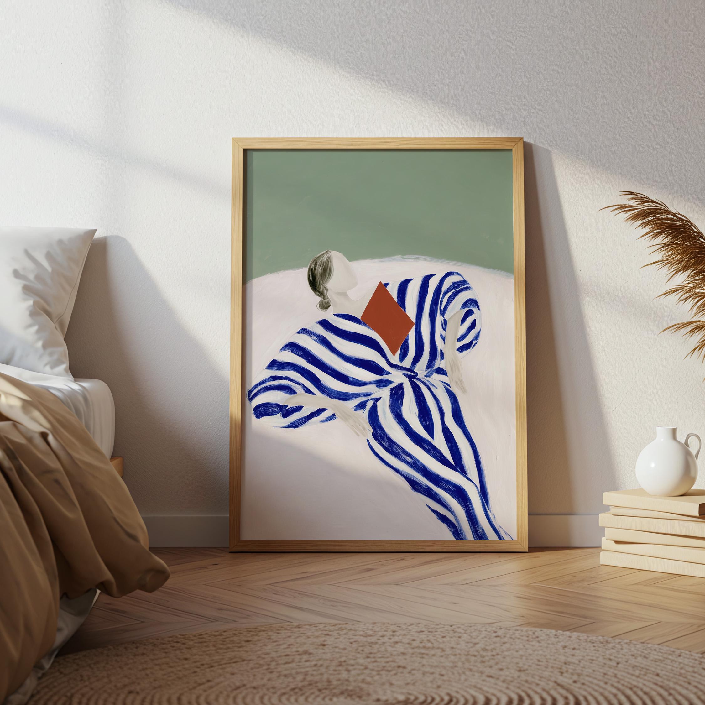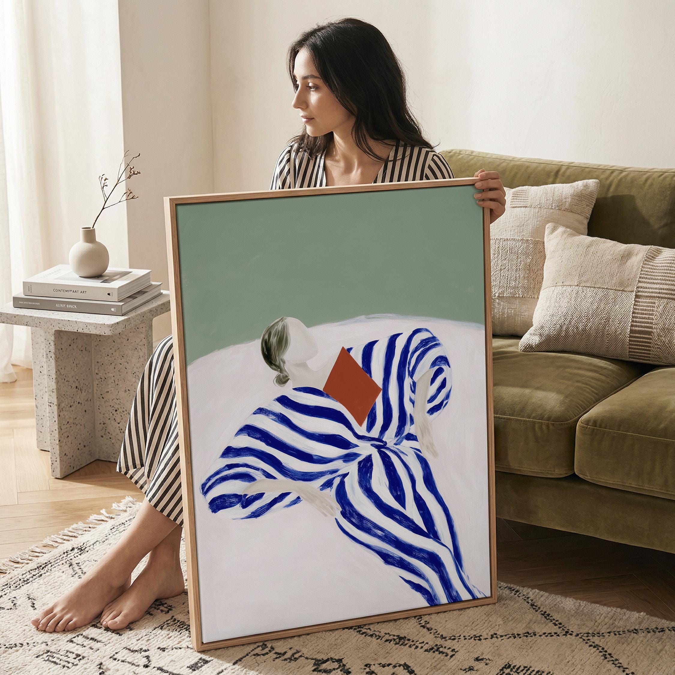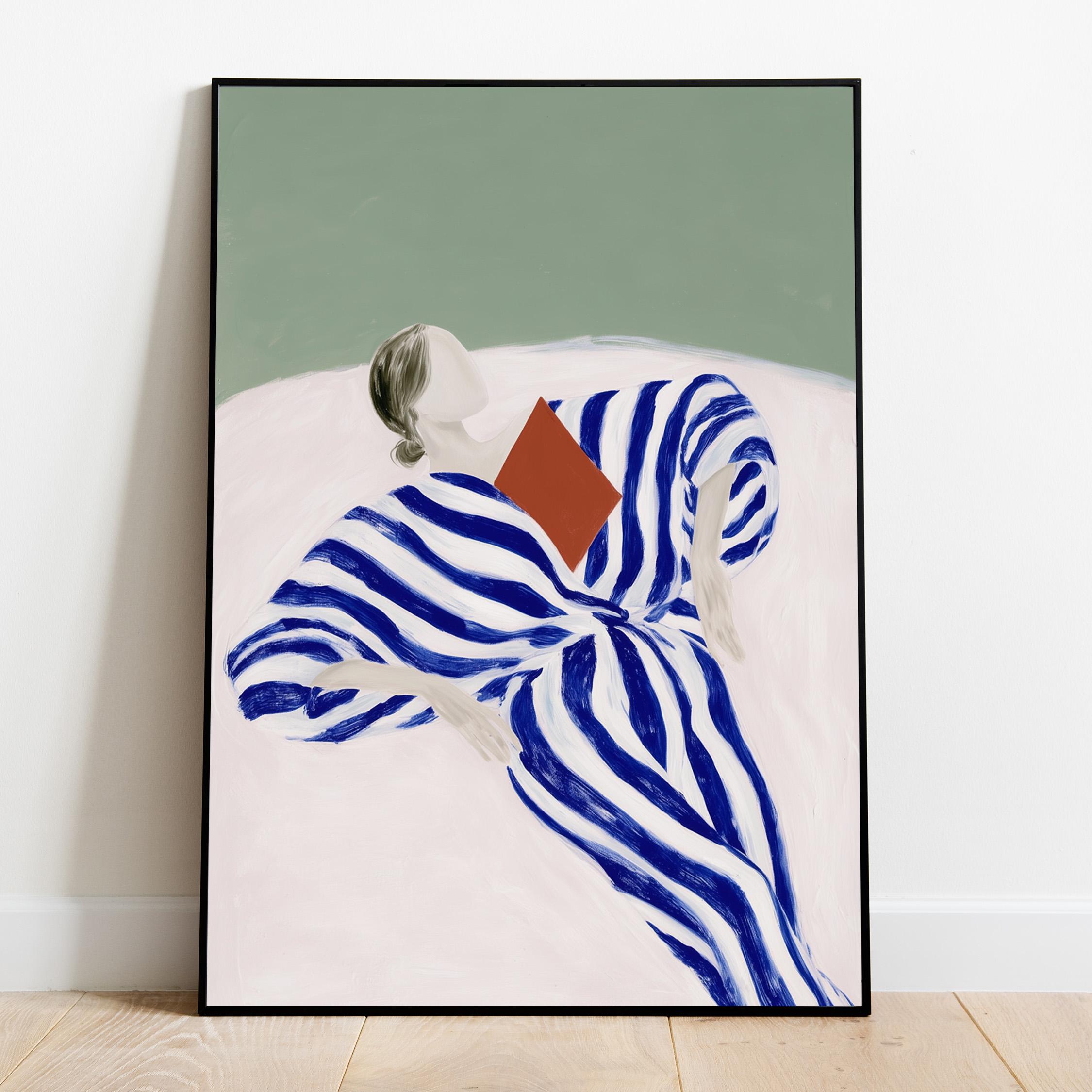 The composition blends modern figurative illustration with a Scandinavian-inspired minimalist style. The reading pose evokes quiet moments, reflection, and slow living, while the strong striped pattern adds a contemporary design element. A beautiful piece for a reading nook, bedroom, living room, study, or home library. Ideal for interiors that mix modern art, calm colors, and thoughtful decorative details.