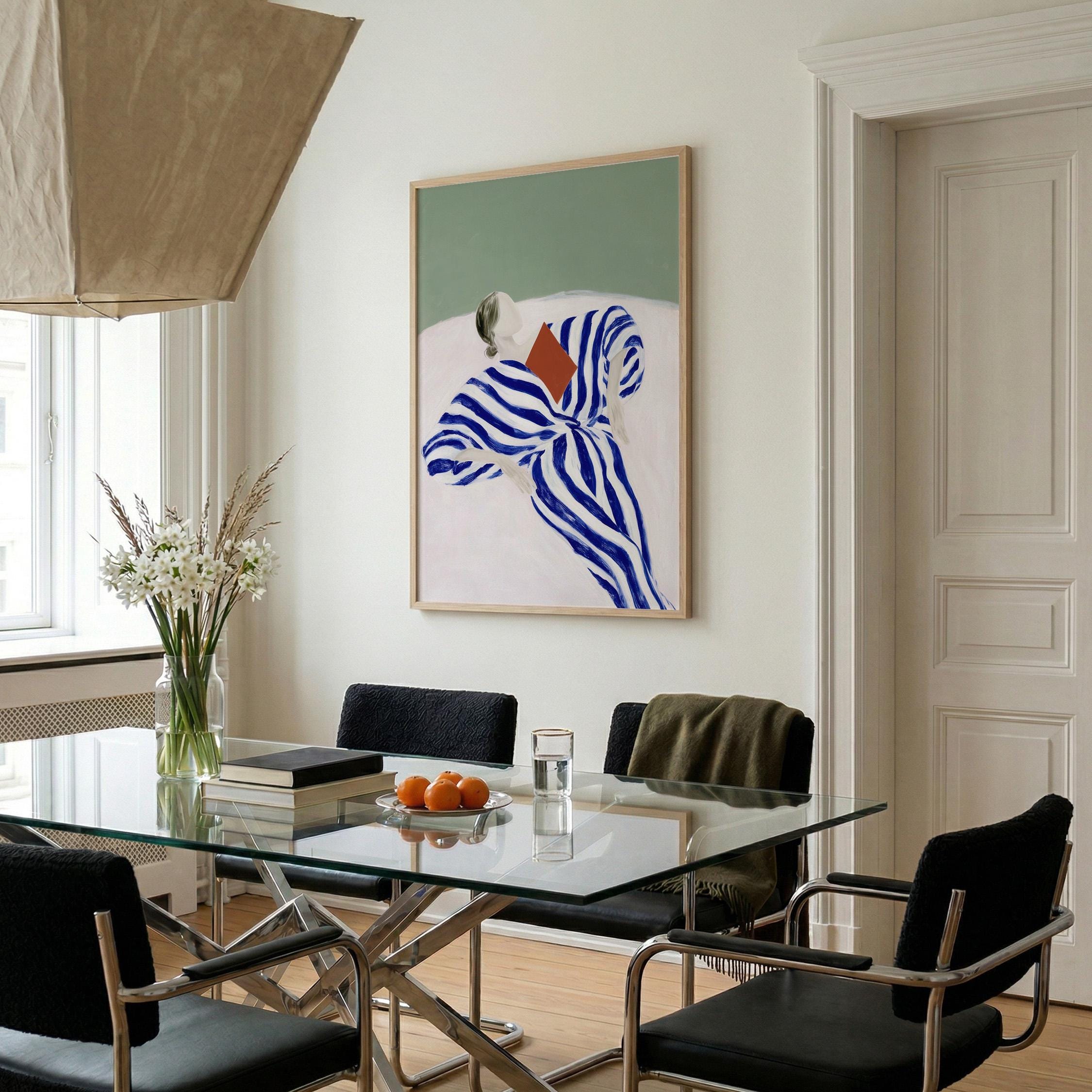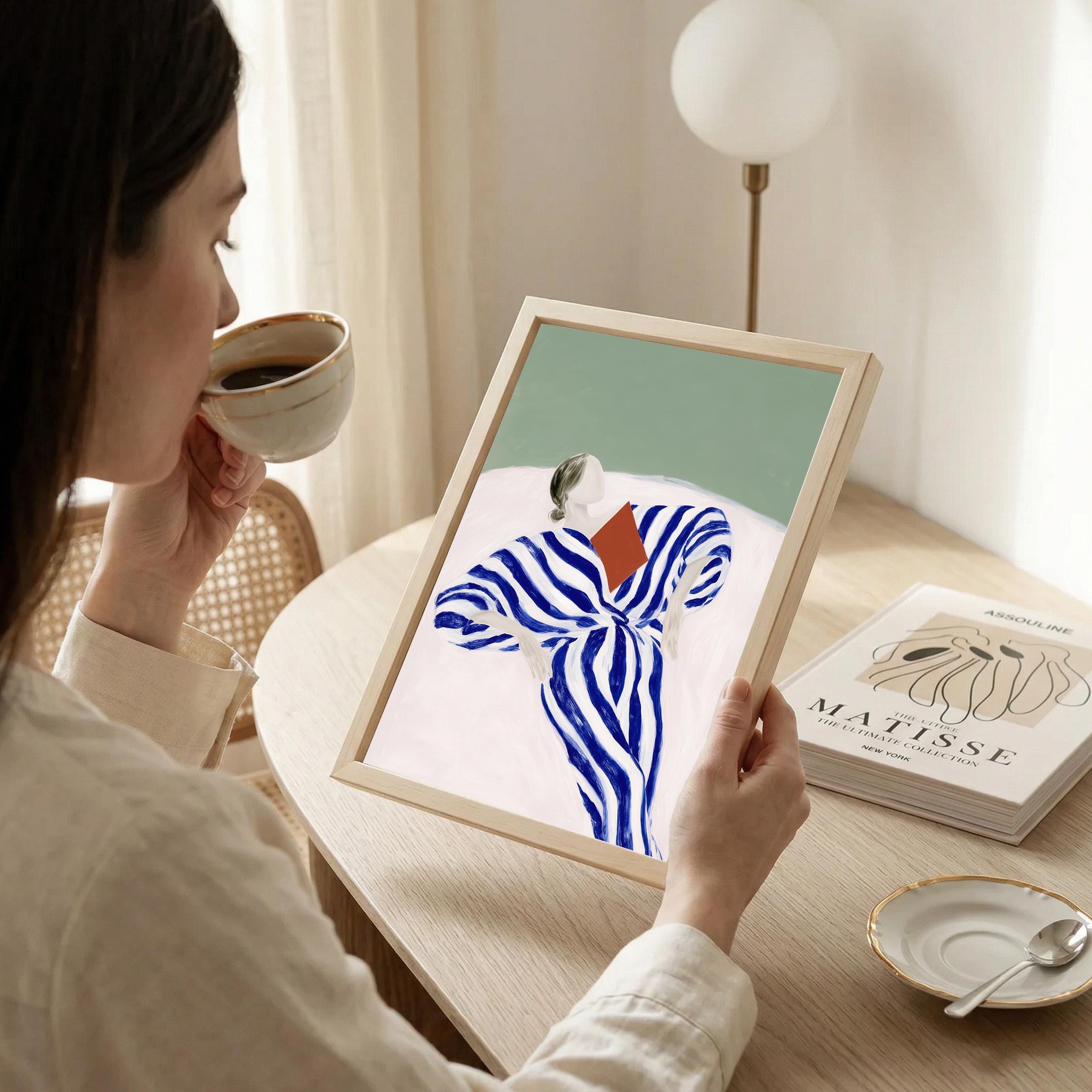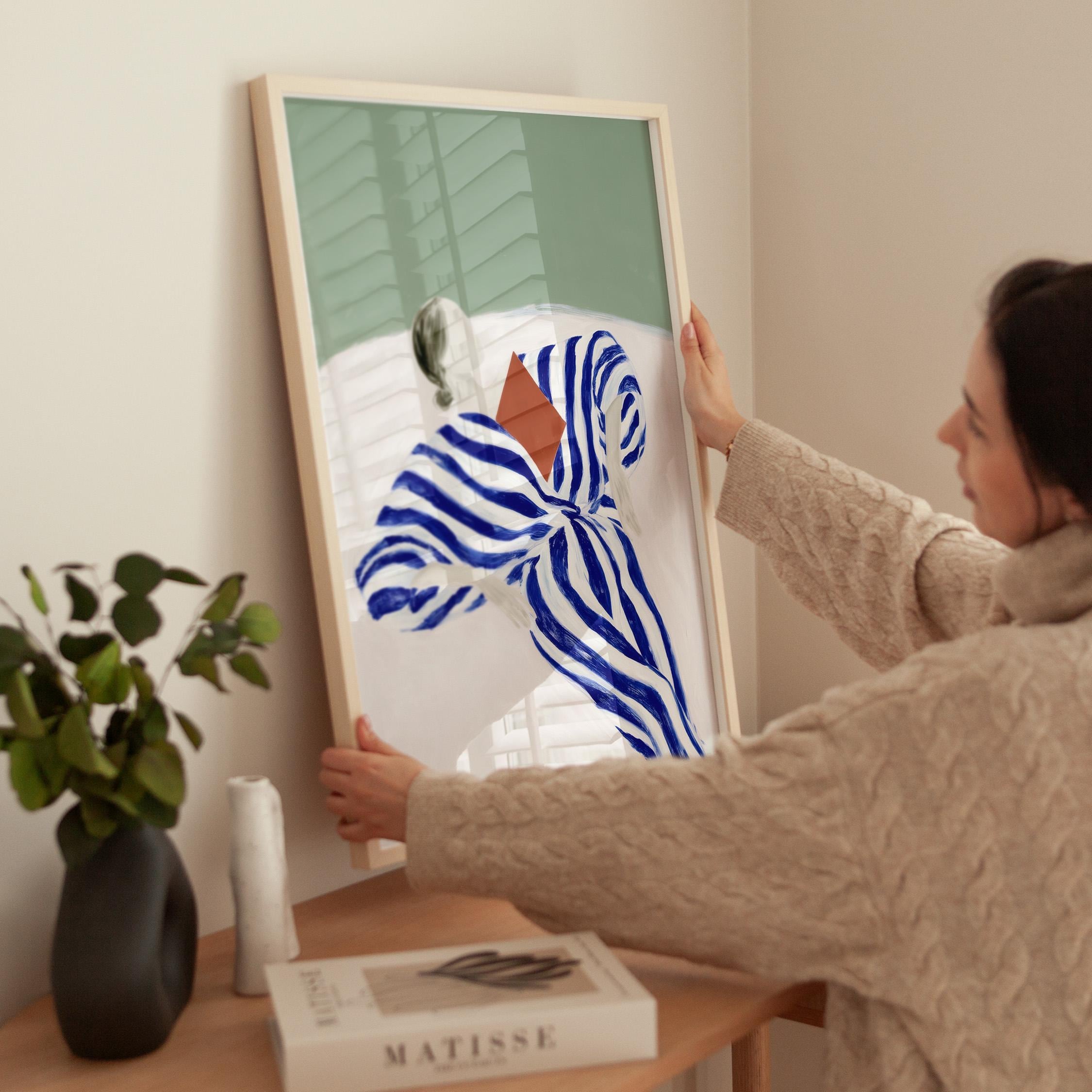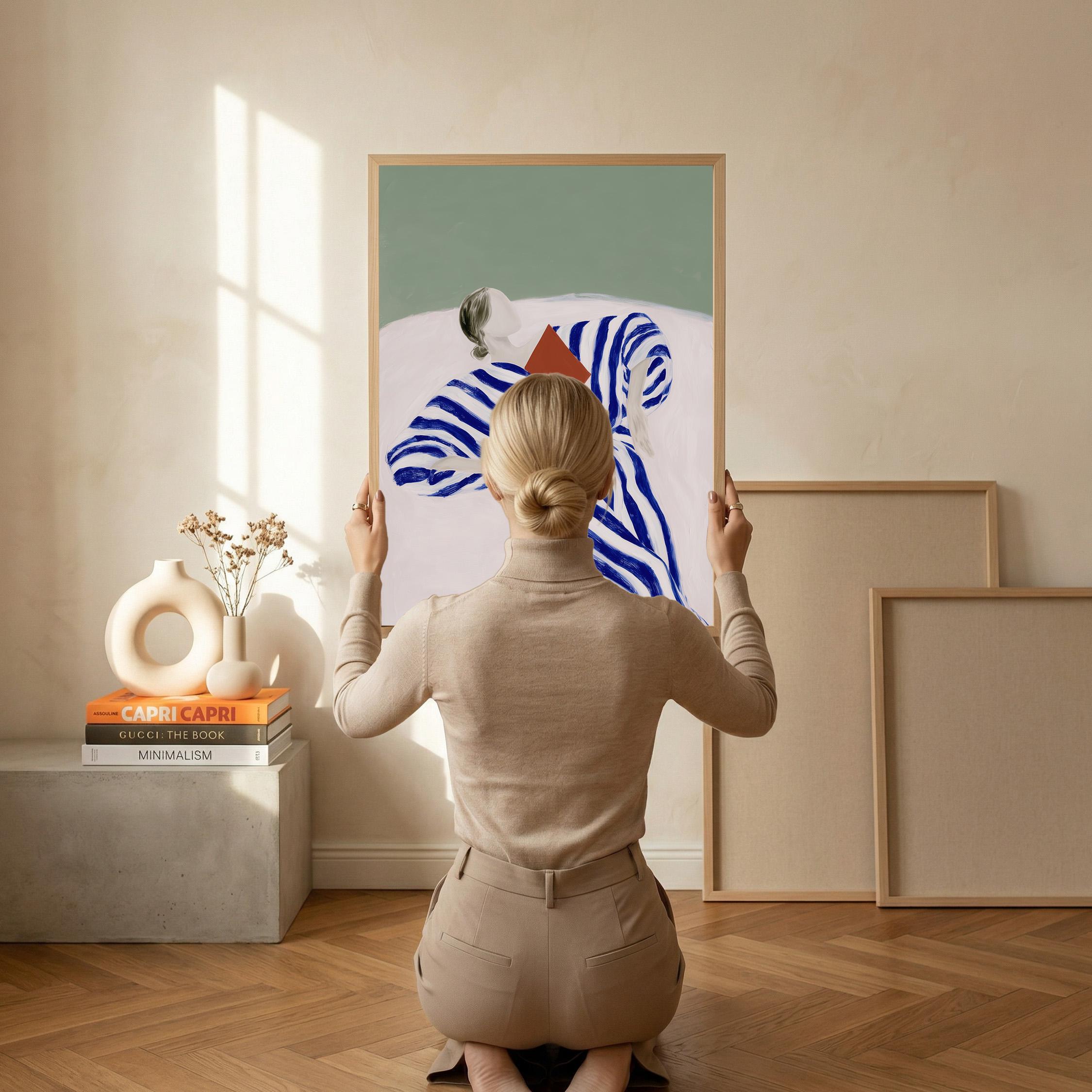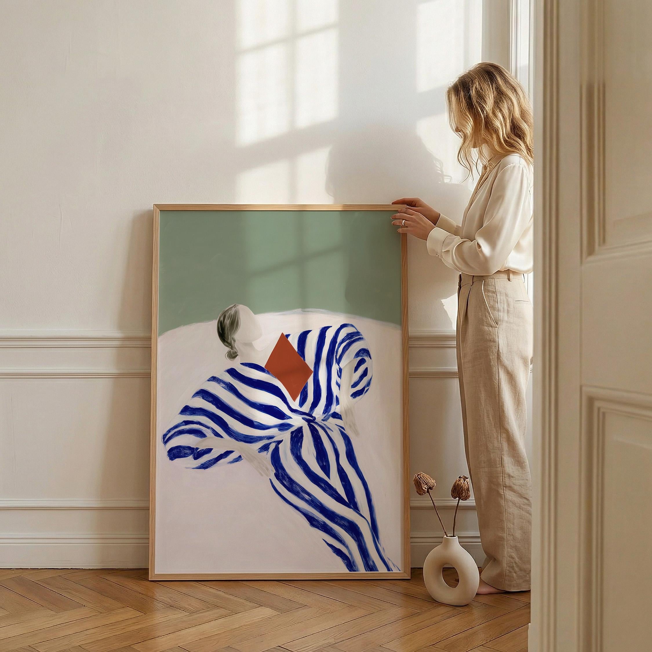 The composition blends modern figurative illustration with a Scandinavian-inspired minimalist style. The reading pose evokes quiet moments, reflection, and slow living, while the strong striped pattern adds a contemporary design element. A beautiful piece for a reading nook, bedroom, living room, study, or home library. Ideal for interiors that mix modern art, calm colors, and thoughtful decorative details.