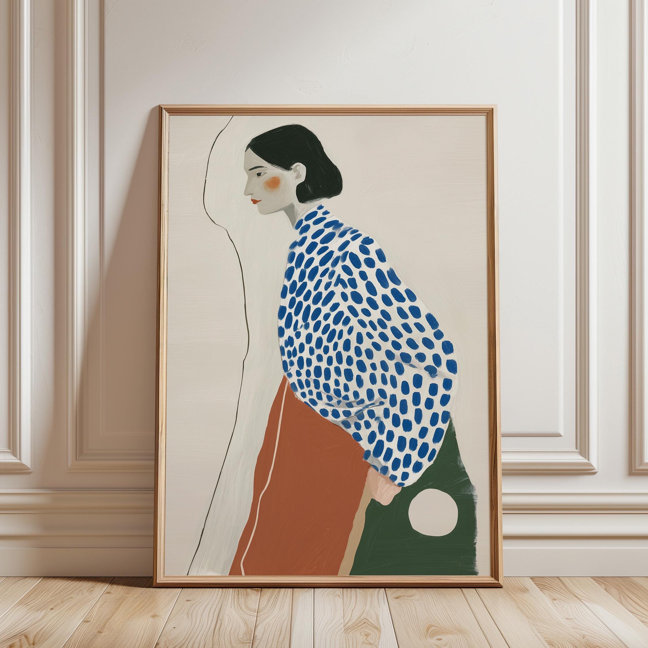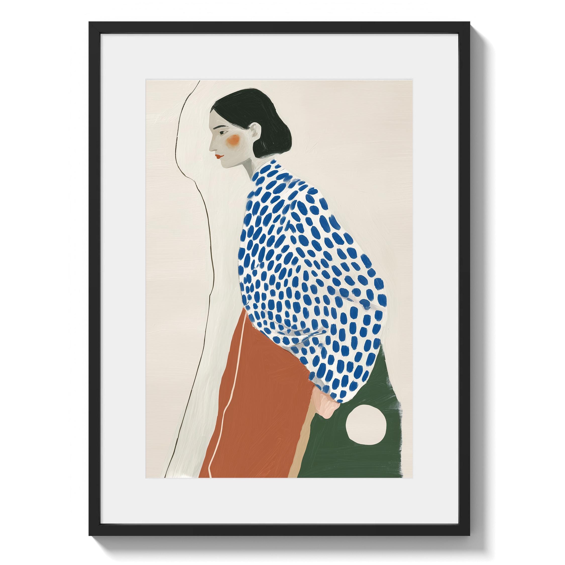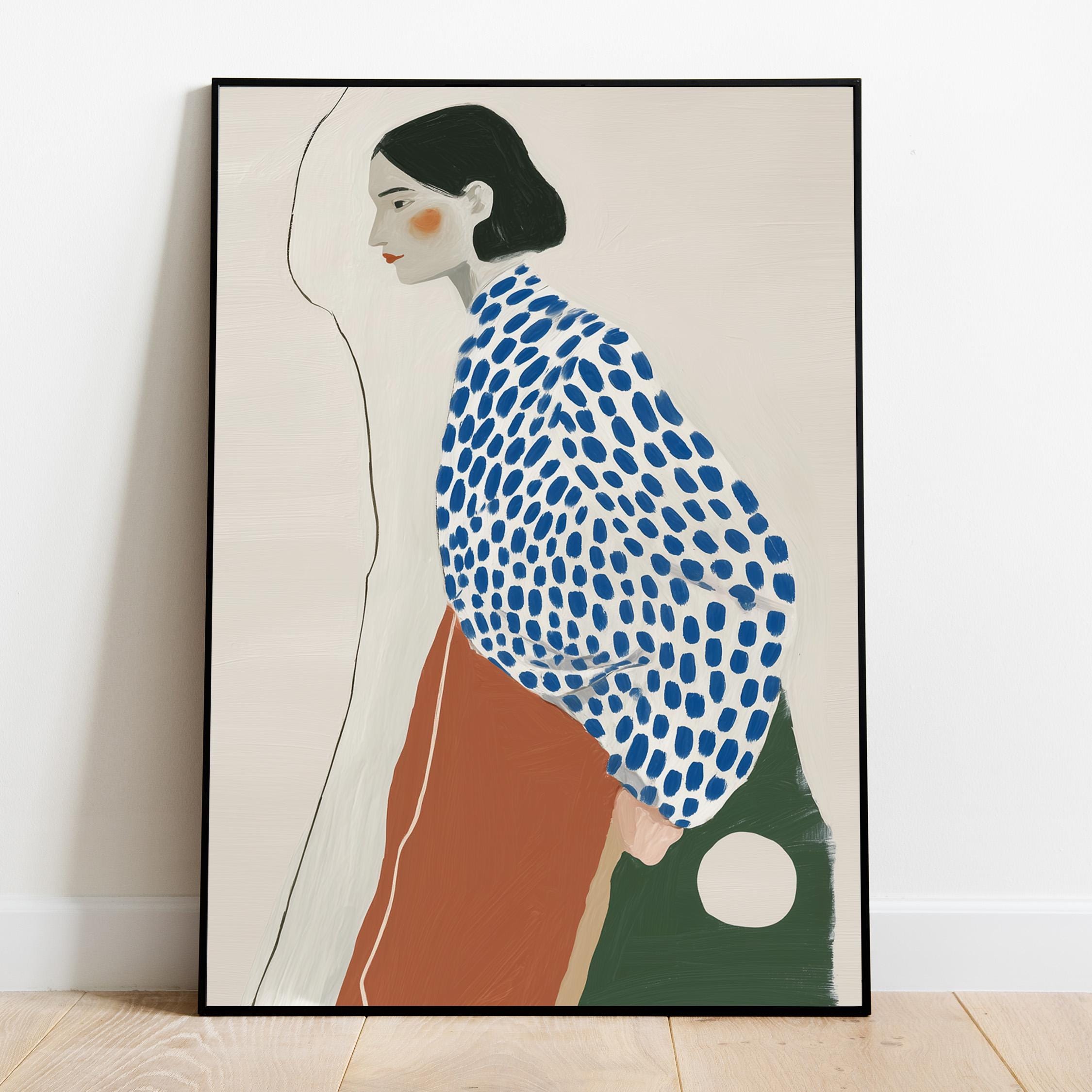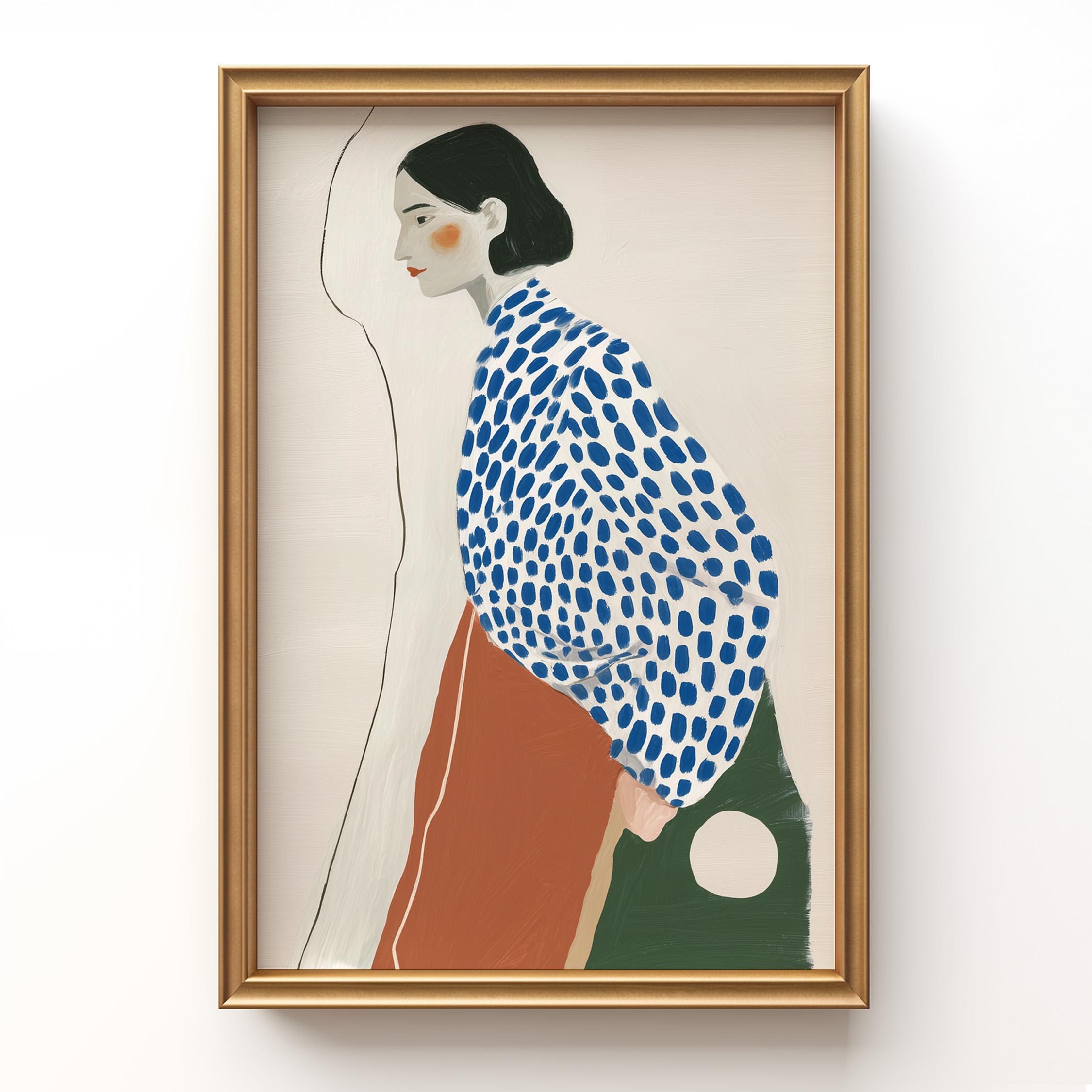 Modern minimalist woman portrait wall art featuring a calm side profile with a bold blue polka dot blouse and warm terracotta skirt. The simple line detail and soft neutral background create a clean and balanced composition.