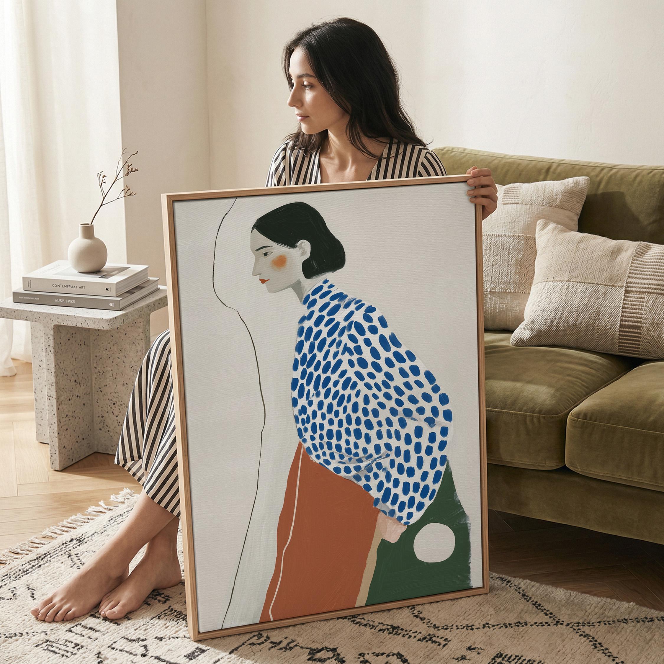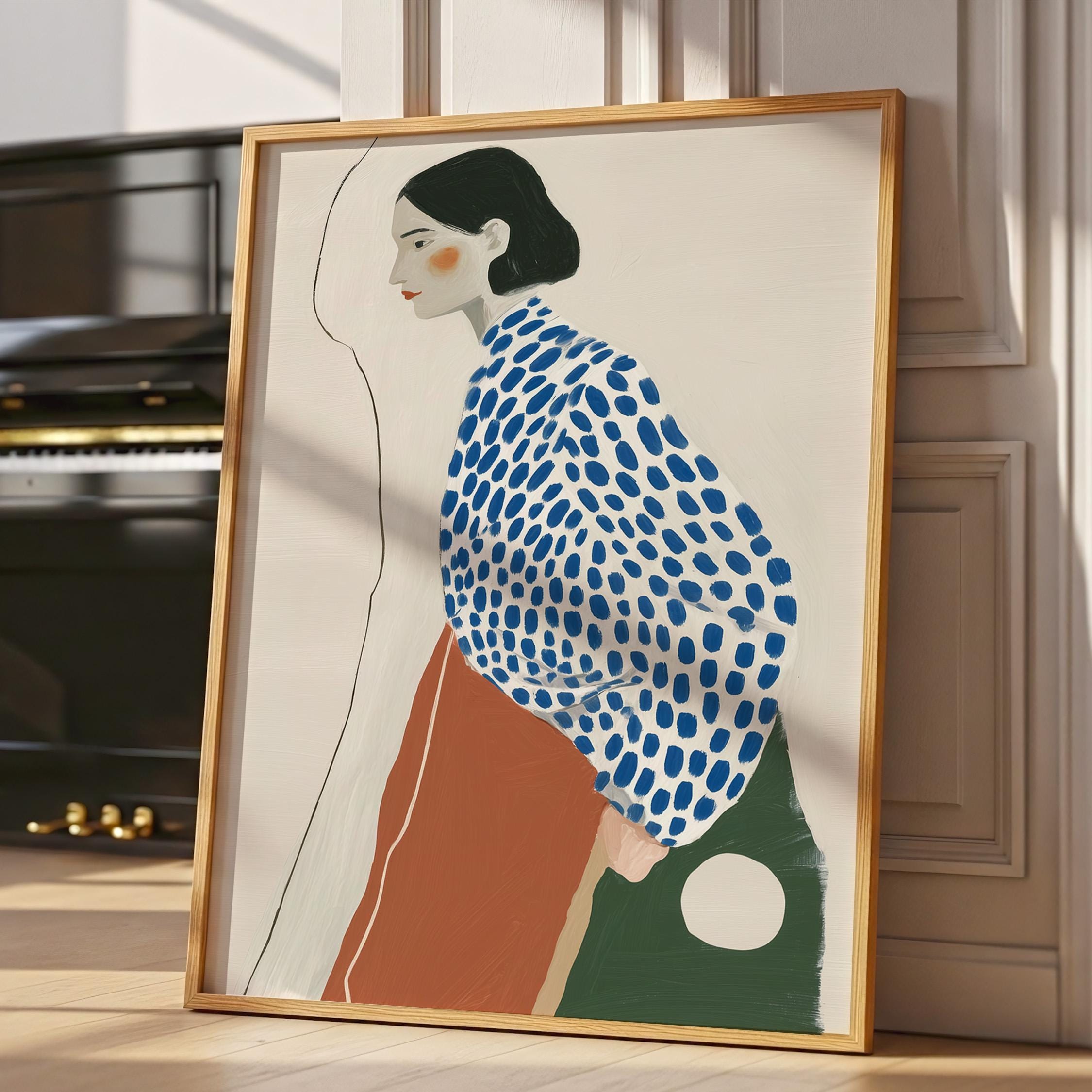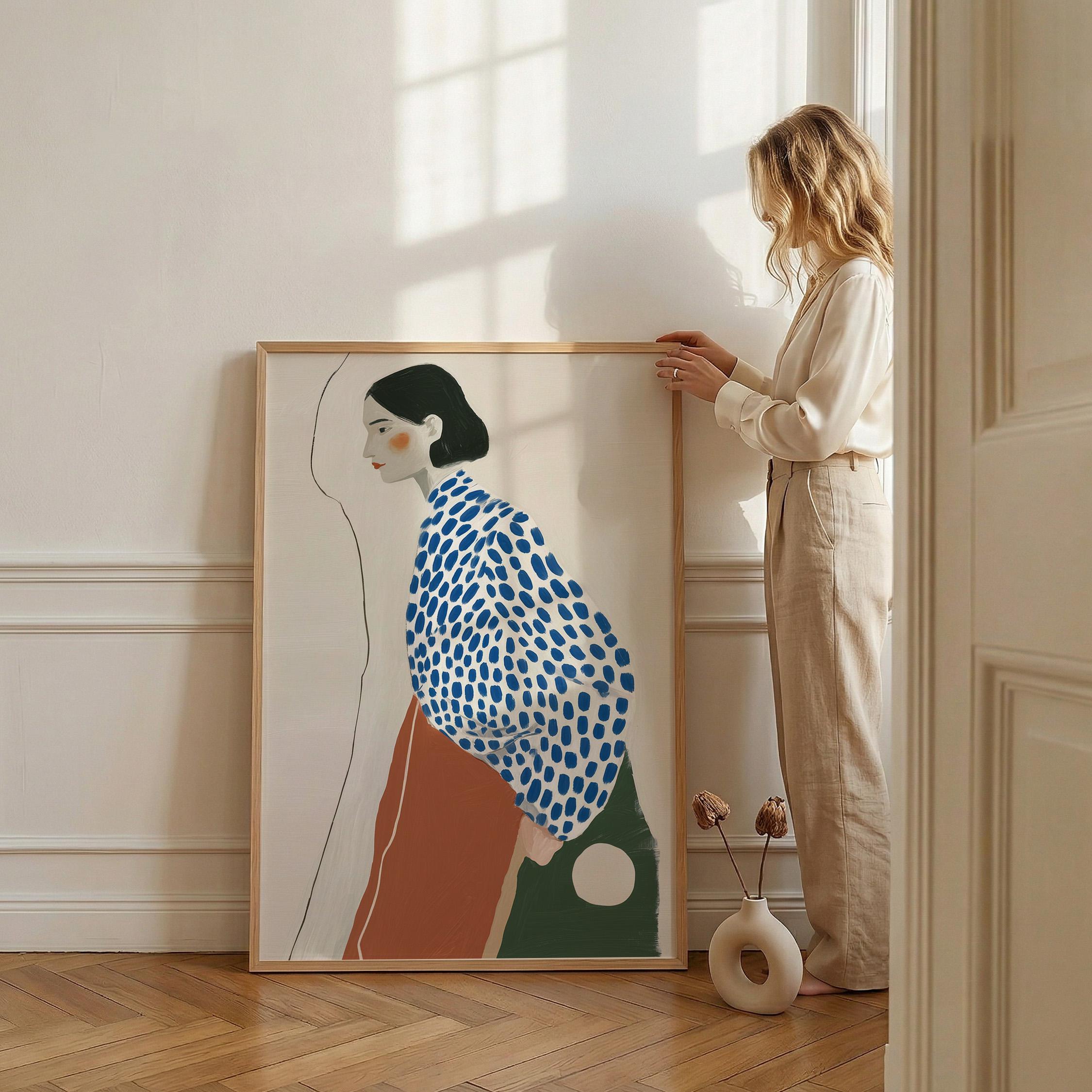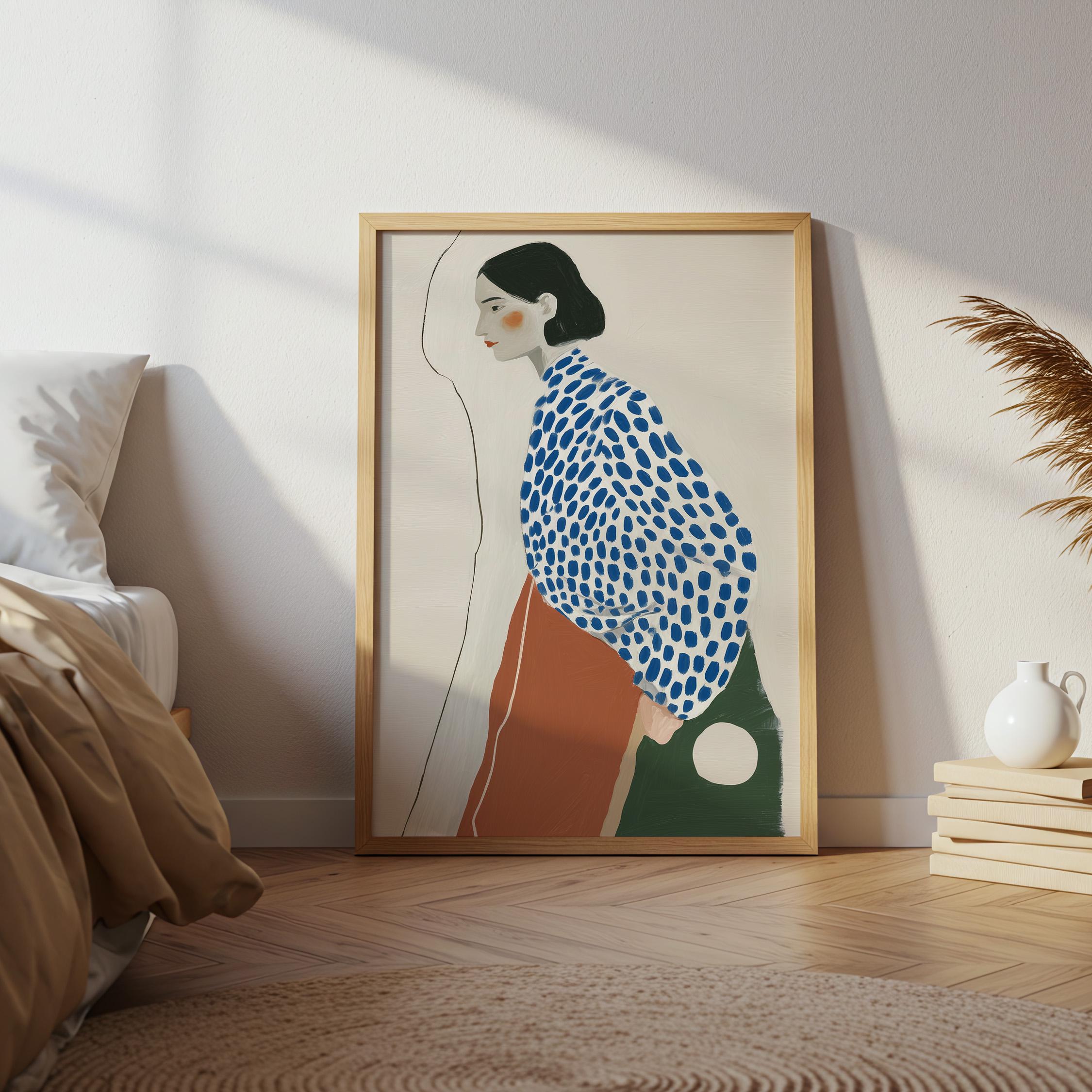 Modern minimalist woman portrait wall art featuring a calm side profile with a bold blue polka dot blouse and warm terracotta skirt. The simple line detail and soft neutral background create a clean and balanced composition.