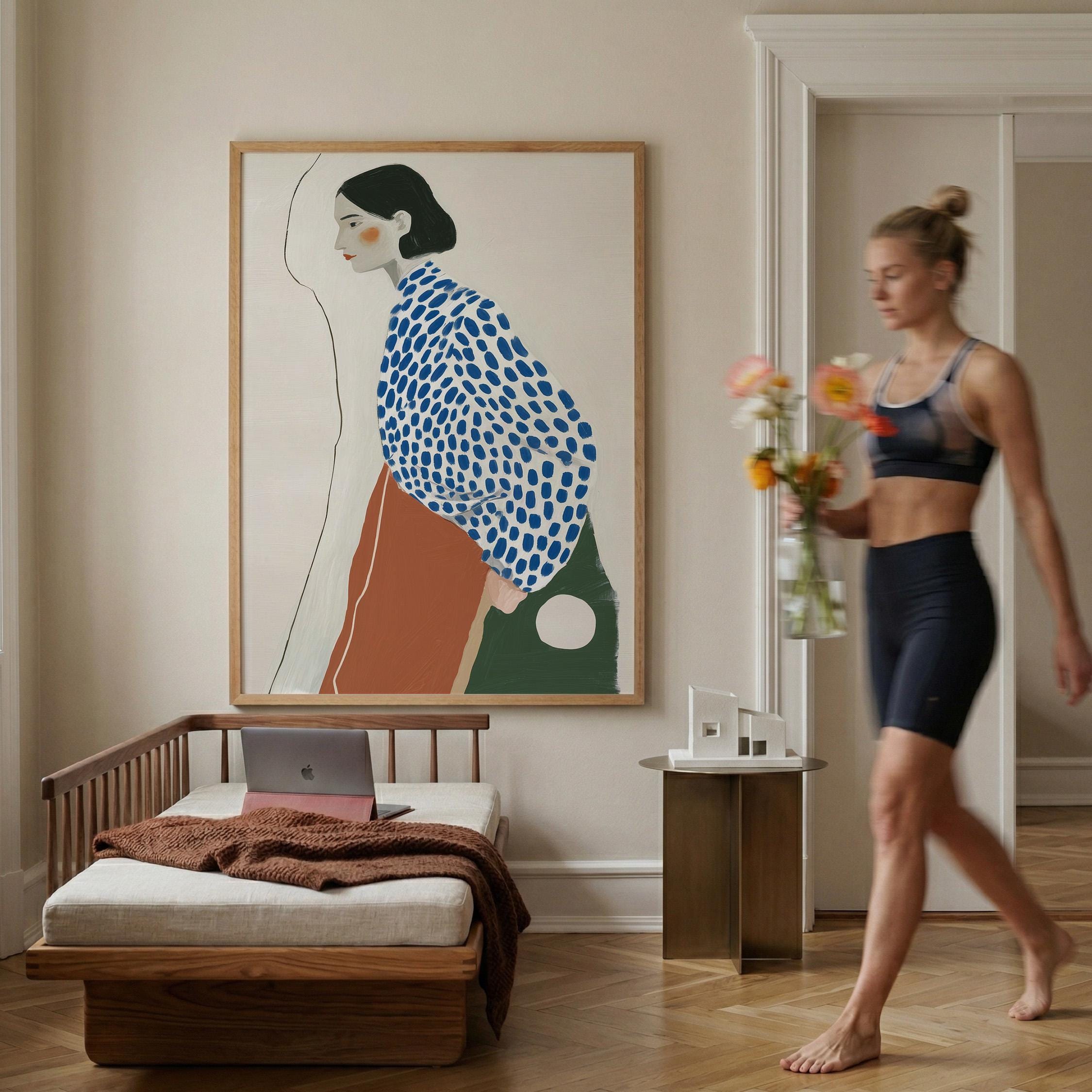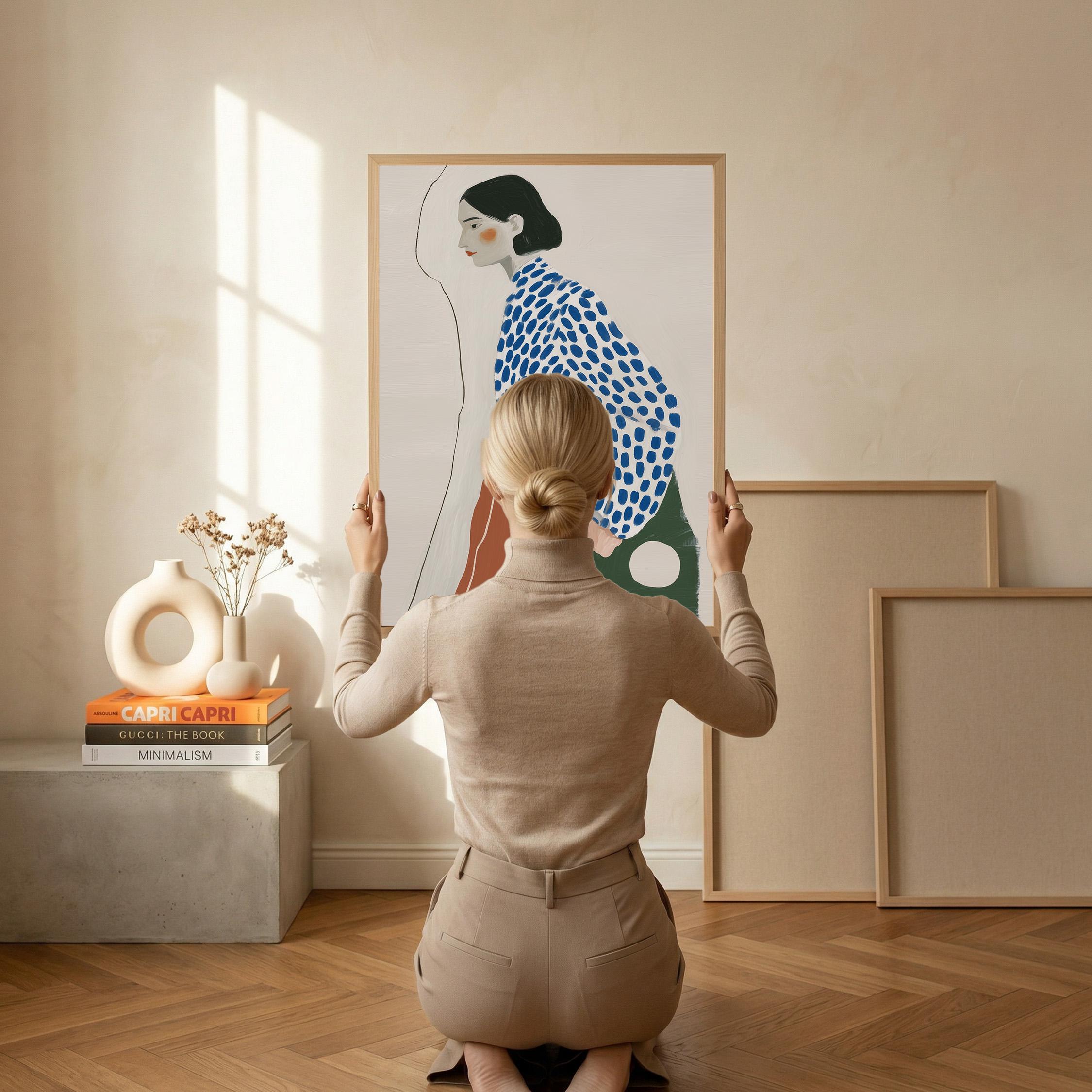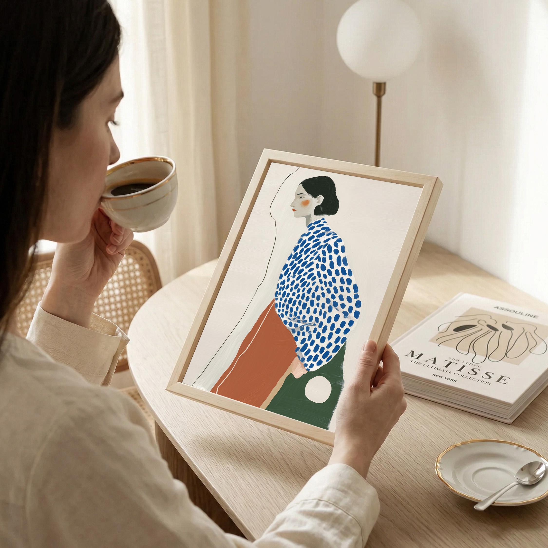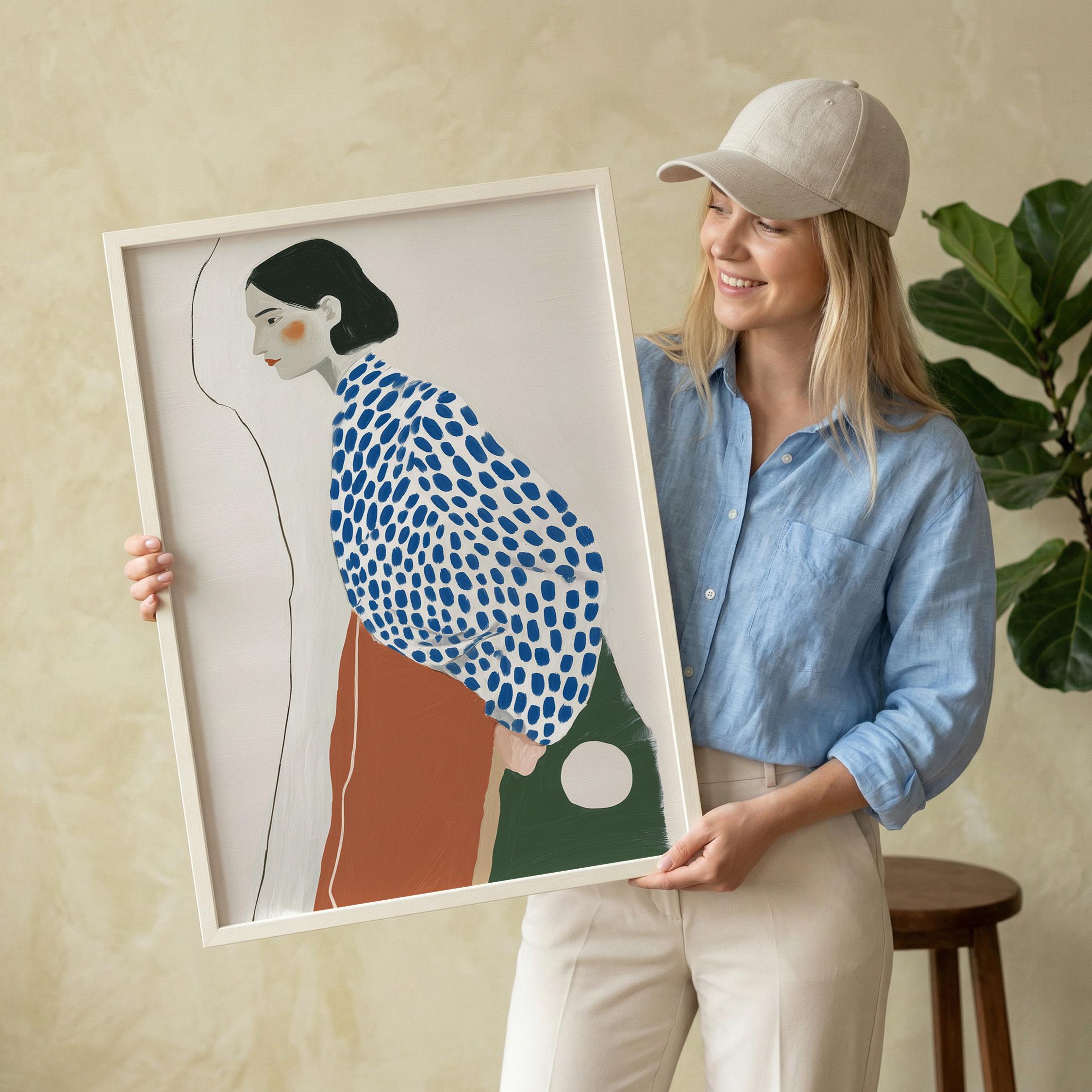 Modern minimalist woman portrait wall art featuring a calm side profile with a bold blue polka dot blouse and warm terracotta skirt. The simple line detail and soft neutral background create a clean and balanced composition.