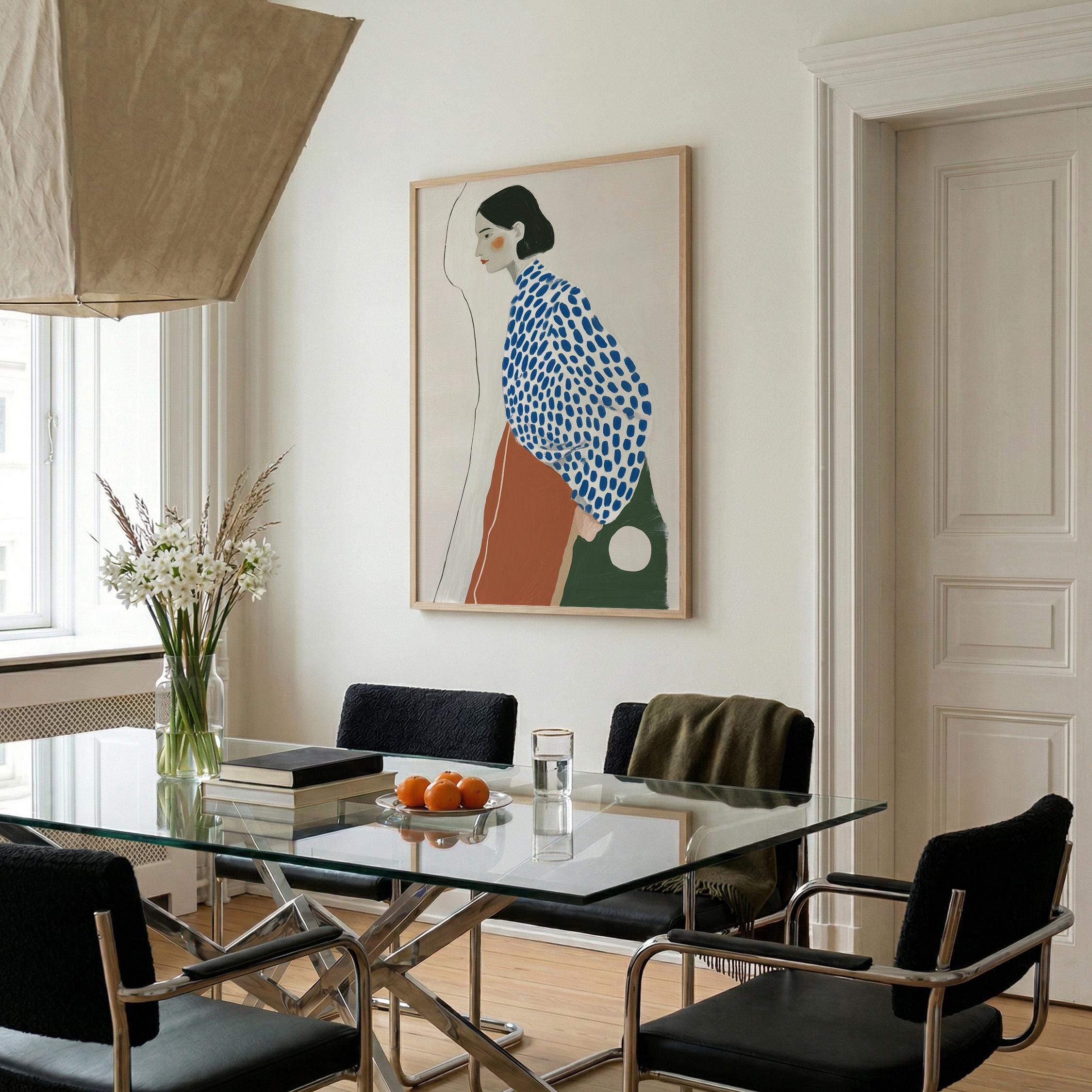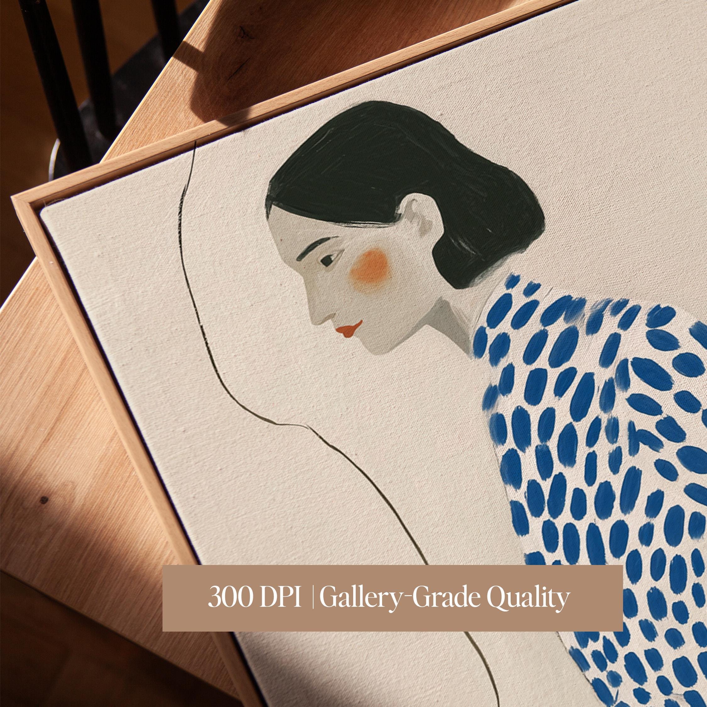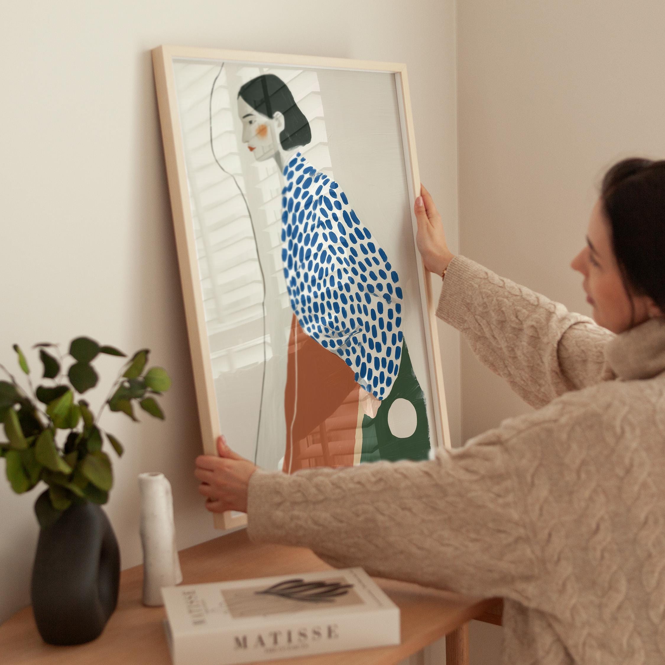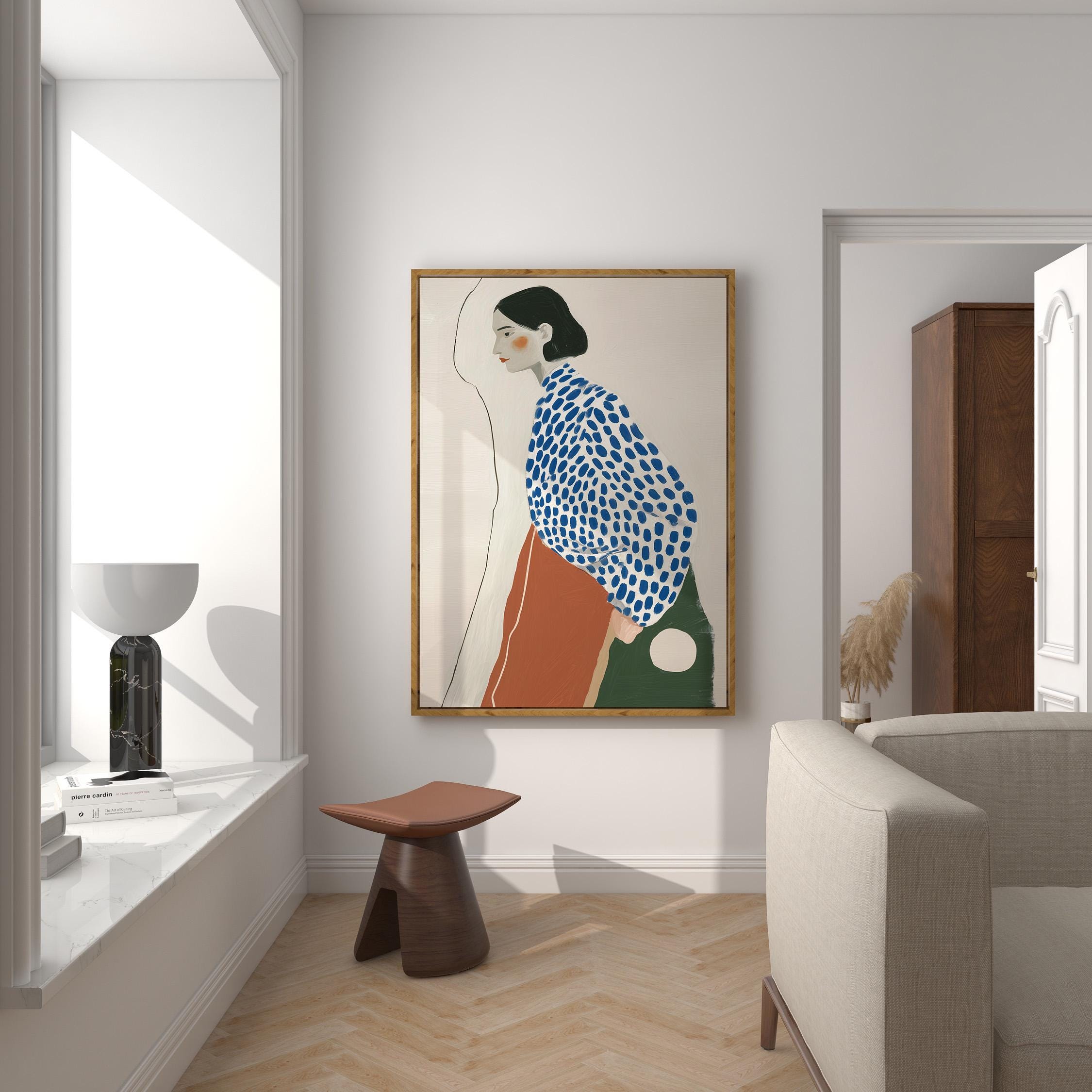 Modern minimalist woman portrait wall art featuring a calm side profile with a bold blue polka dot blouse and warm terracotta skirt. The simple line detail and soft neutral background create a clean and balanced composition.