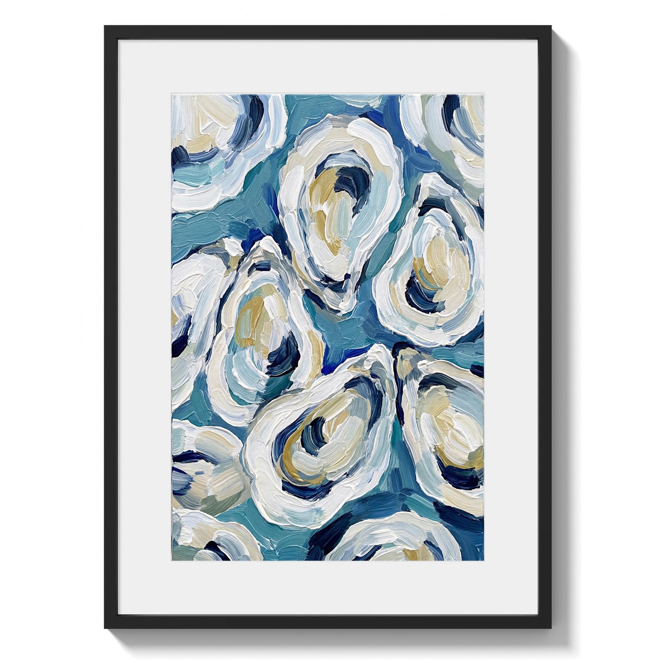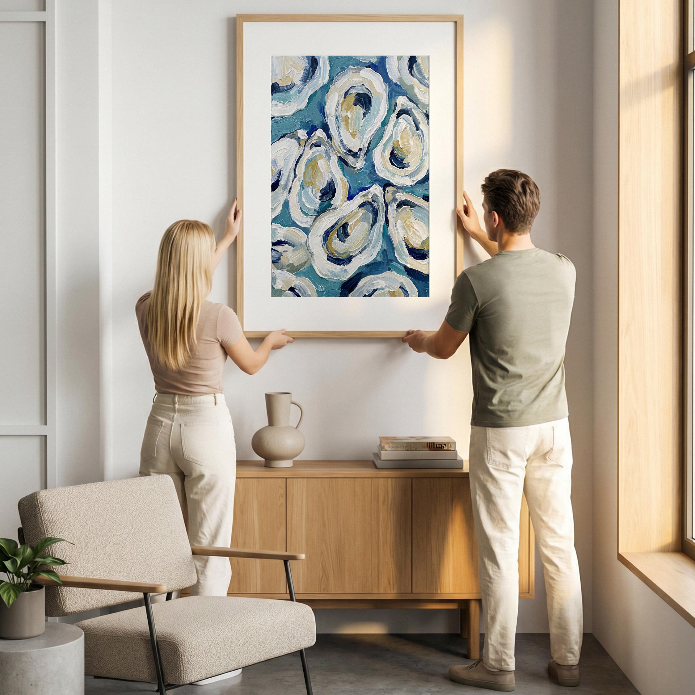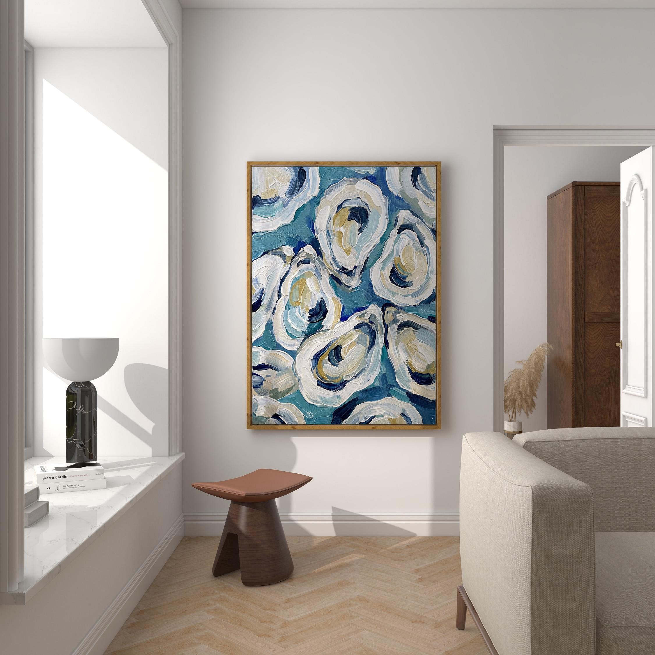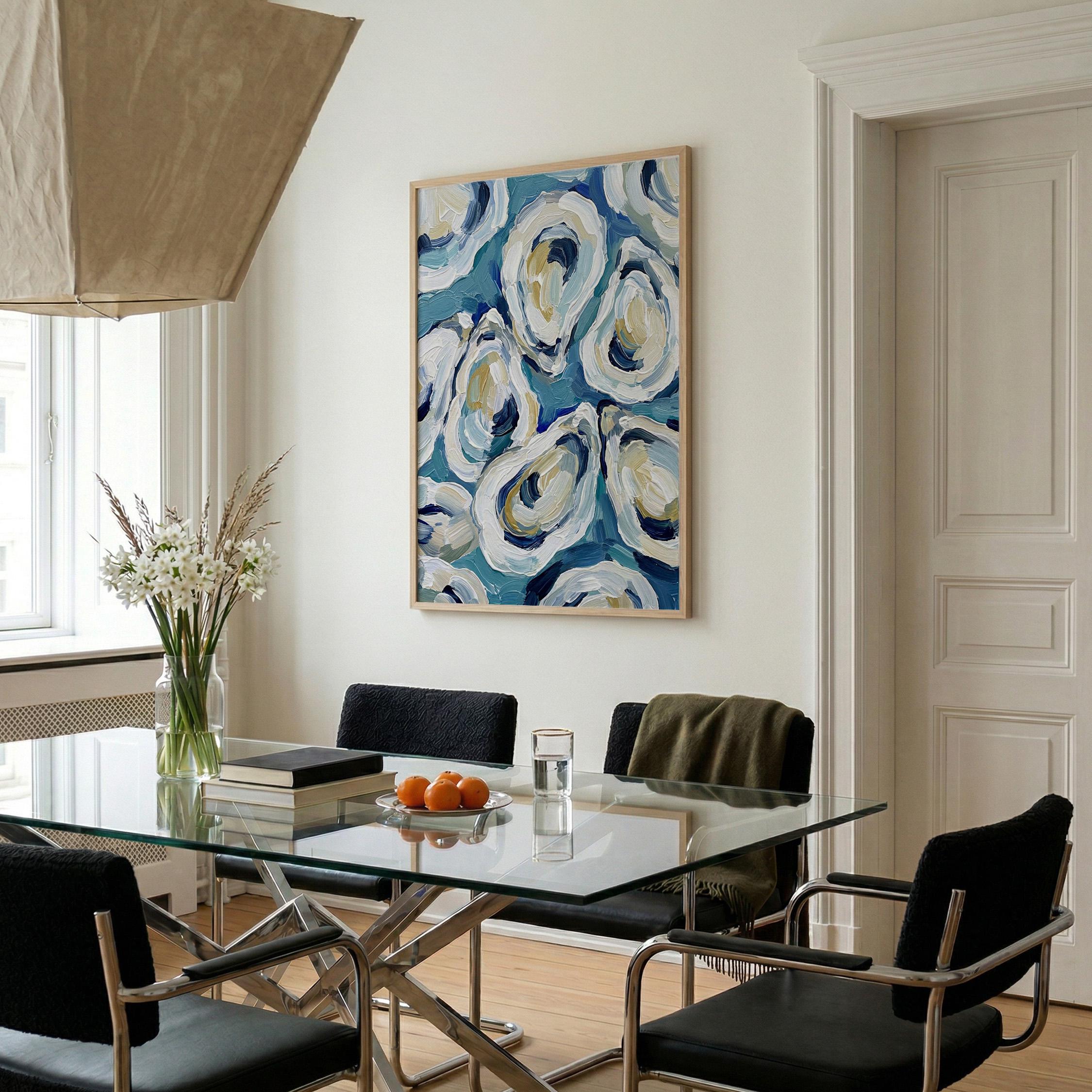The painterly texture gives the piece strong movement and depth. The abstract oyster shapes feel modern while still referencing classic maritime food culture.