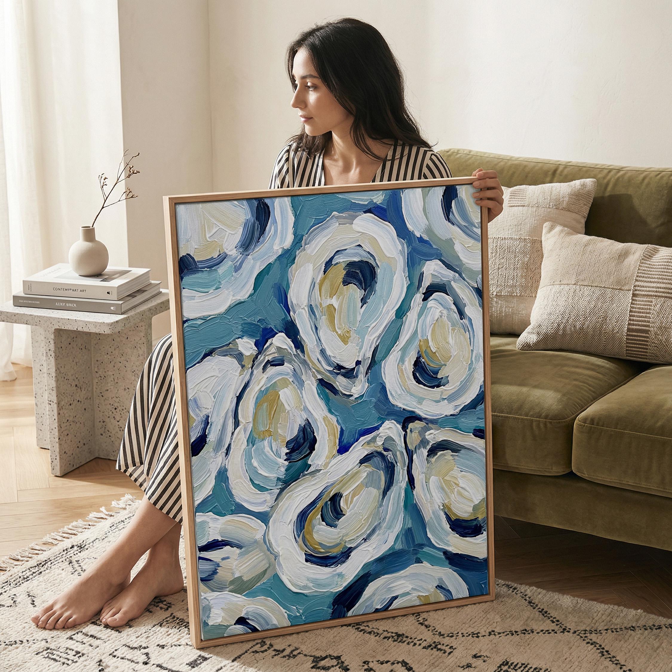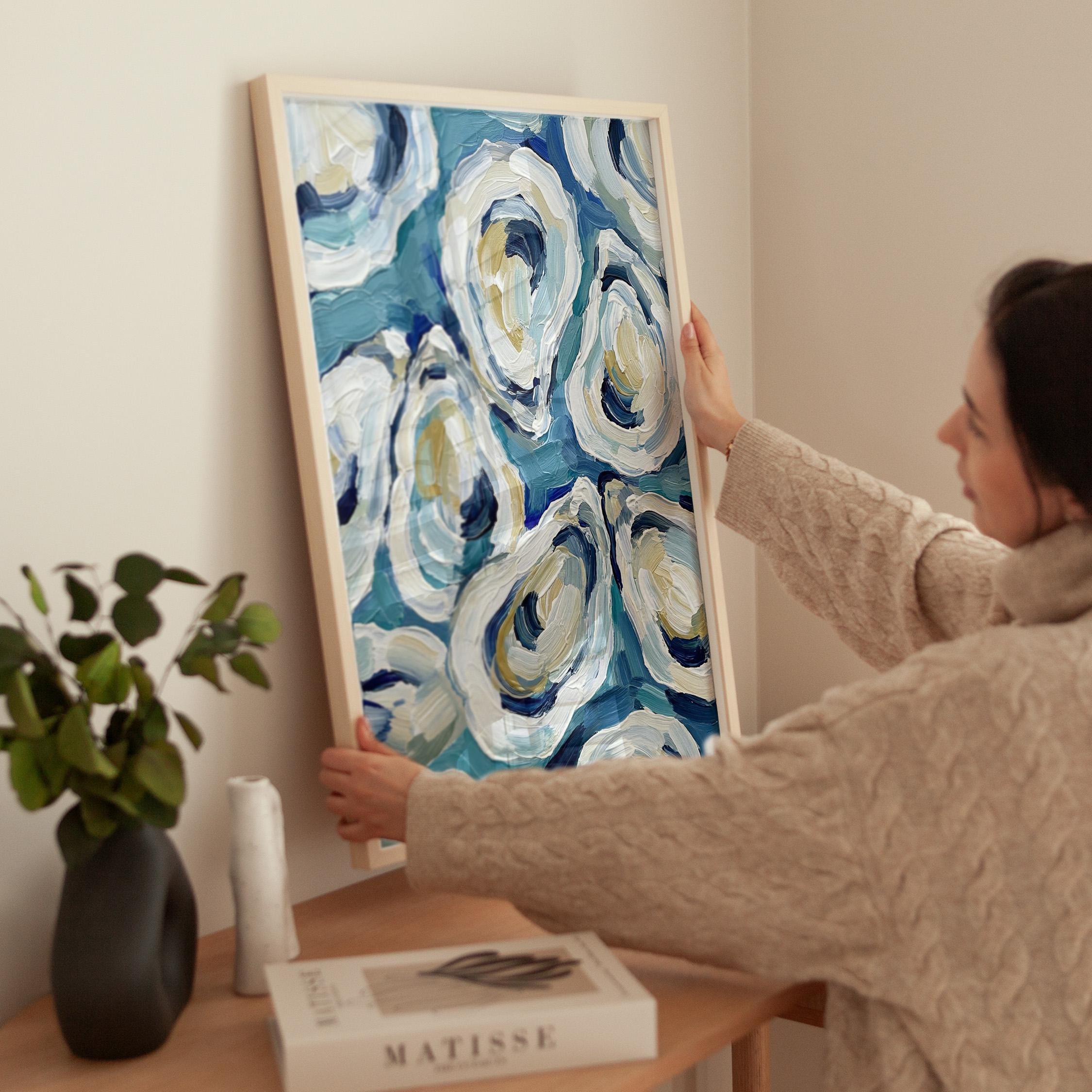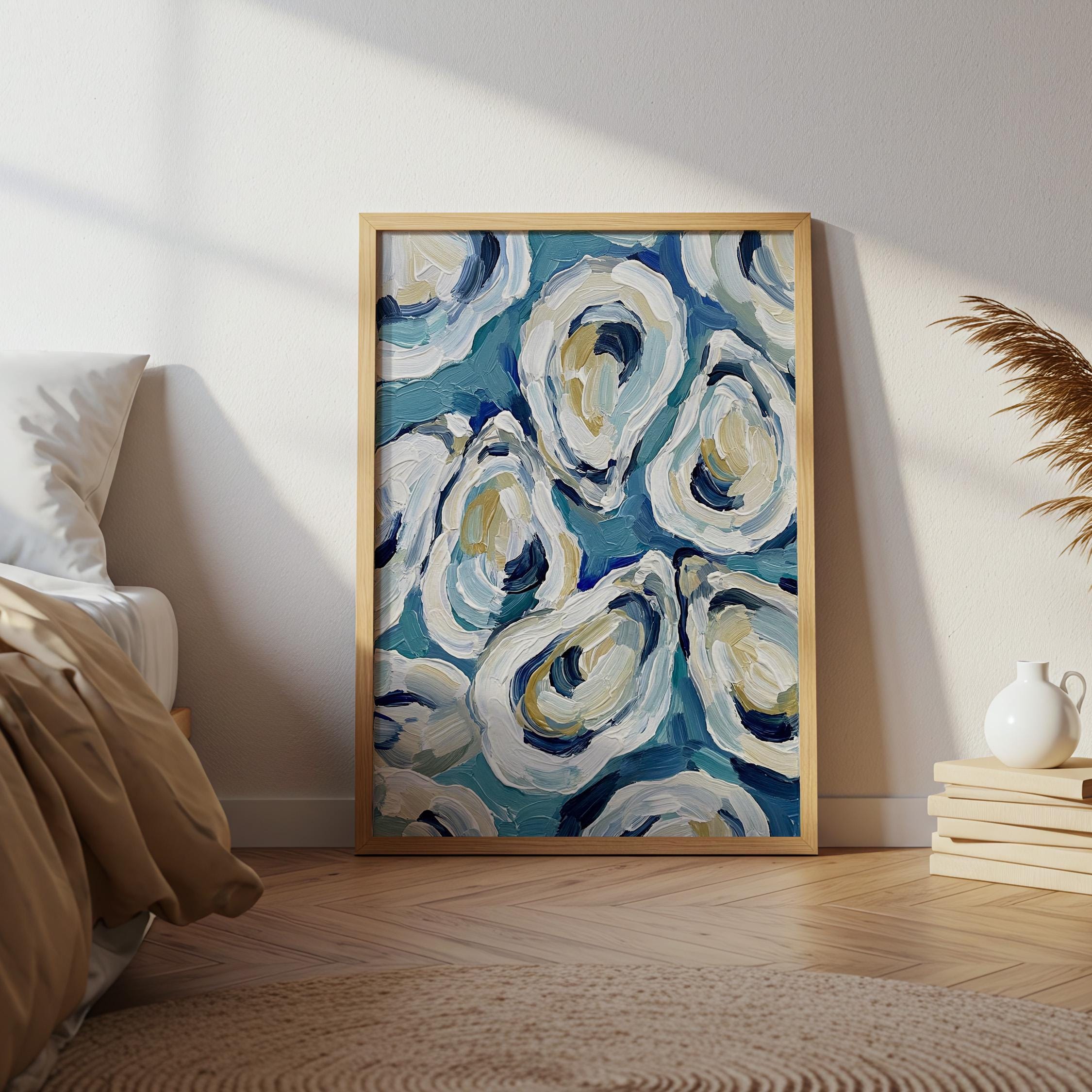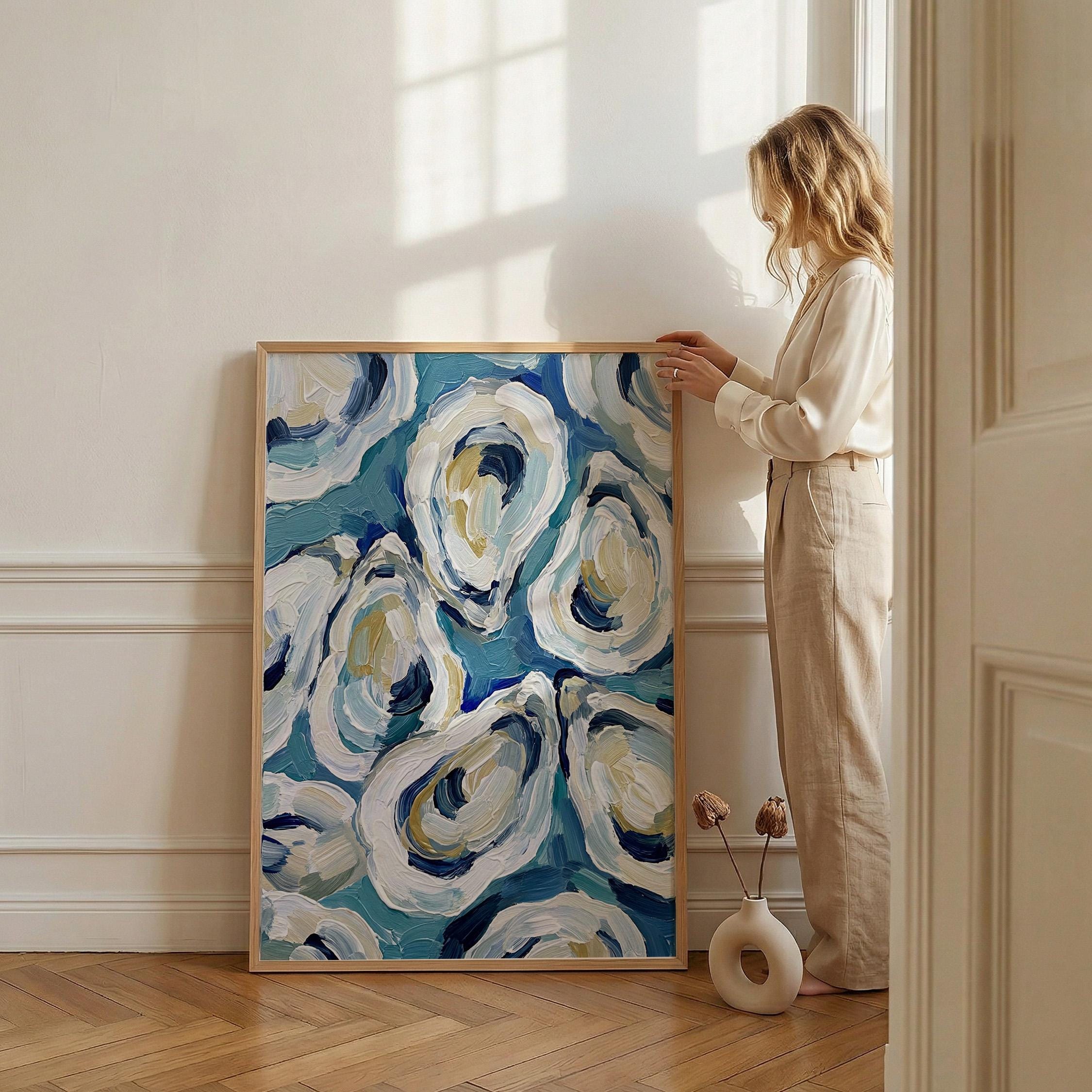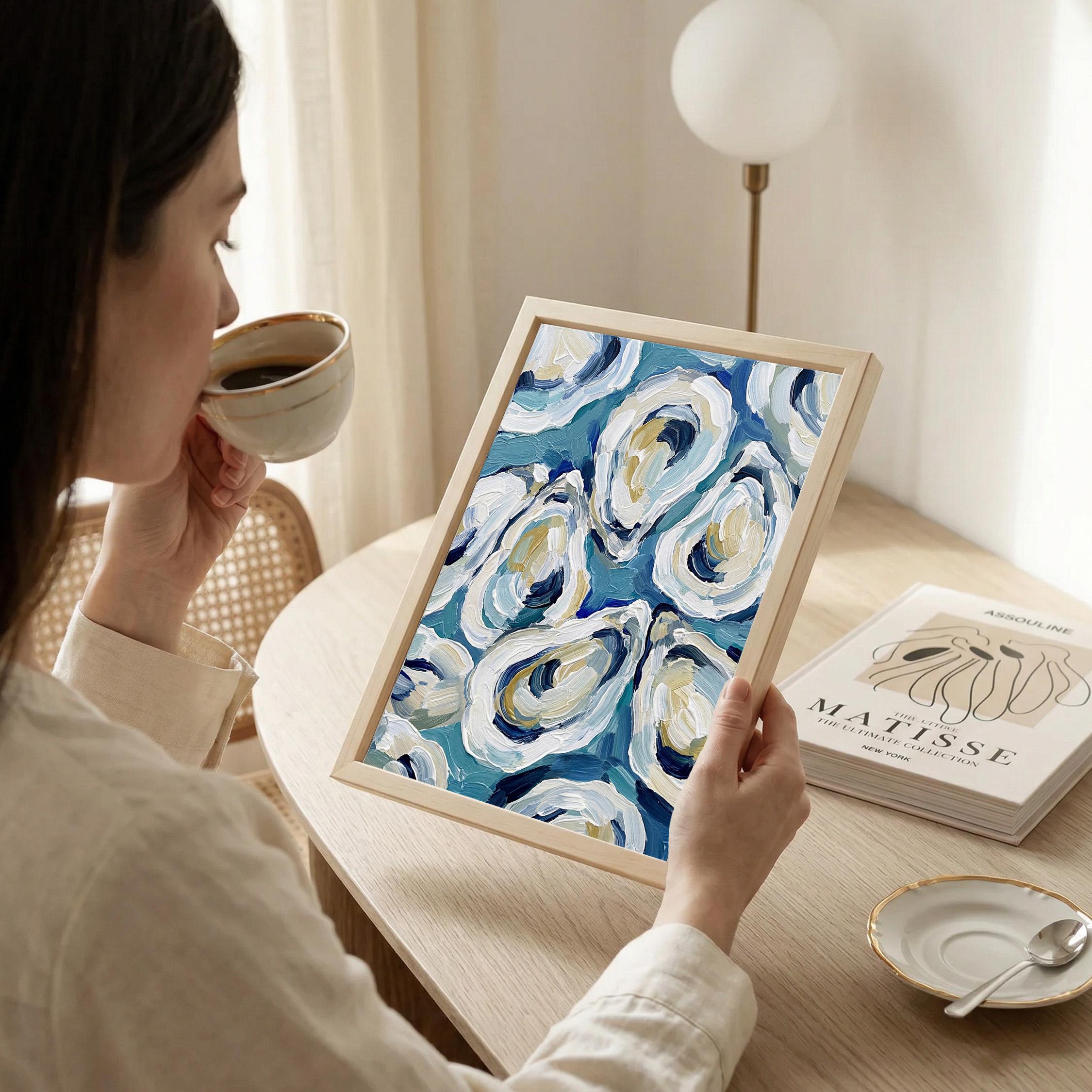 The painterly texture gives the piece strong movement and depth. The abstract oyster shapes feel modern while still referencing classic maritime food culture.