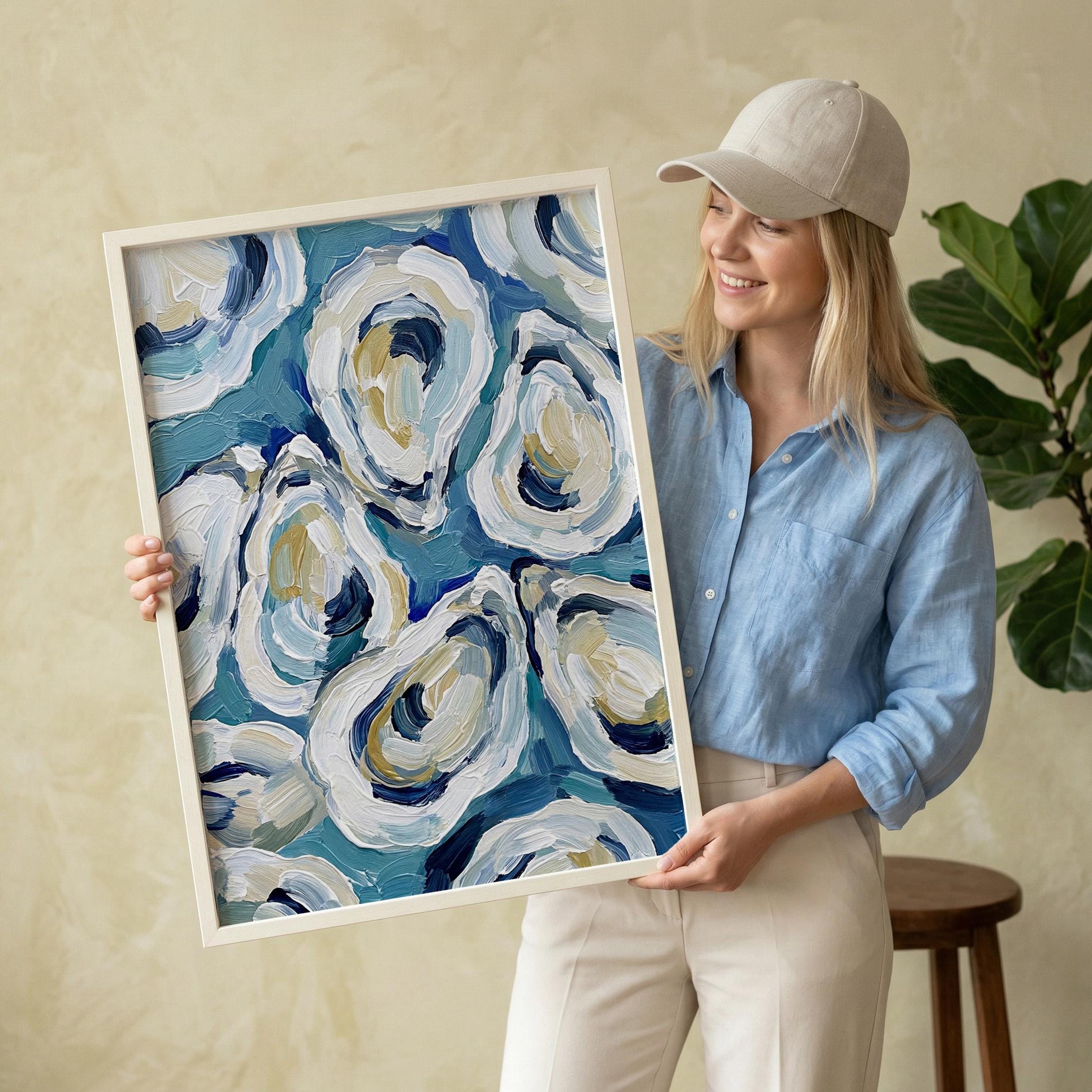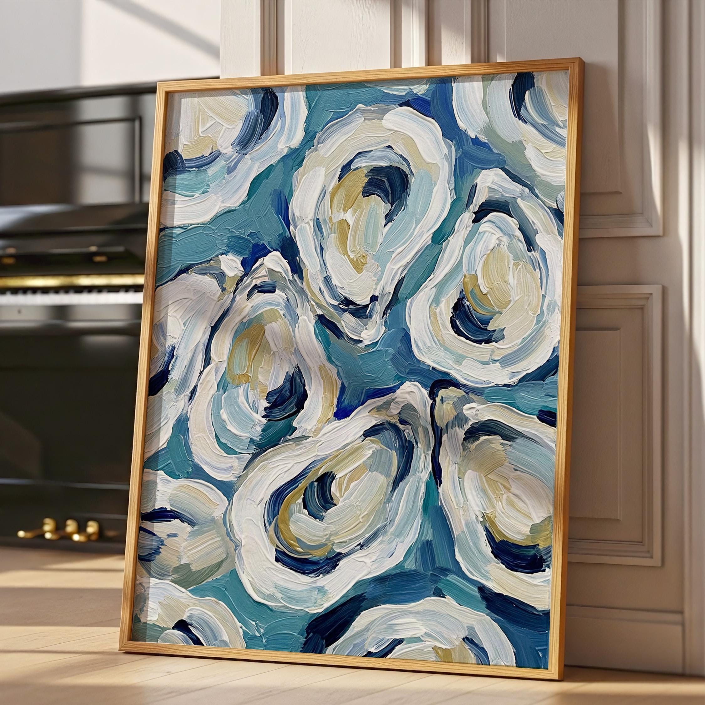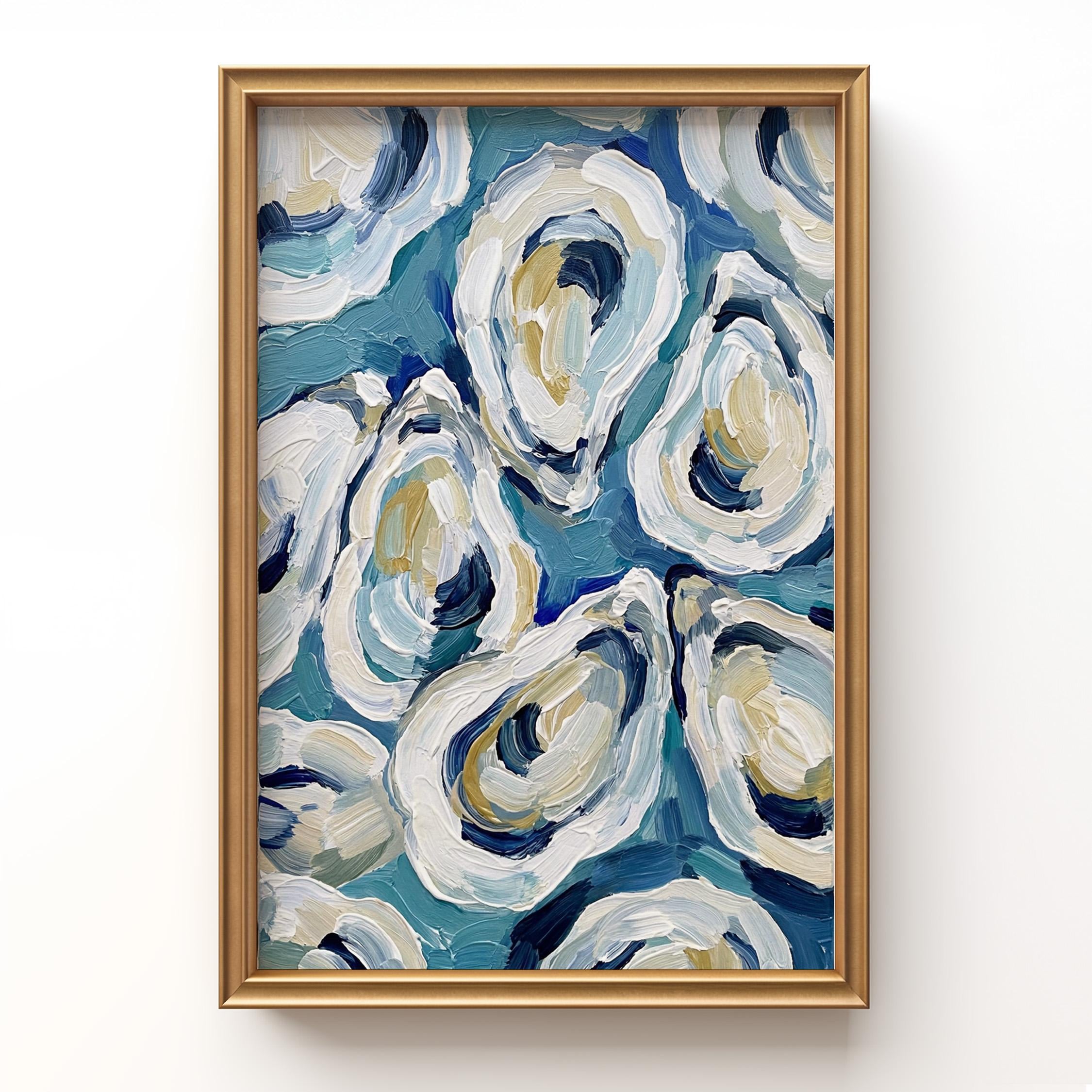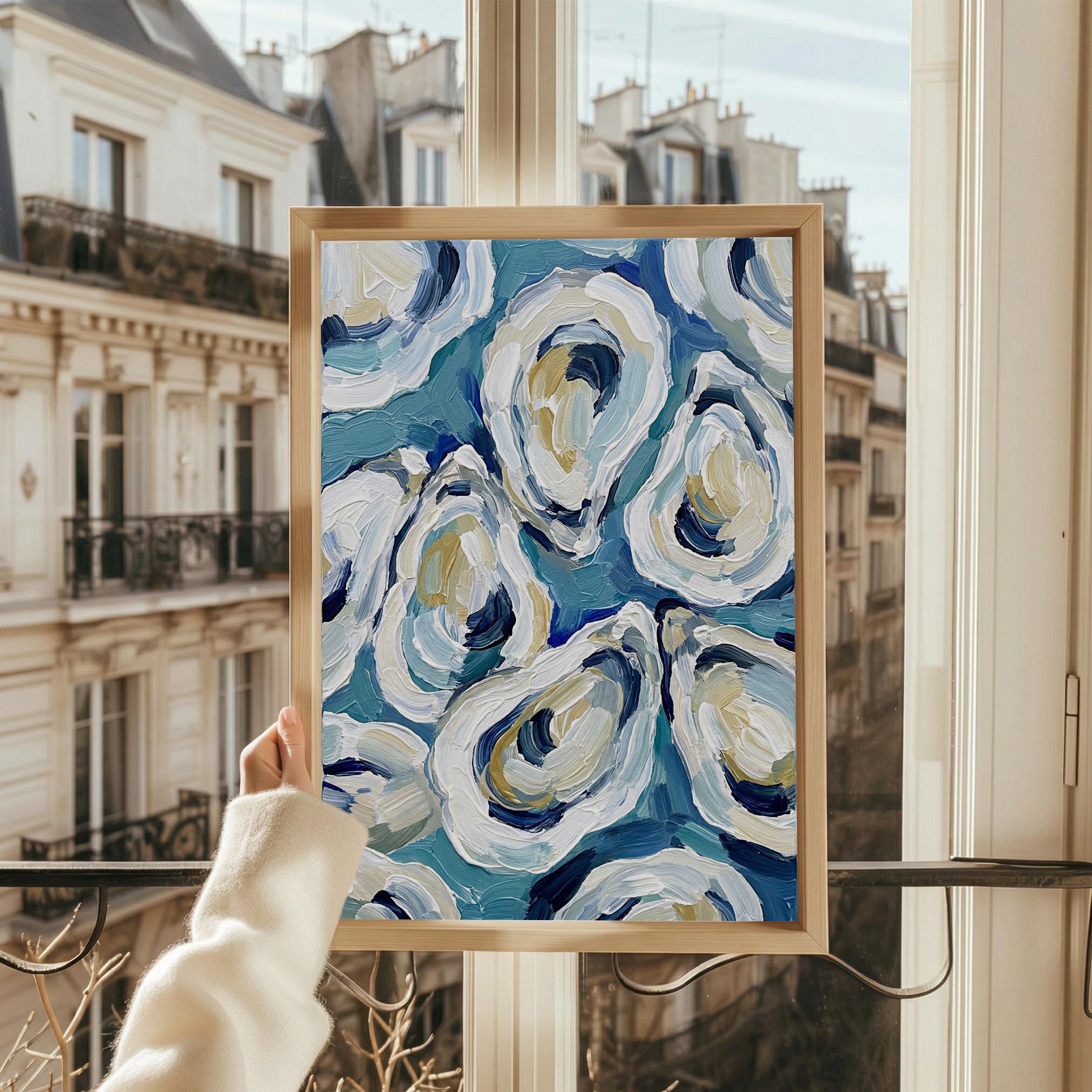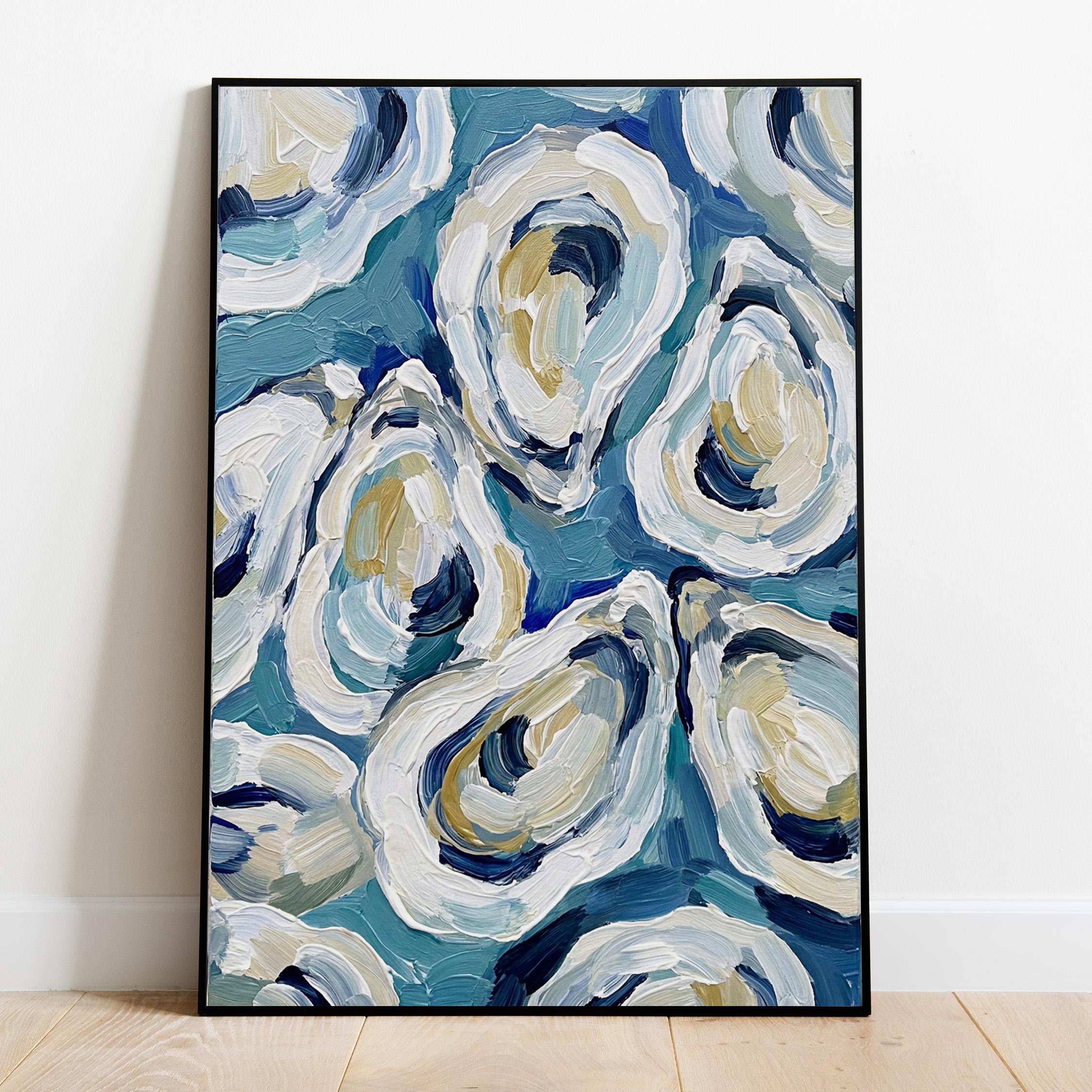 Expressive oyster artwork painted with thick textured brush strokes. Layers of blue, white, cream, and soft sand tones create a lively composition inspired by fresh coastal seafood and seaside markets.