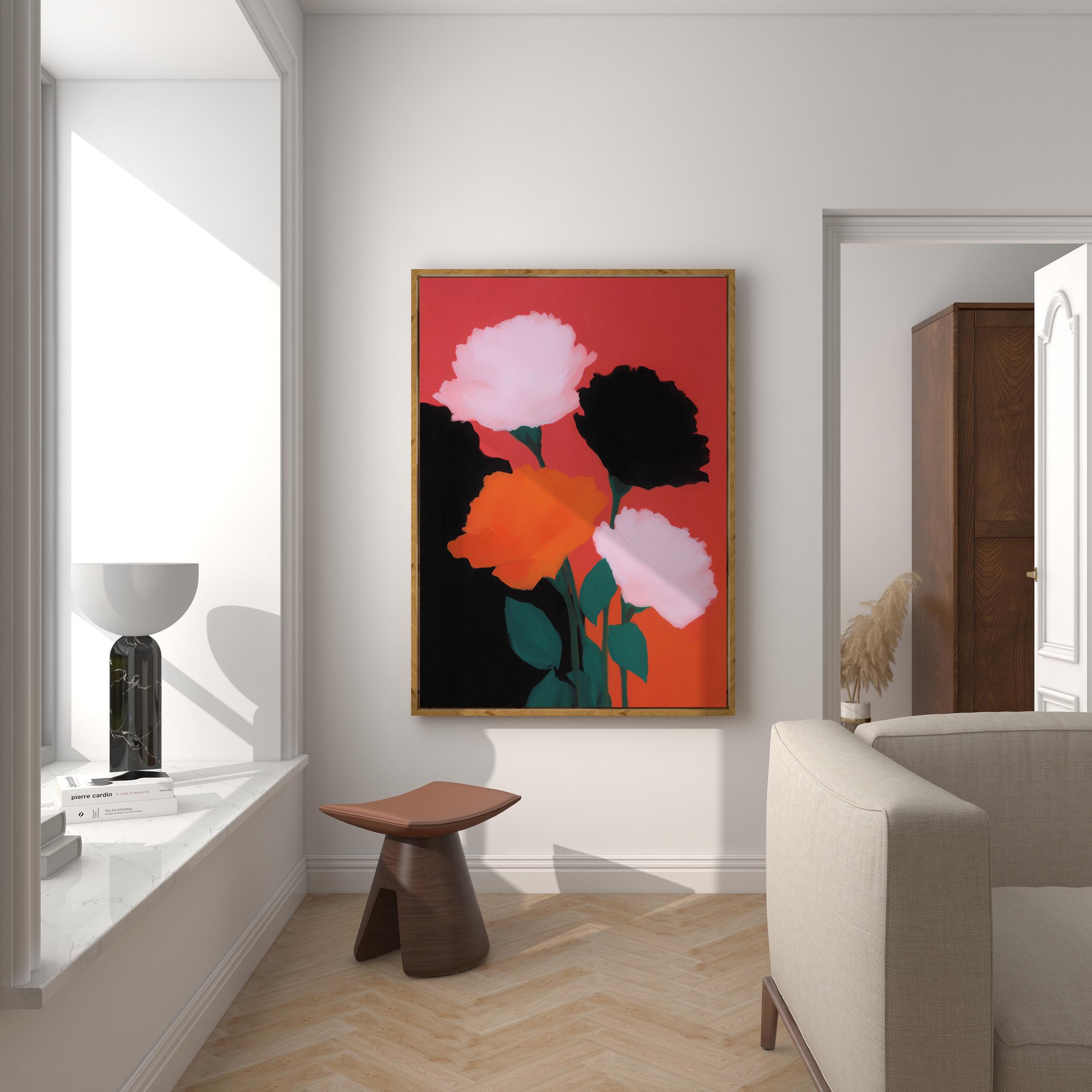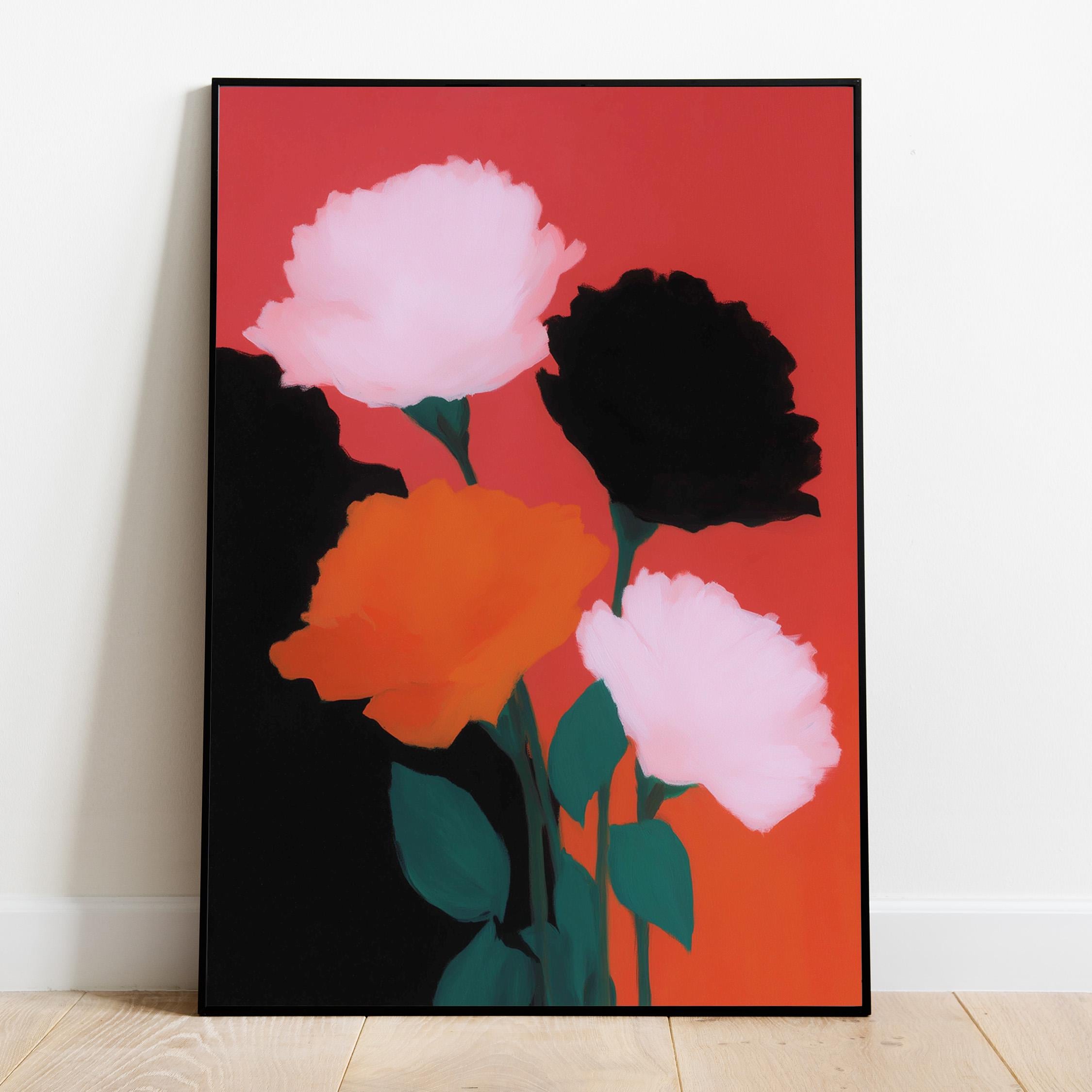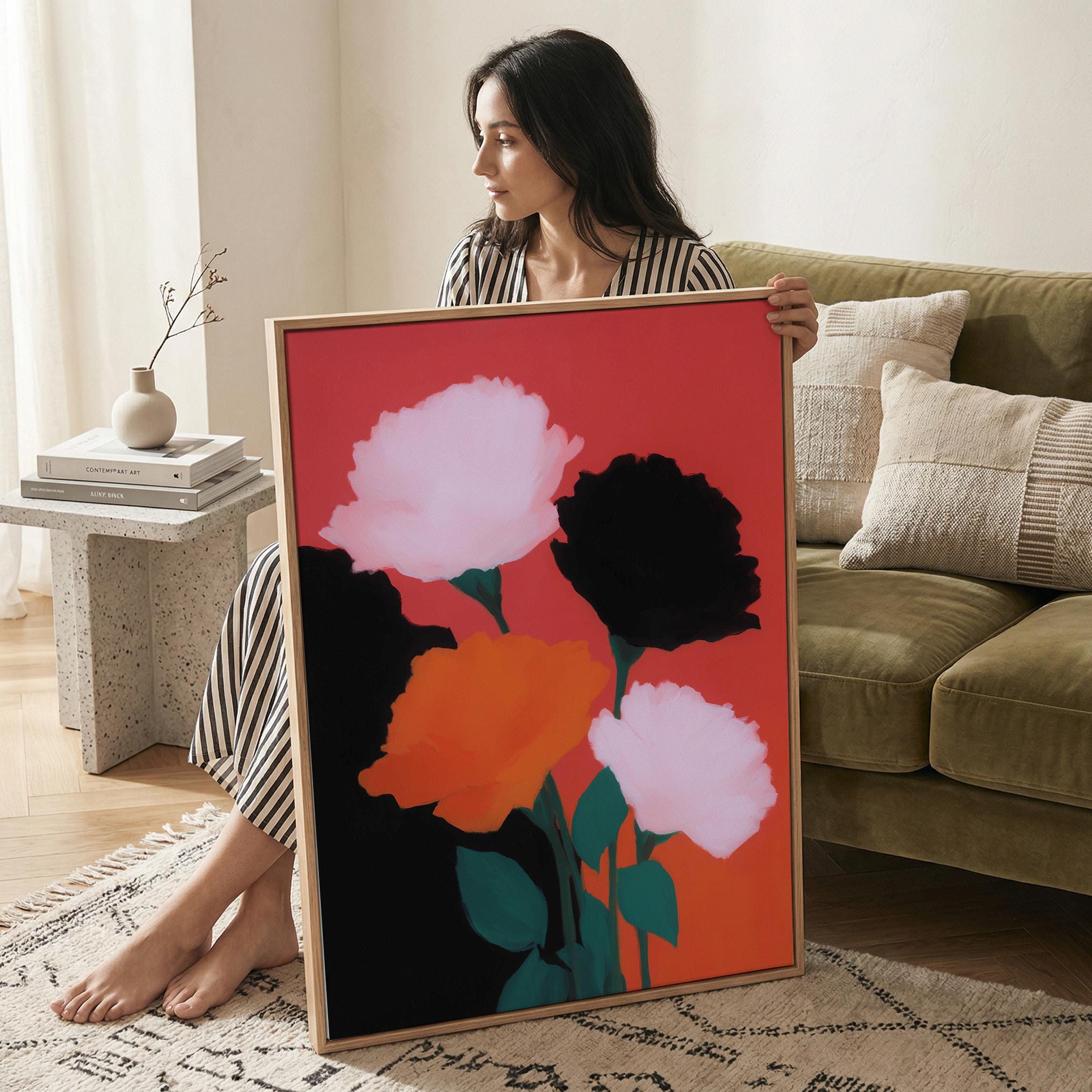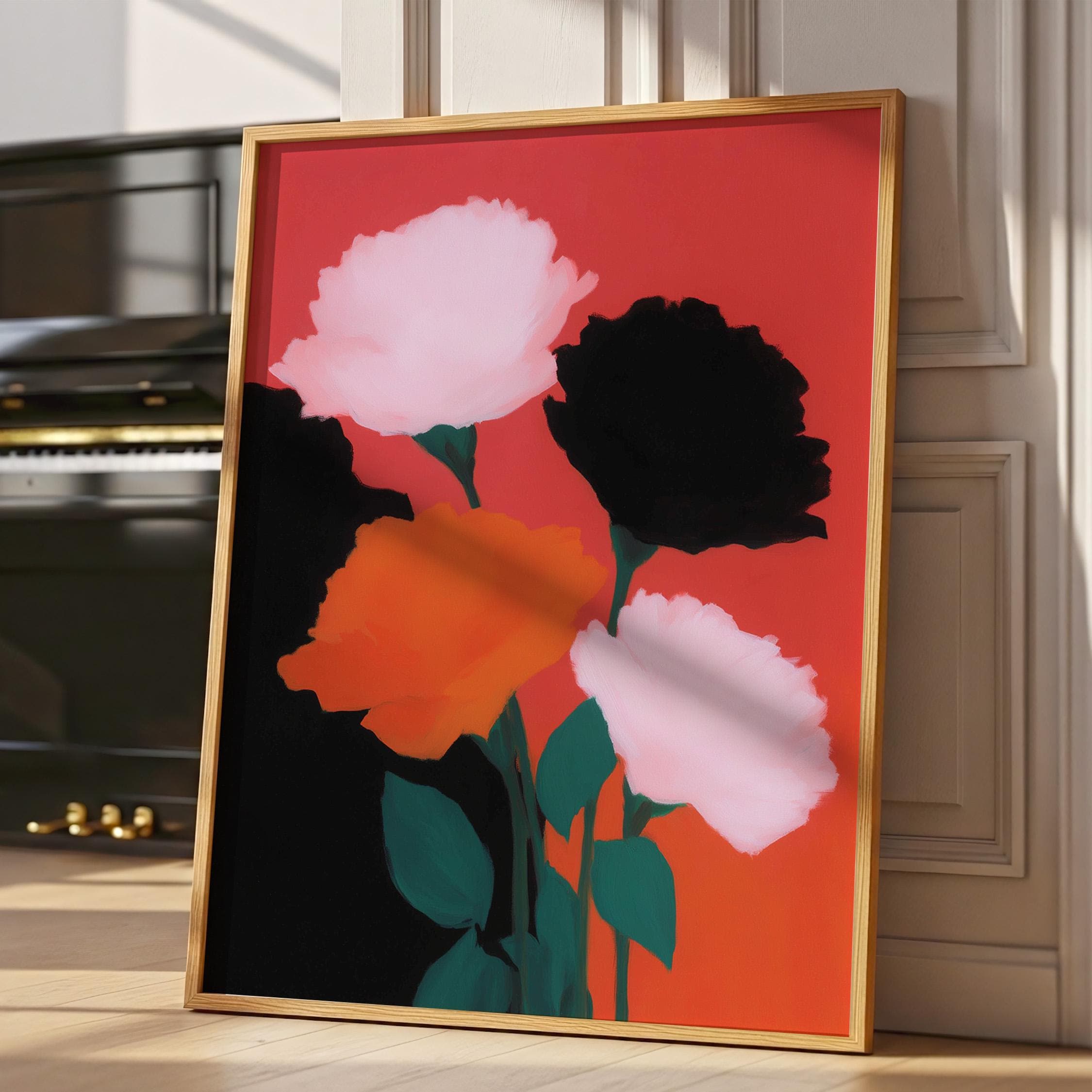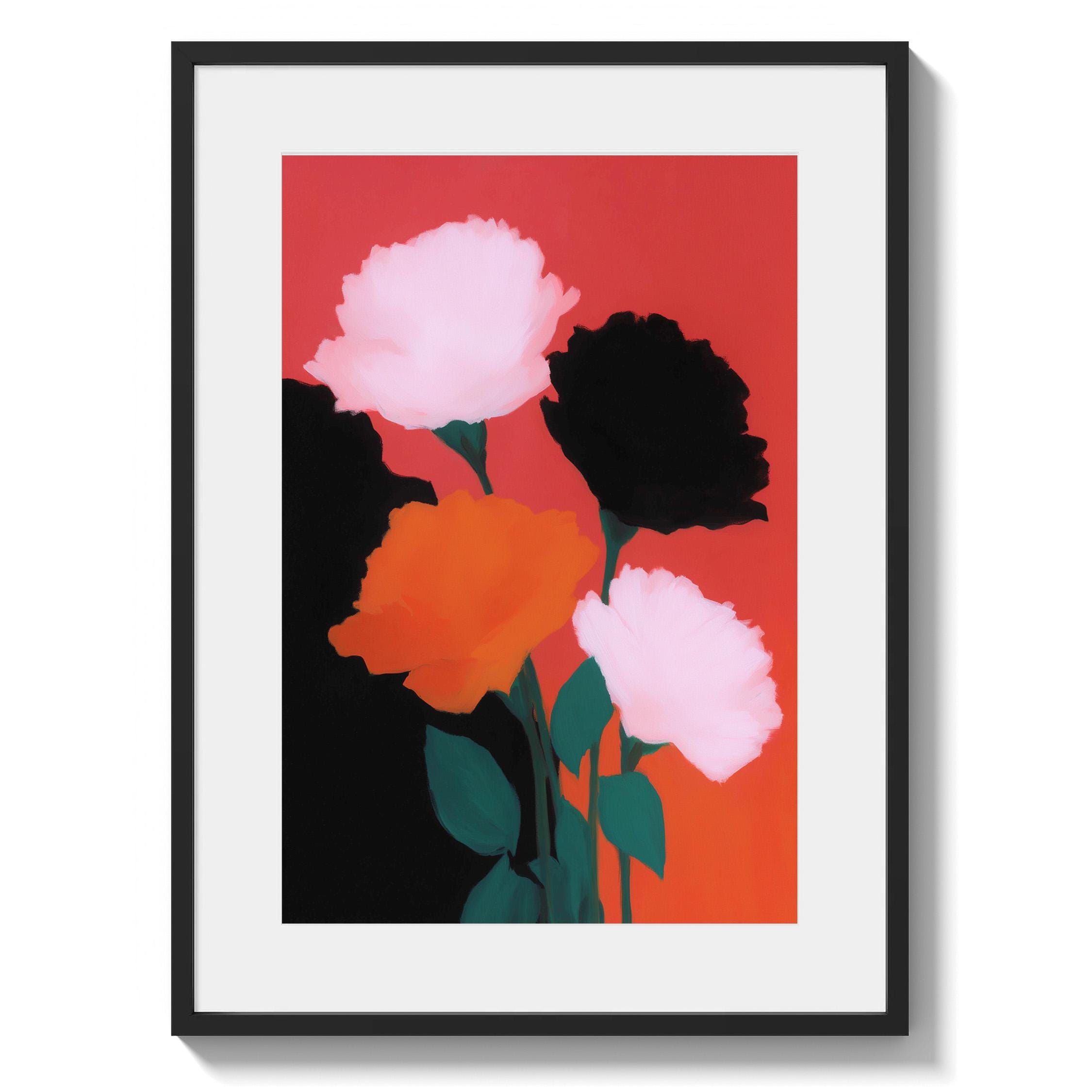 Bold contemporary floral artwork featuring four large stylized flowers set against a vivid red background. The composition plays with contrast; soft white petals, a deep black bloom, and a warm orange flower create a strong visual balance against the saturated backdrop.