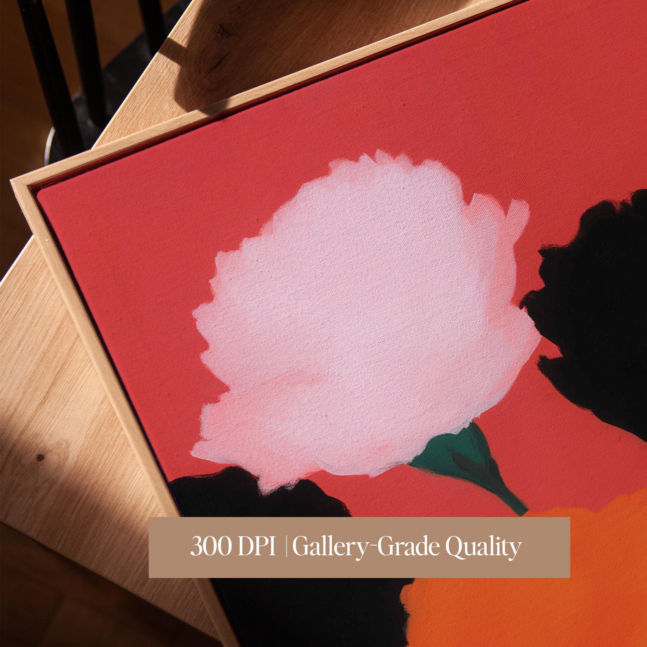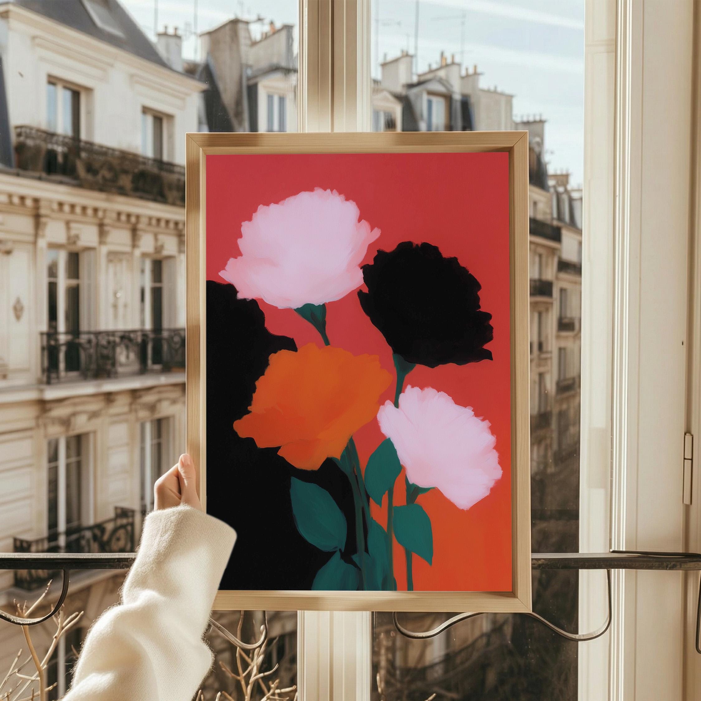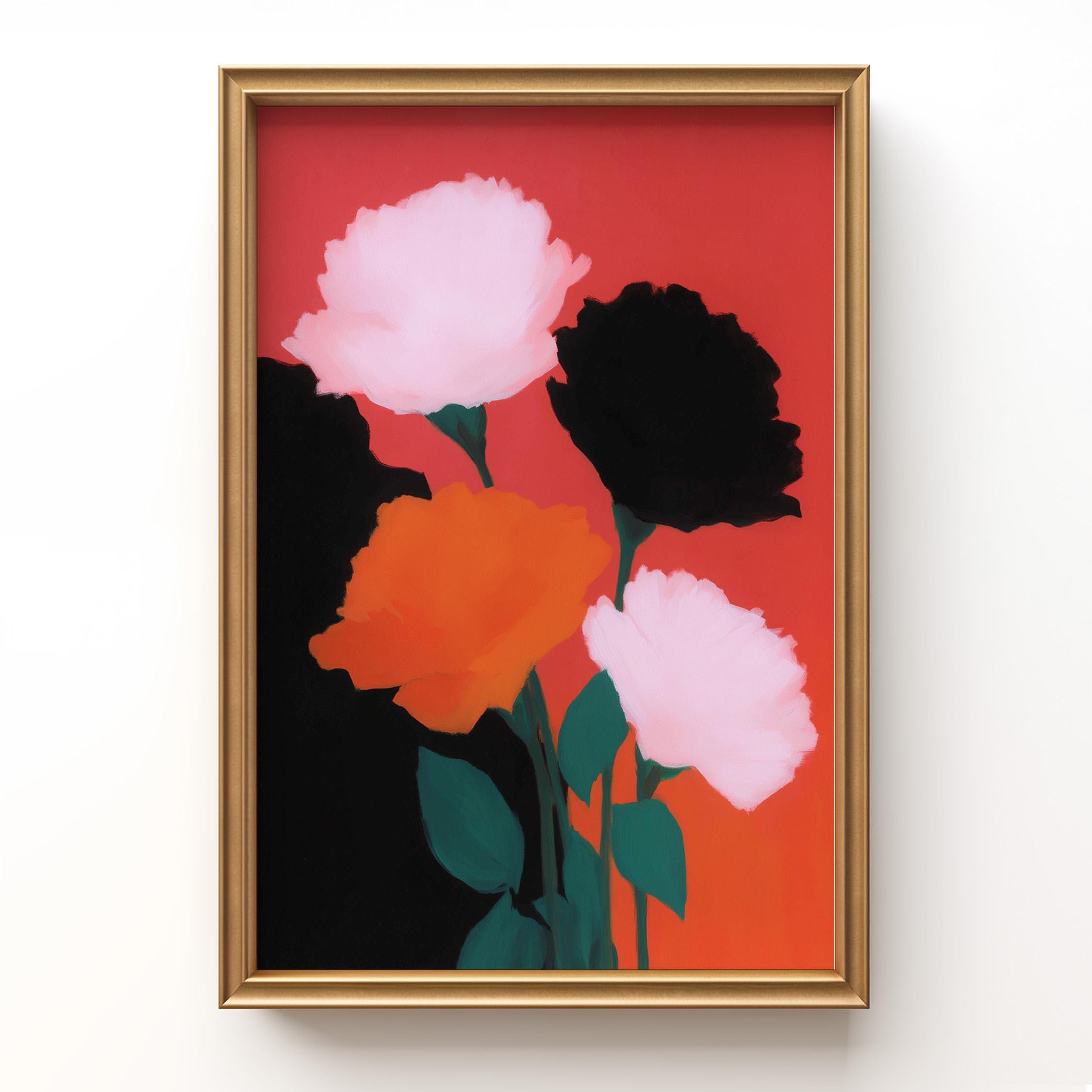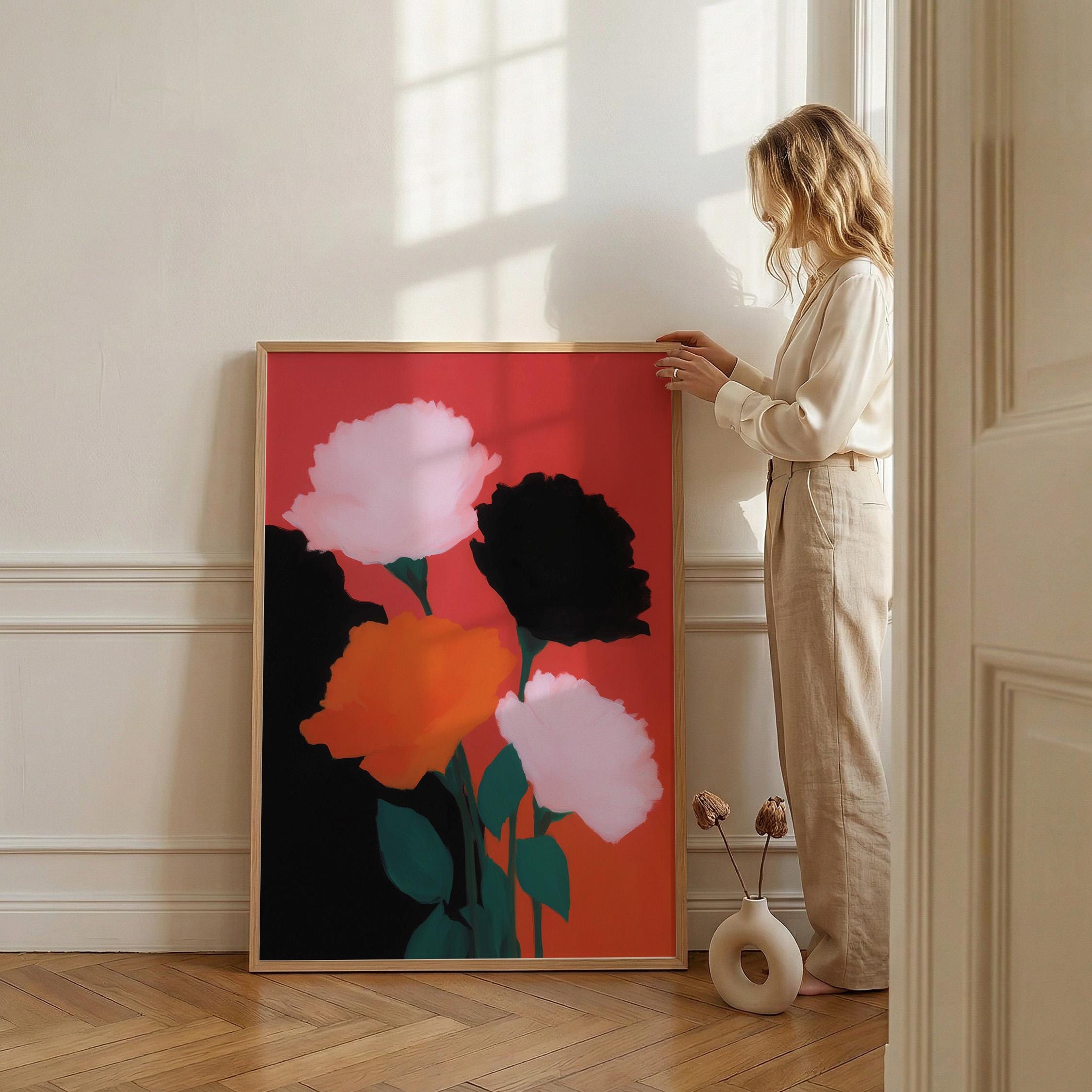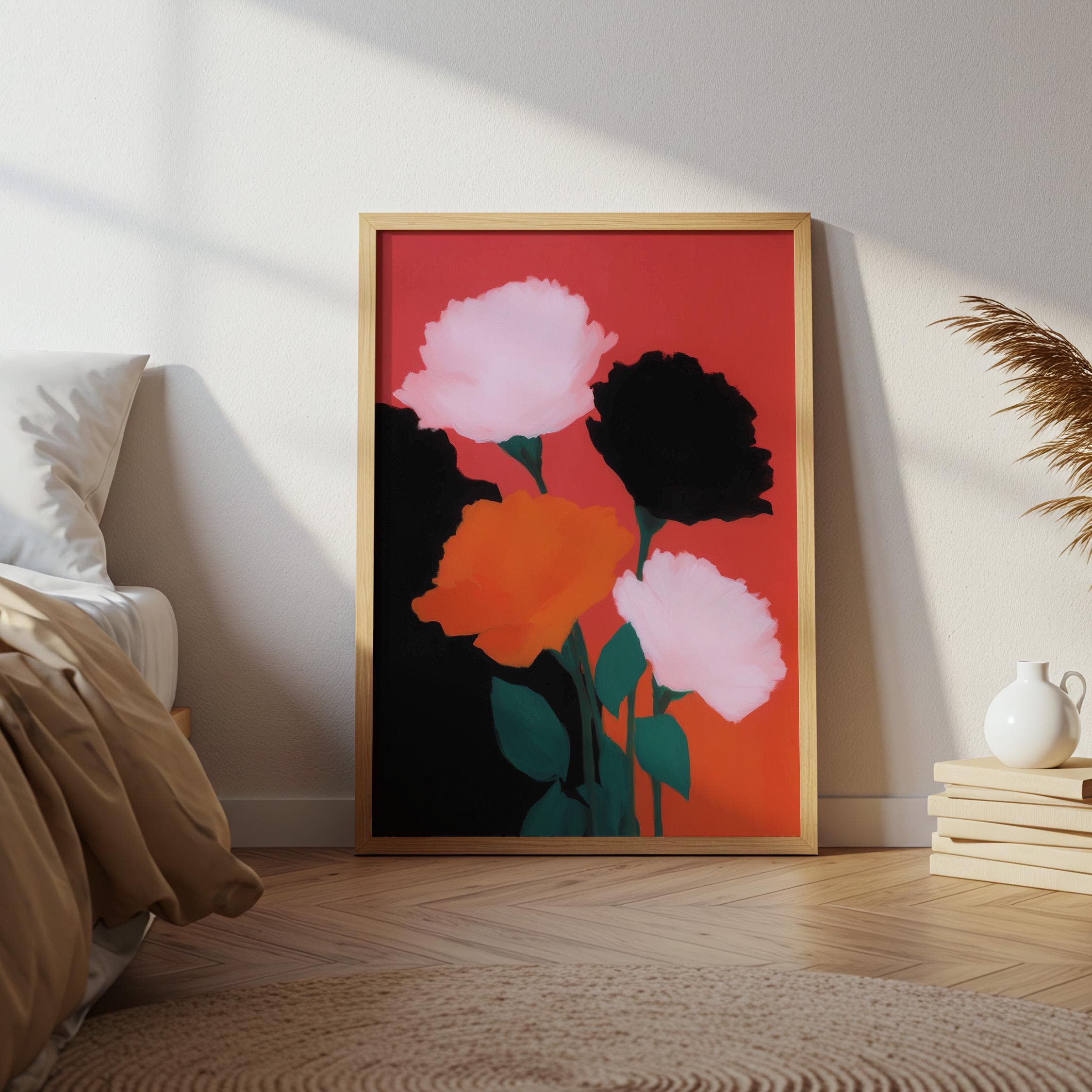 Bold contemporary floral artwork featuring four large stylized flowers set against a vivid red background. The composition plays with contrast; soft white petals, a deep black bloom, and a warm orange flower create a strong visual balance against the saturated backdrop.