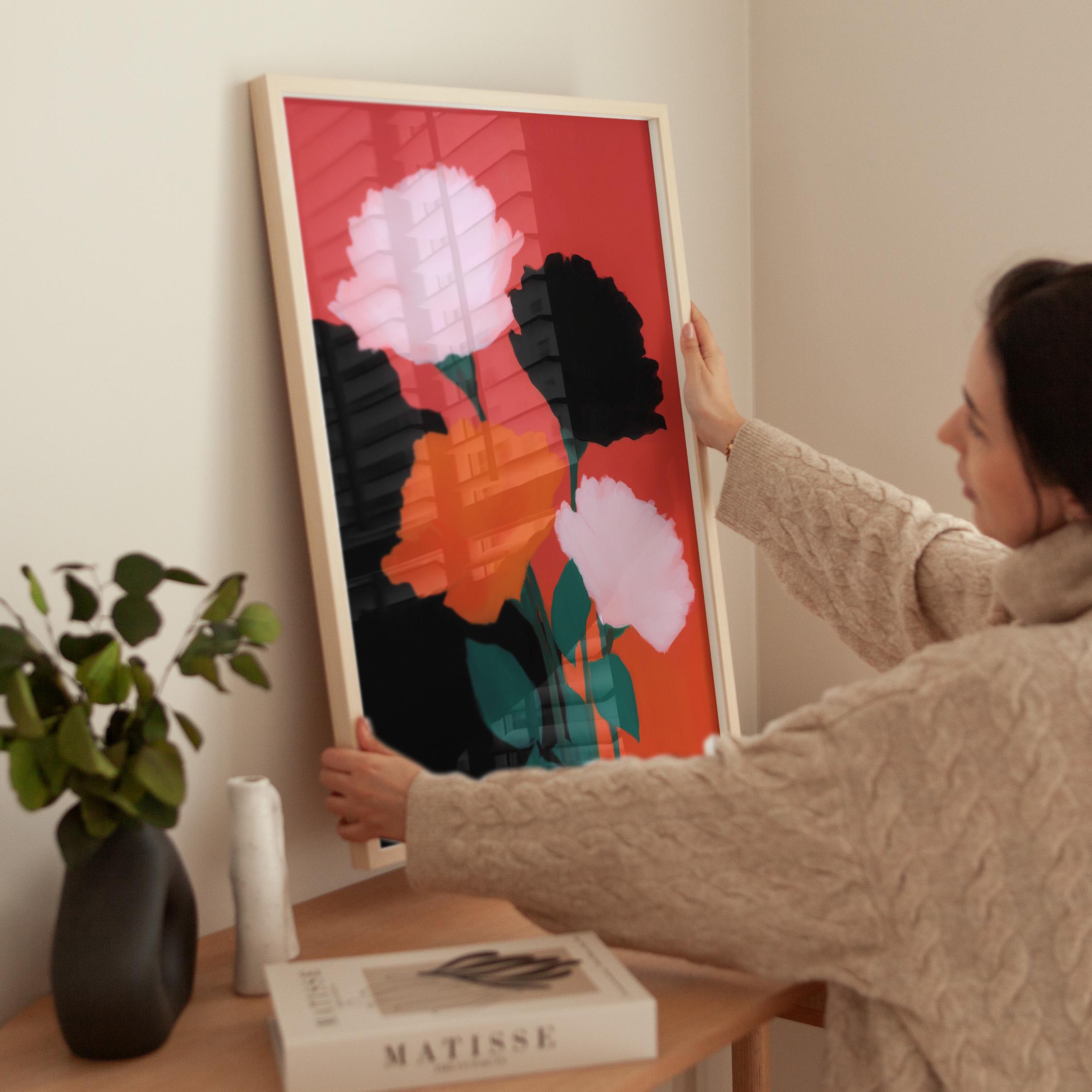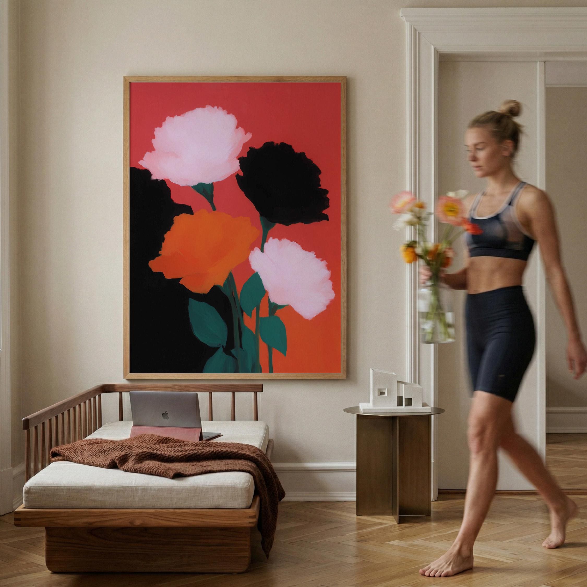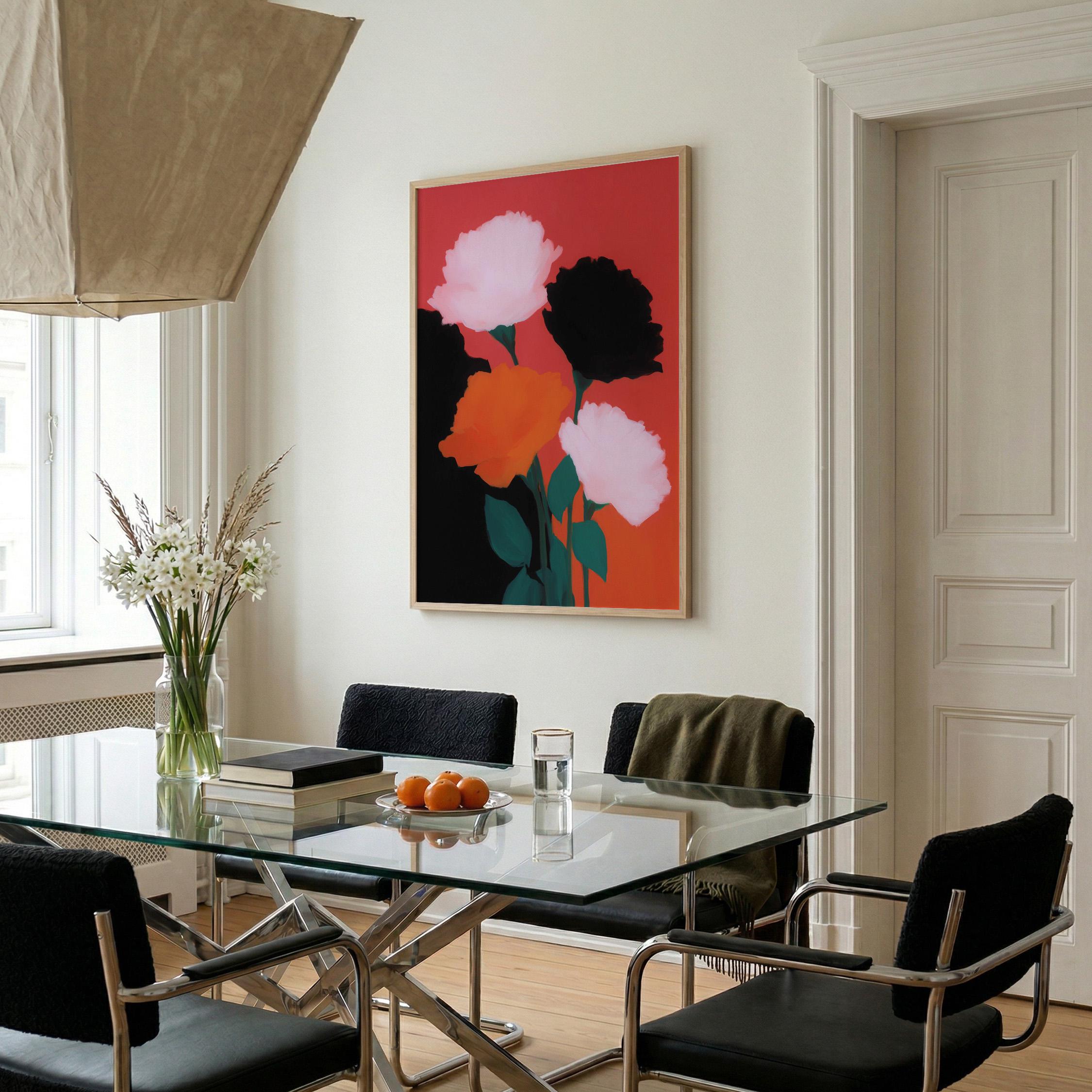 This print works well in living rooms, dining areas, creative studios, hallways, or modern apartments. The strong color palette adds energy and warmth to minimalist interiors or gallery walls.