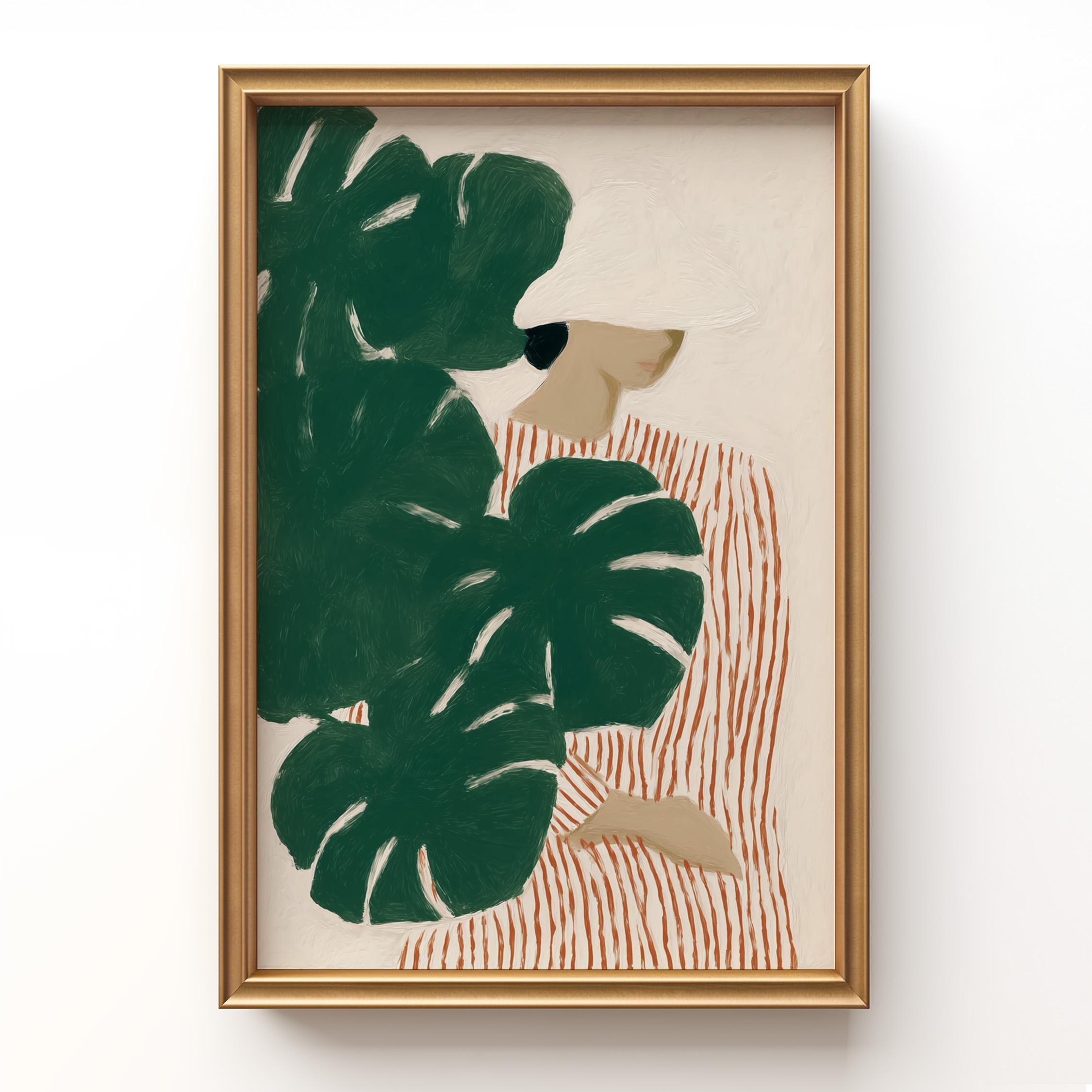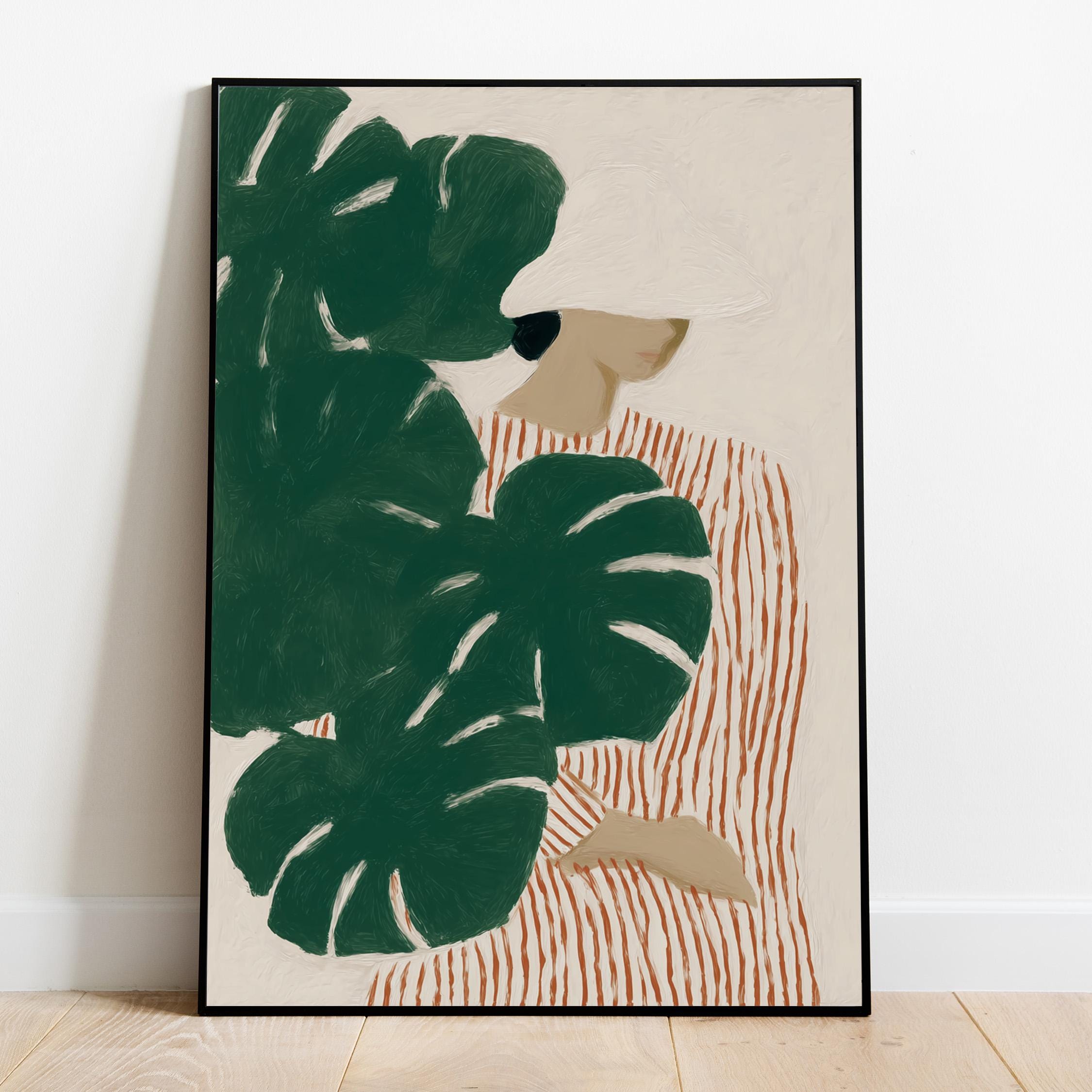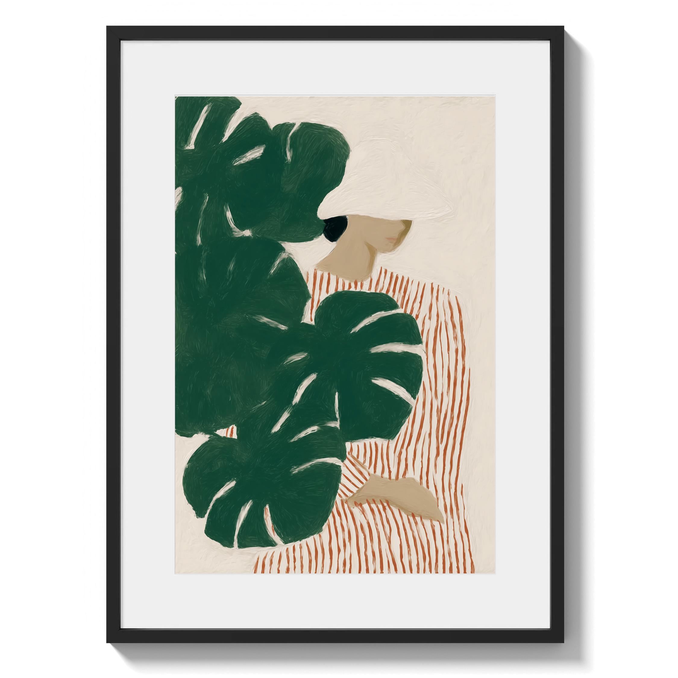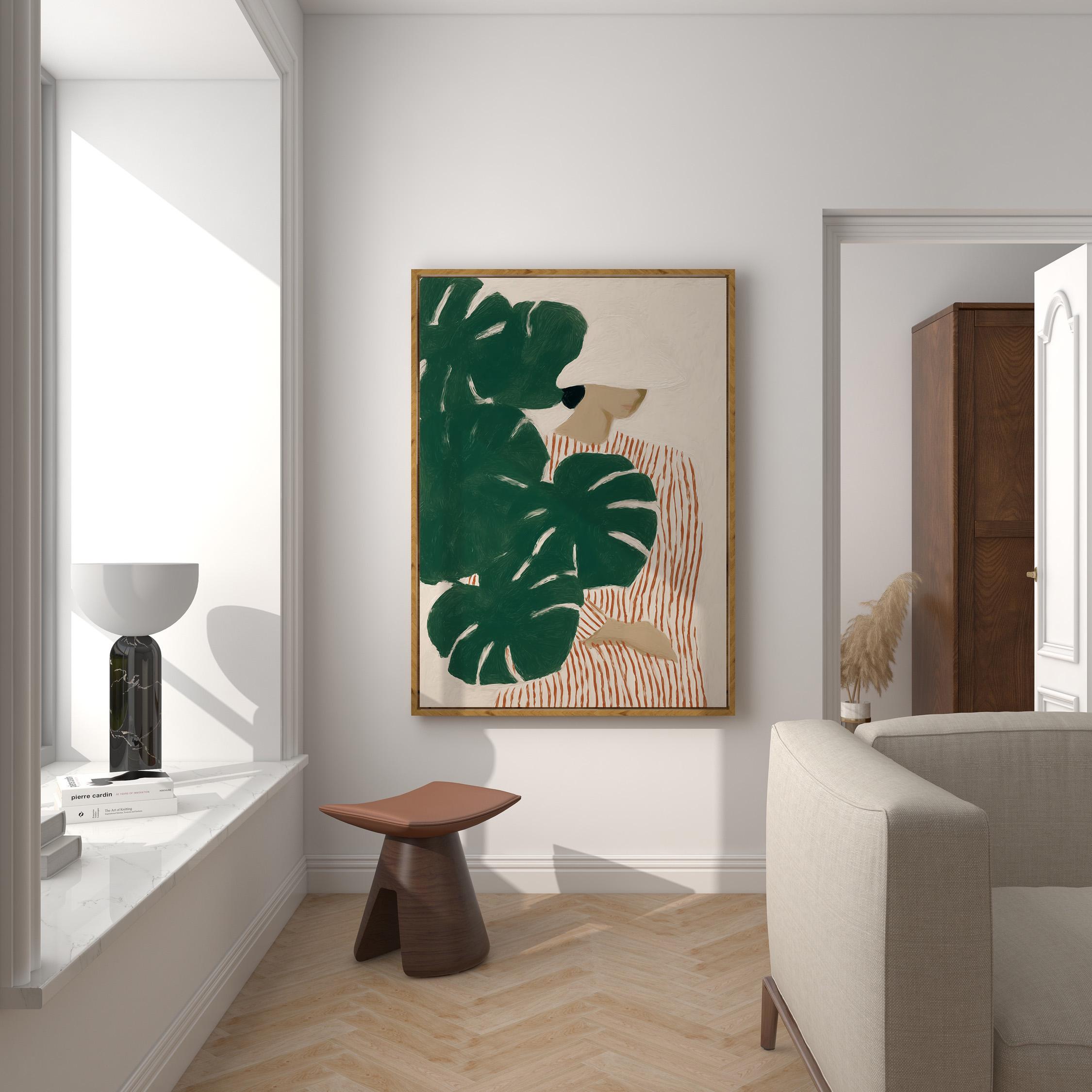 Modern figurative artwork featuring a woman partially hidden behind large monstera leaves. The deep green tropical foliage contrasts with the soft neutral background and the striped dress, creating a calm yet graphic composition.