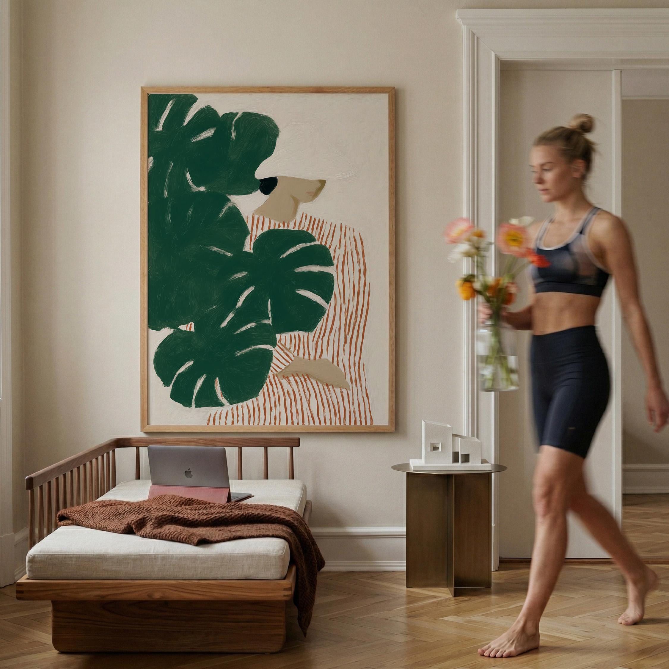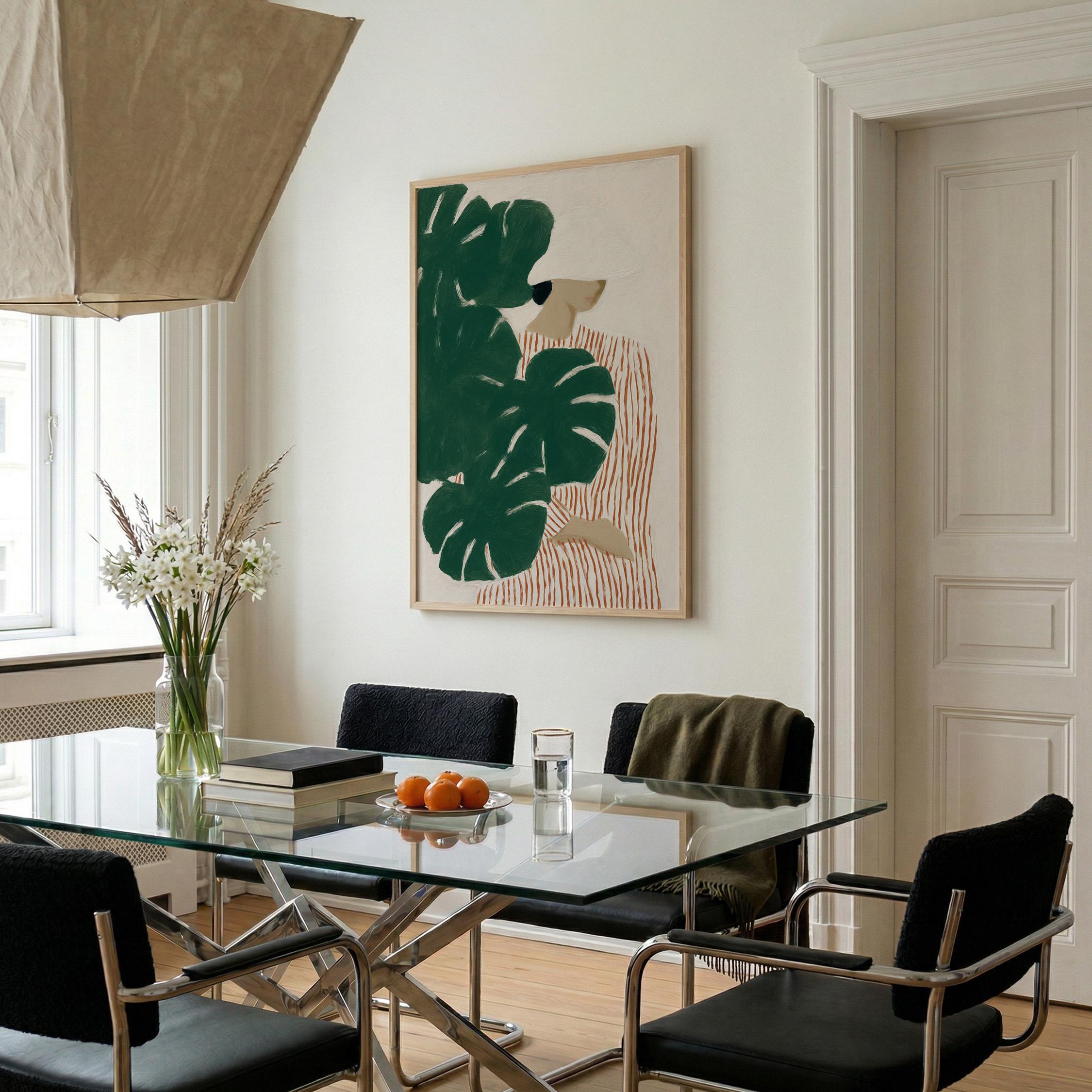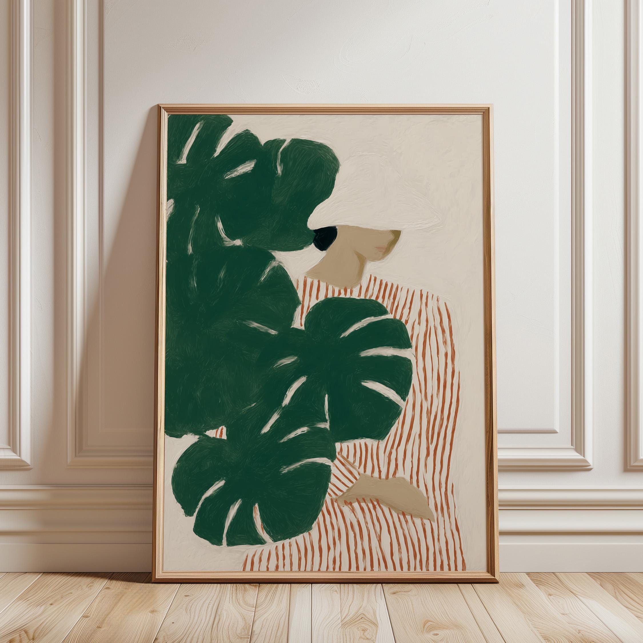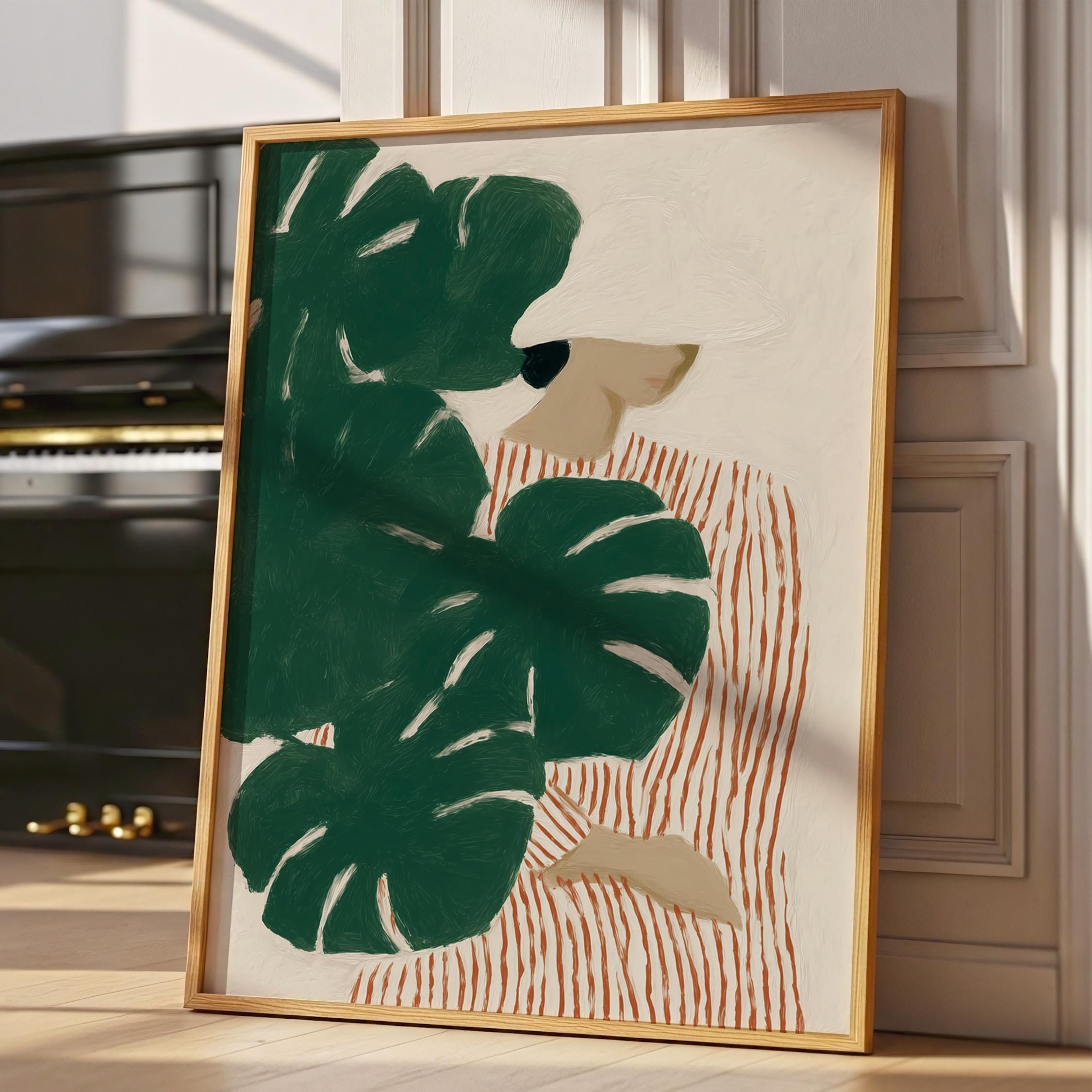 Modern figurative artwork featuring a woman partially hidden behind large monstera leaves. The deep green tropical foliage contrasts with the soft neutral background and the striped dress, creating a calm yet graphic composition.