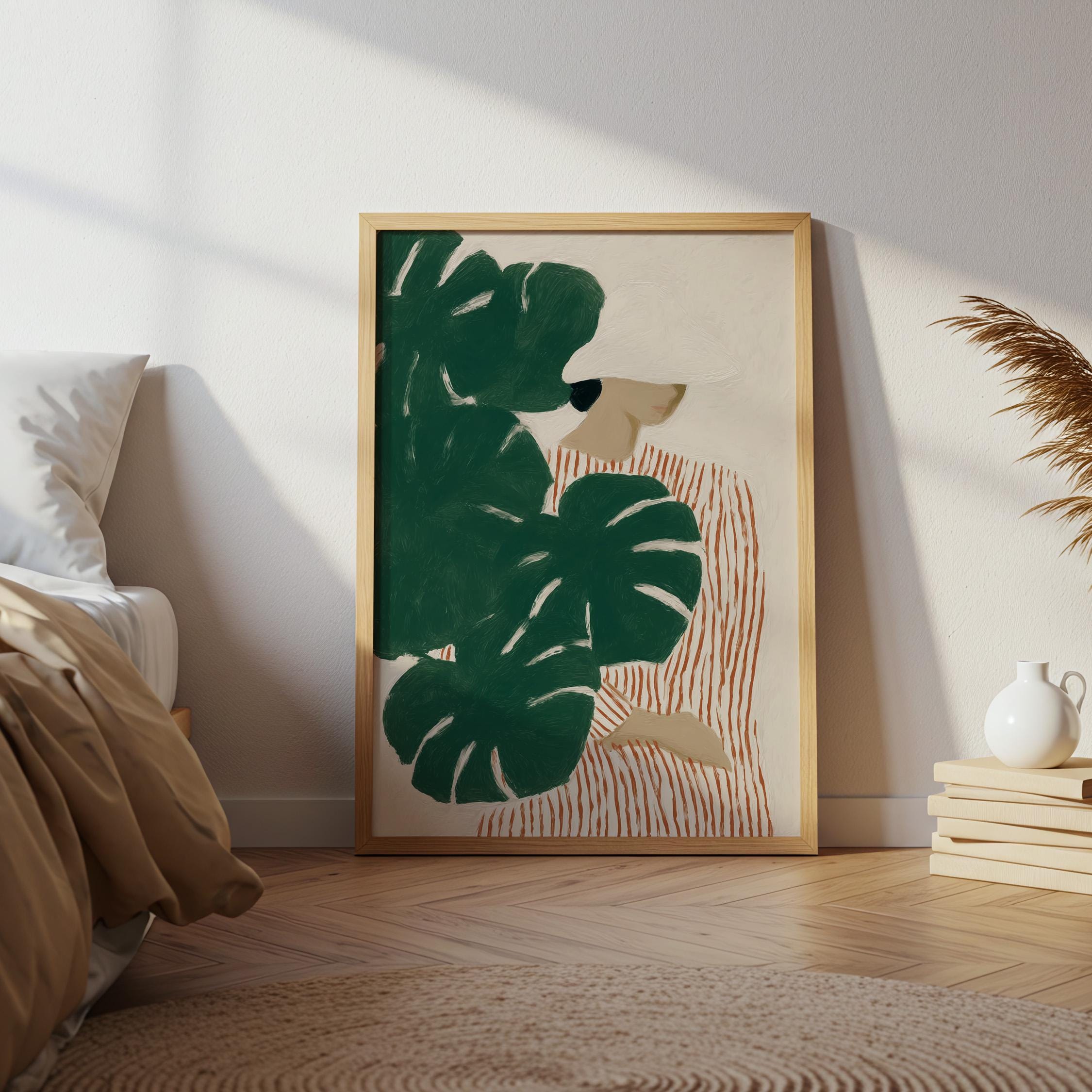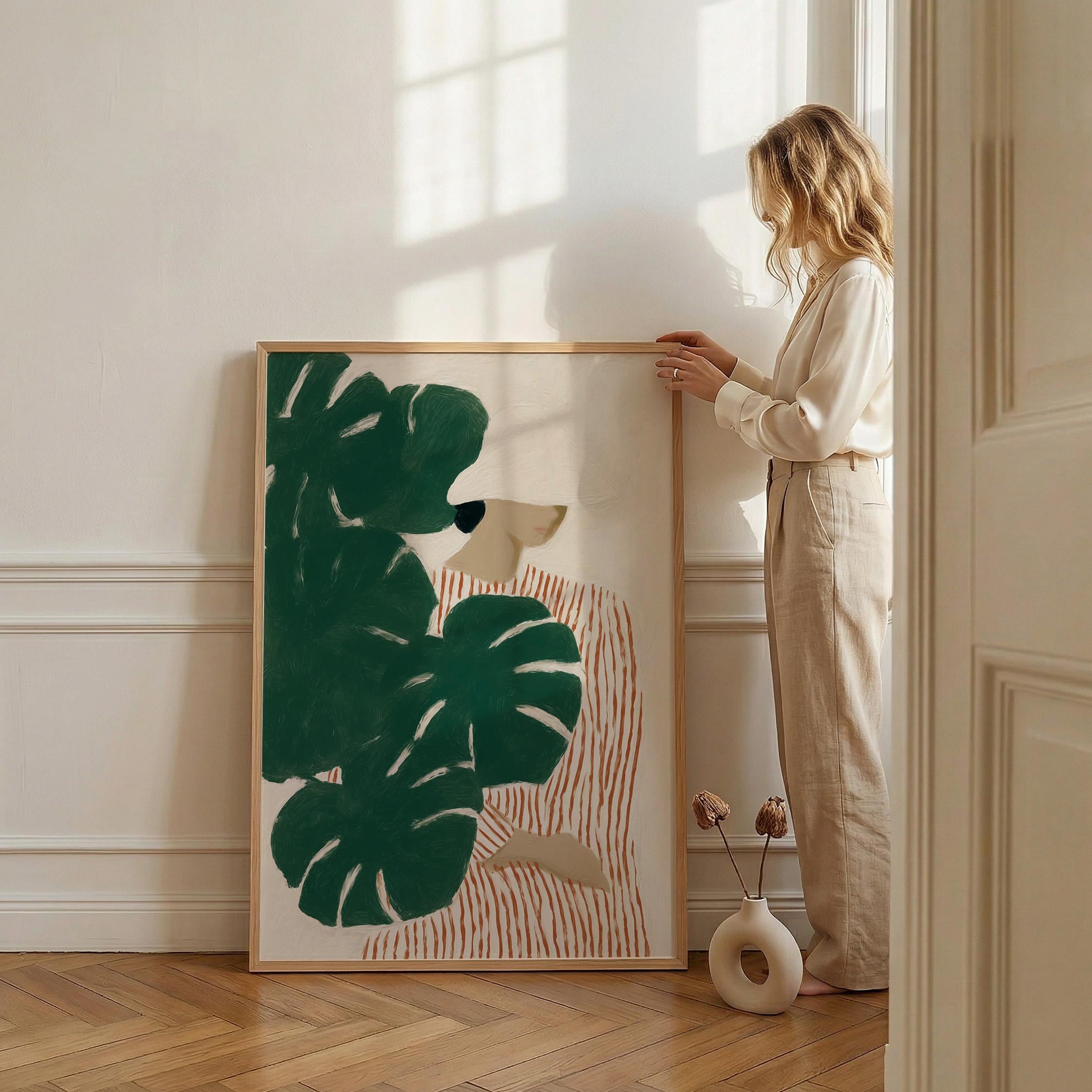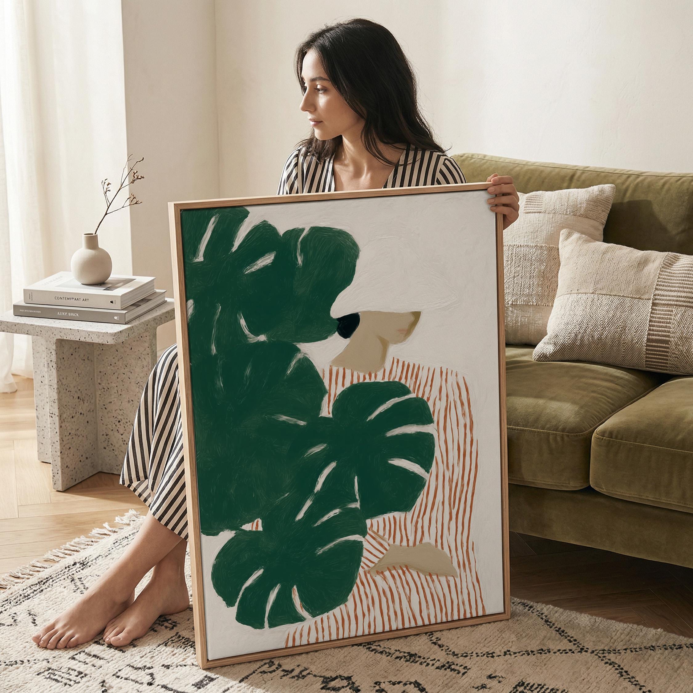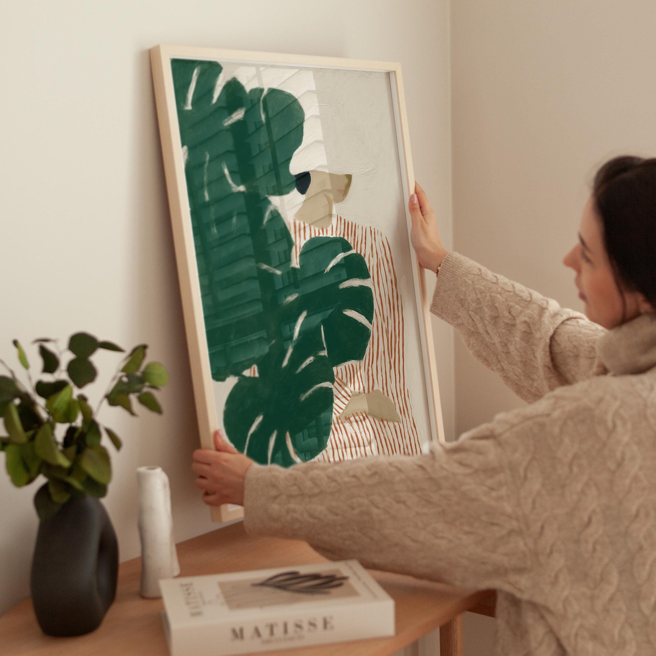 Modern figurative artwork featuring a woman partially hidden behind large monstera leaves. The deep green tropical foliage contrasts with the soft neutral background and the striped dress, creating a calm yet graphic composition.