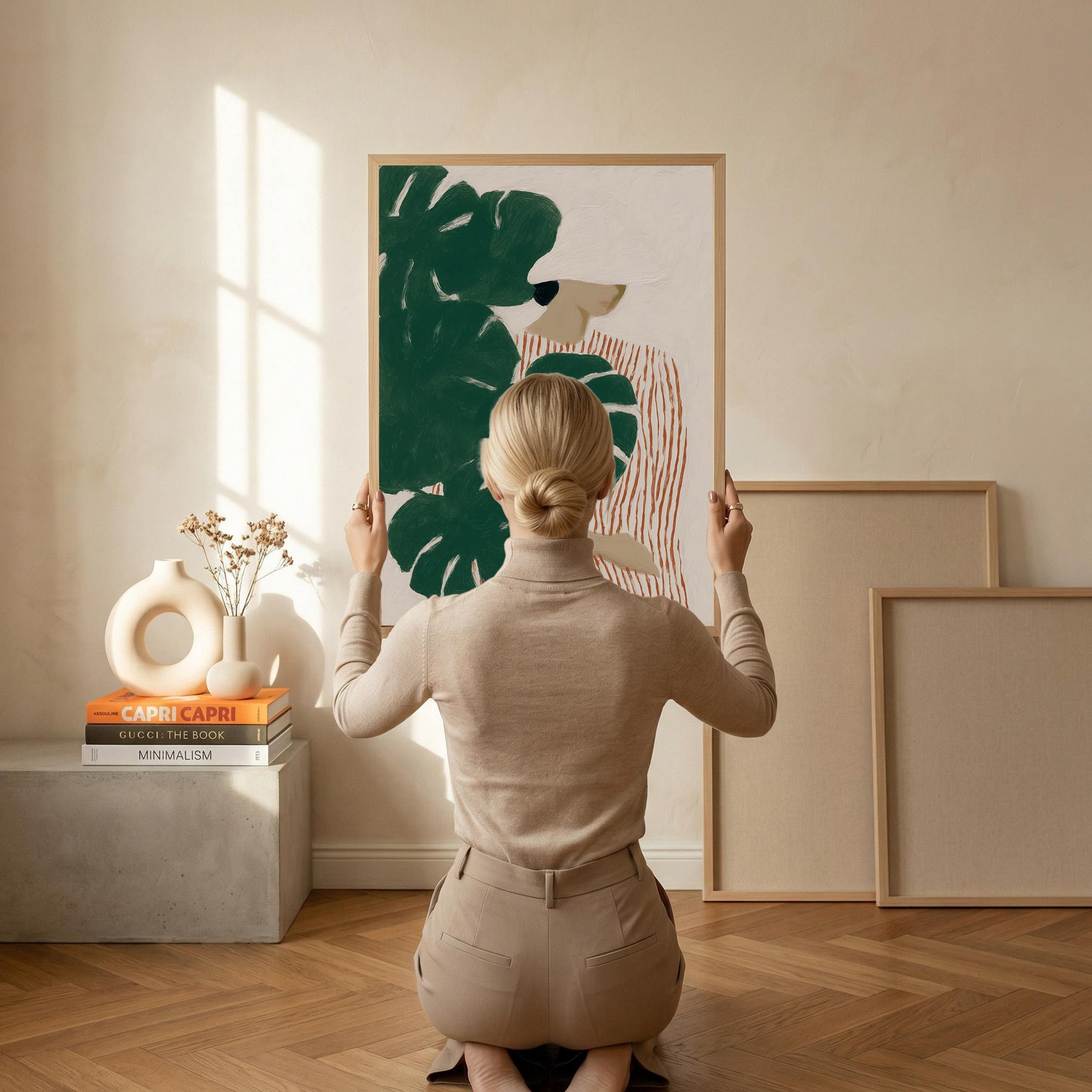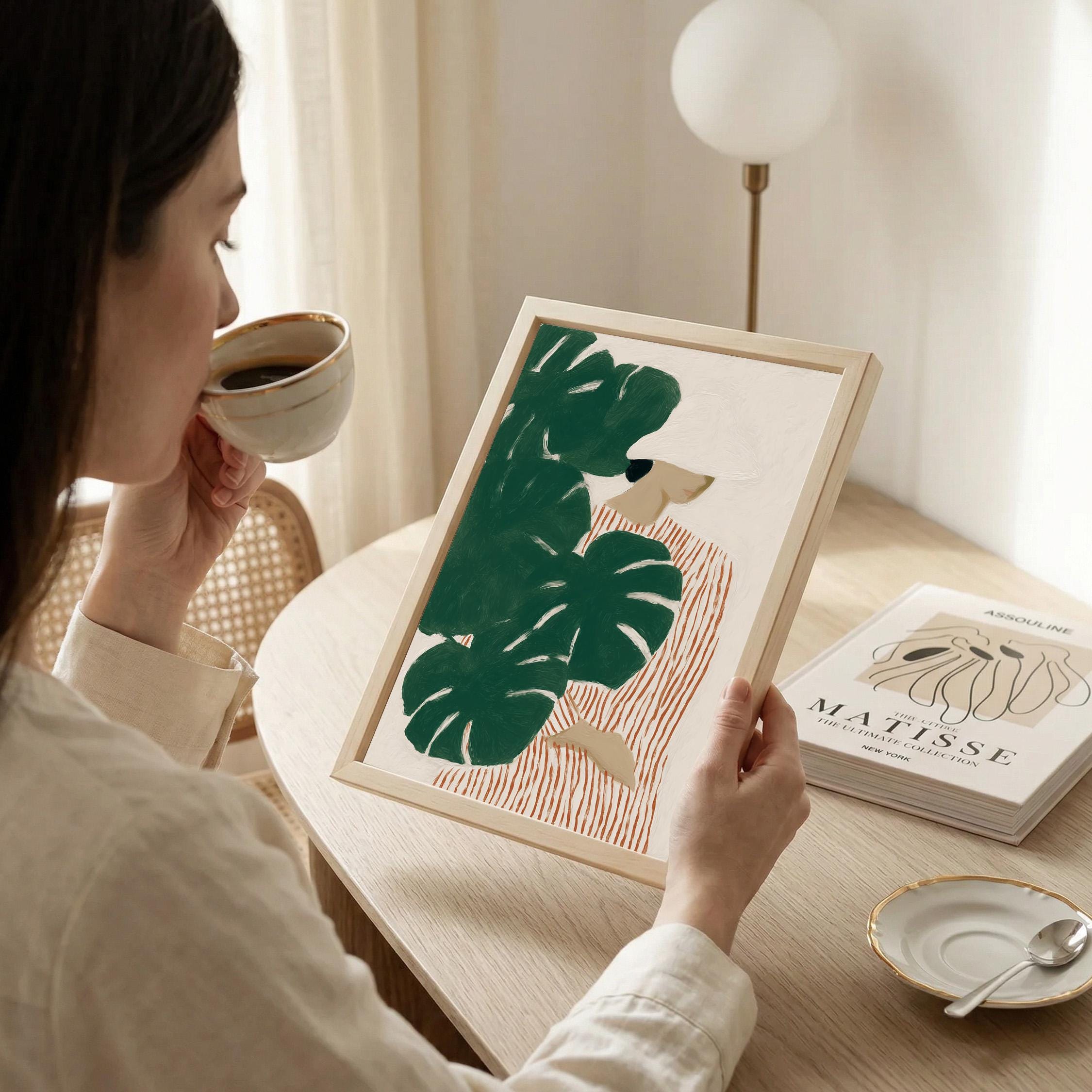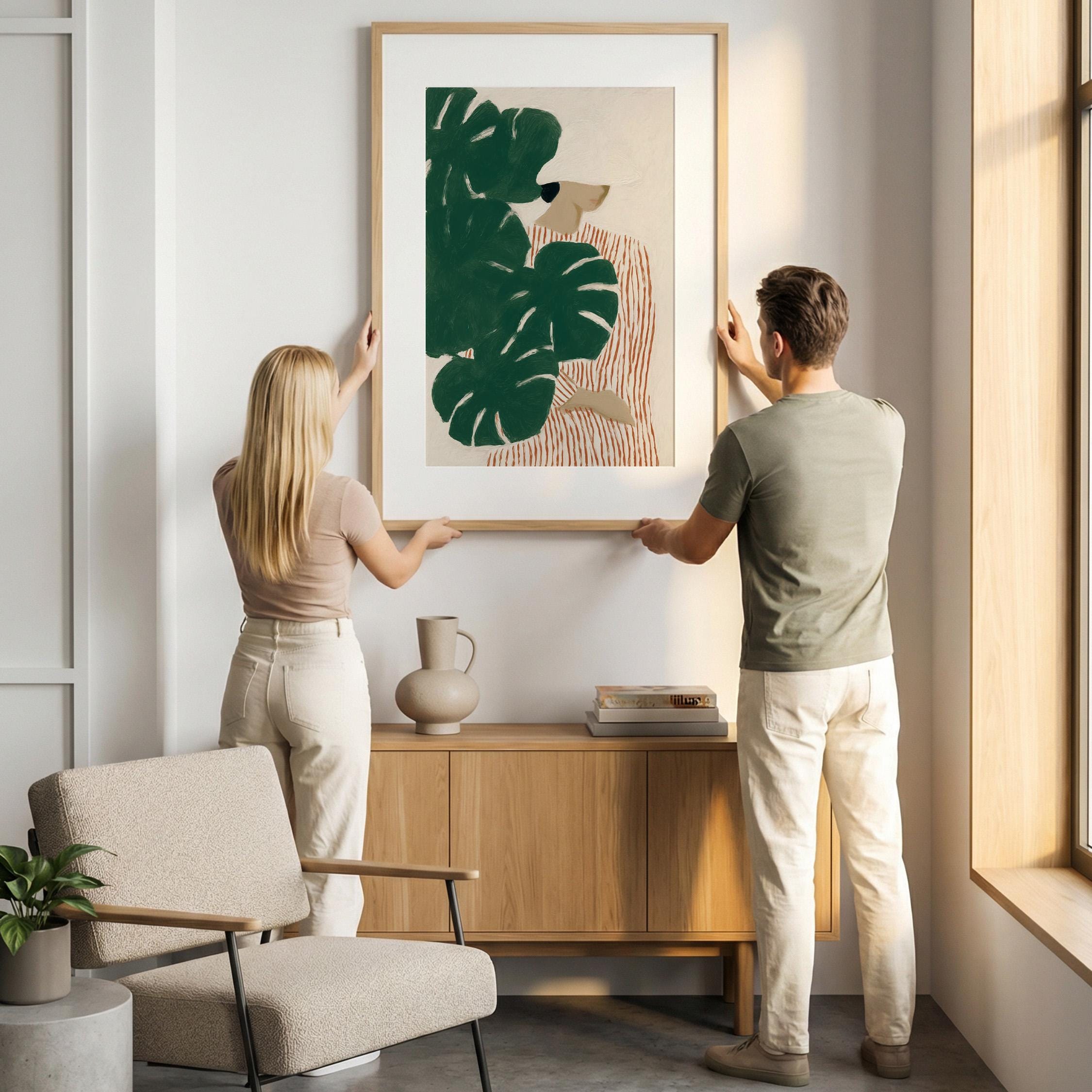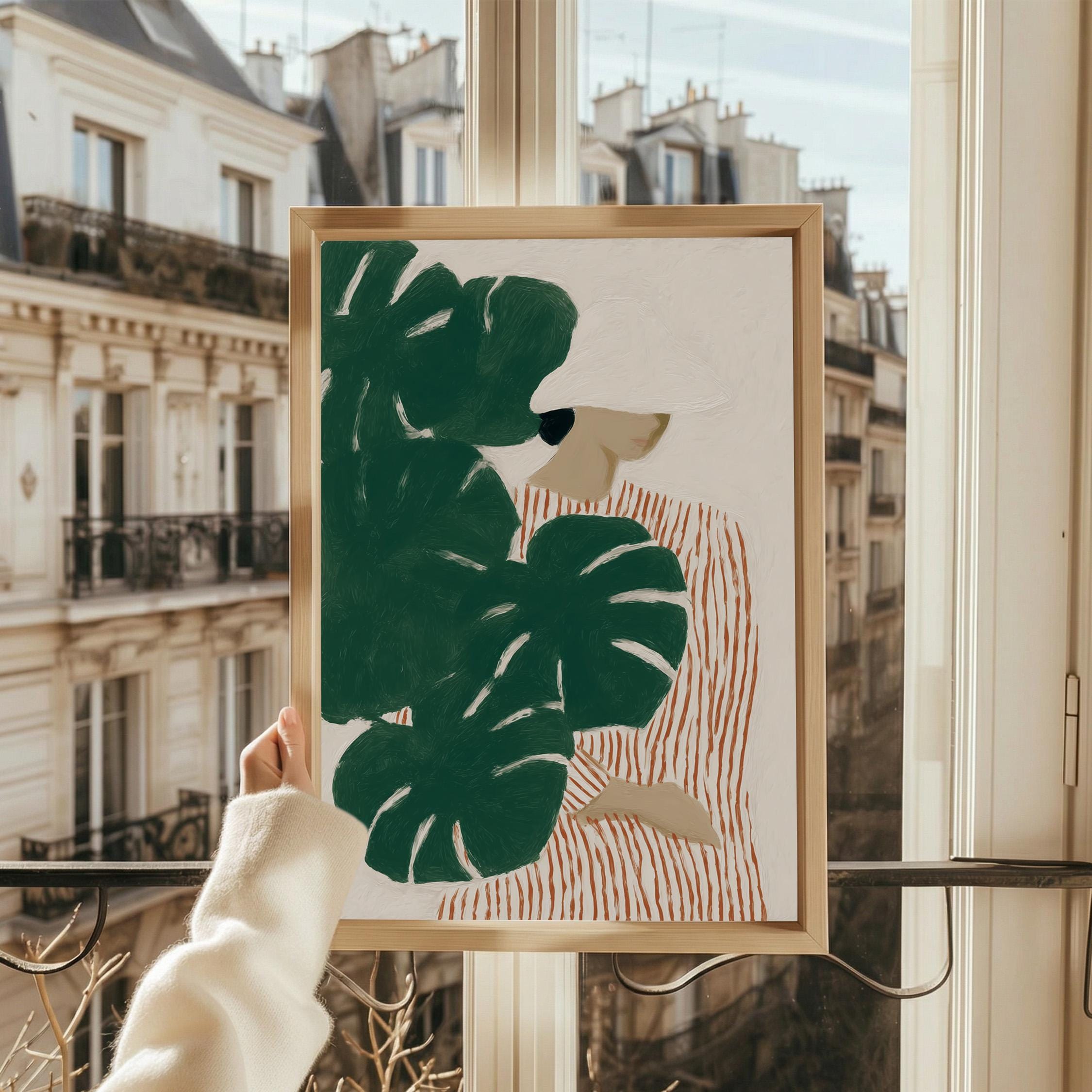 Modern figurative artwork featuring a woman partially hidden behind large monstera leaves. The deep green tropical foliage contrasts with the soft neutral background and the striped dress, creating a calm yet graphic composition.